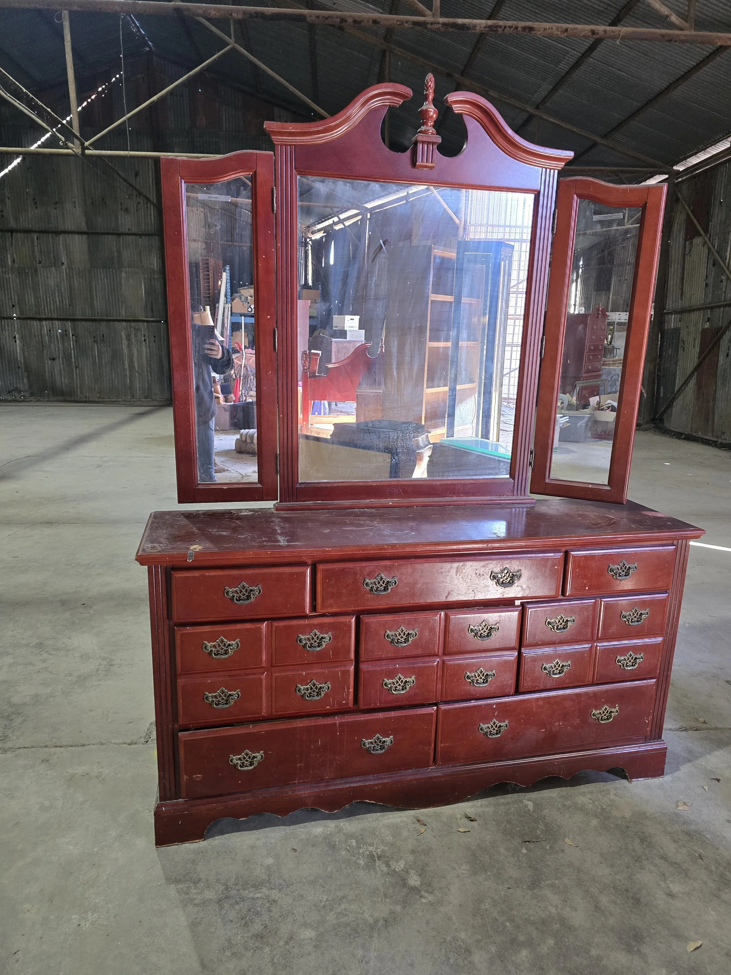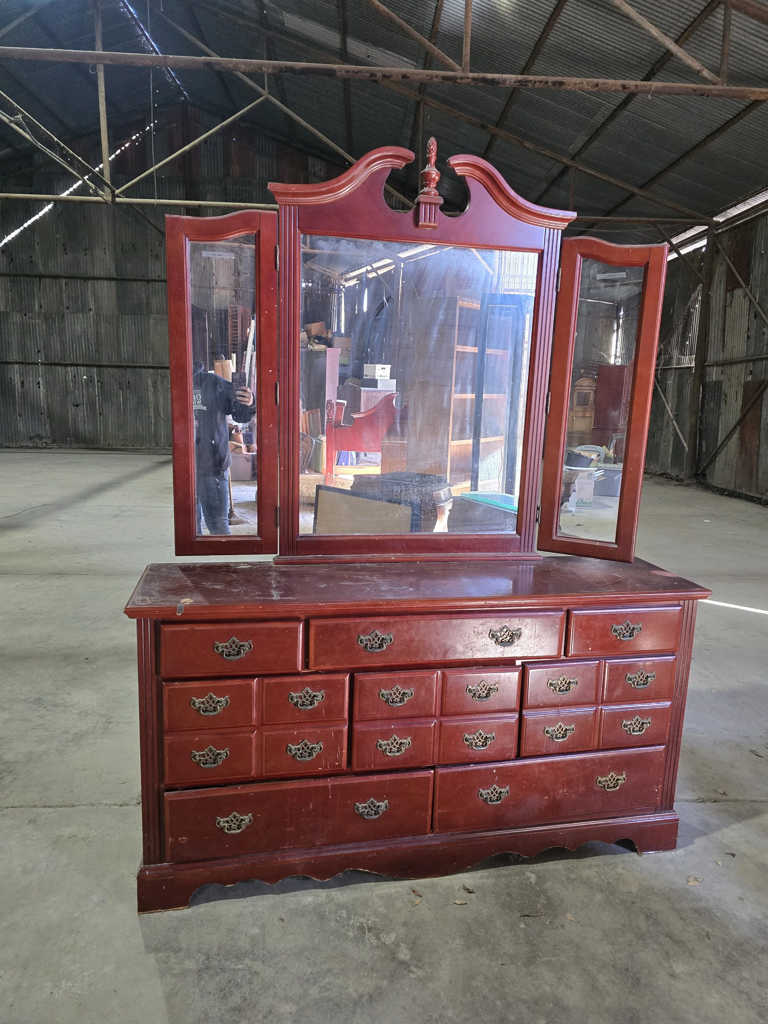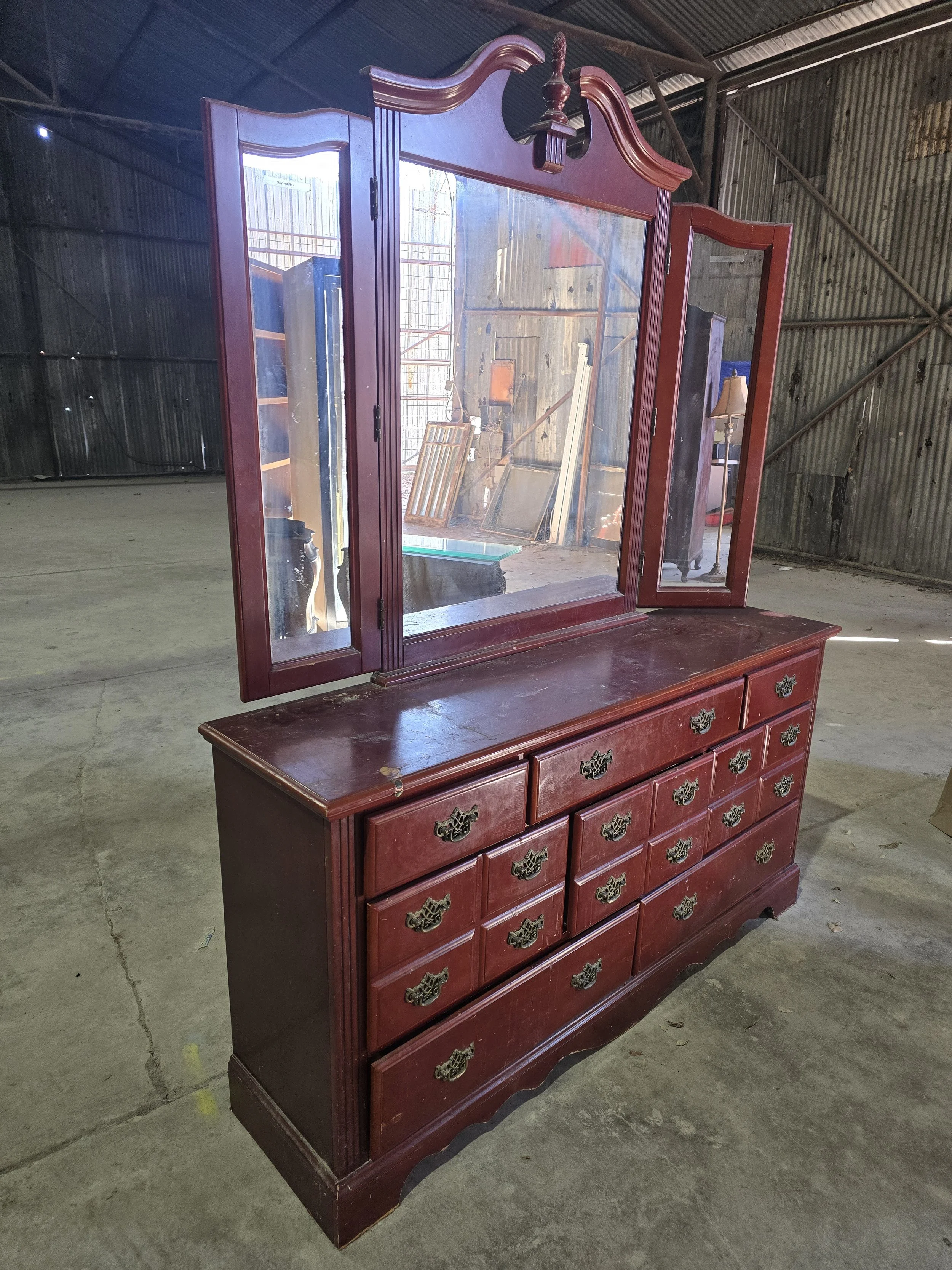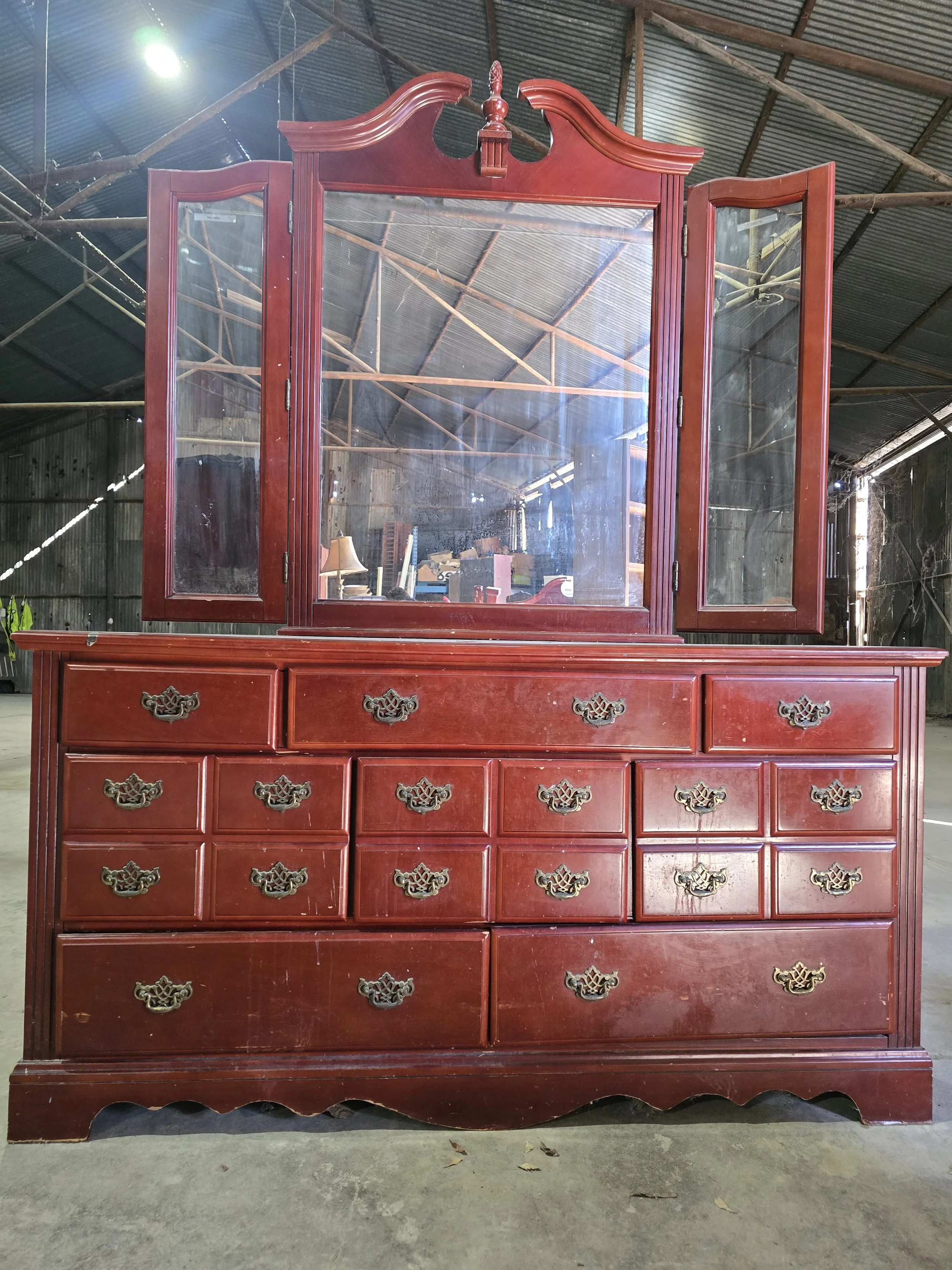 Large wood dresser with 9 drawers and folding mirror. It is in good shape. The drawers all slide nicely. This dresser is a very sturdy piece.