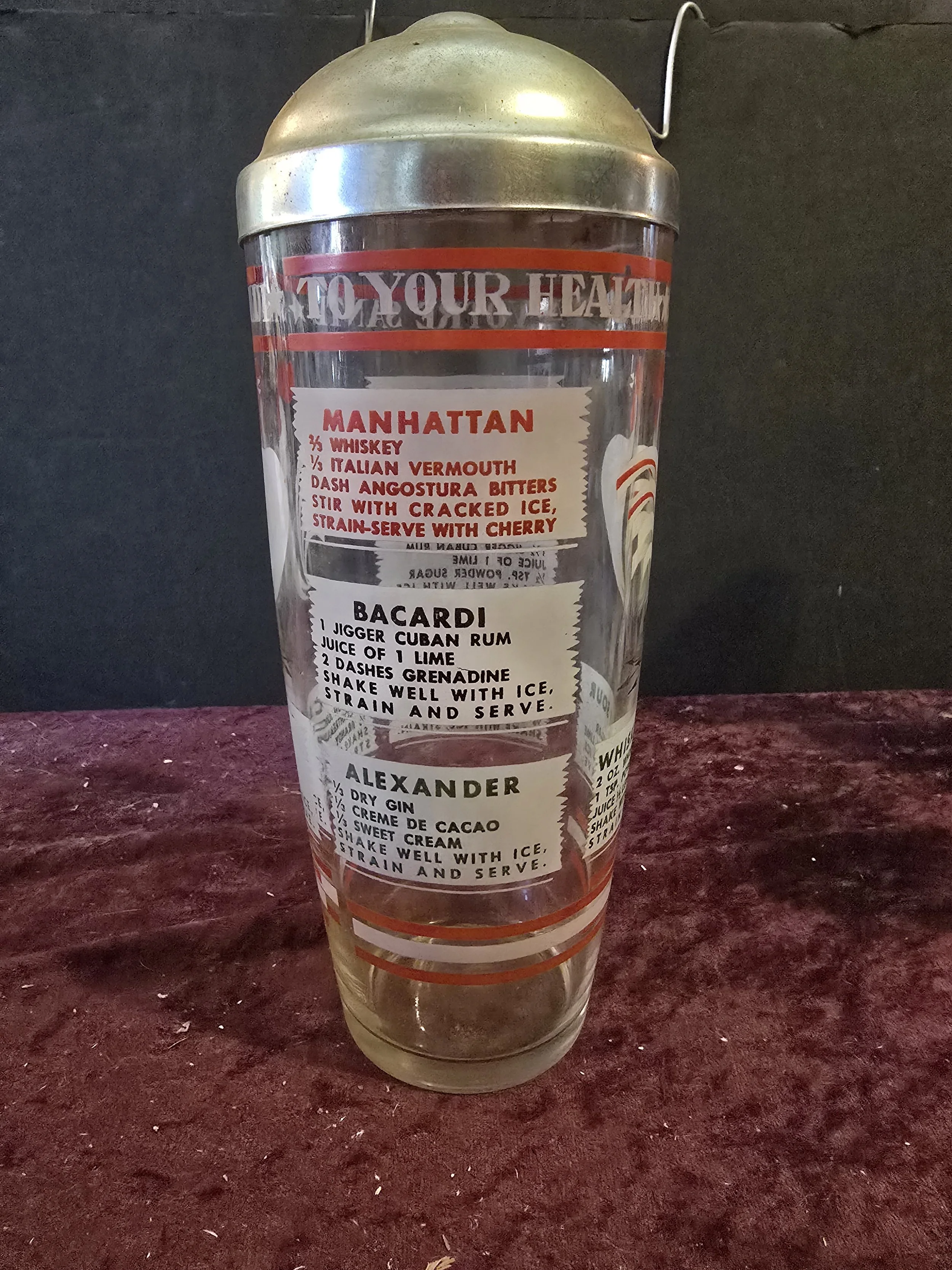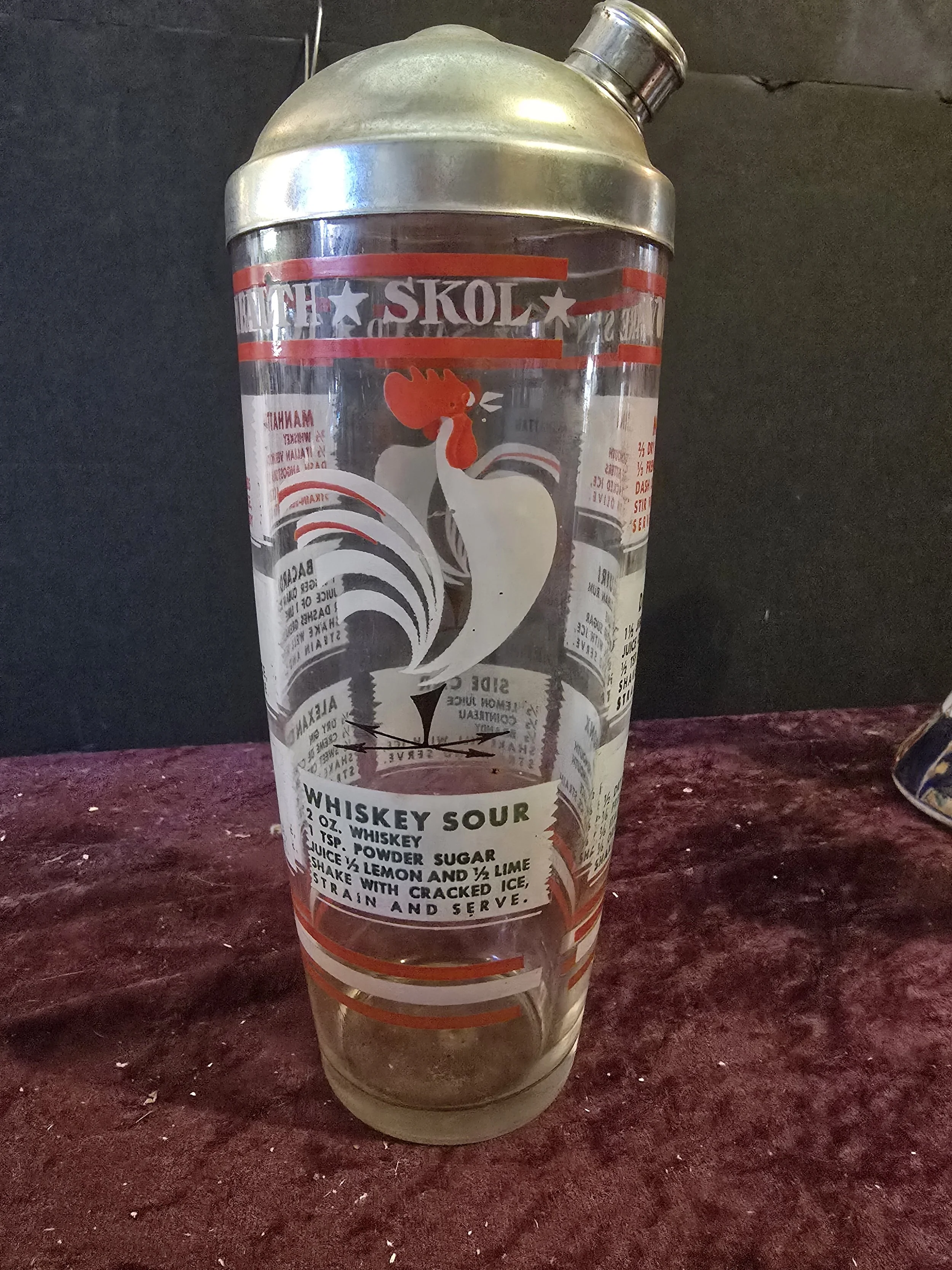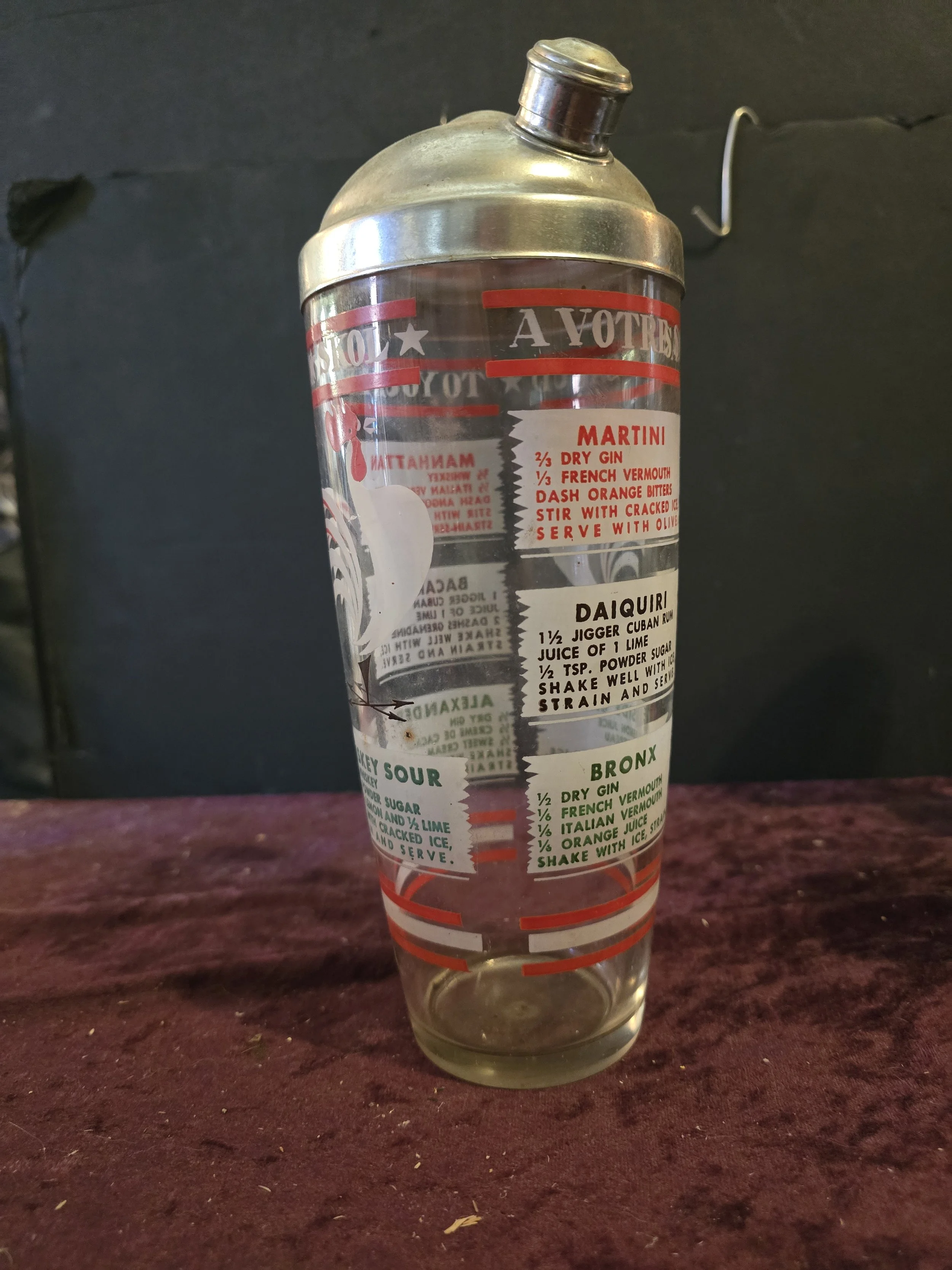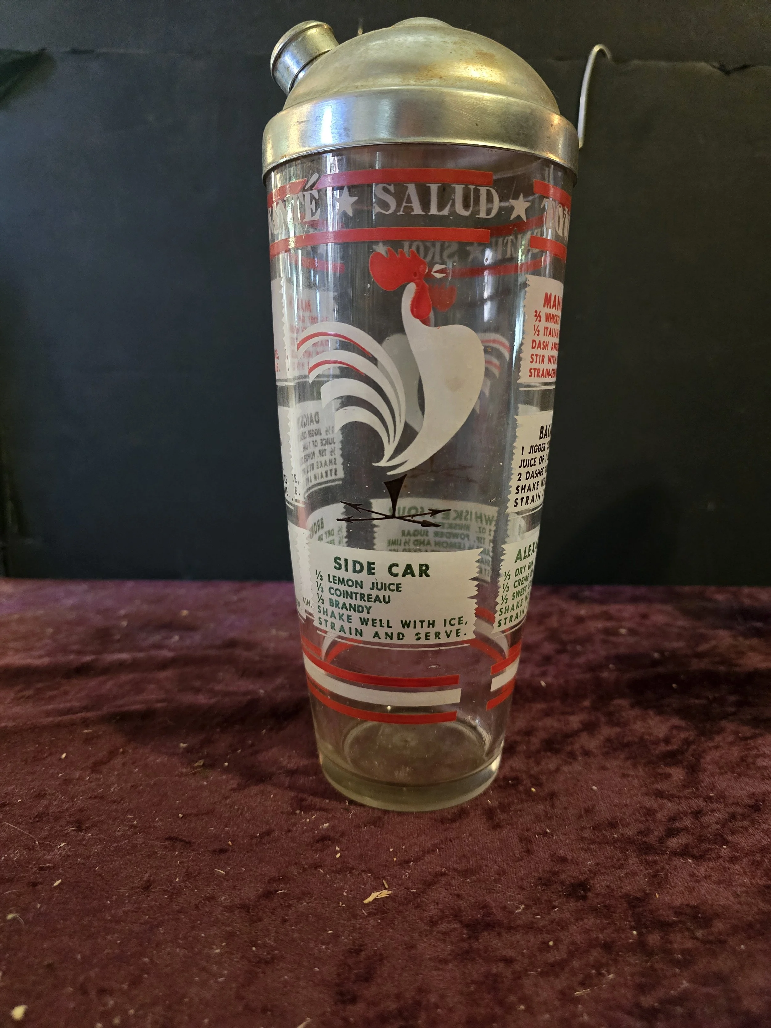 1950's-60's Hazel Atlas Rooster Cocktail Shaker. It is in very good condition with little wear to the recipes.