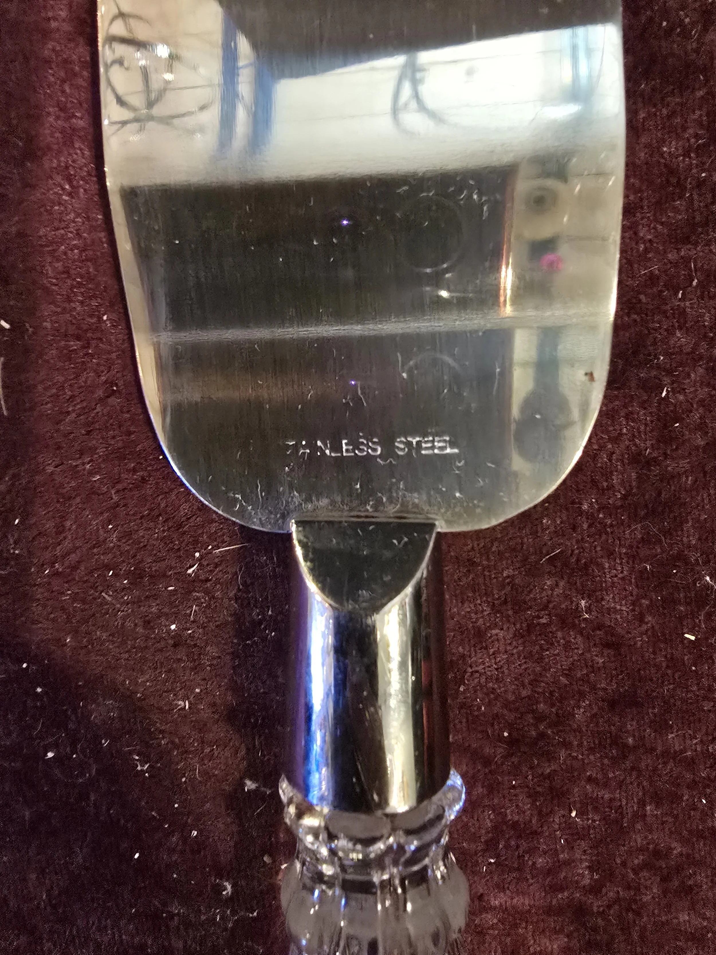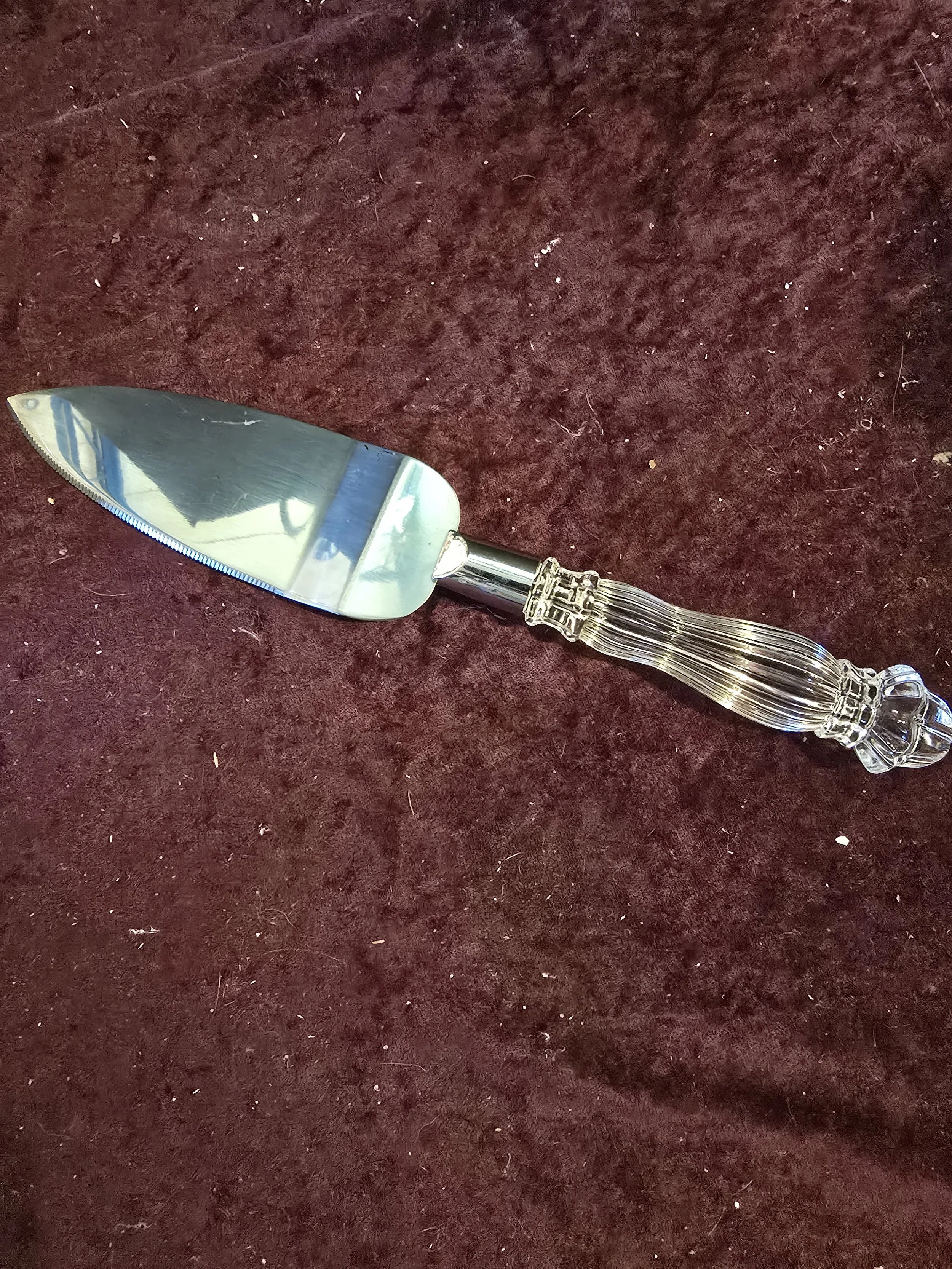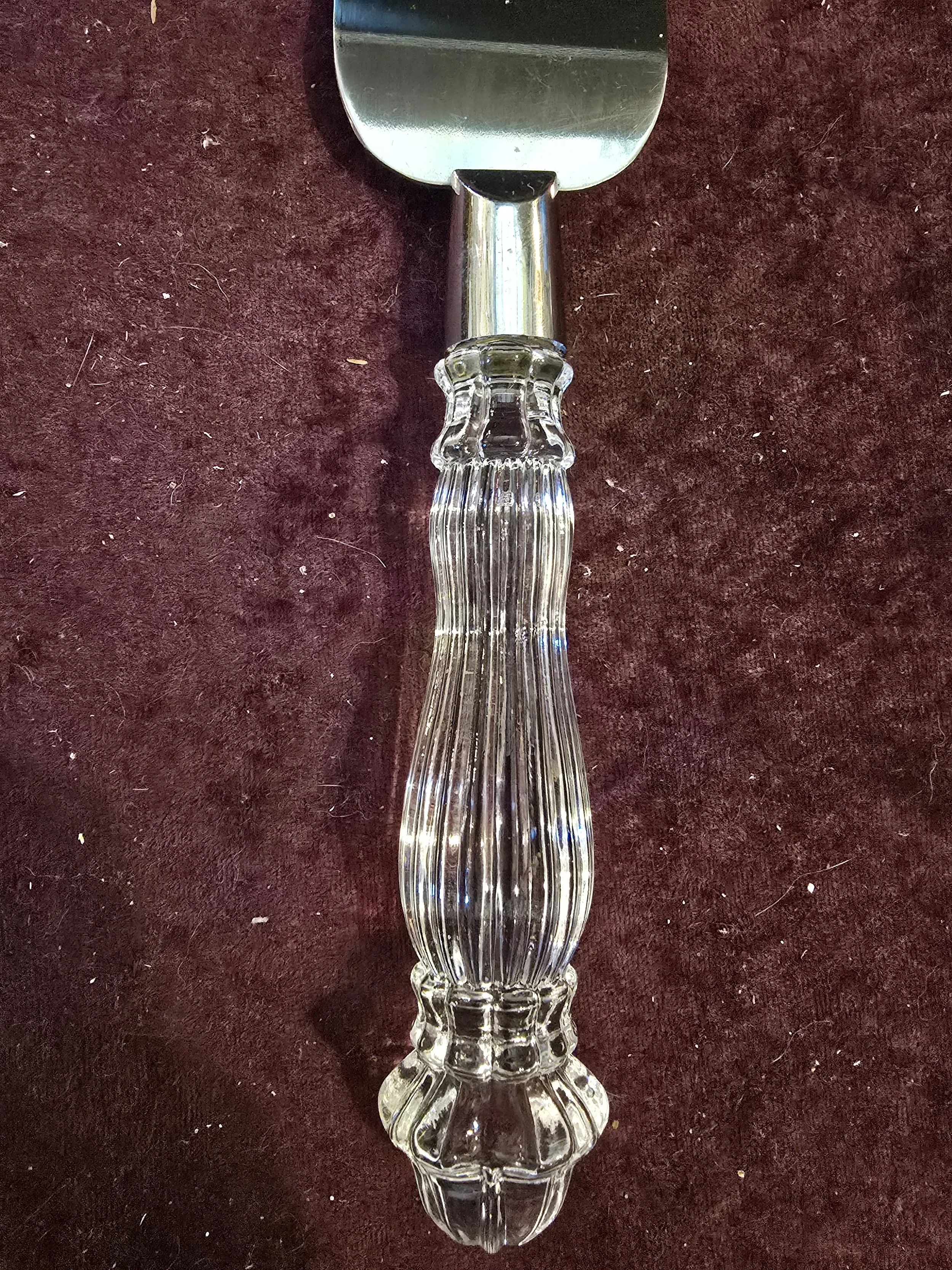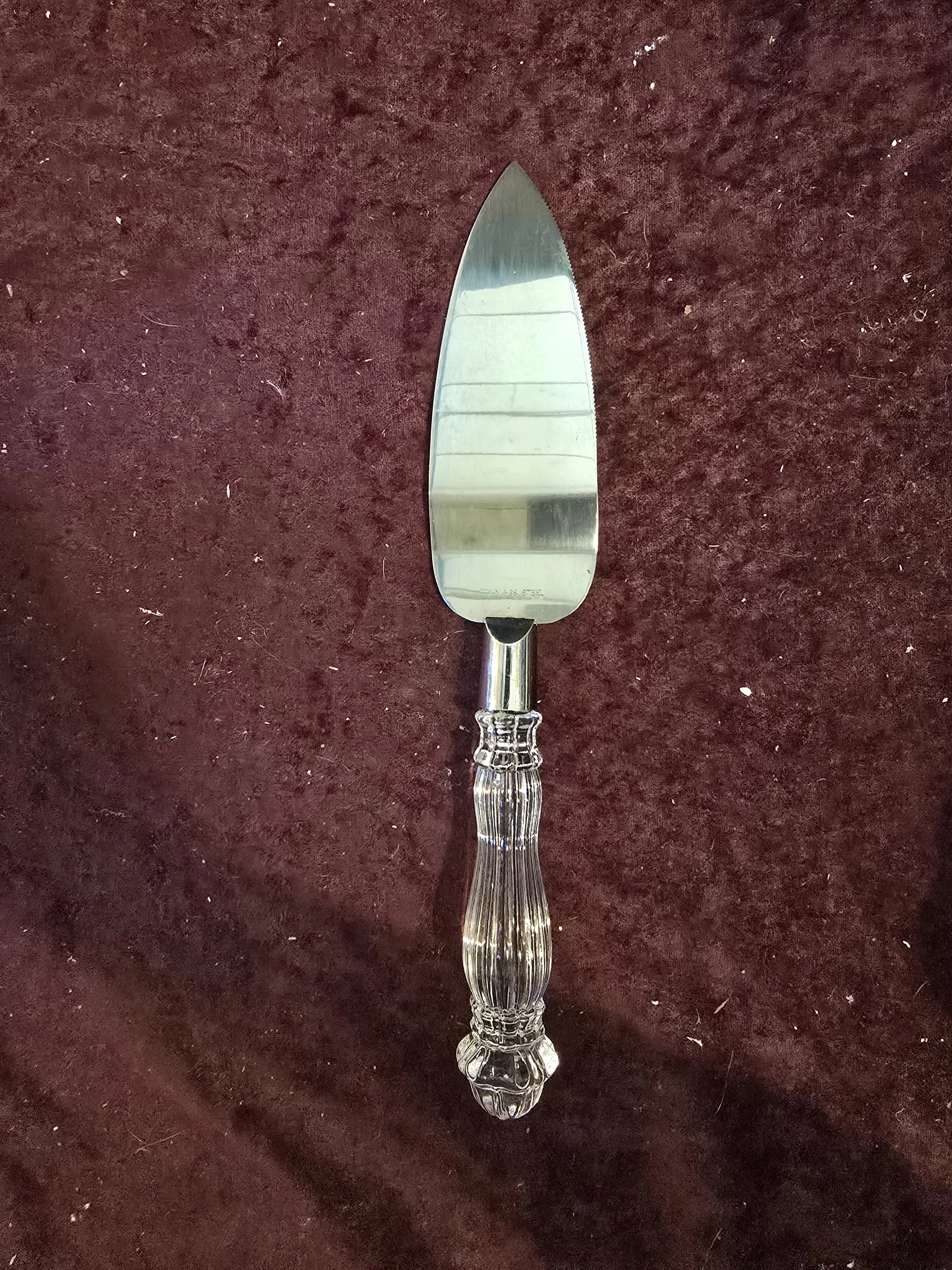Stainless steel serving knife with glass handle.