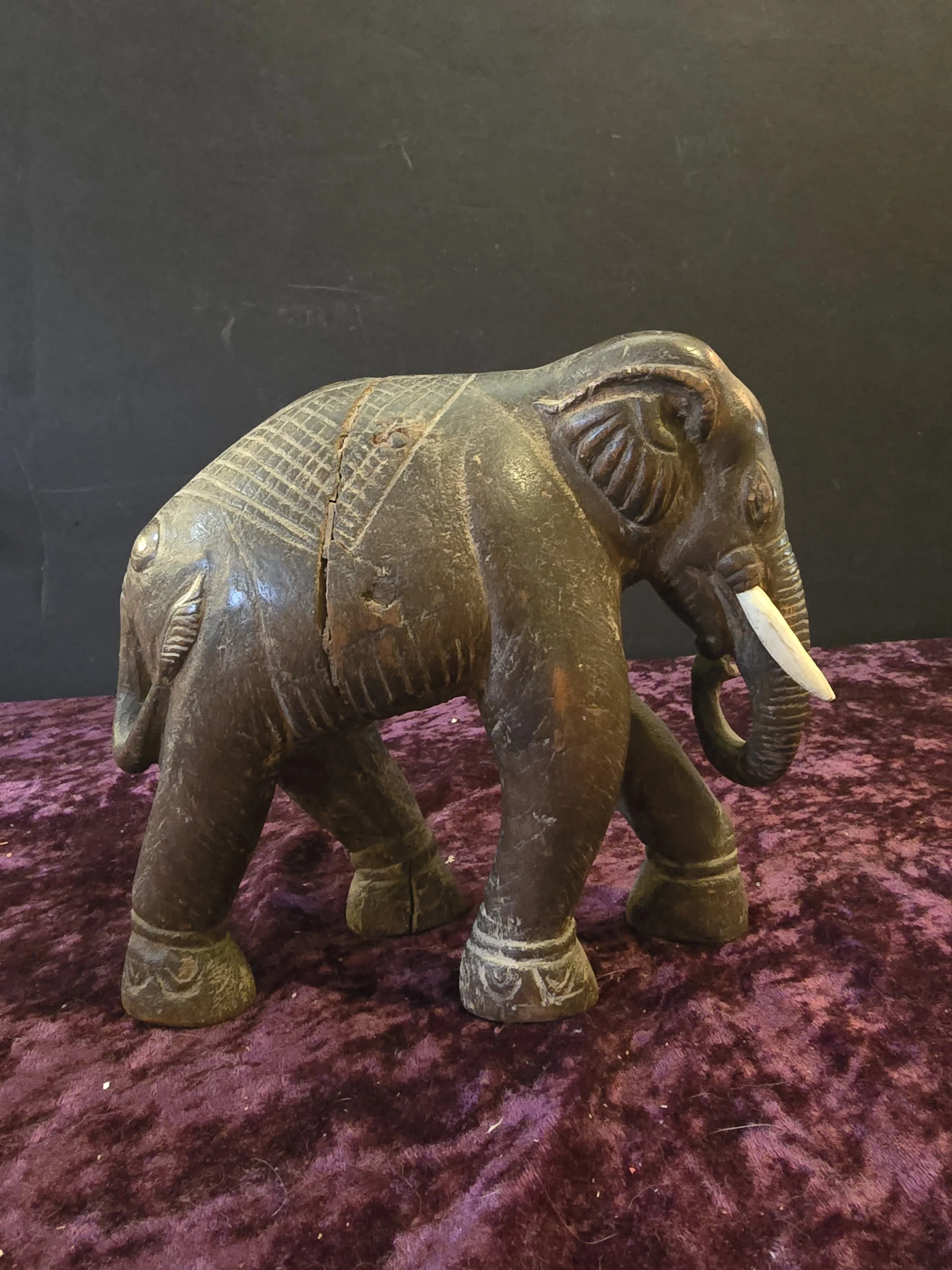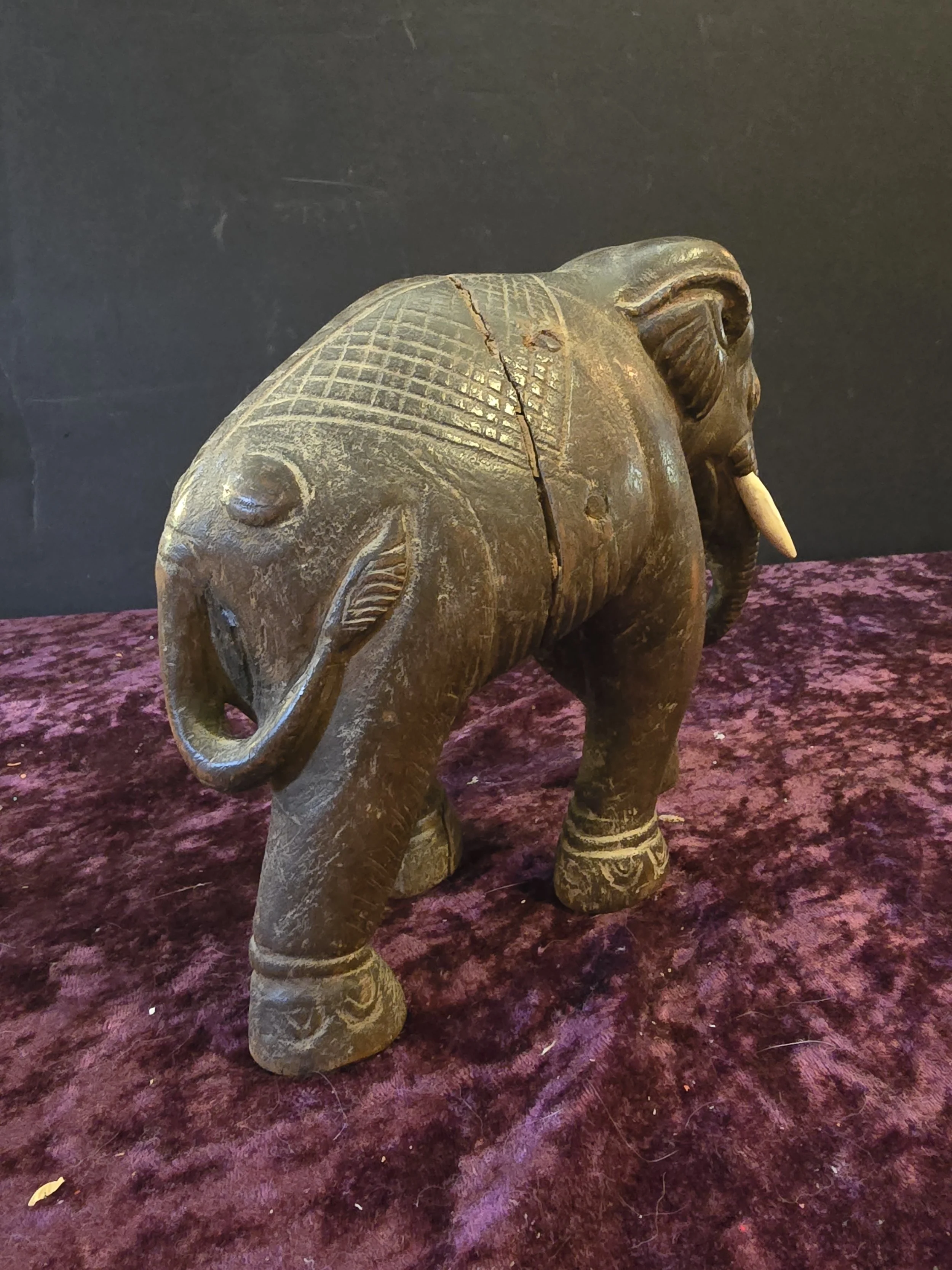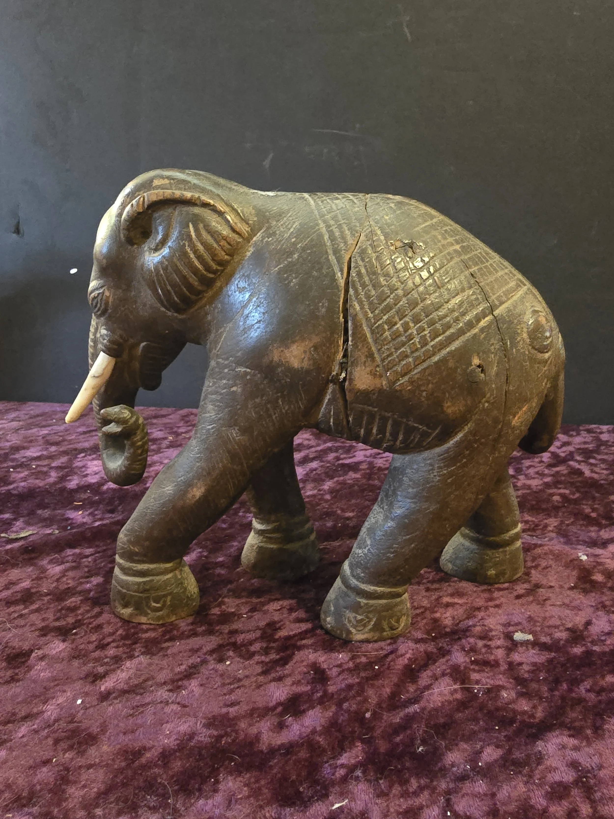 Carved wooden elephant figure. This elephant has a lot of detail. It is clearly an old piece. The wood has split a bit on the body, but the piece still feels sturdy.