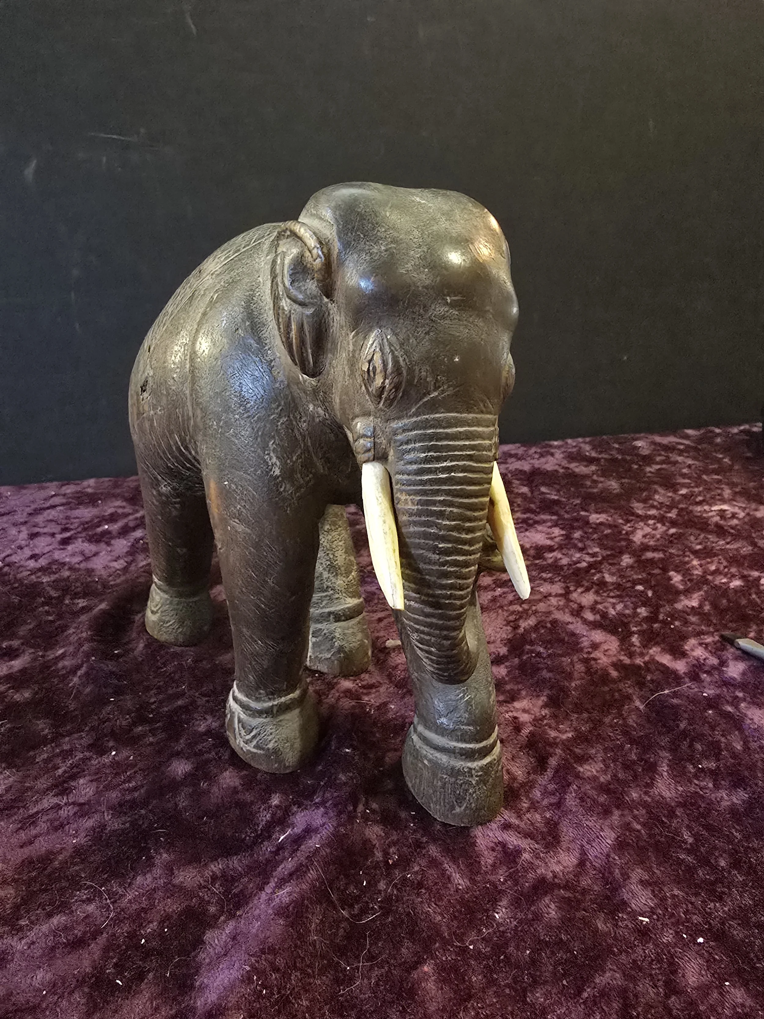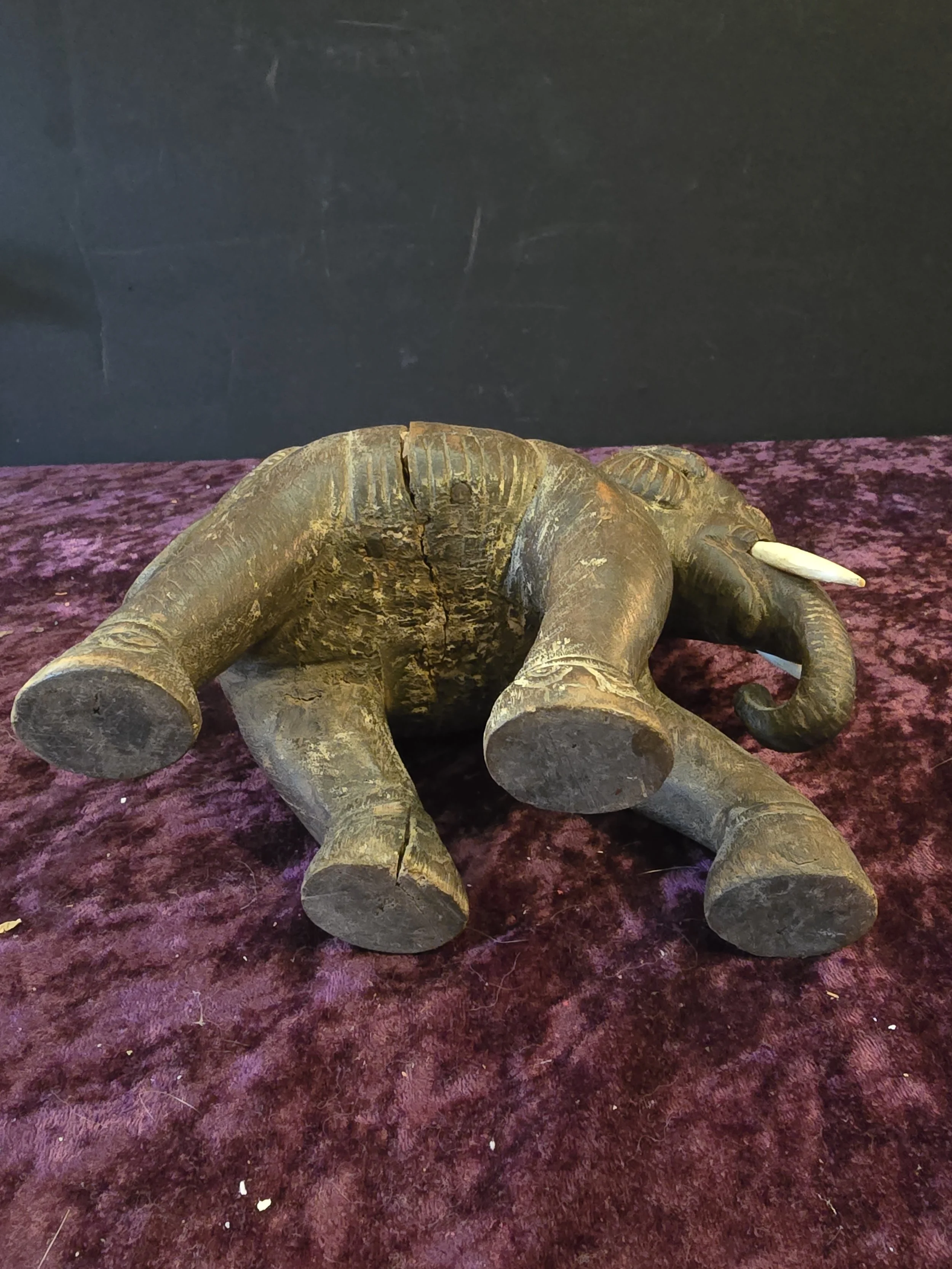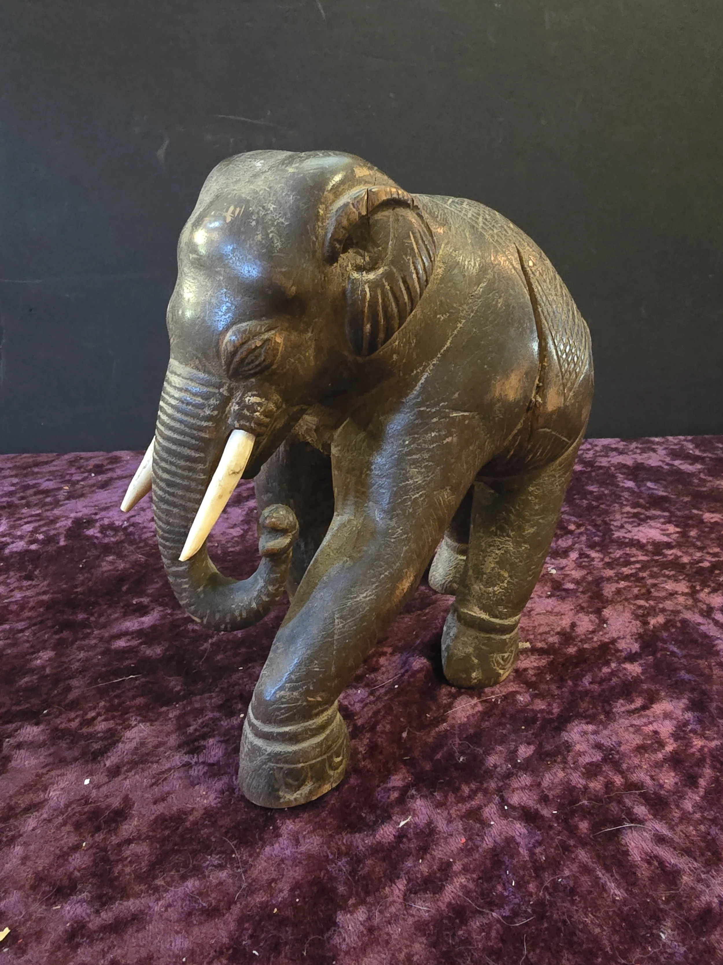 Carved wooden elephant figure. This elephant has a lot of detail. It is clearly an old piece. The wood has split a bit on the body, but the piece still feels sturdy.