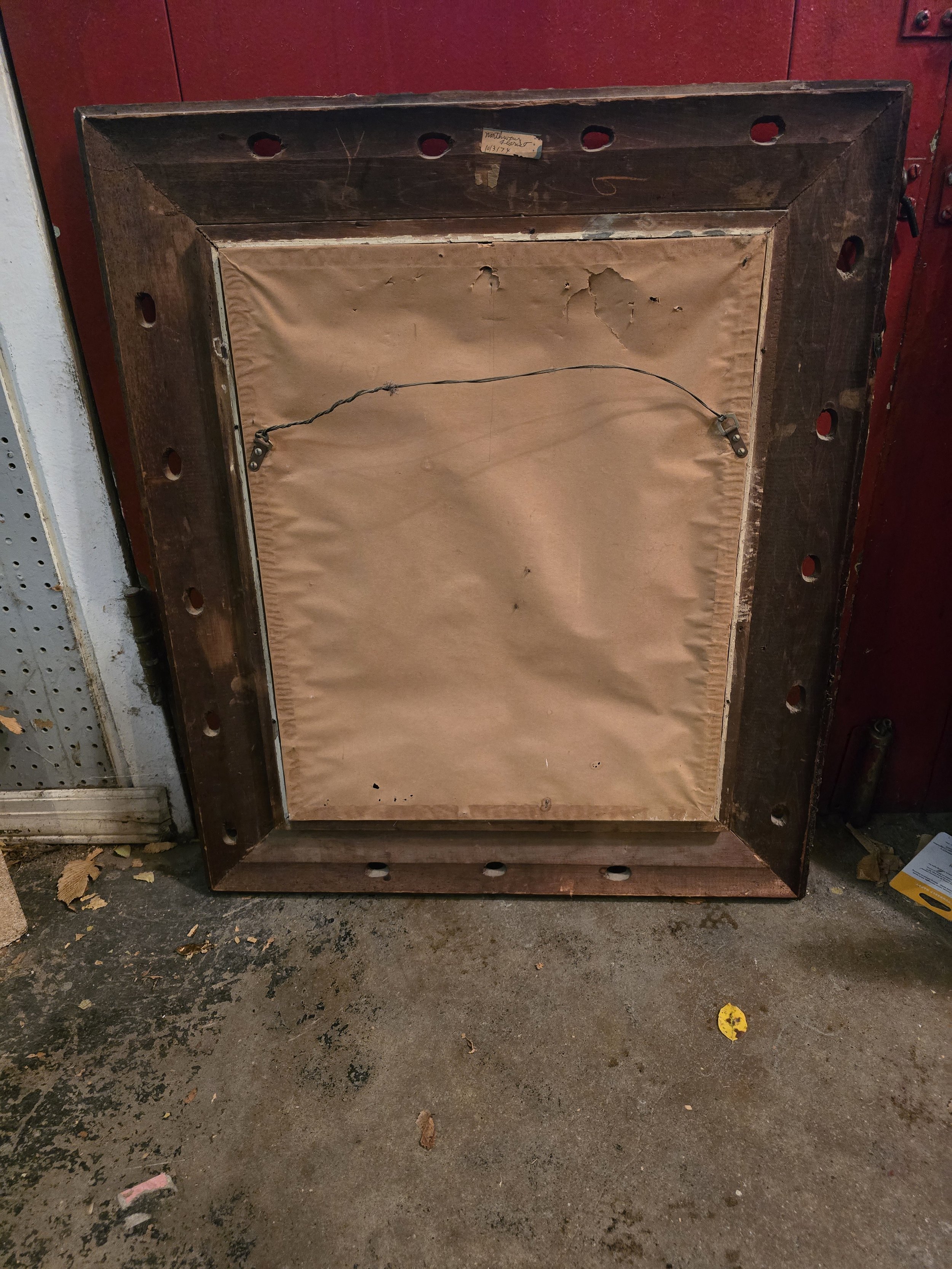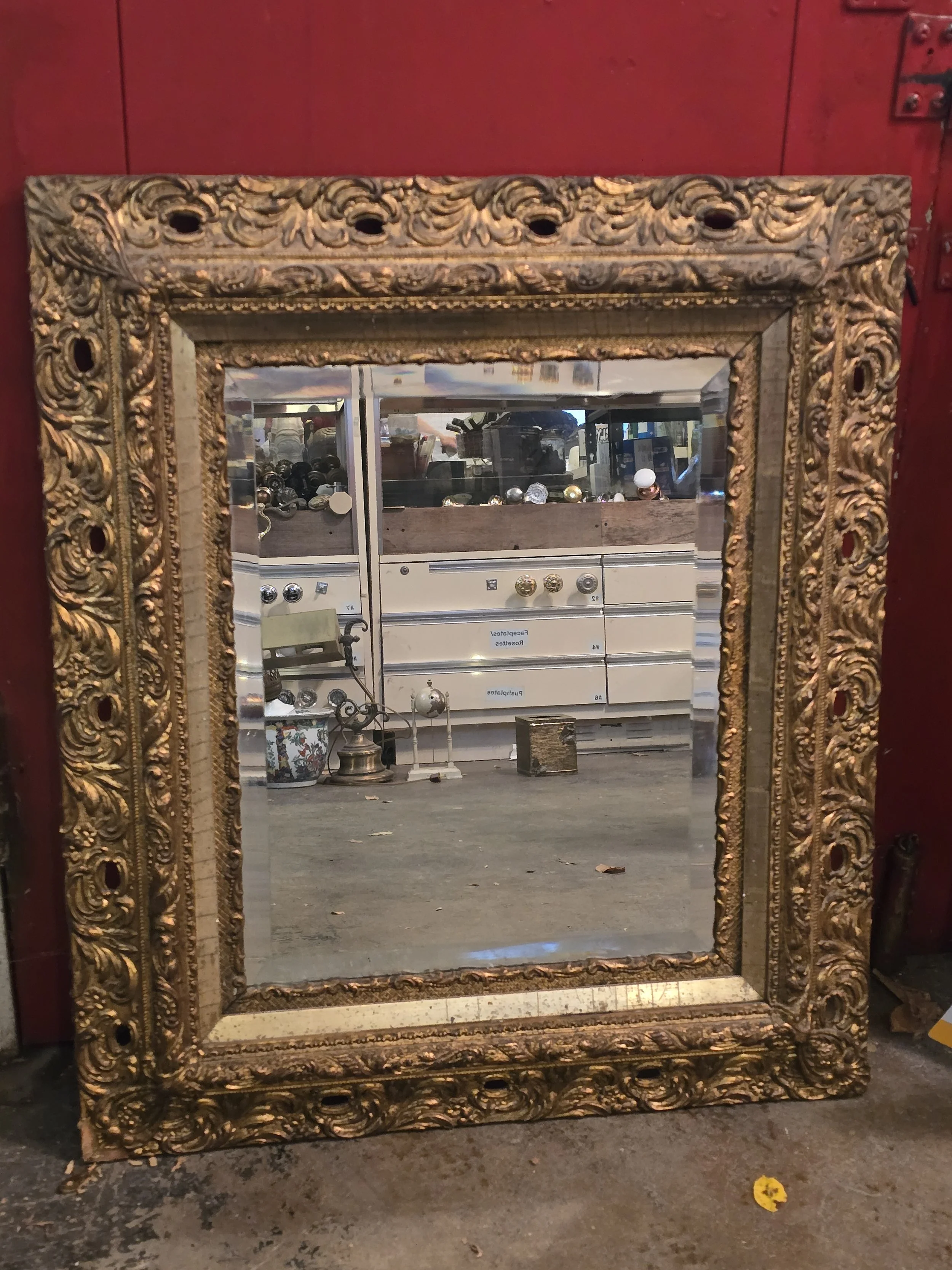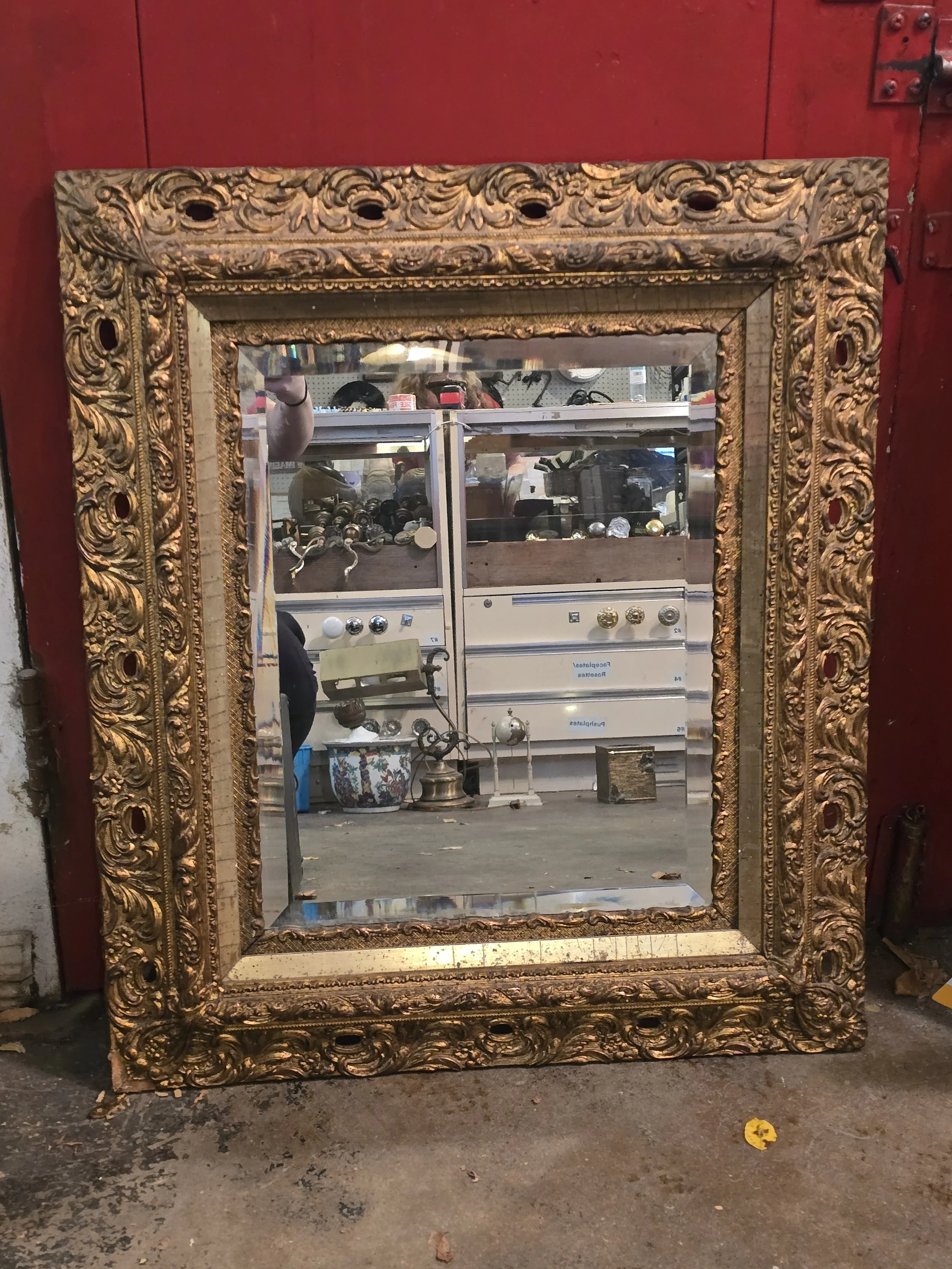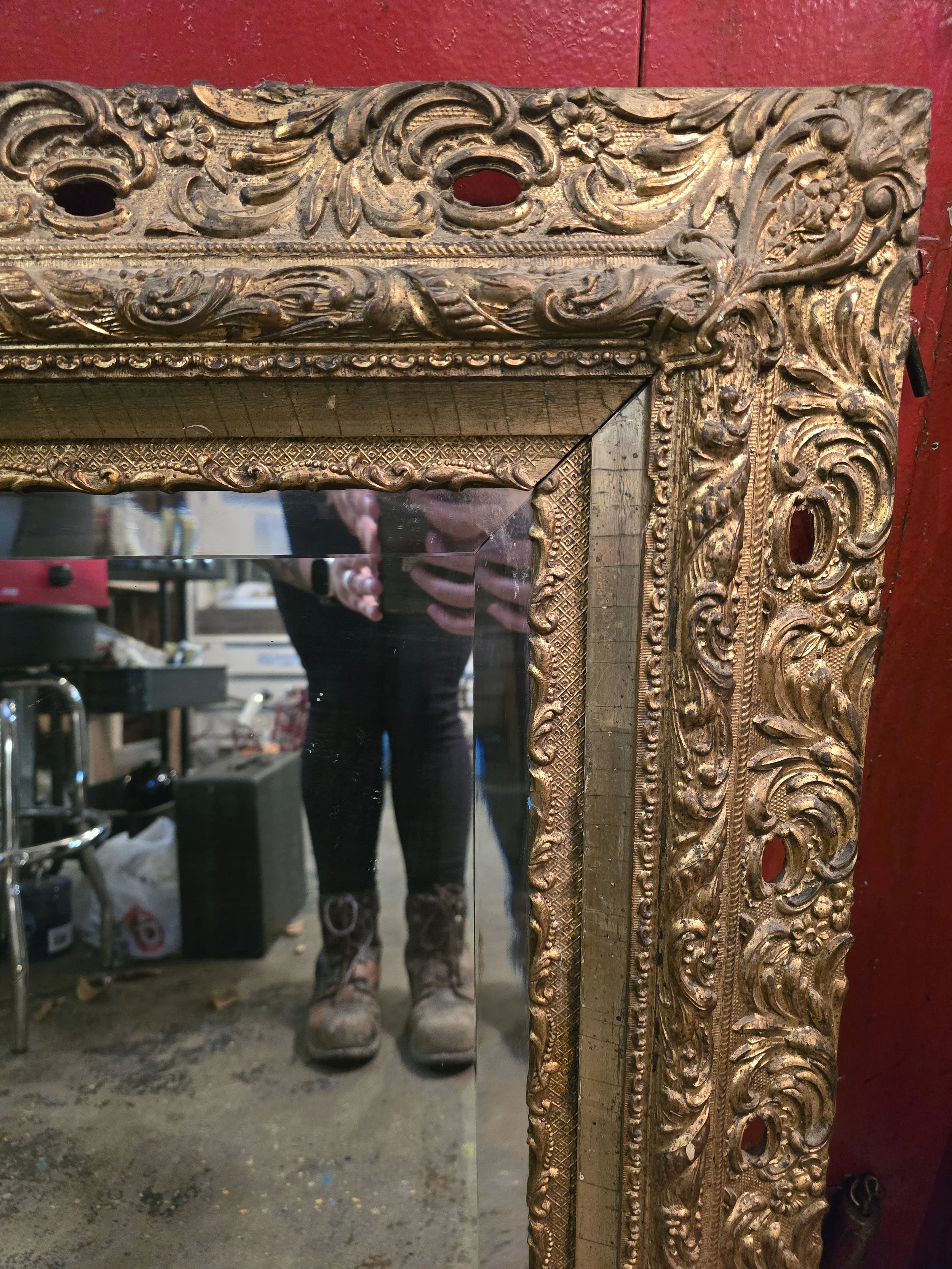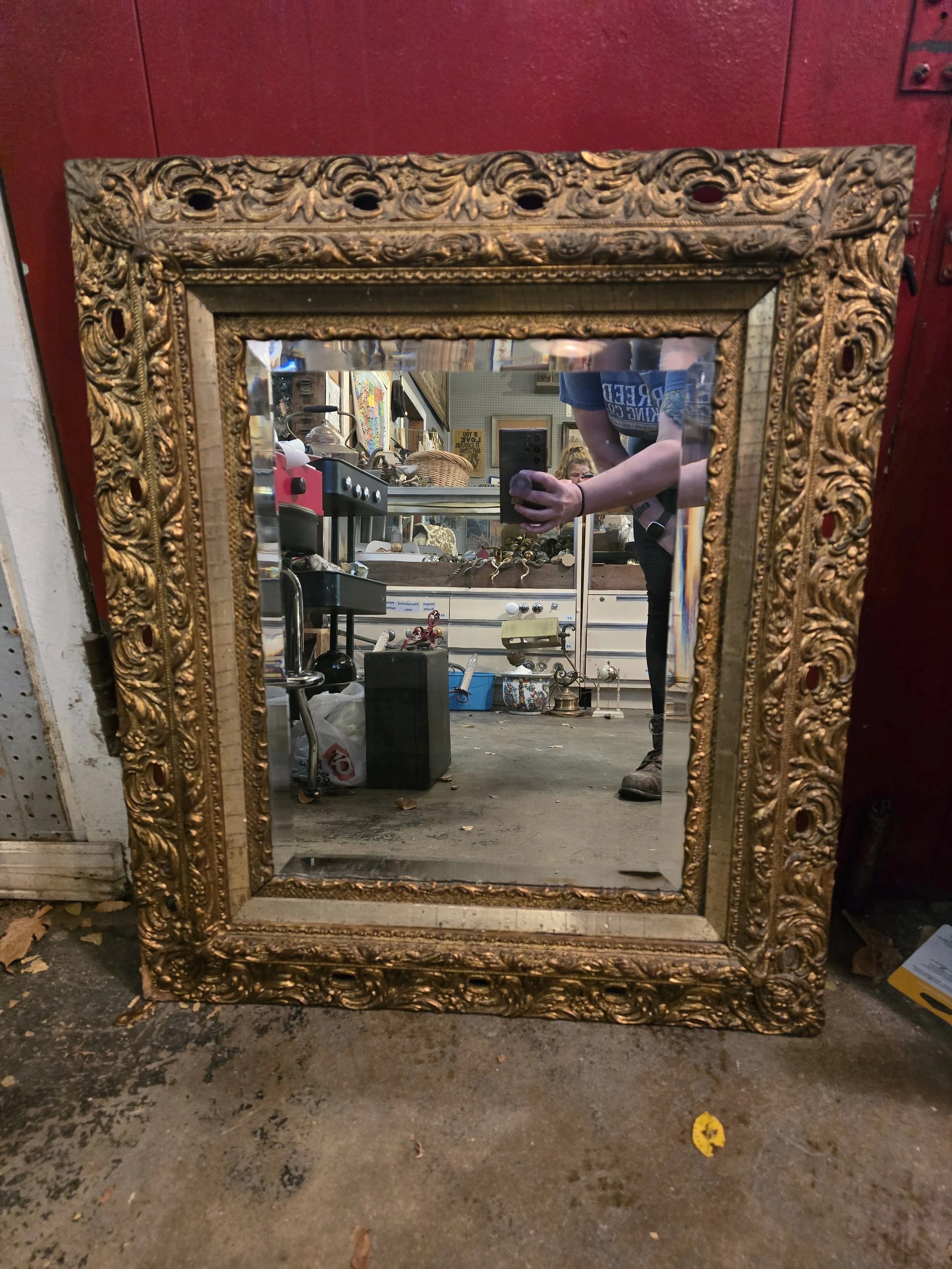 Made of wood and plaster. It is a pretty piece. Mirror is beveled. Mirror is 26.25” x 30.5”