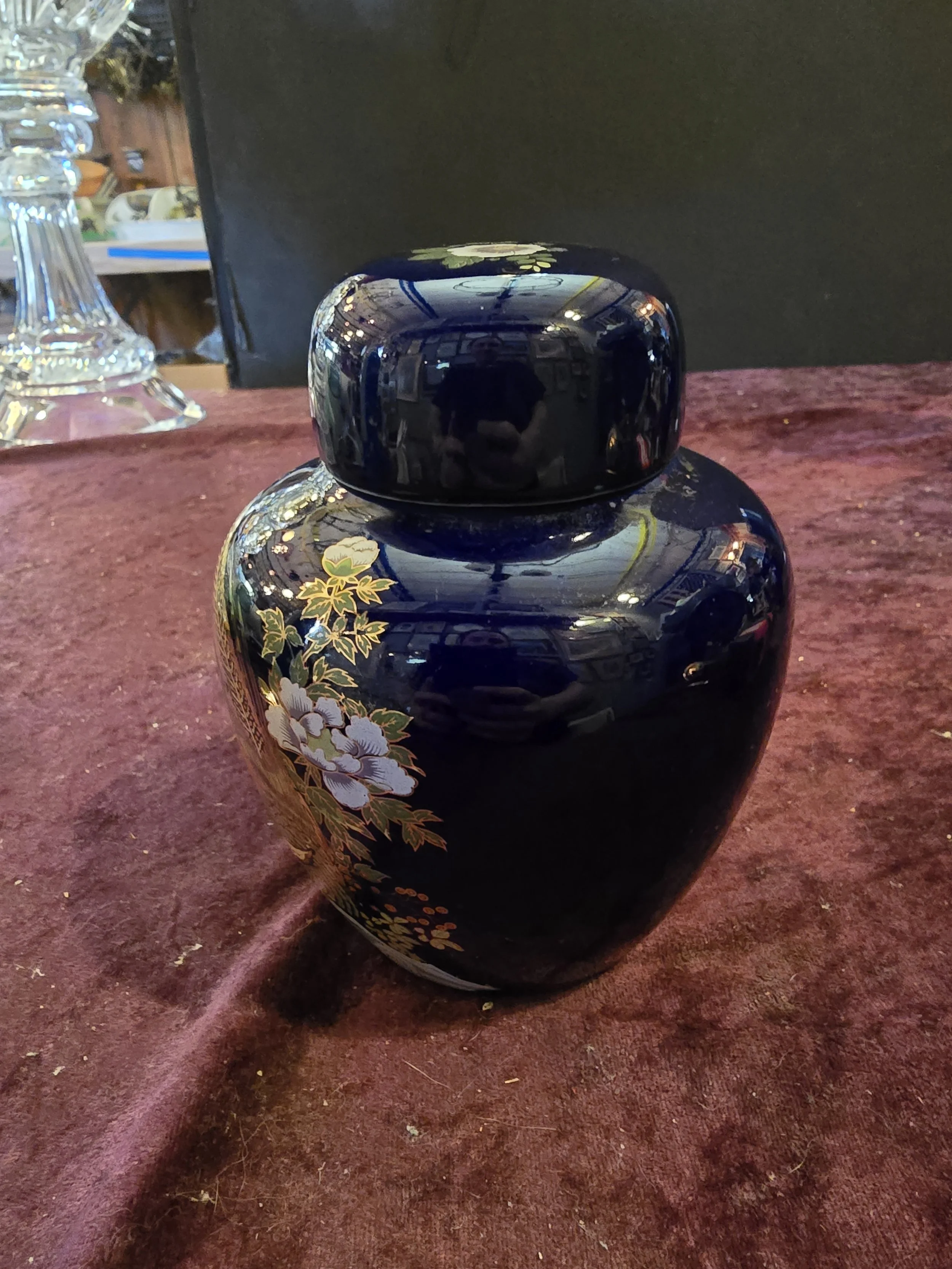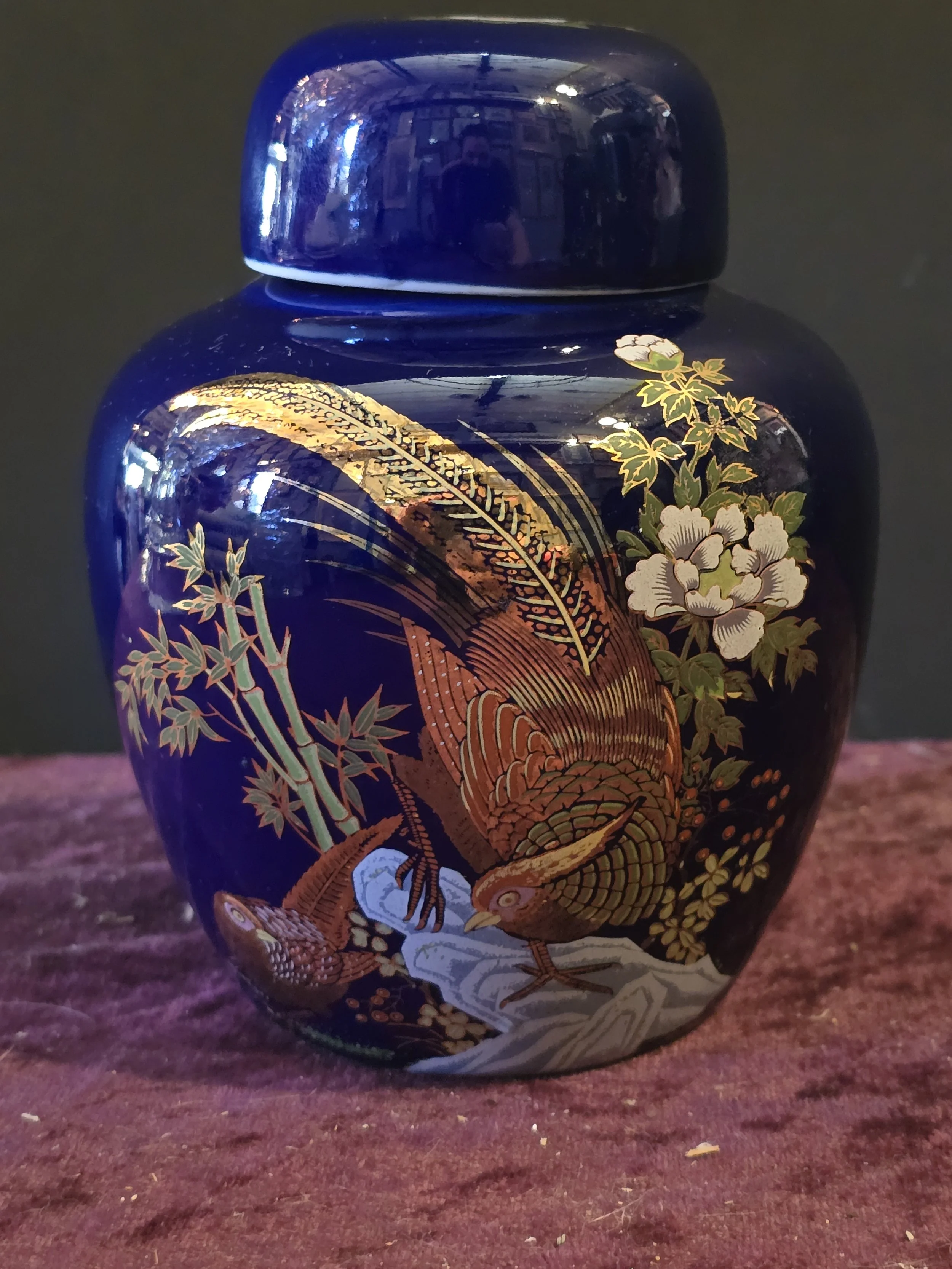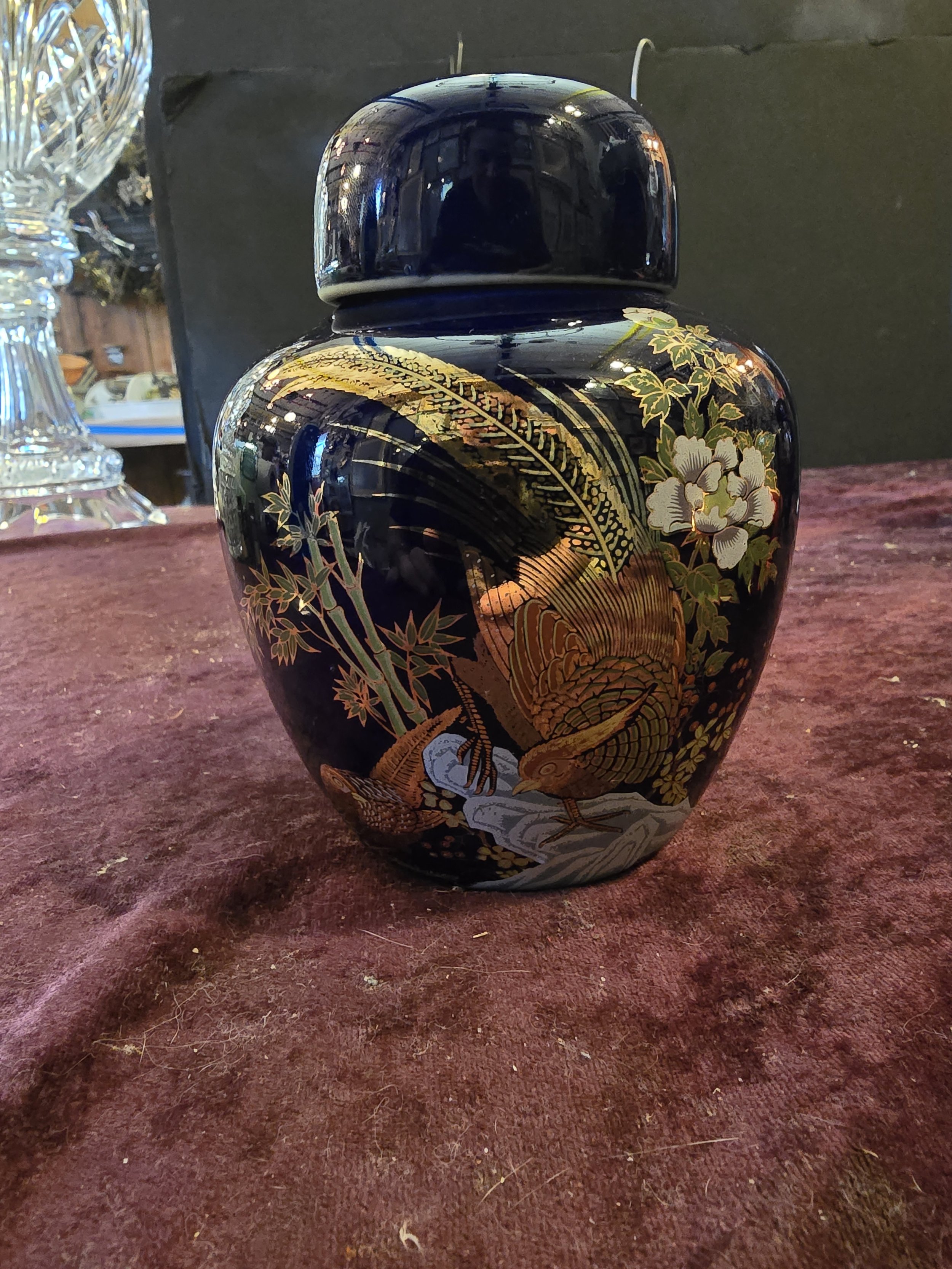 Vintage Cobalt Blue Ginger Jar: Floral Peacock Japanese Ceramic