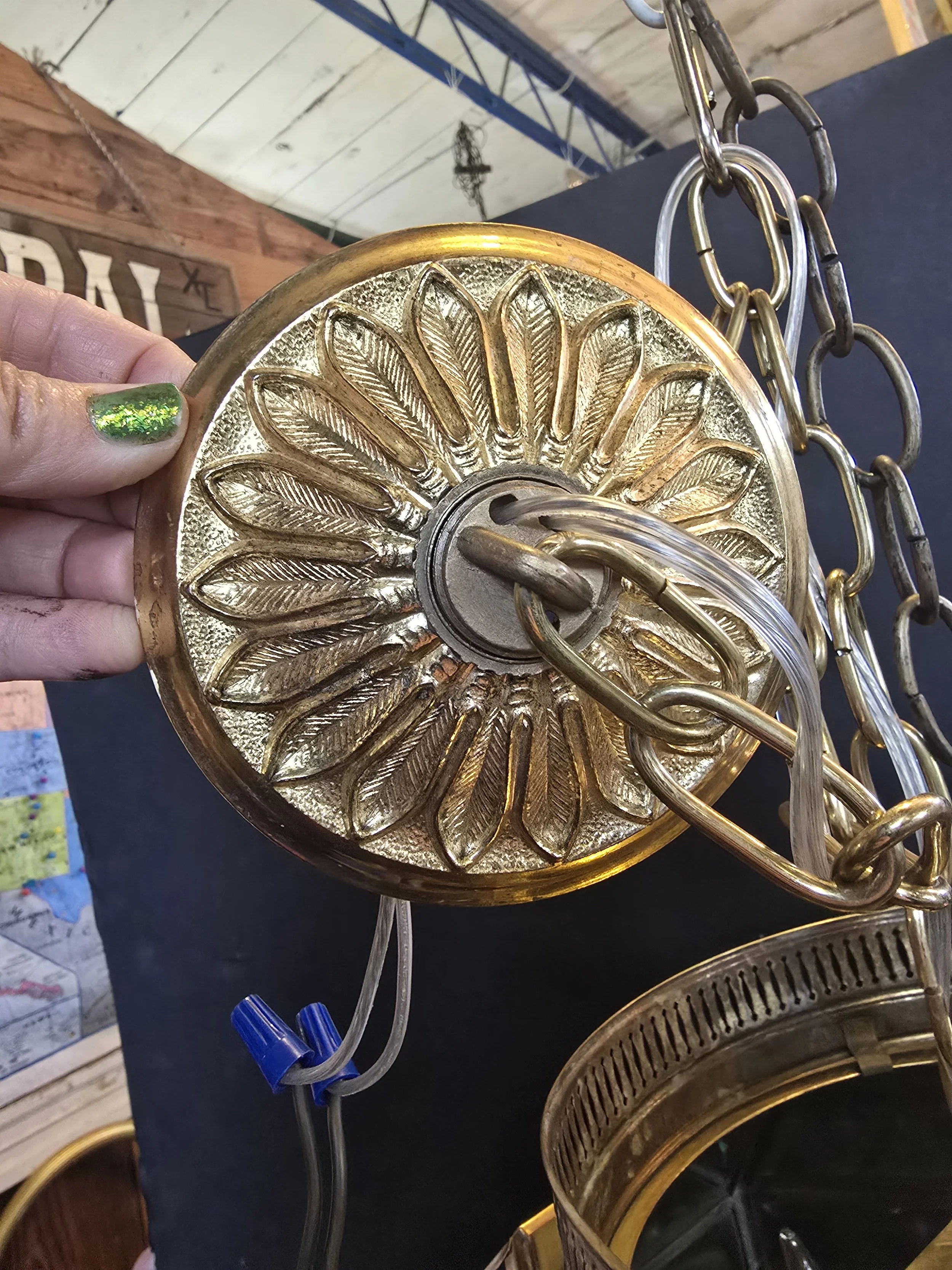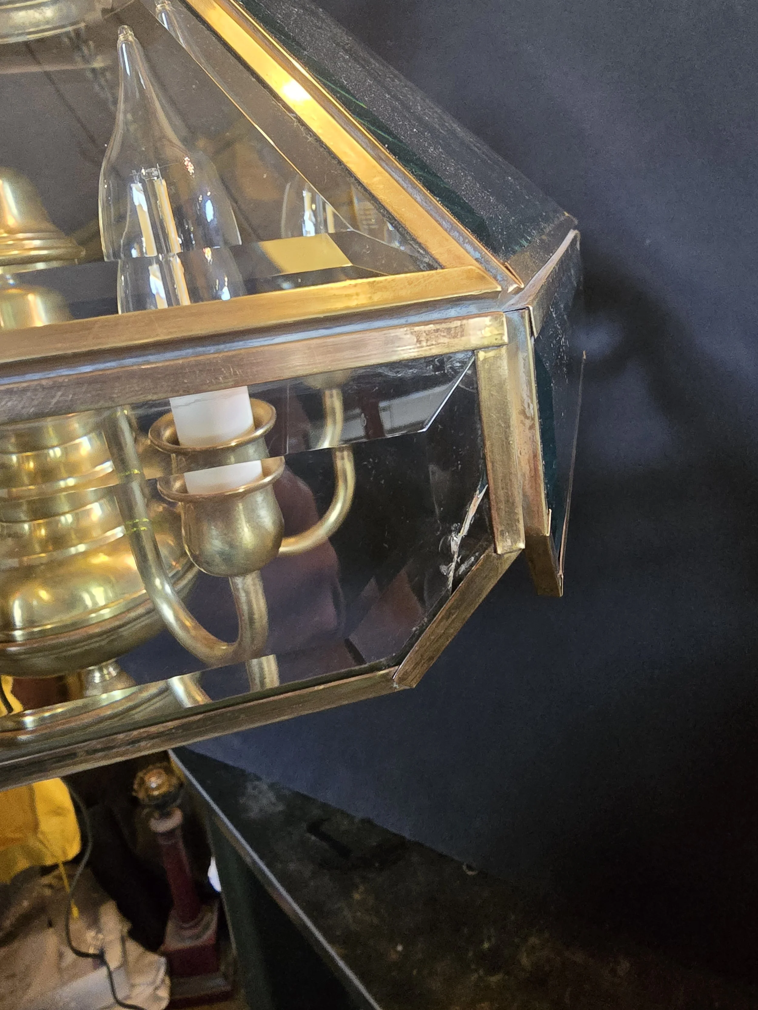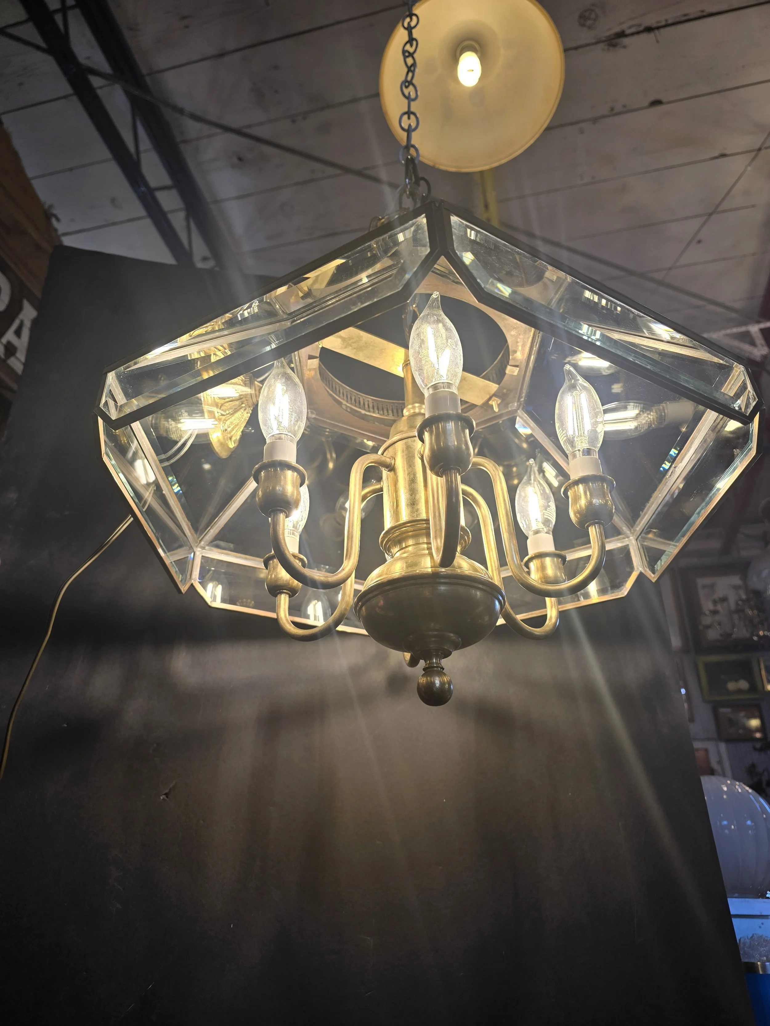 Unlacquered brass chandelier with 6 bulbs. This chandelier has beveled glass panes. It has all new wire and sockets. There is a small chip in one corner that is barely noticeable.