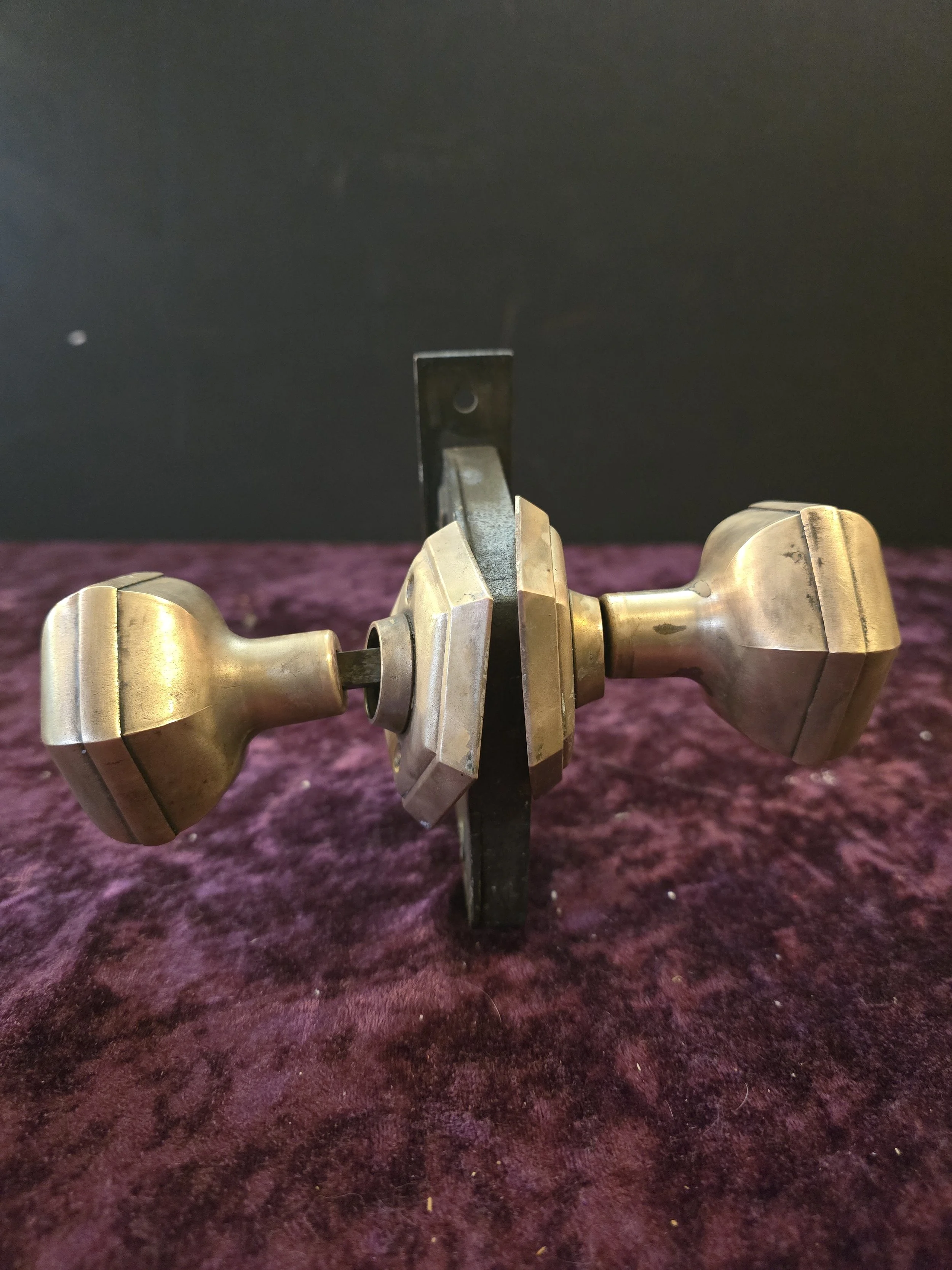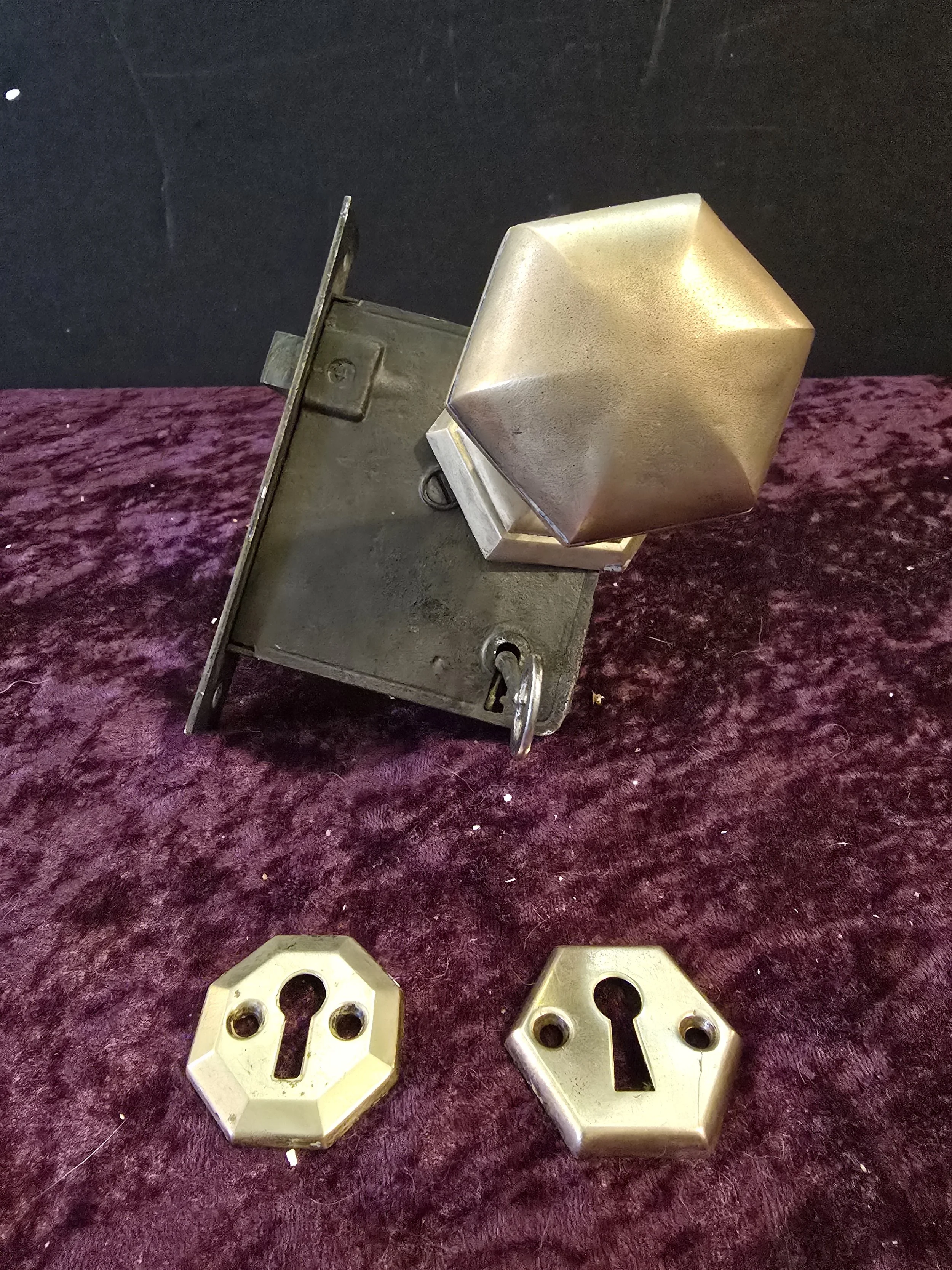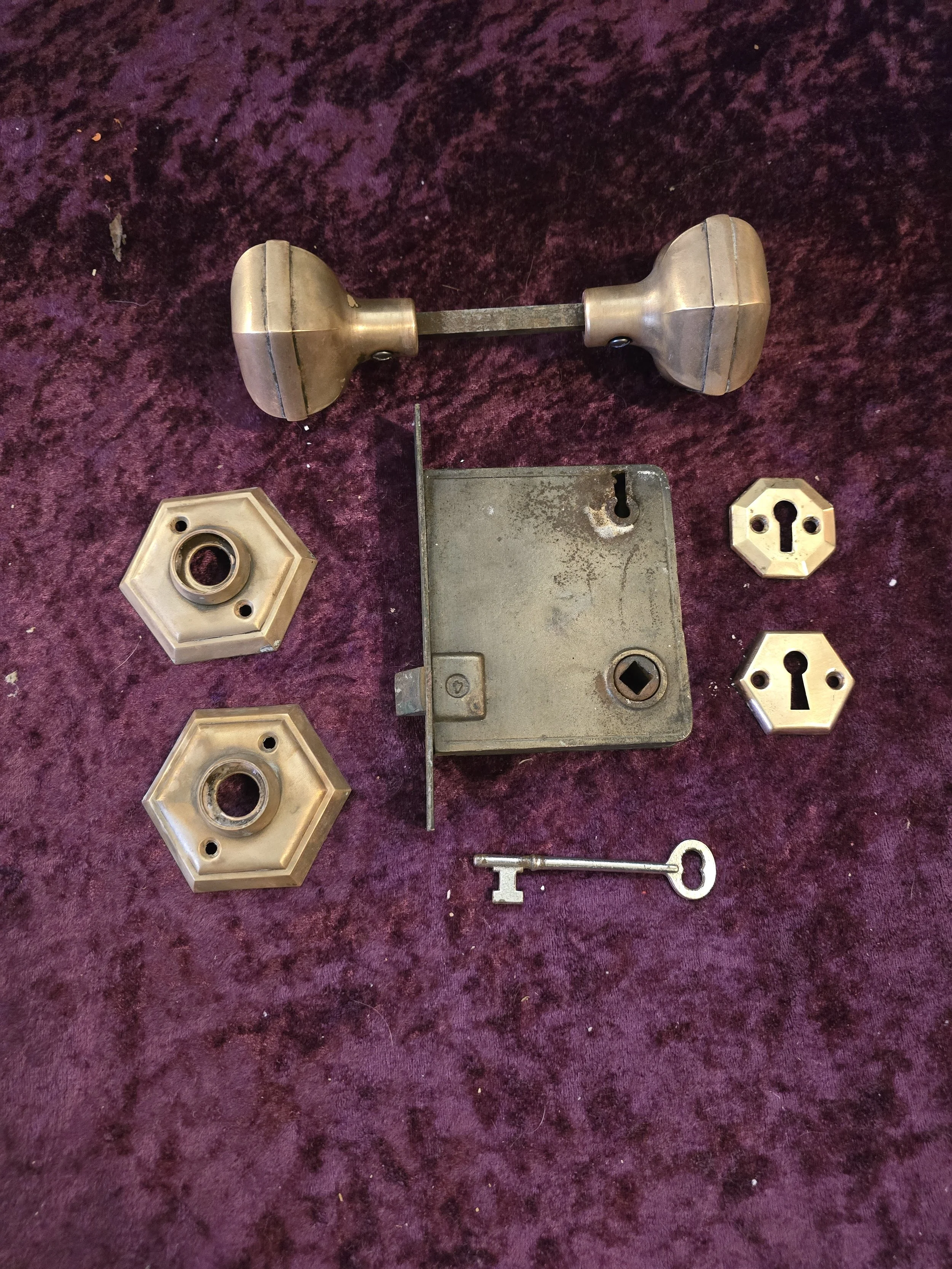 Gorgeous hexagonal antique interior door knob set. The set includes the hexagonal brass knob and back plates, 2 escutcheons, the mortise lock, and a key.