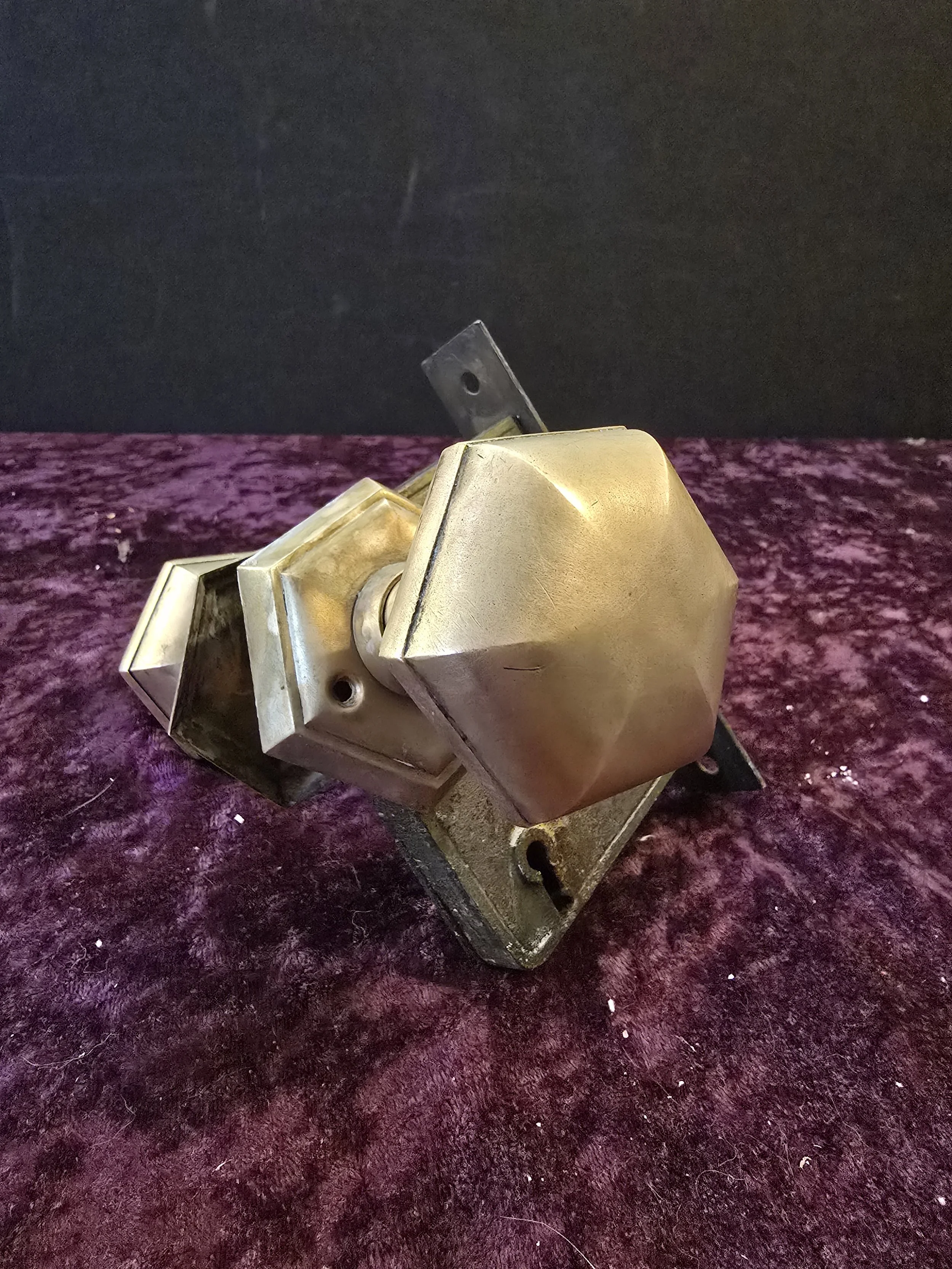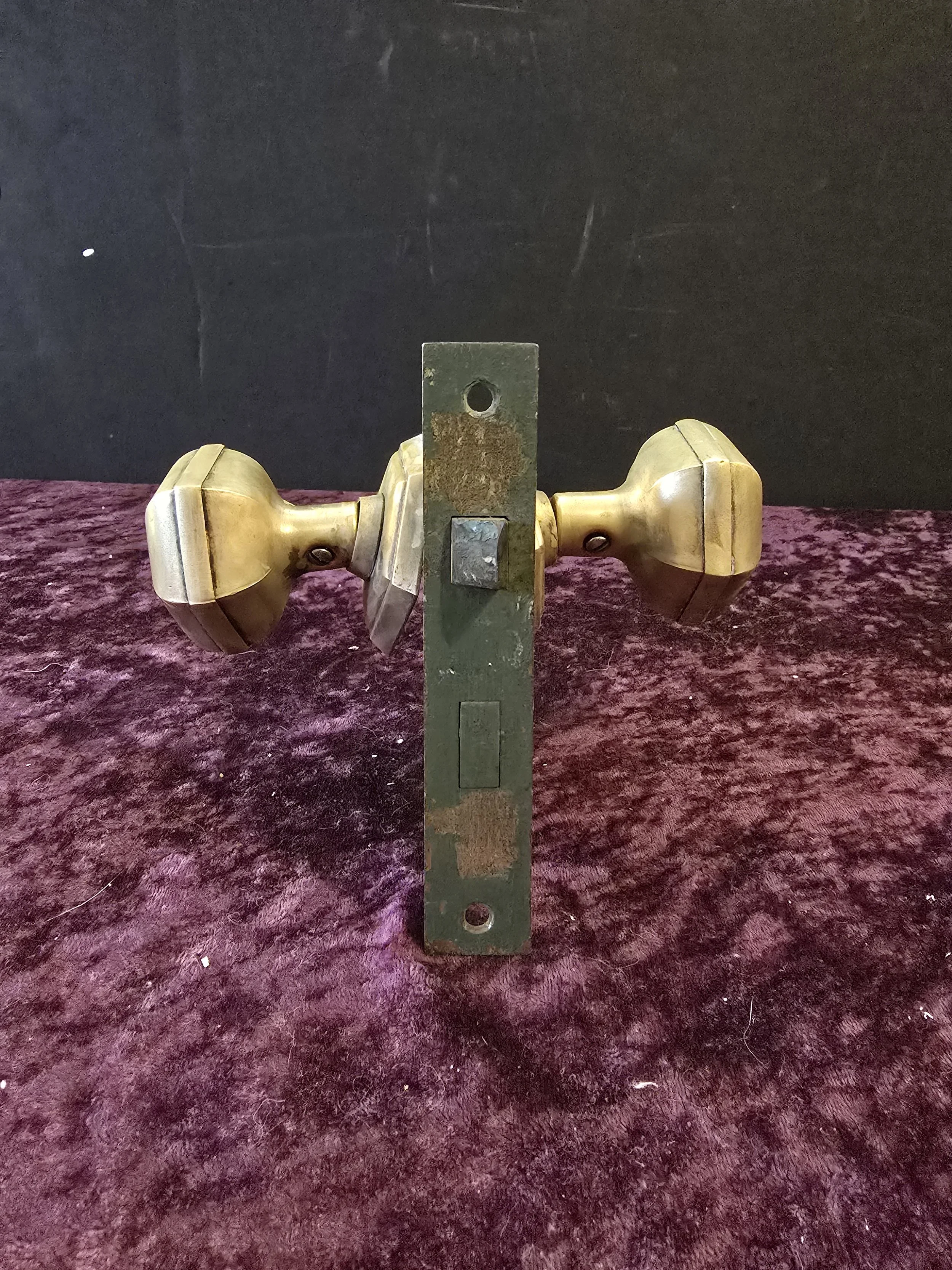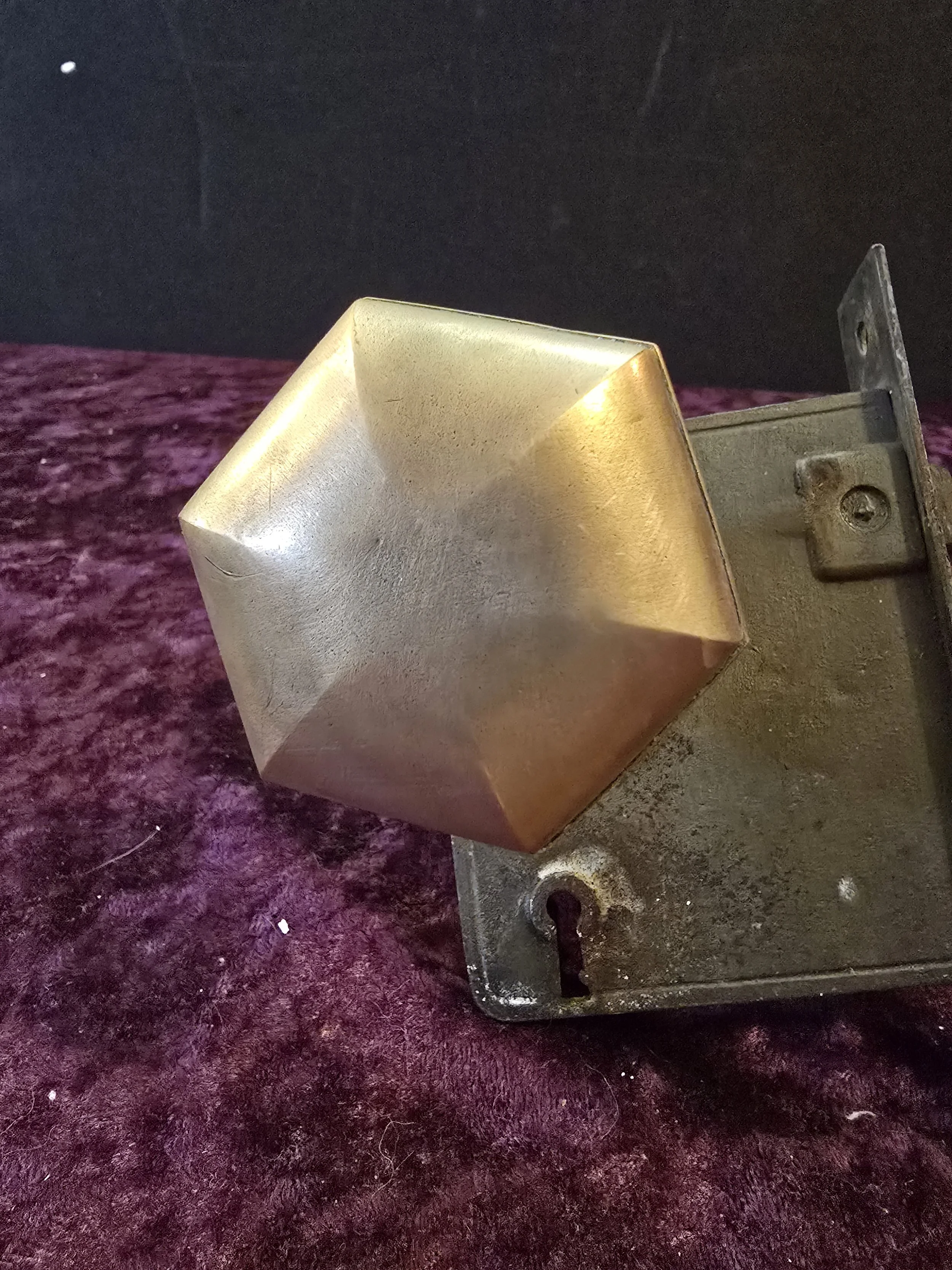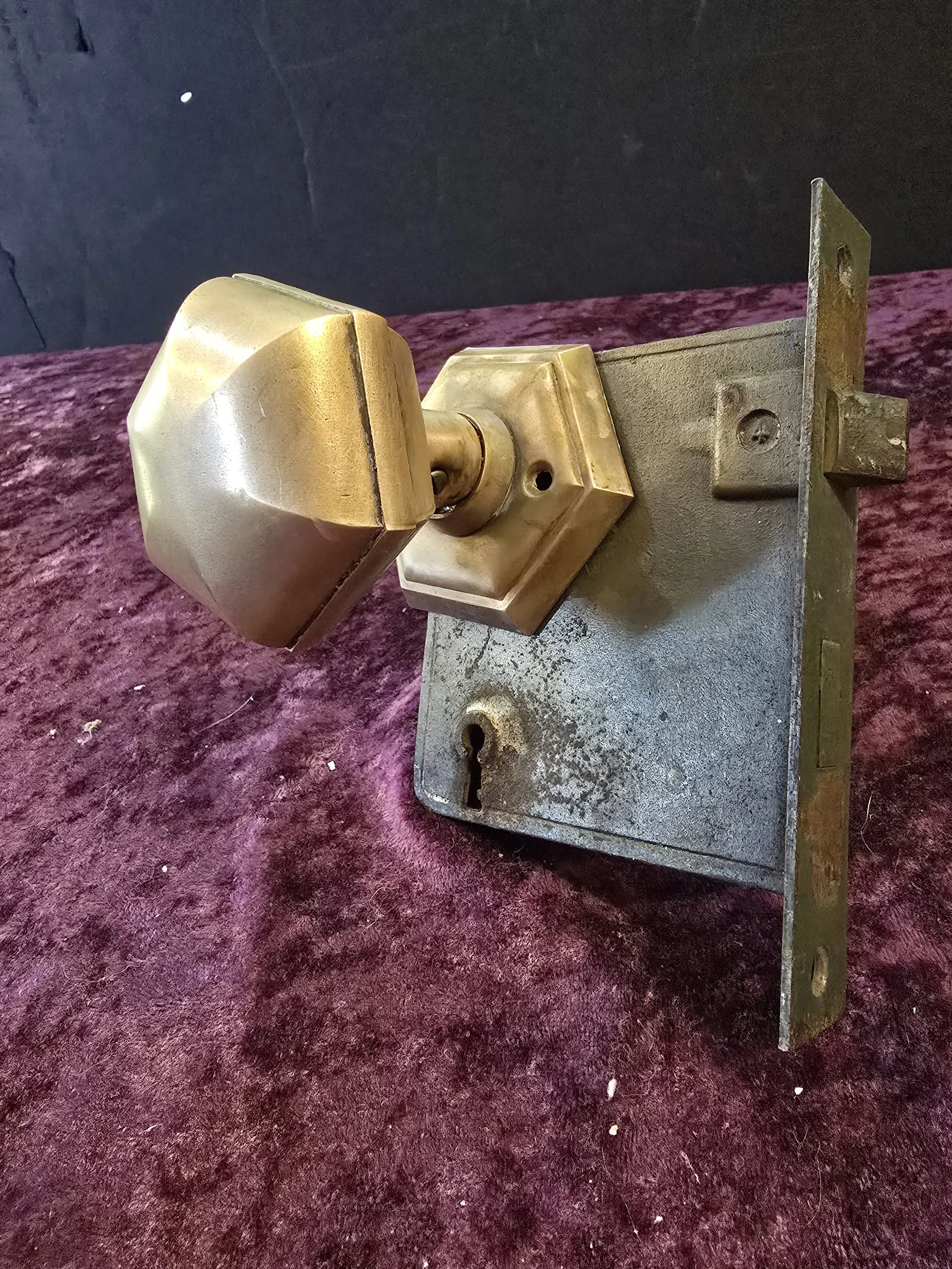 Gorgeous hexagonal antique interior door knob set. The set includes the hexagonal brass knob and back plates, 2 escutcheons, the mortise lock, and a key.