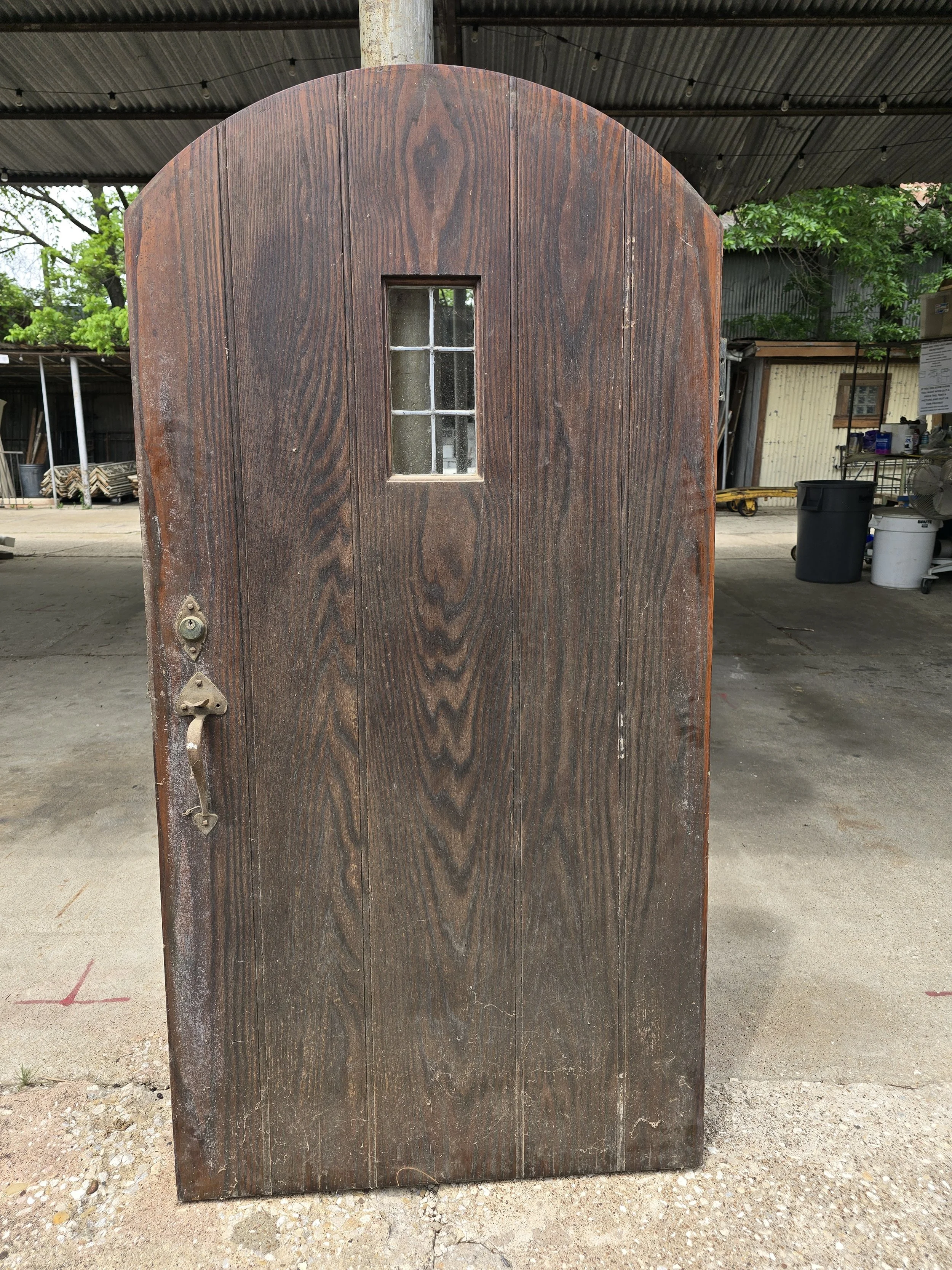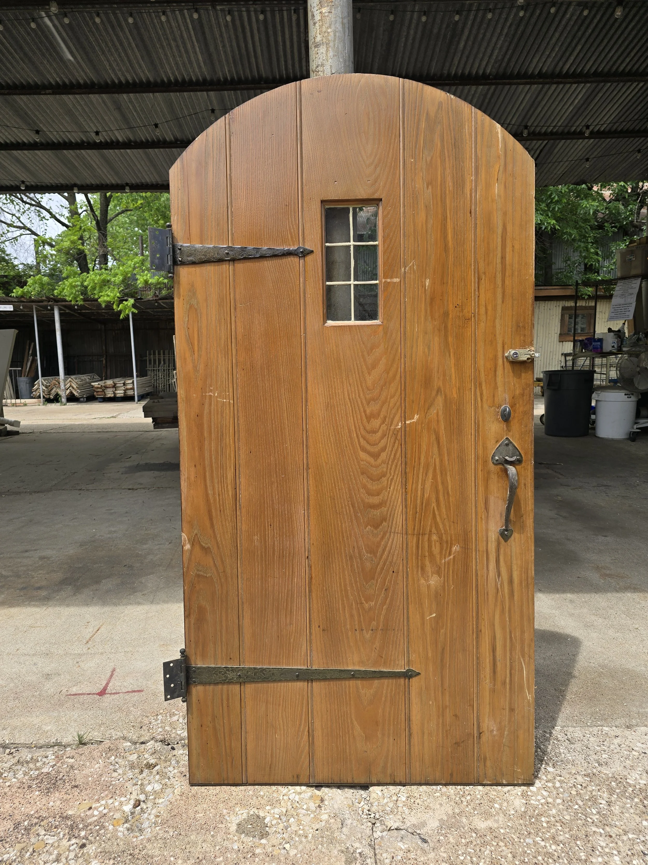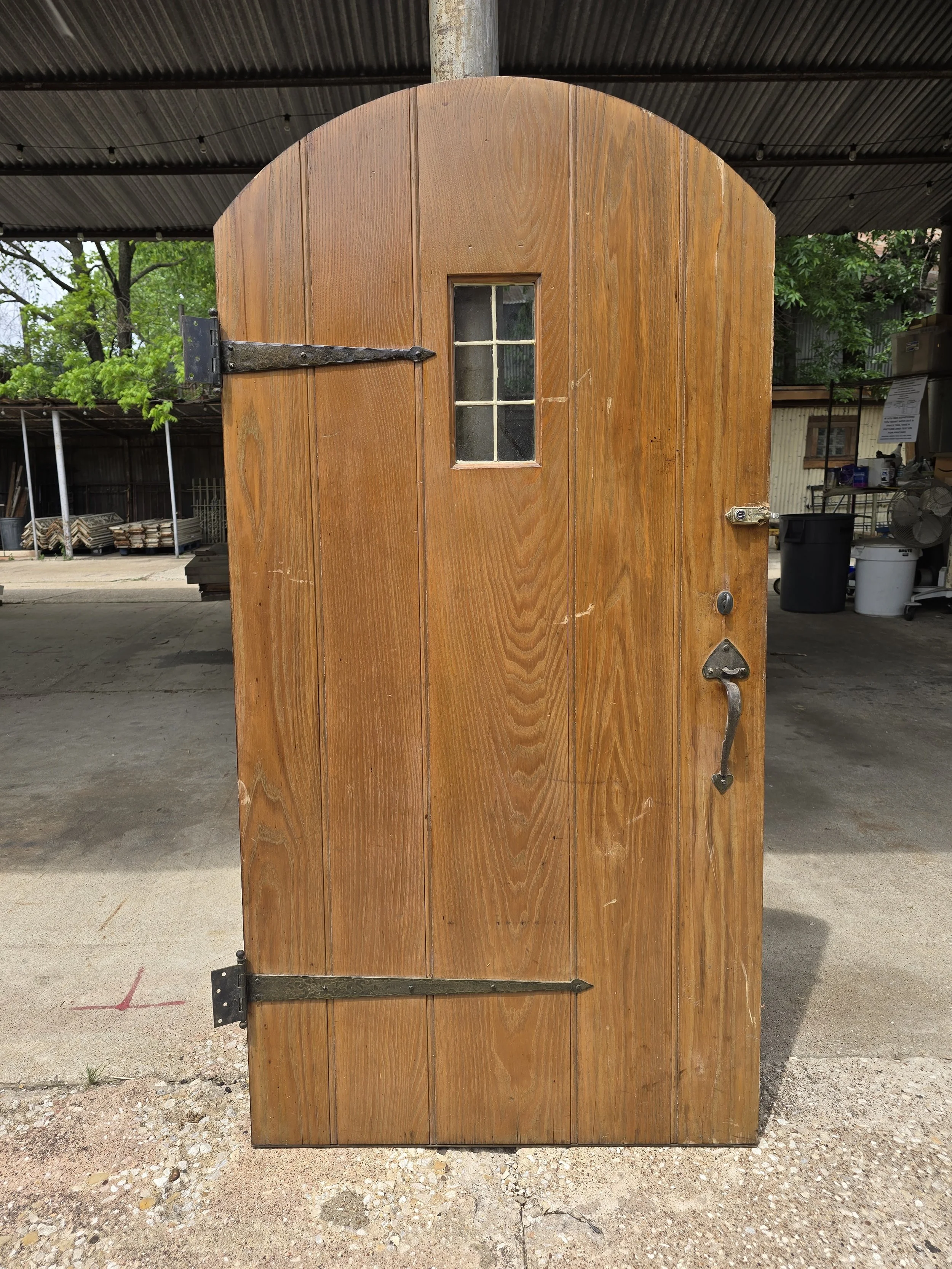 Fabulous raw wood arched door with small leaded window and awesome hardware. I can’t talk up this door enough. The strap hinges are awesome, the exterior door hardware, it is all incredible. However it is short, better for a garden, playset or something.