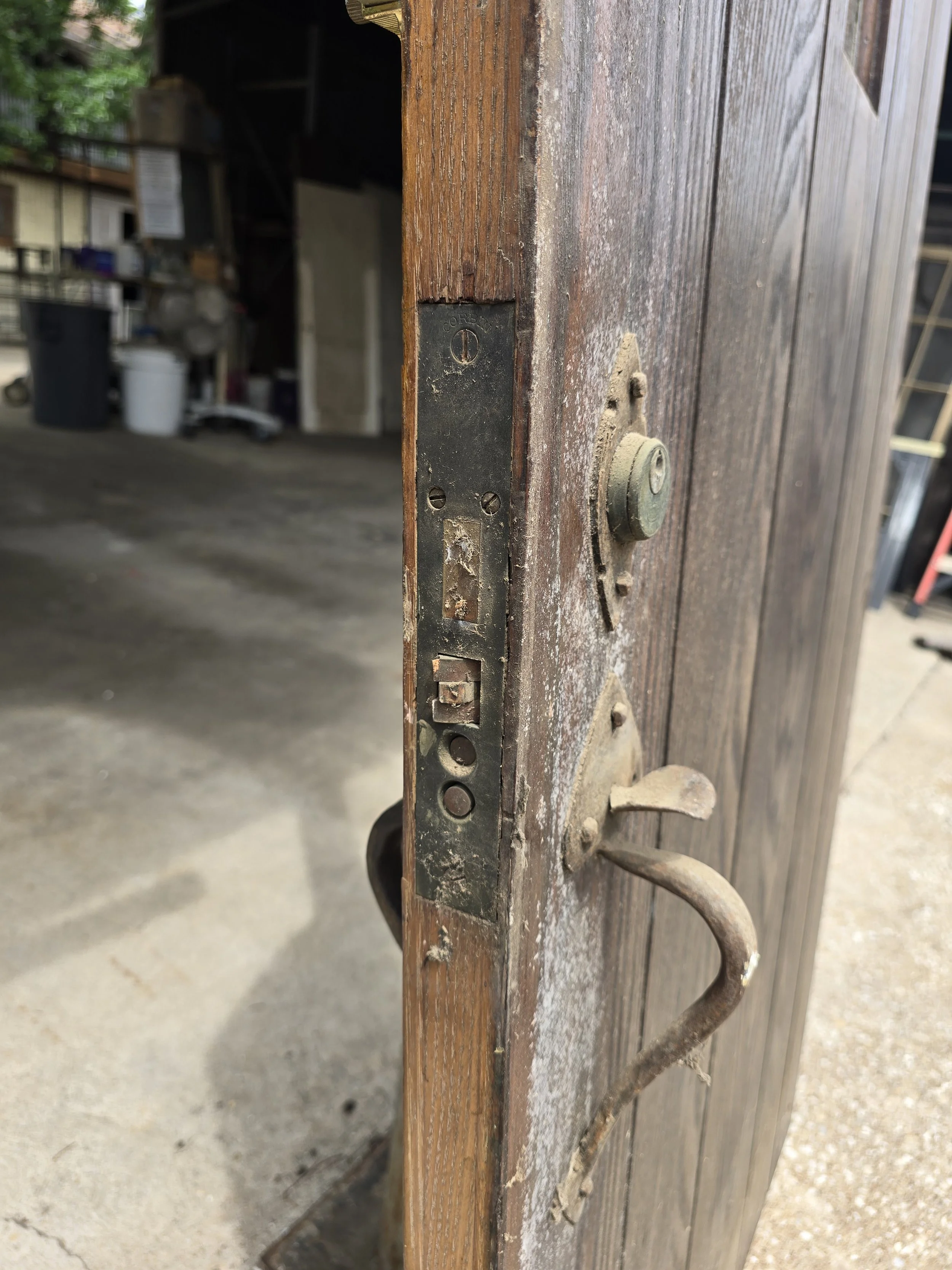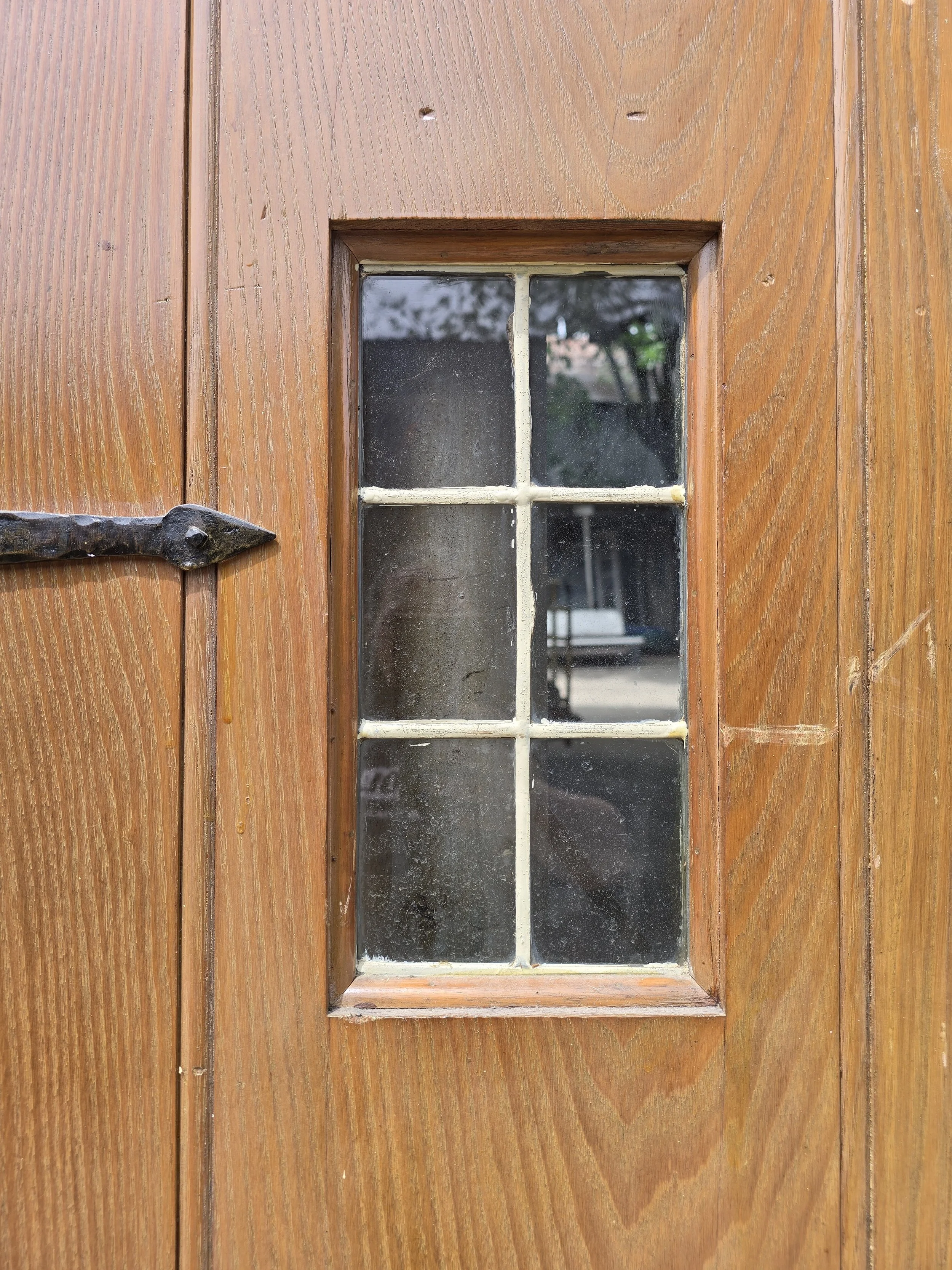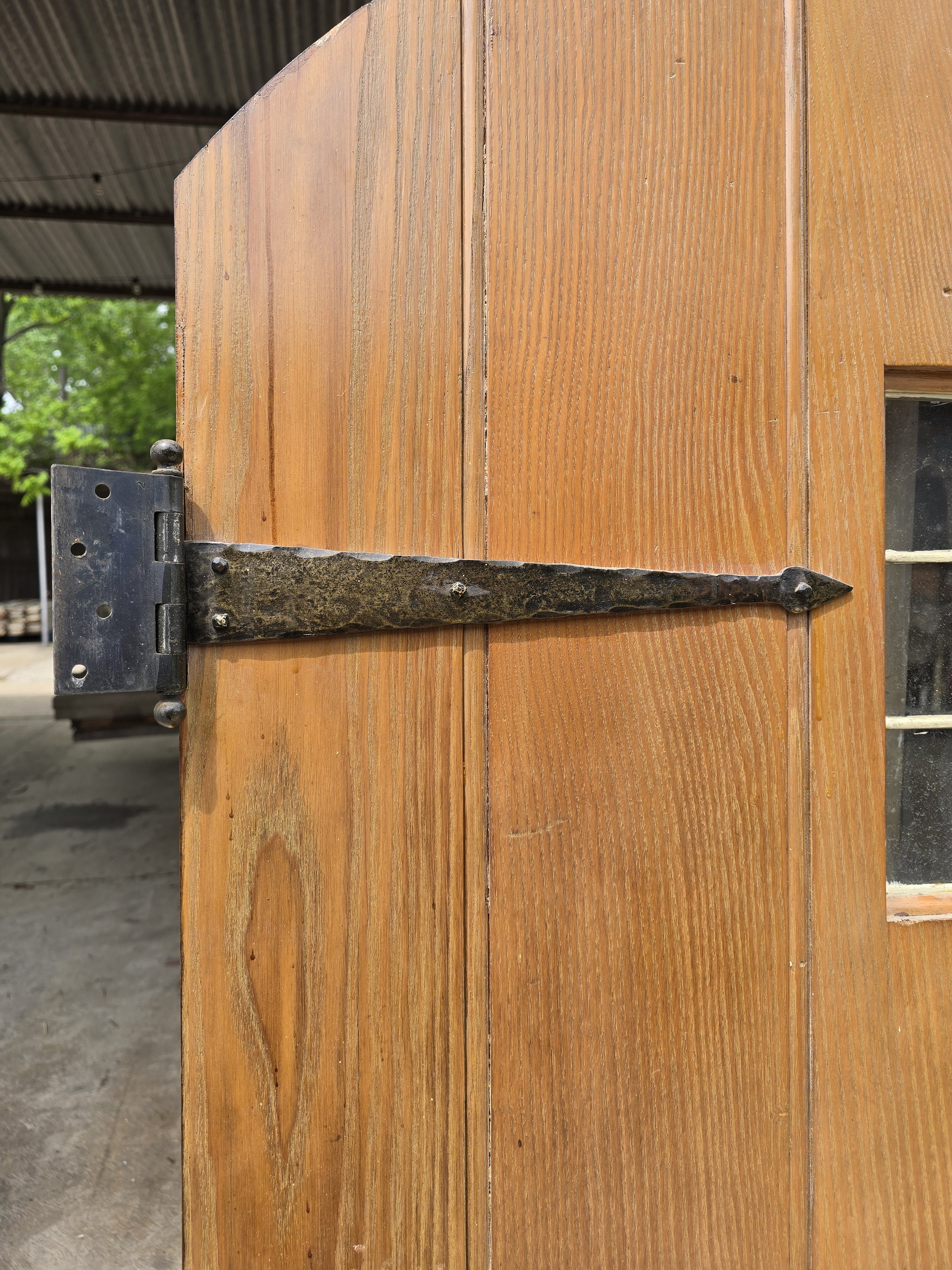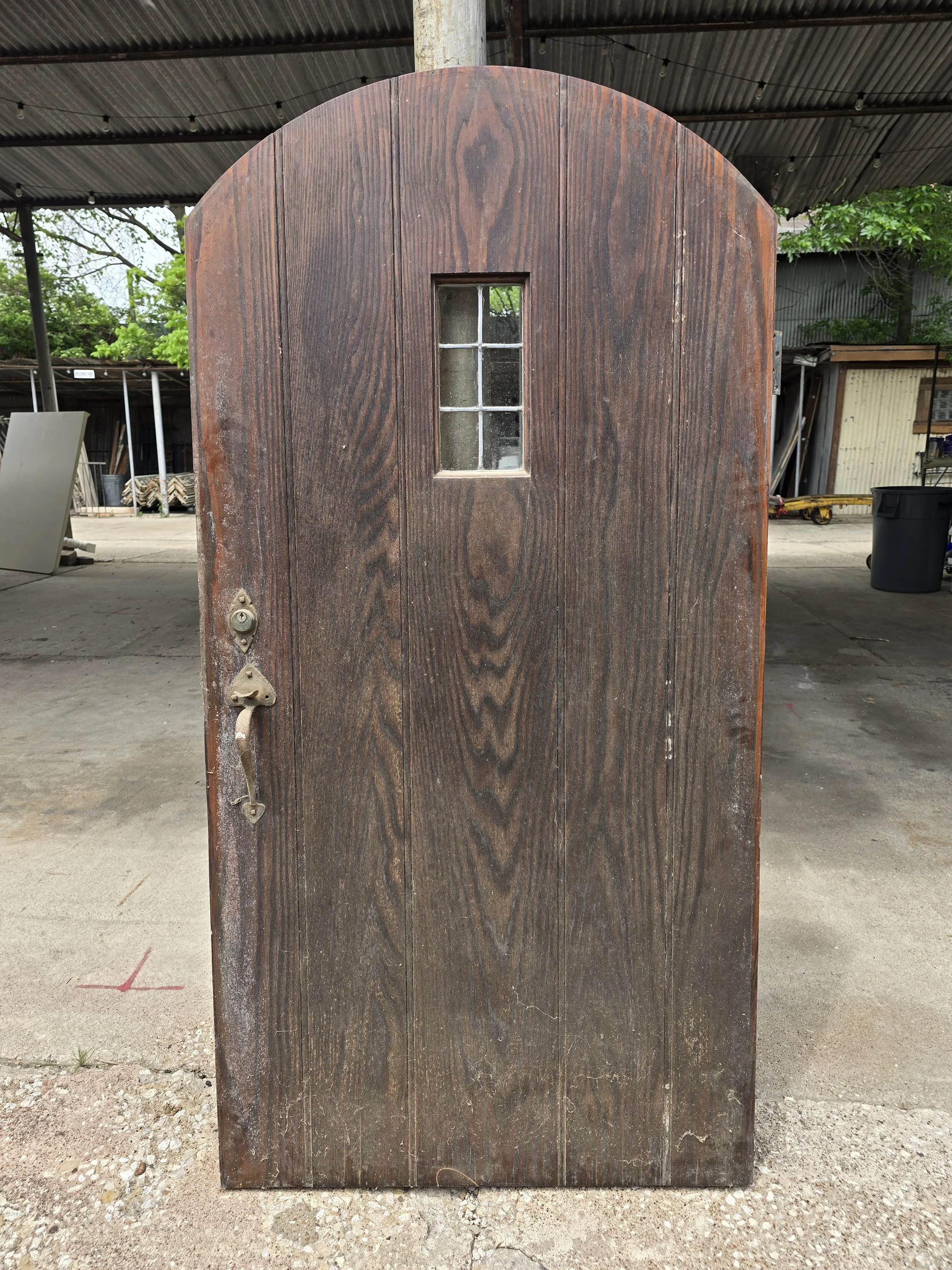 Fabulous raw wood arched door with small leaded window and awesome hardware. I can’t talk up this door enough. The strap hinges are awesome, the exterior door hardware, it is all incredible. However it is short, better for a garden, playset or something.