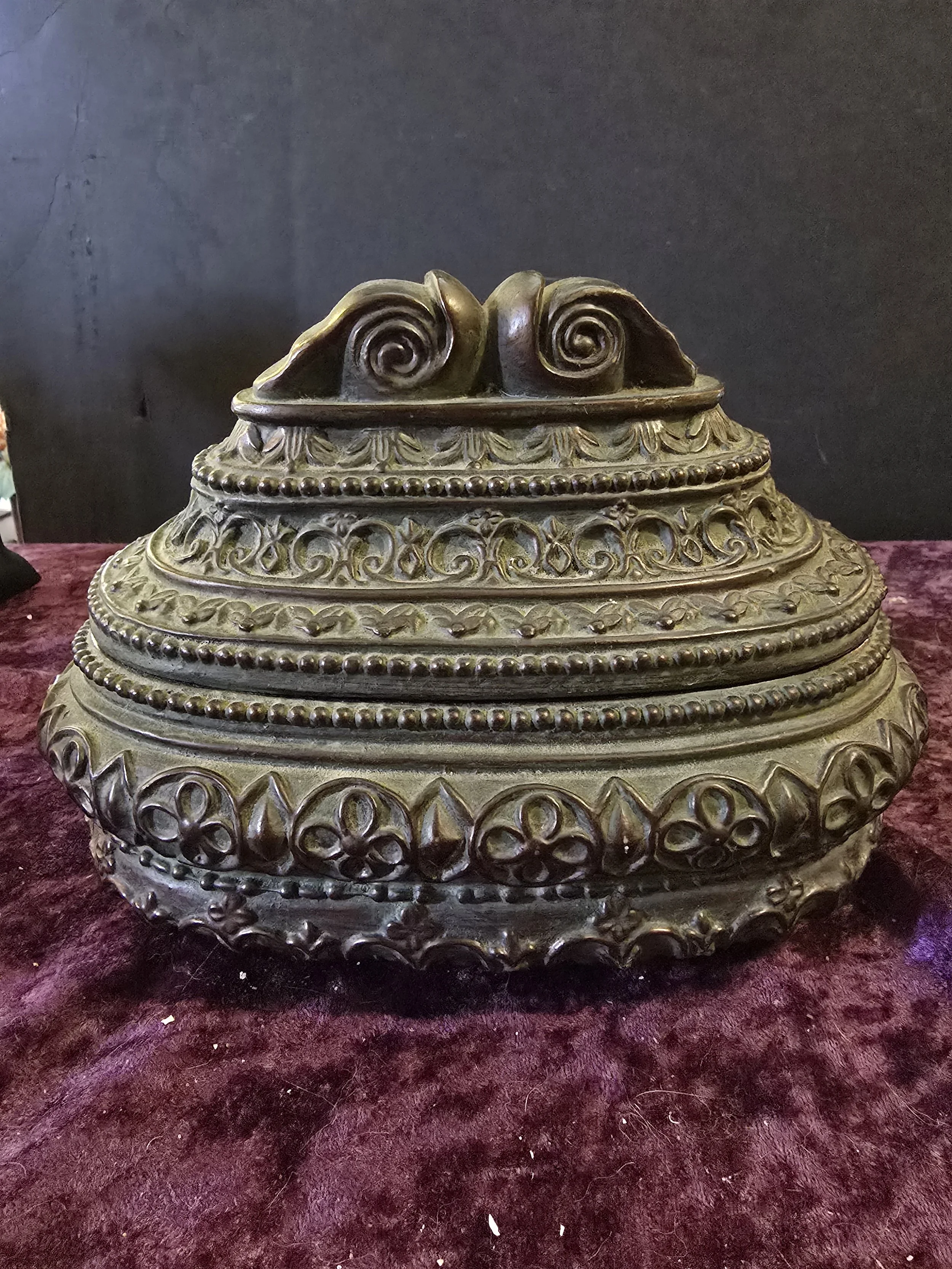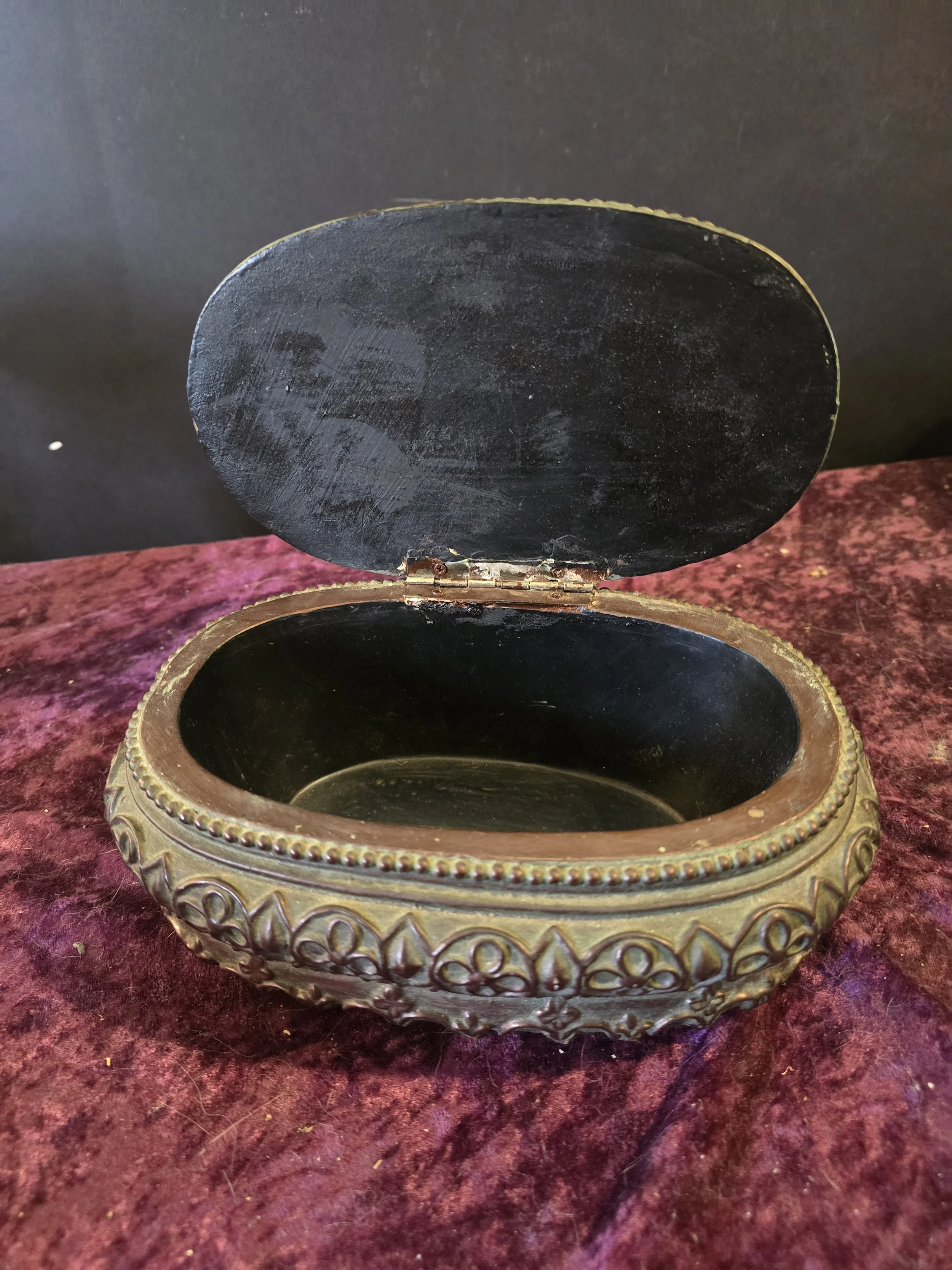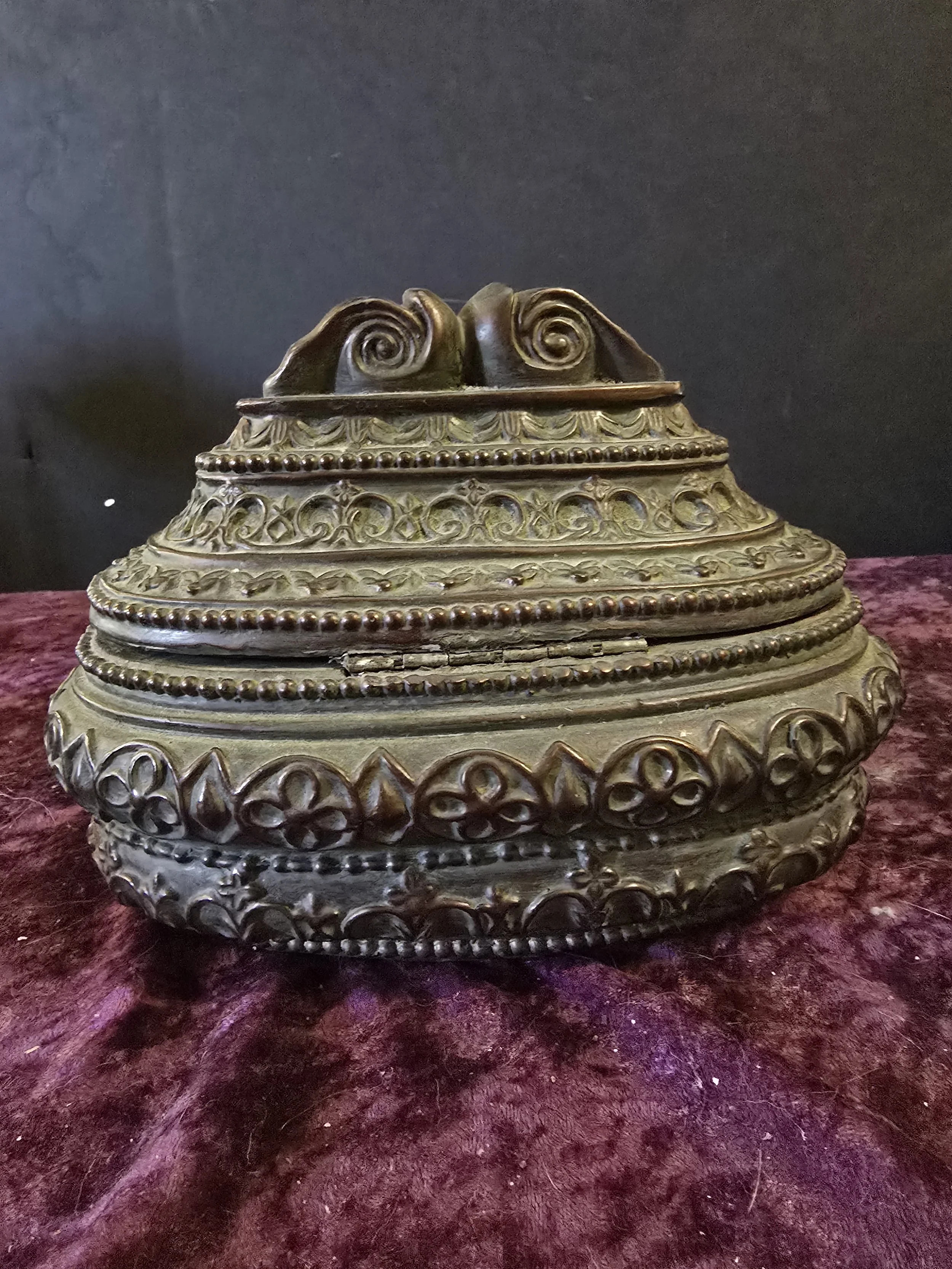 Ornamental oval shaped box. I feel like its mean to look old, but I am not convinced it is.