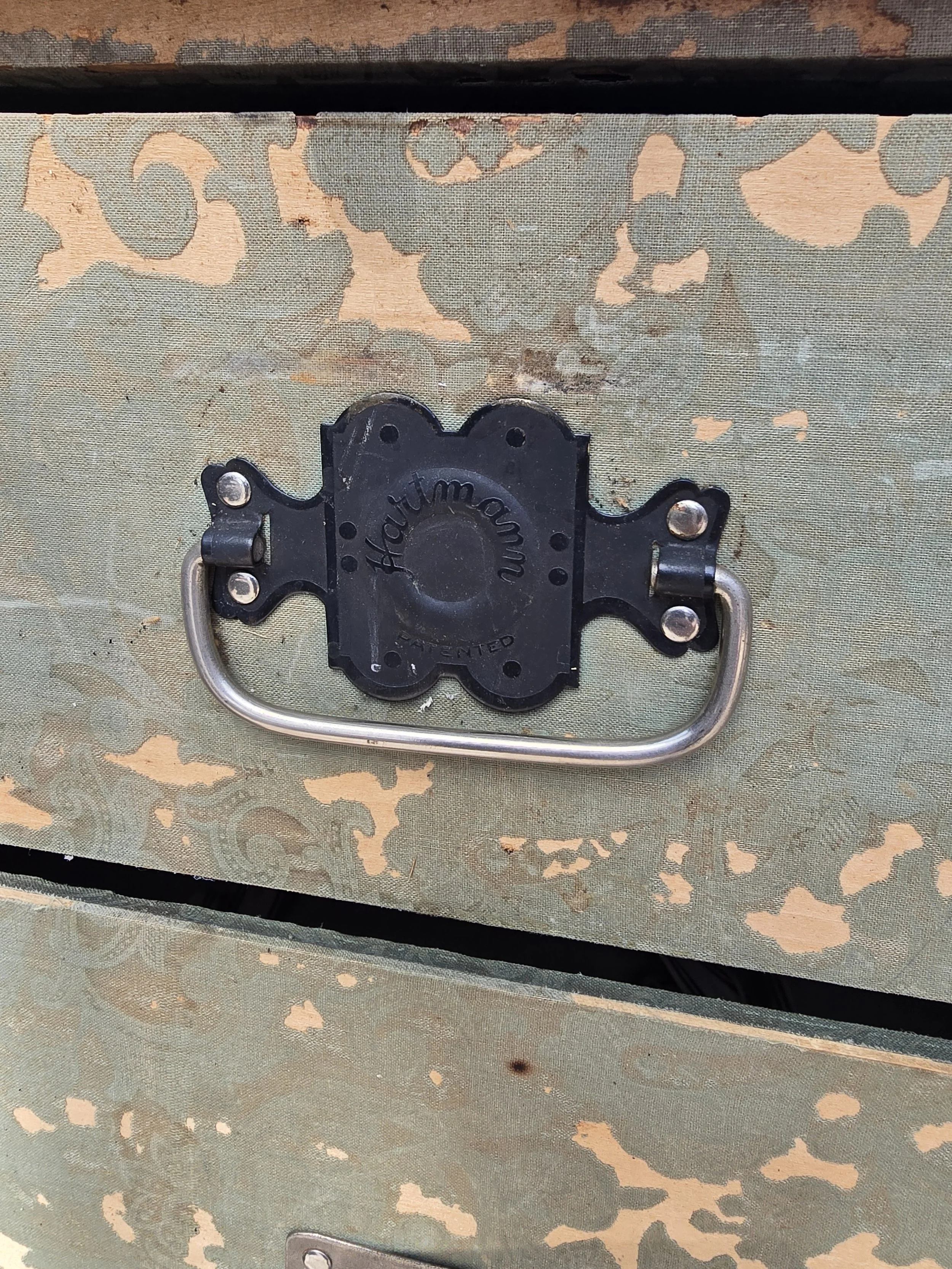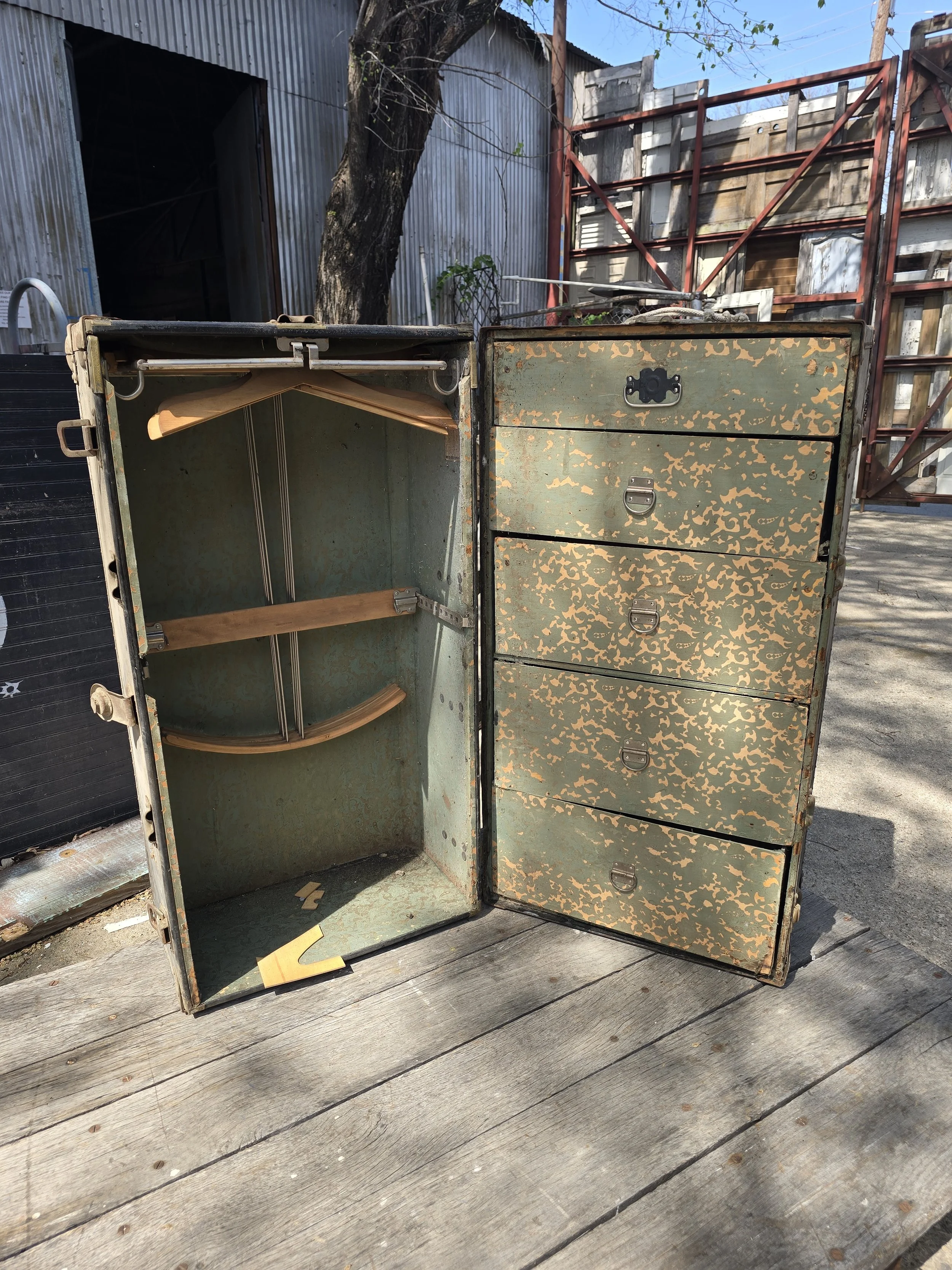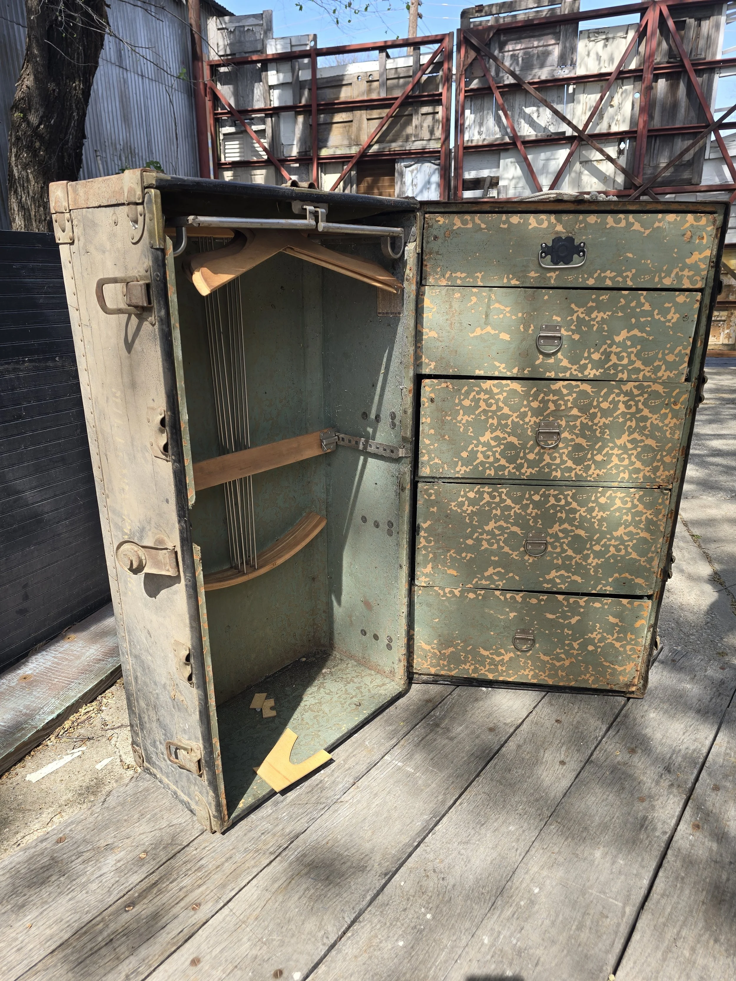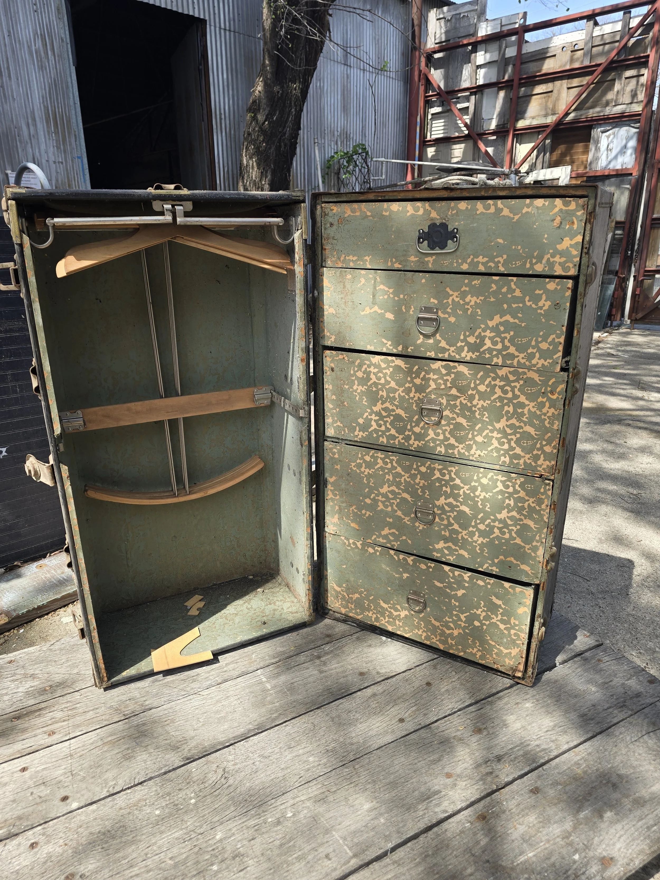 Steamer wardrobe trunk with all its drawers and hangers. I believe it is a Hartmann. What a cool piece!