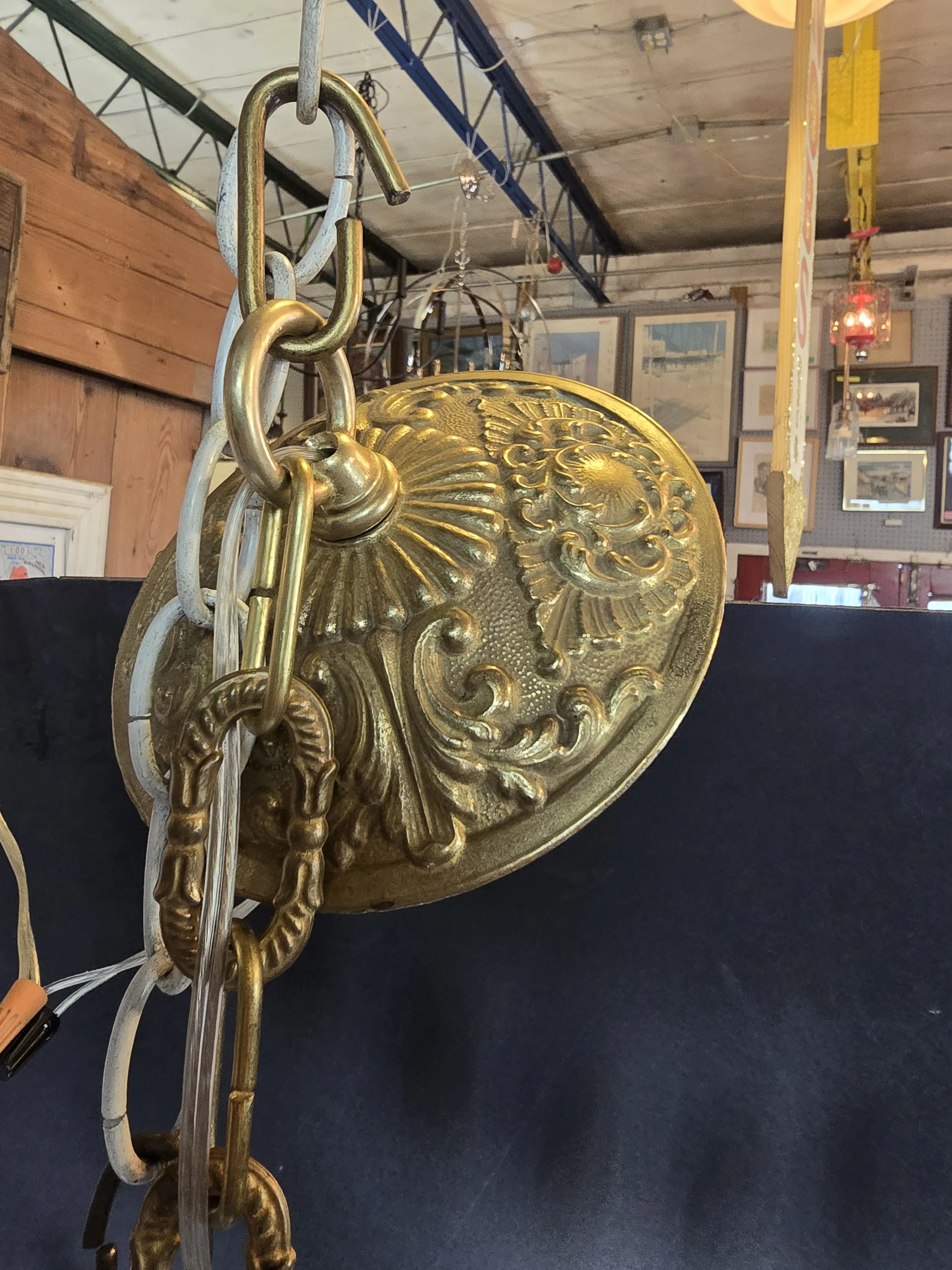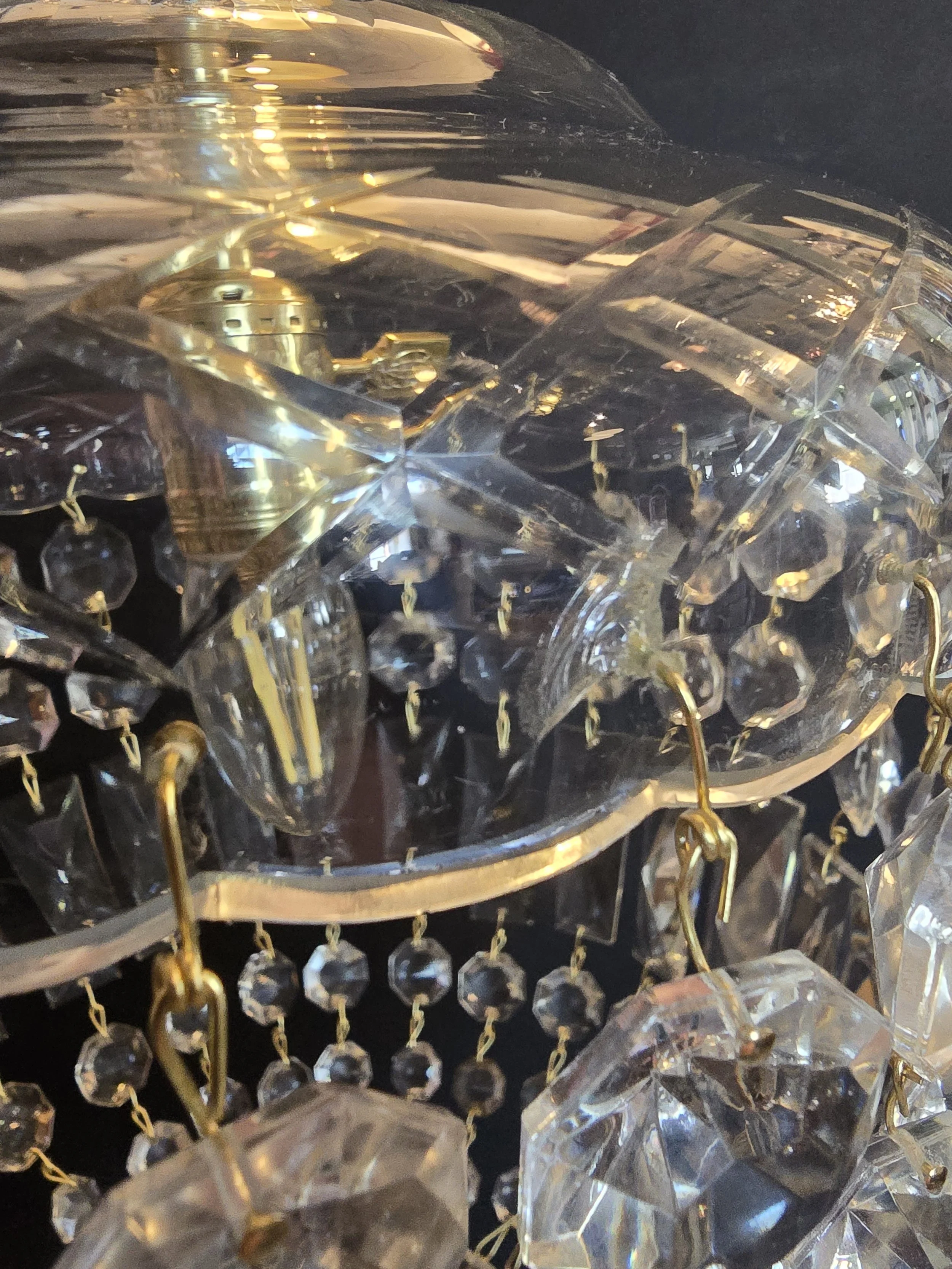 1920's-30's crystal chandelier. This fully restored fixture has new socket and wire. There is one, nearly invisible chip in the glass. This chandelier has a gorgeous brass canopy and detailed brass chain.