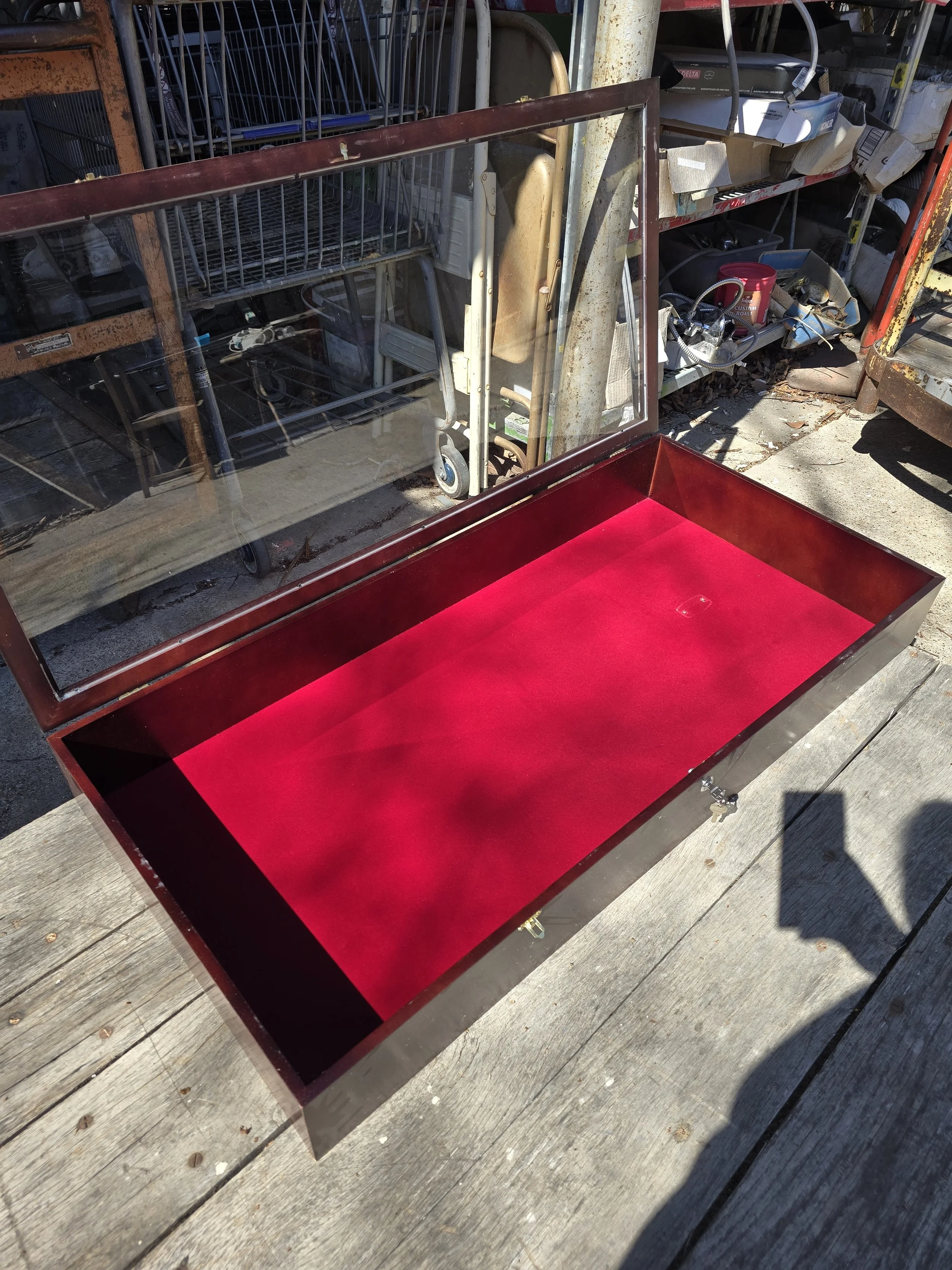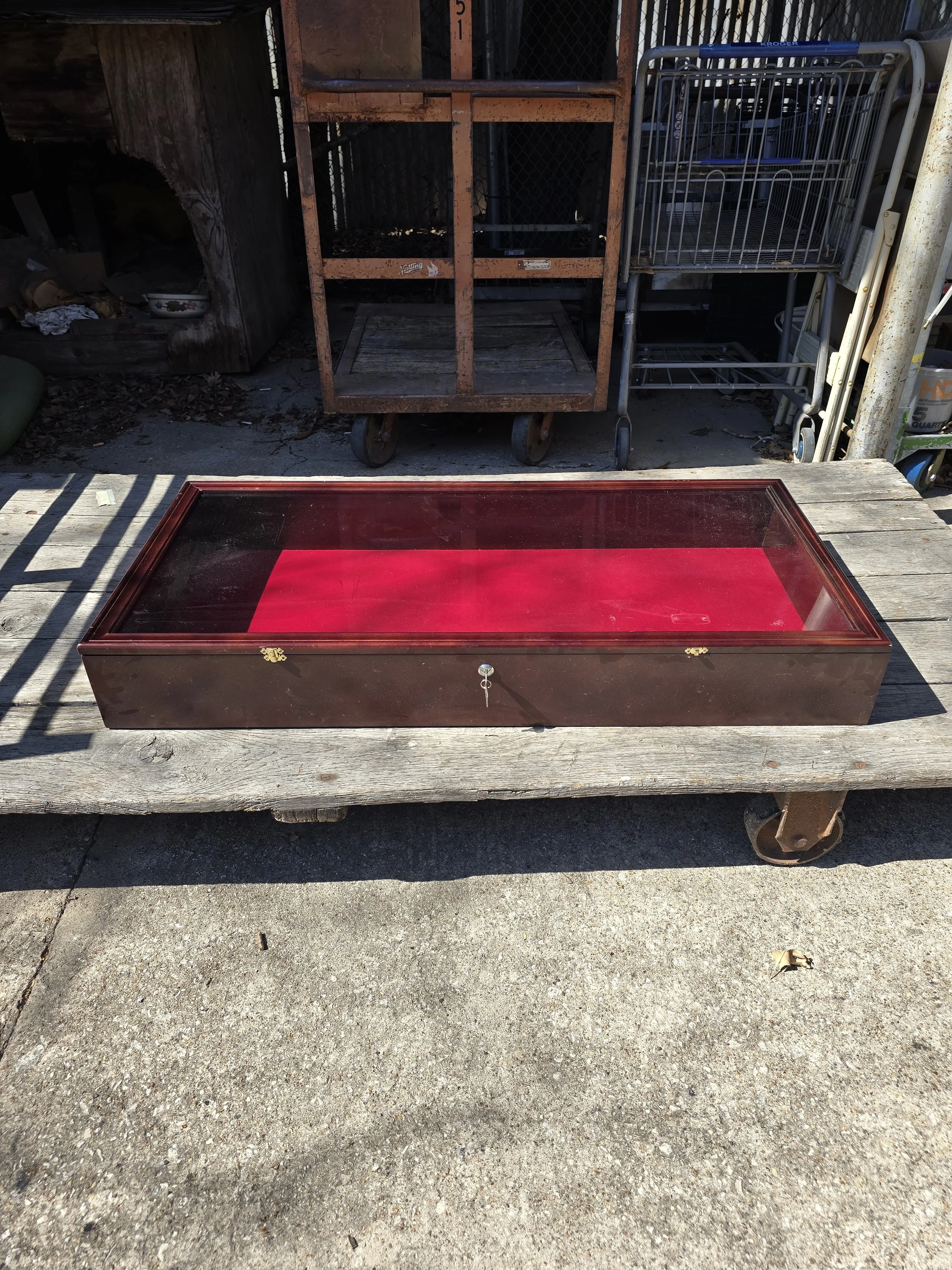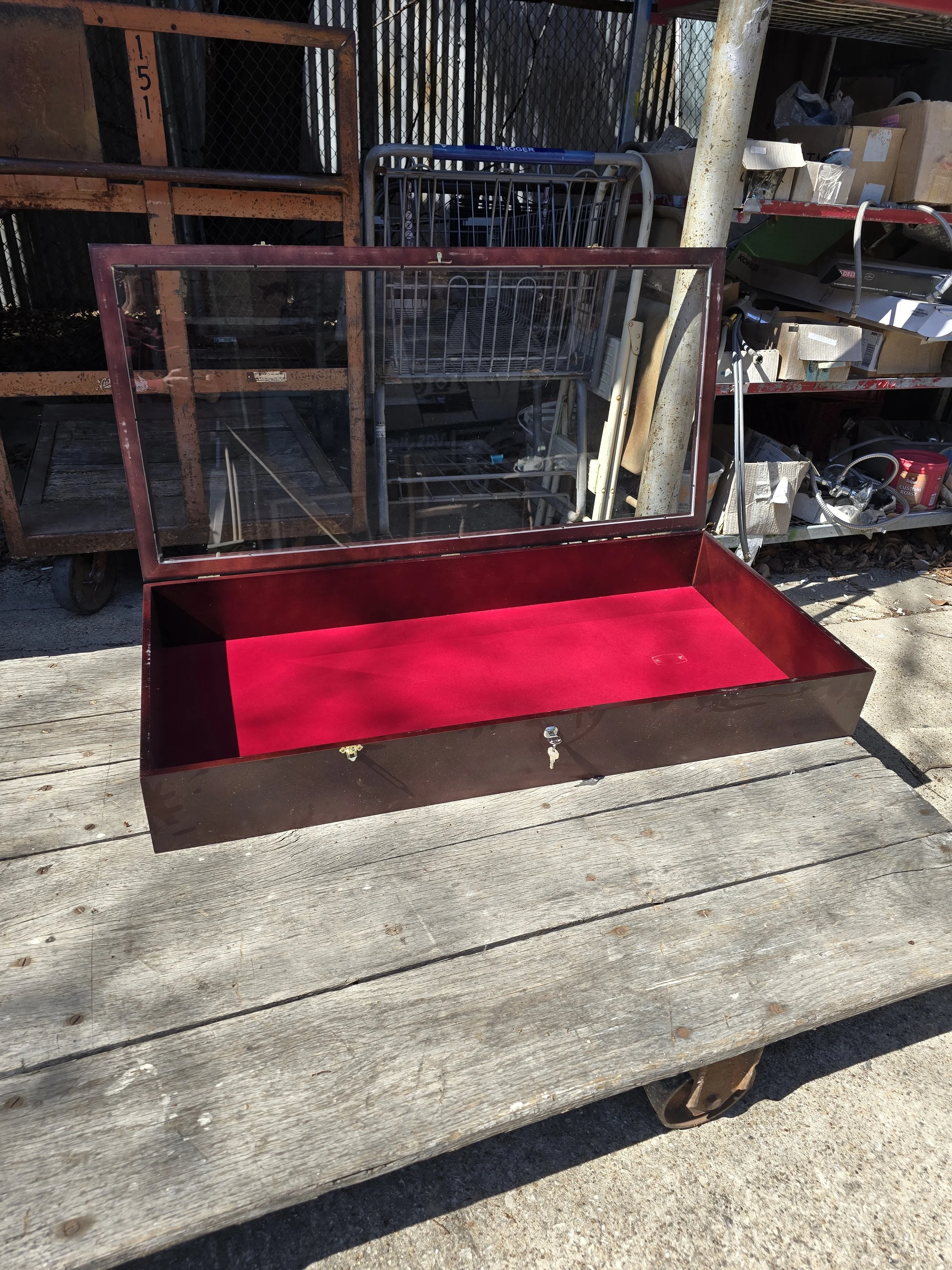 Locking display case with red velvet lining. Key included. Top feels like plexi.