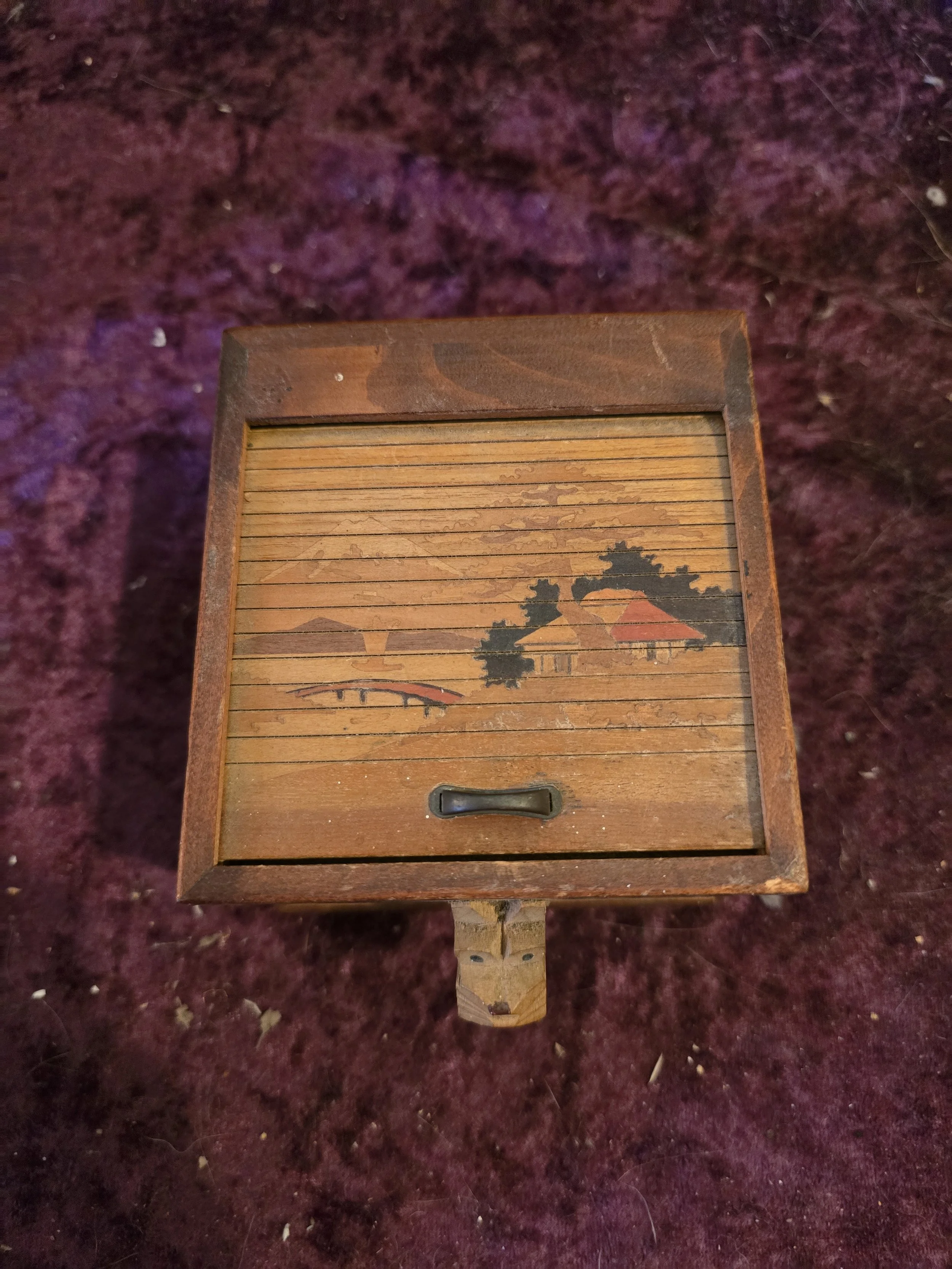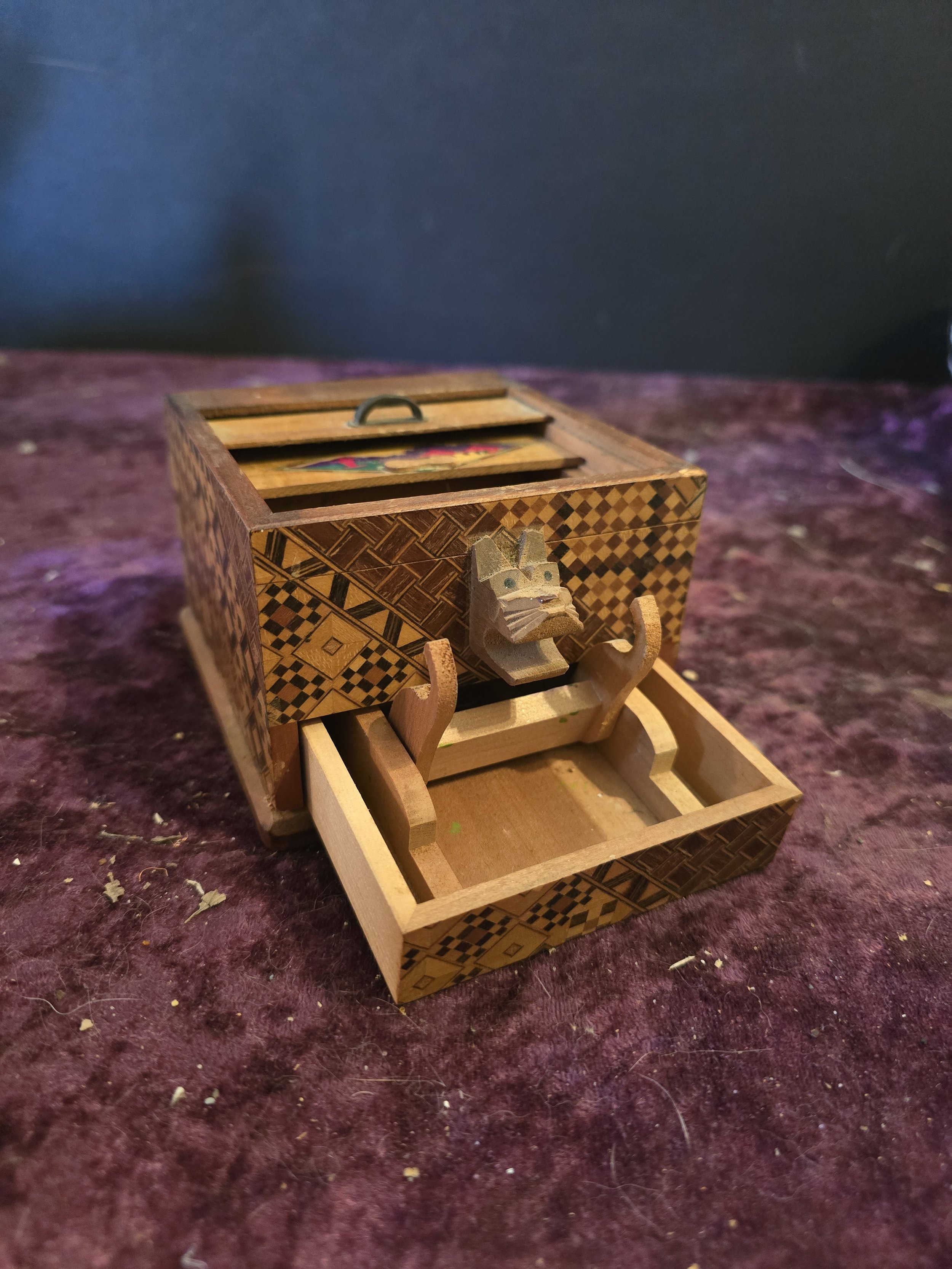 This piece is insanely cool. The box holds your cigarettes and when you roll the top back it places a cigarette in the mouth of the animal. Be aware it does stick a little.