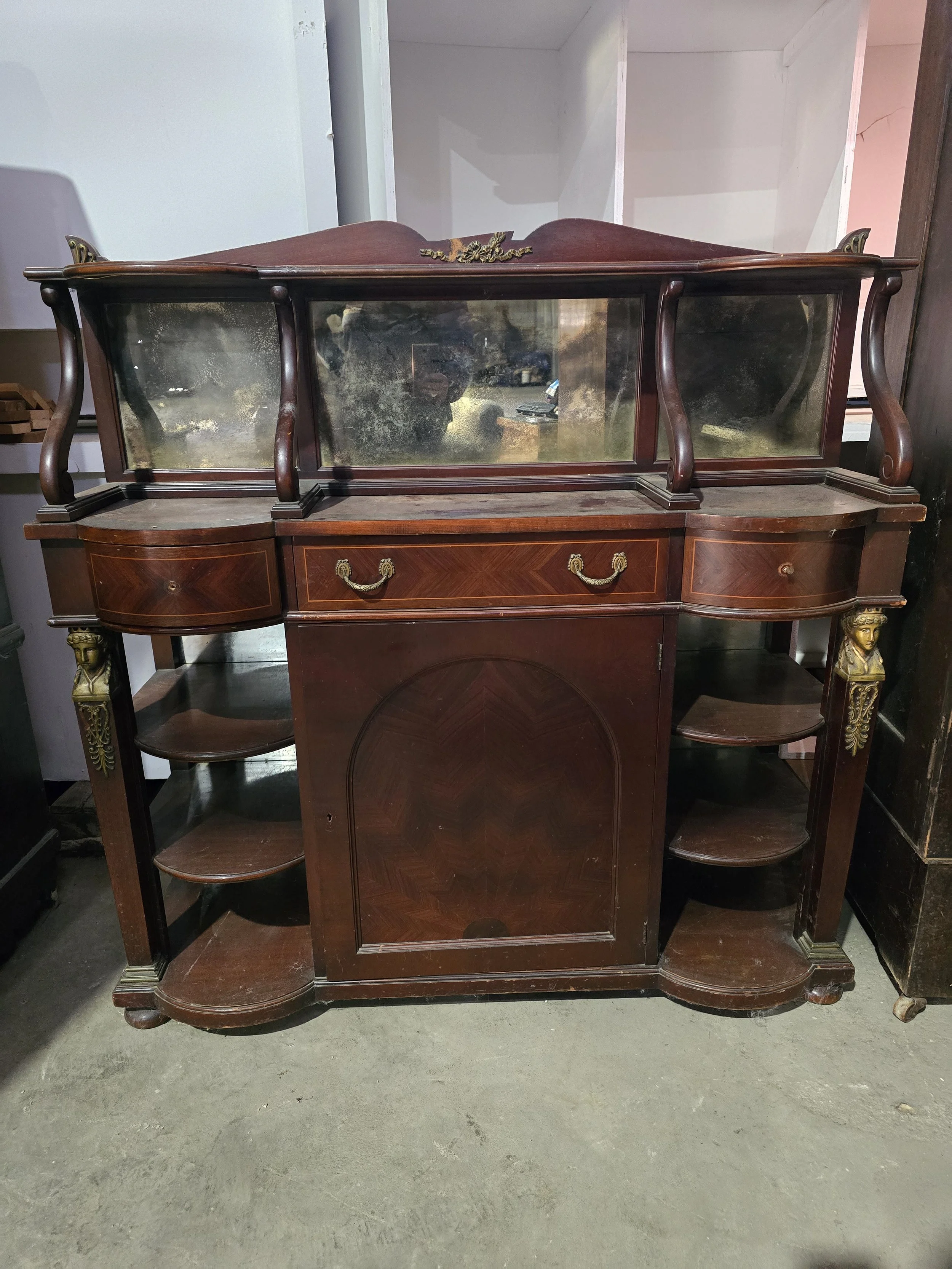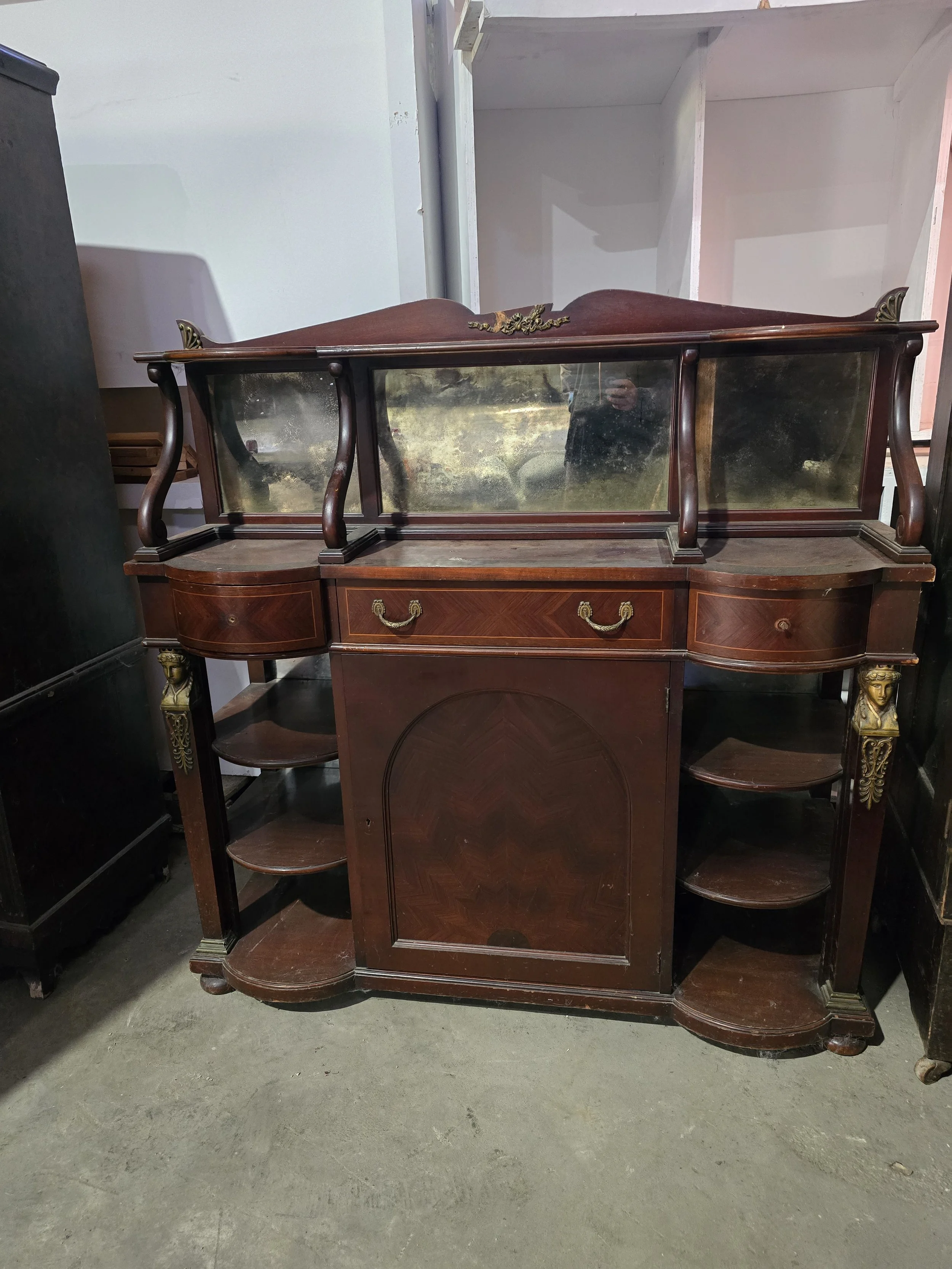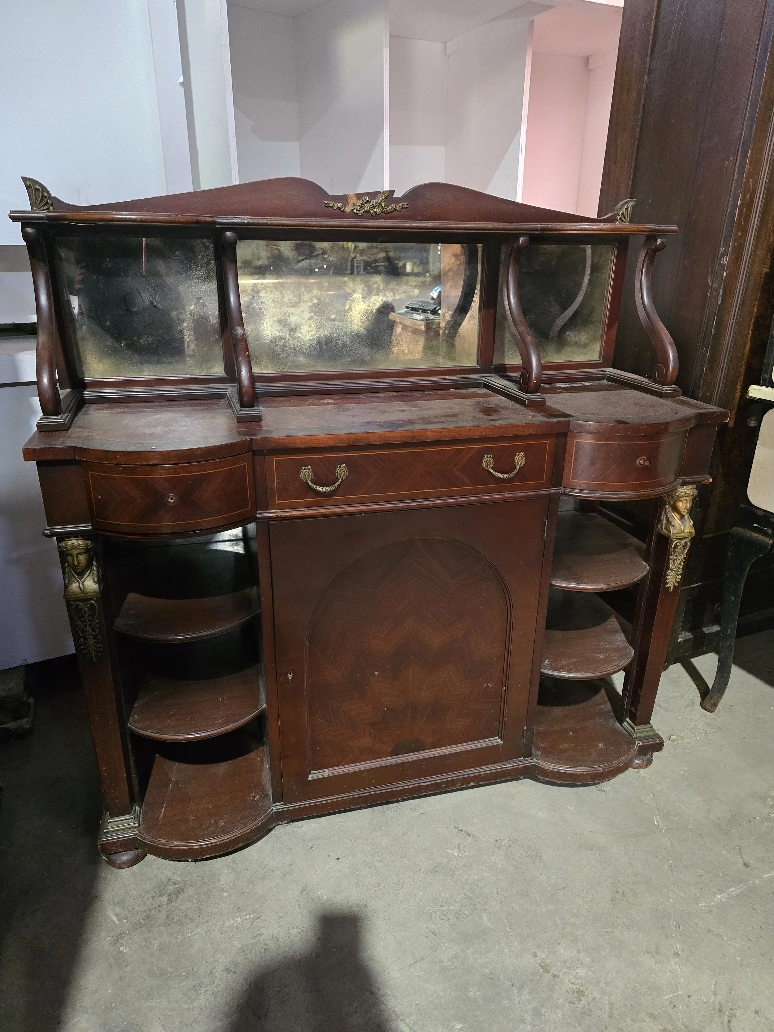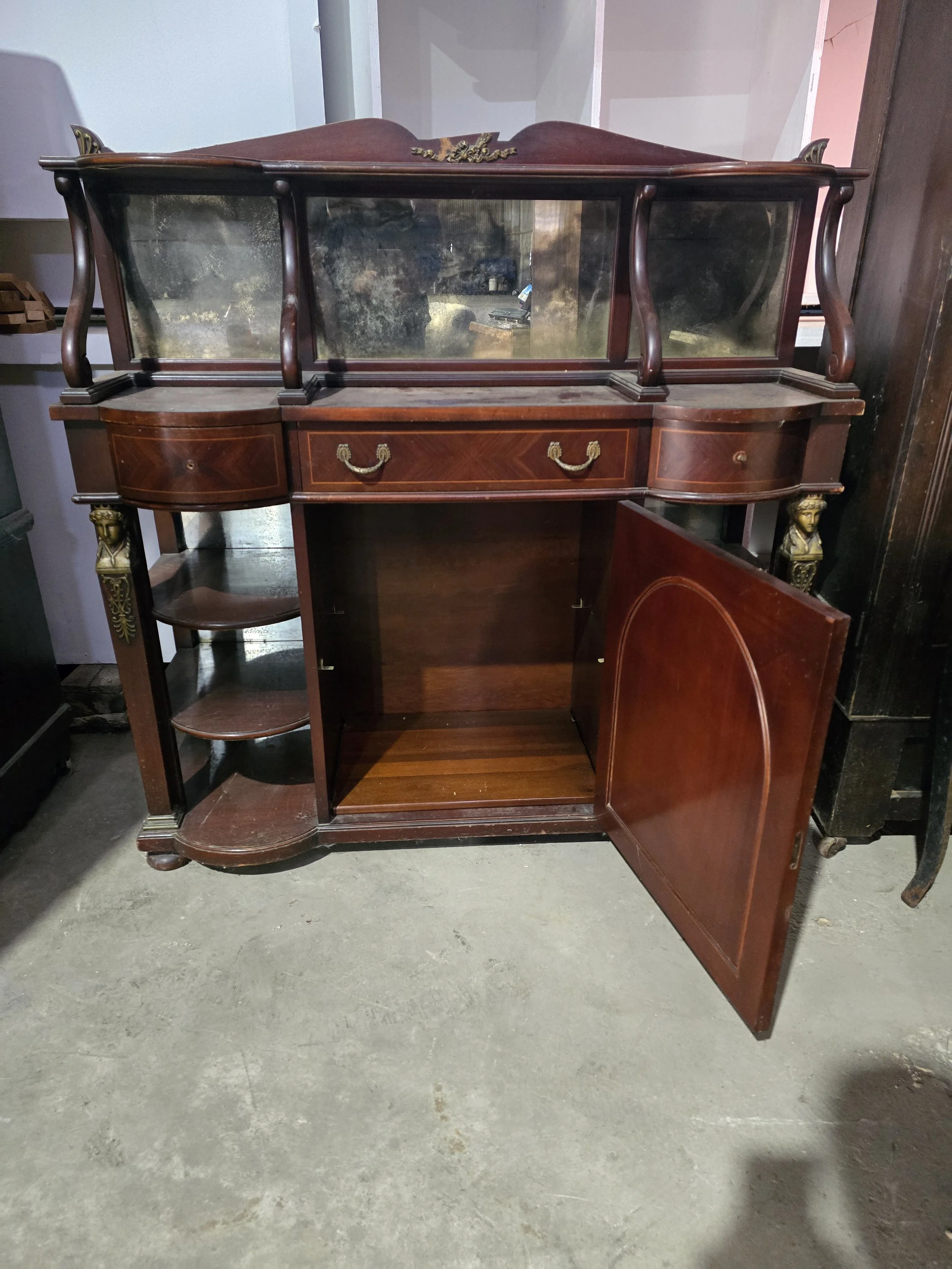 Antique Sideboard with tons of detail. The way the mirror has antiqued is incredible. There is definitely a broken piece at the top where the curve goes down. The “face” accents are metal. All in all, it is a stunning piece.