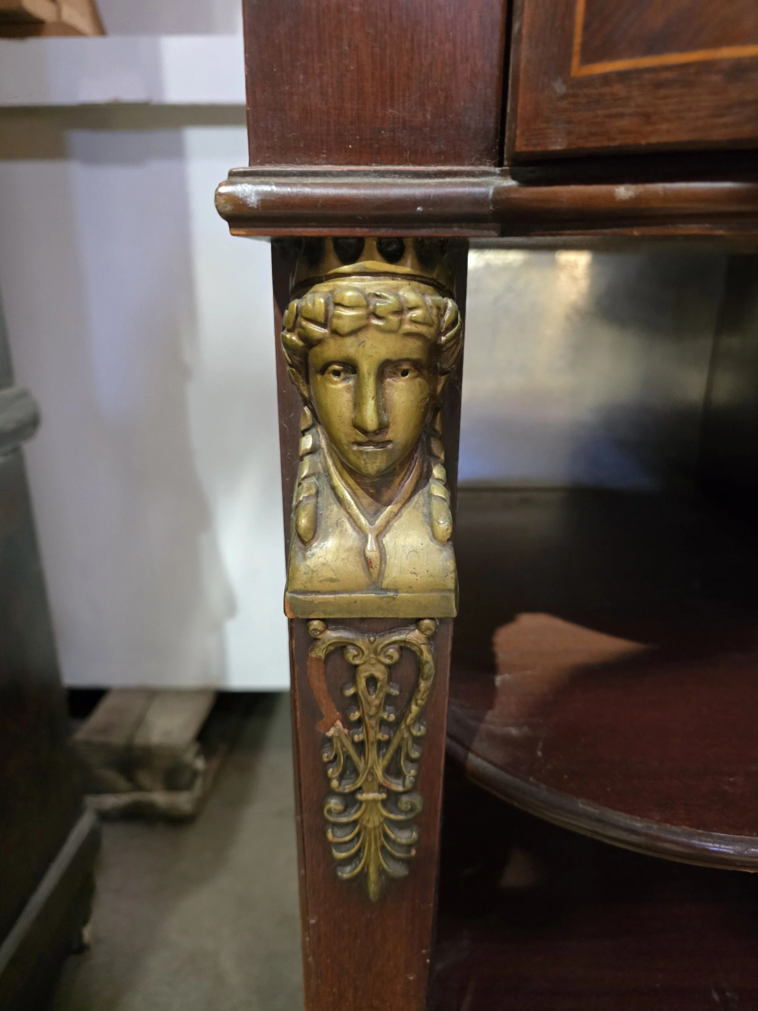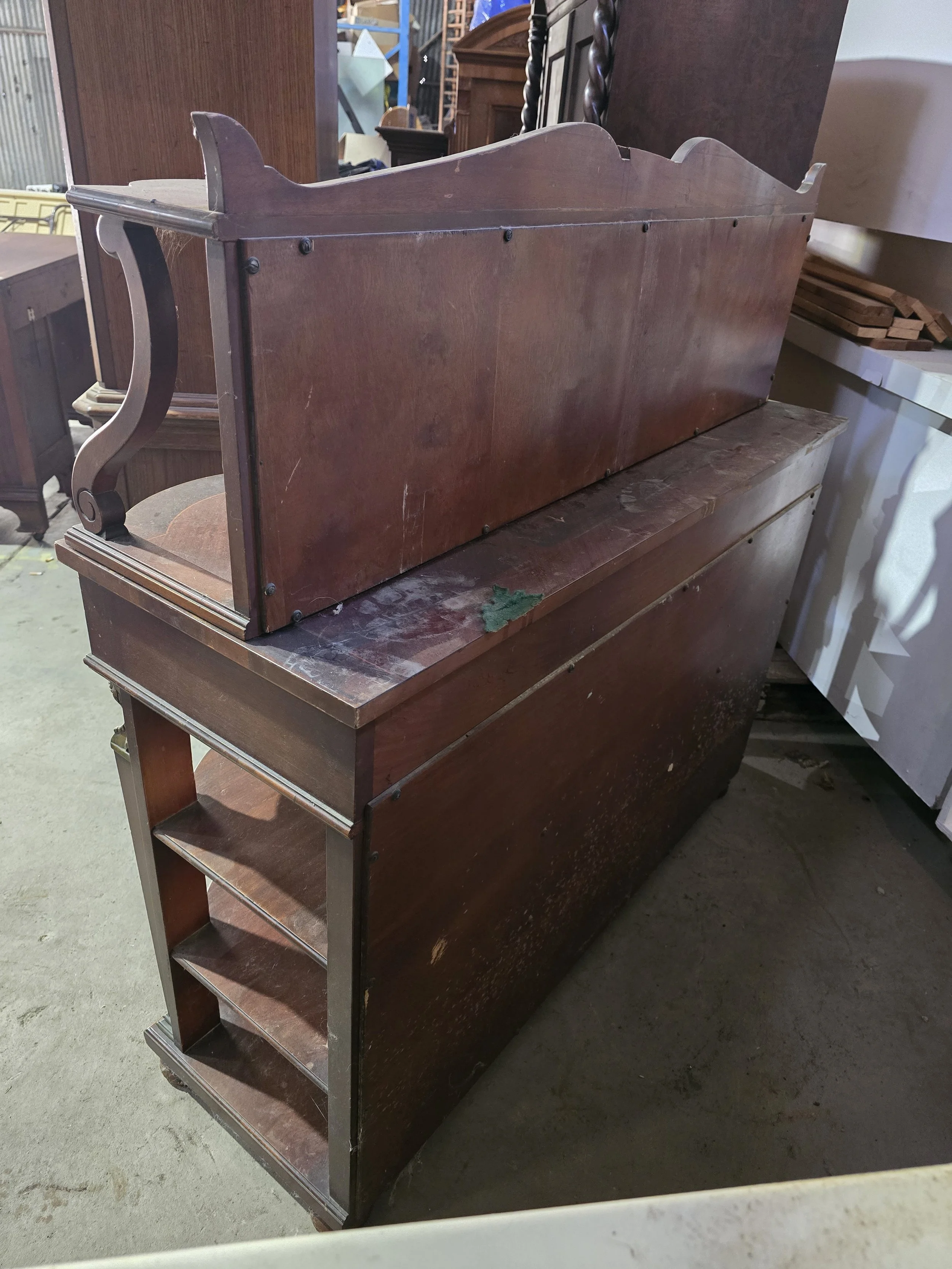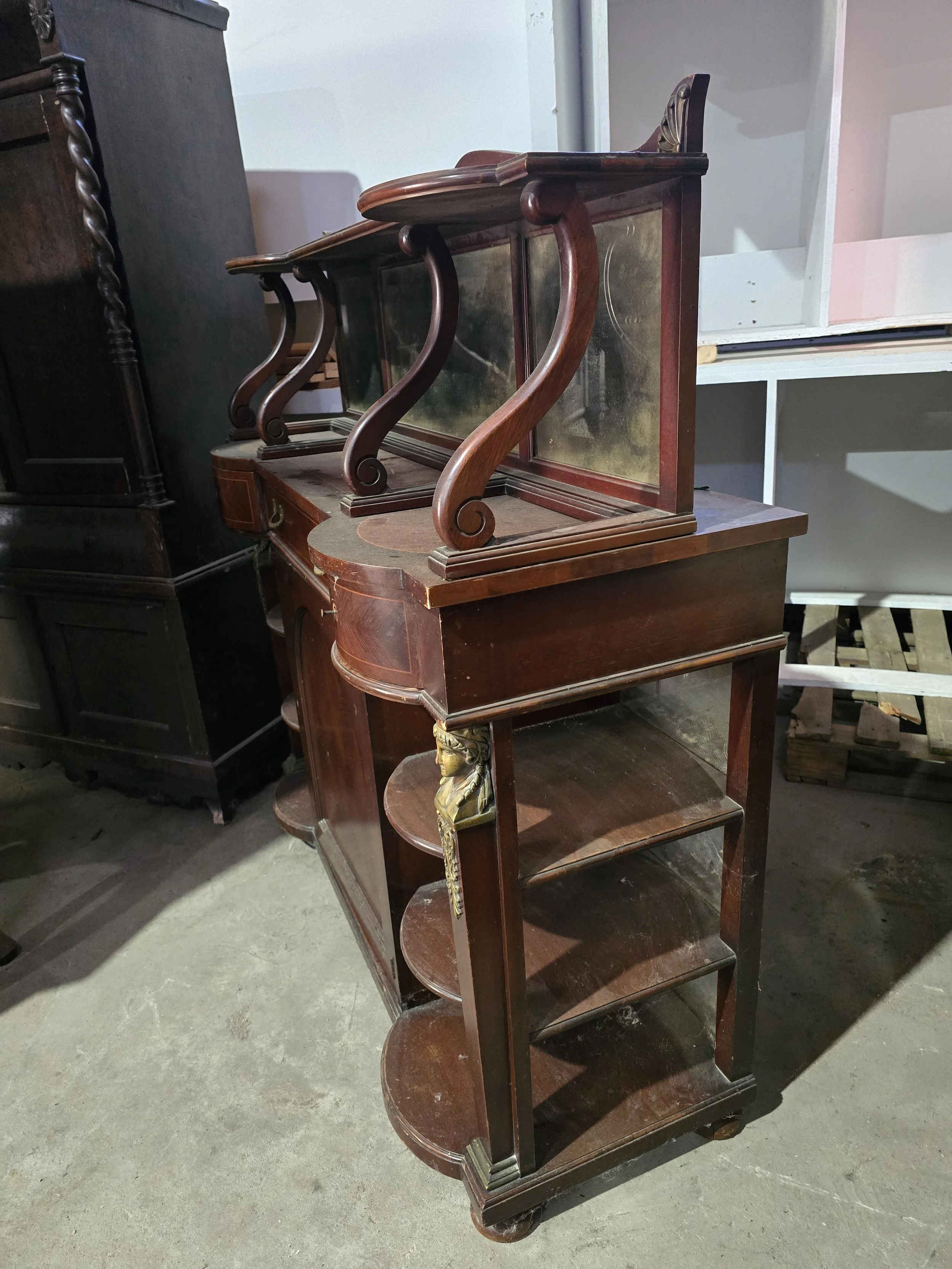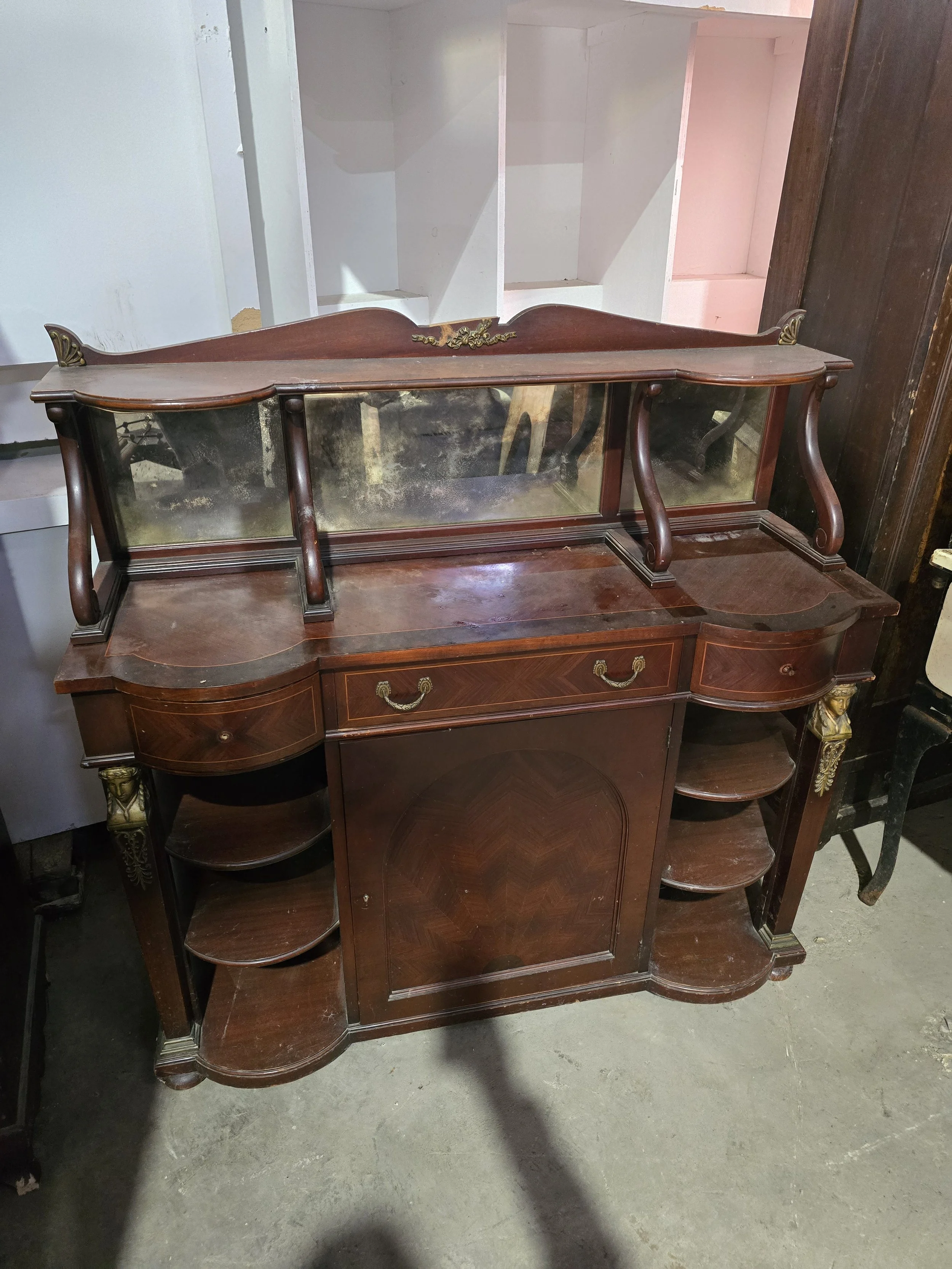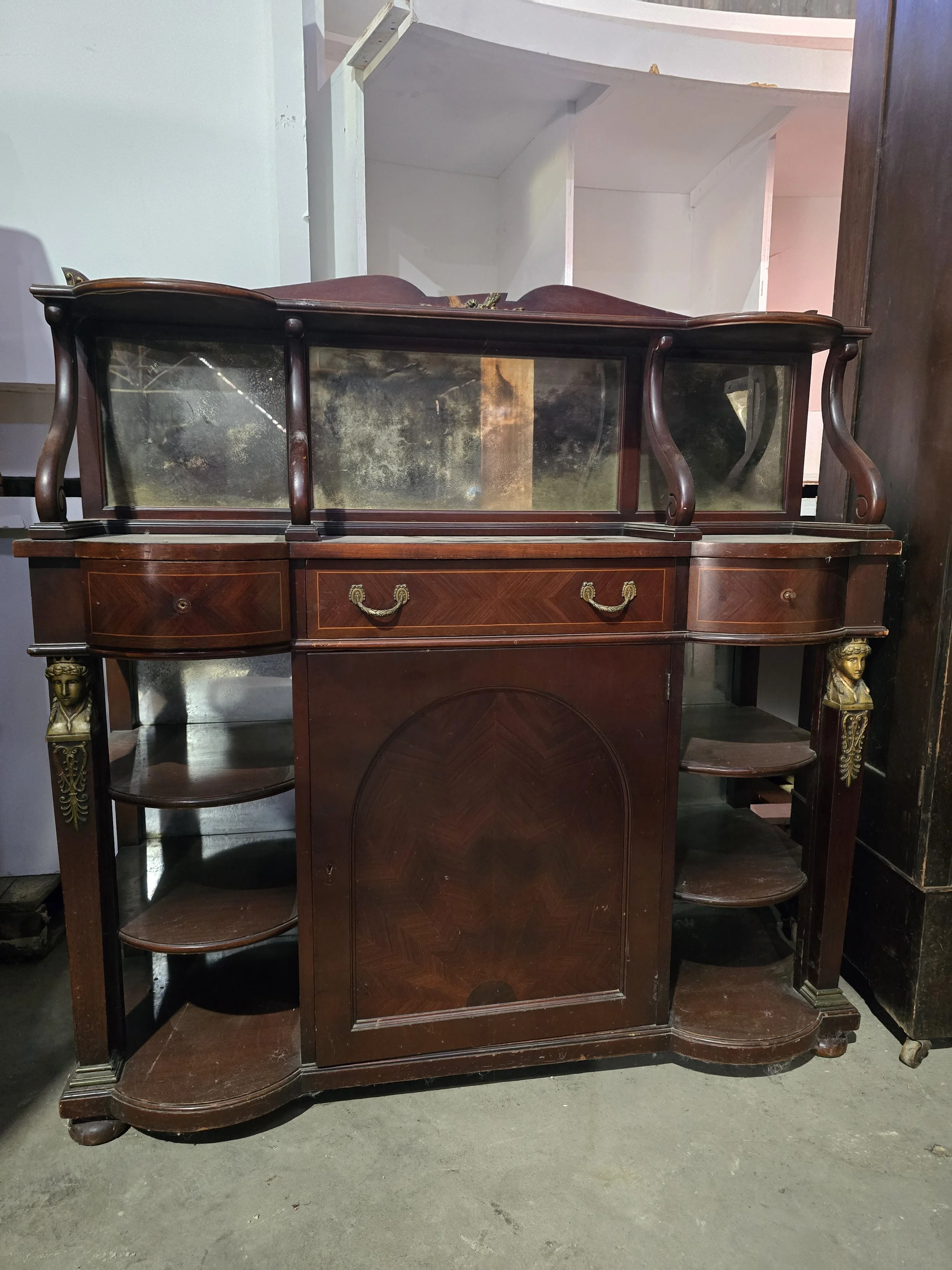 Antique Sideboard with tons of detail. The way the mirror has antiqued is incredible. There is definitely a broken piece at the top where the curve goes down. The “face” accents are metal. All in all, it is a stunning piece.
