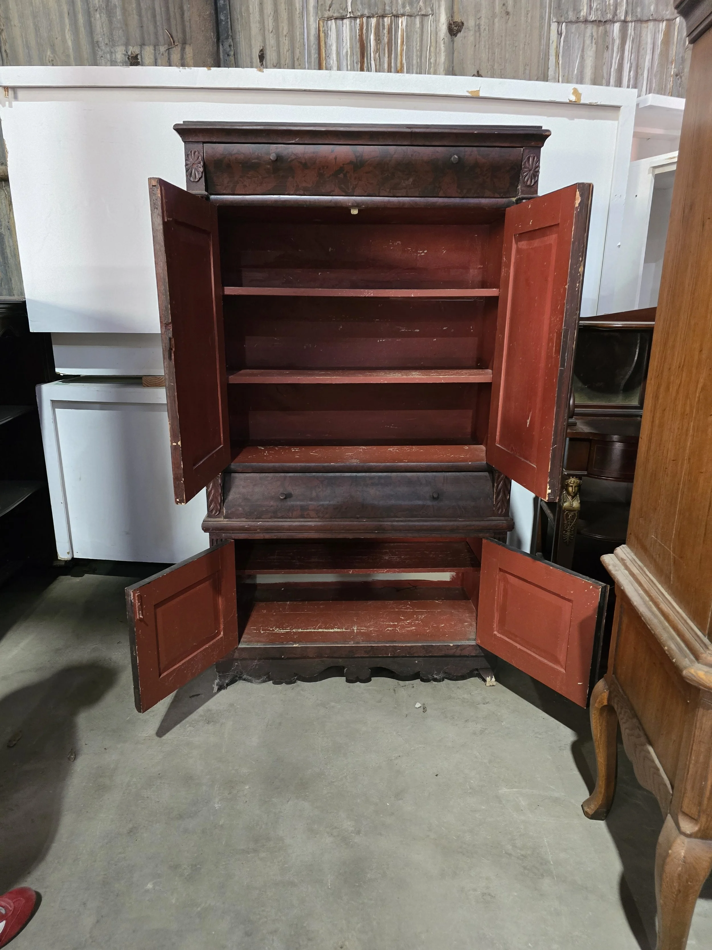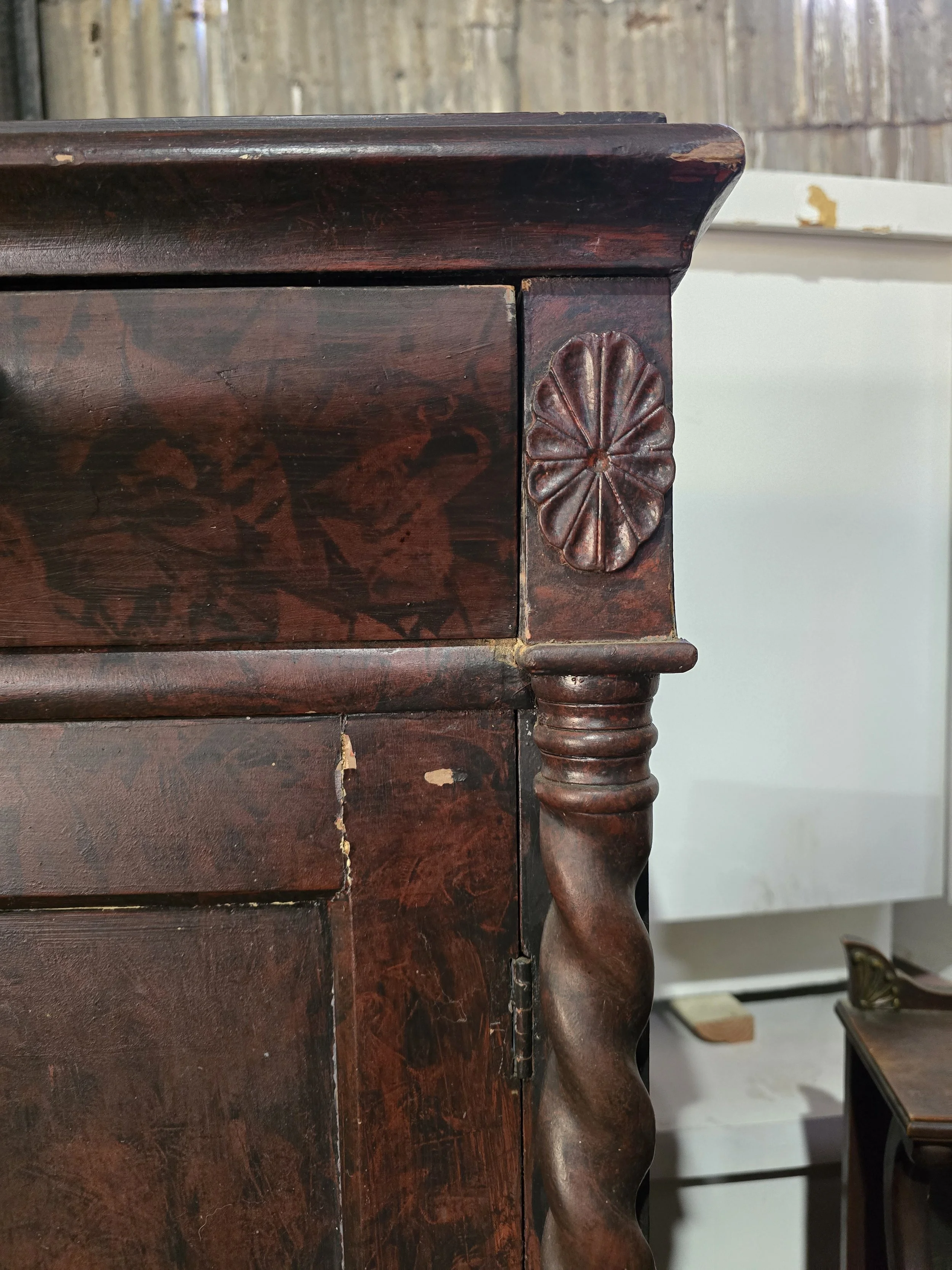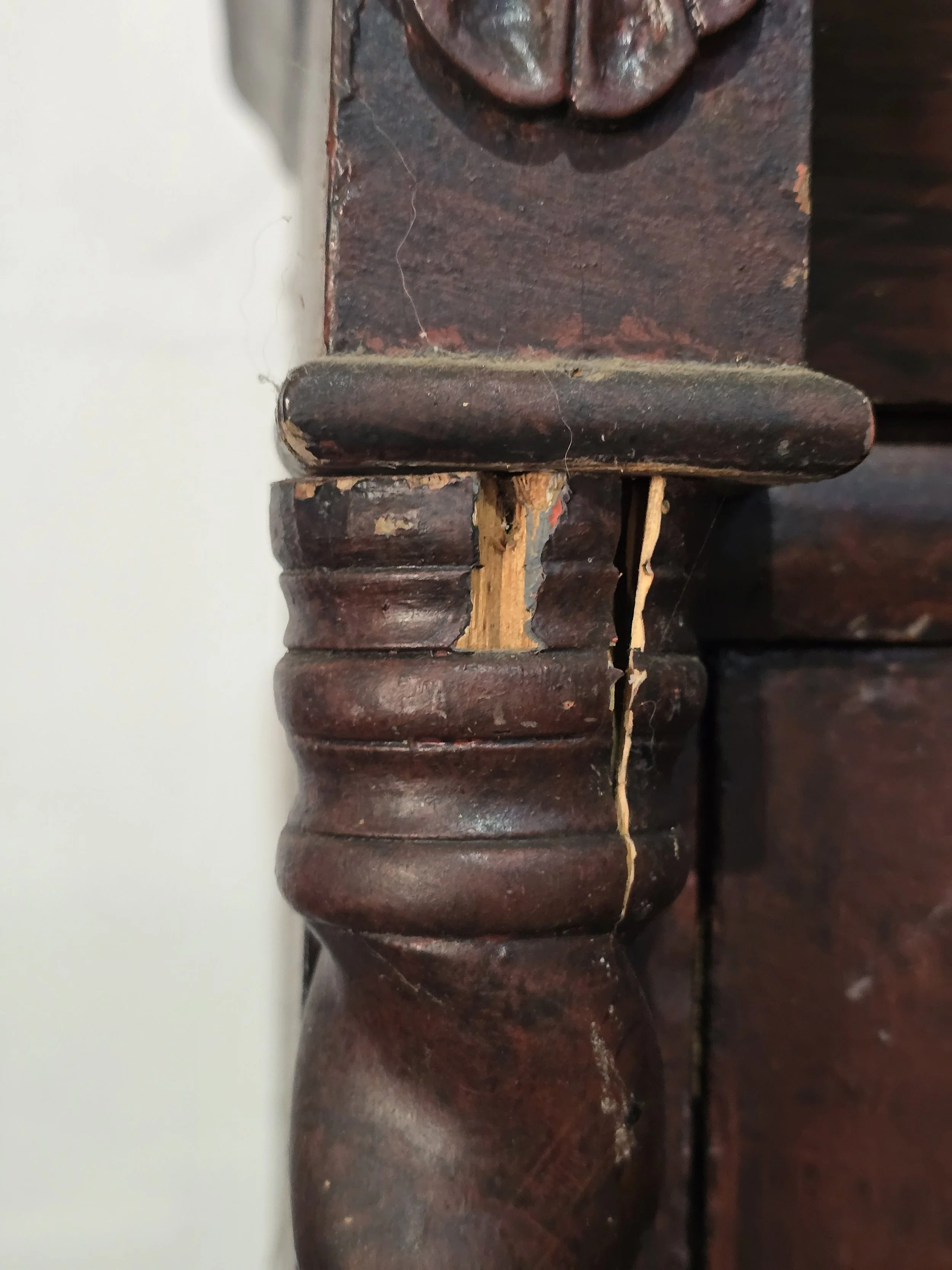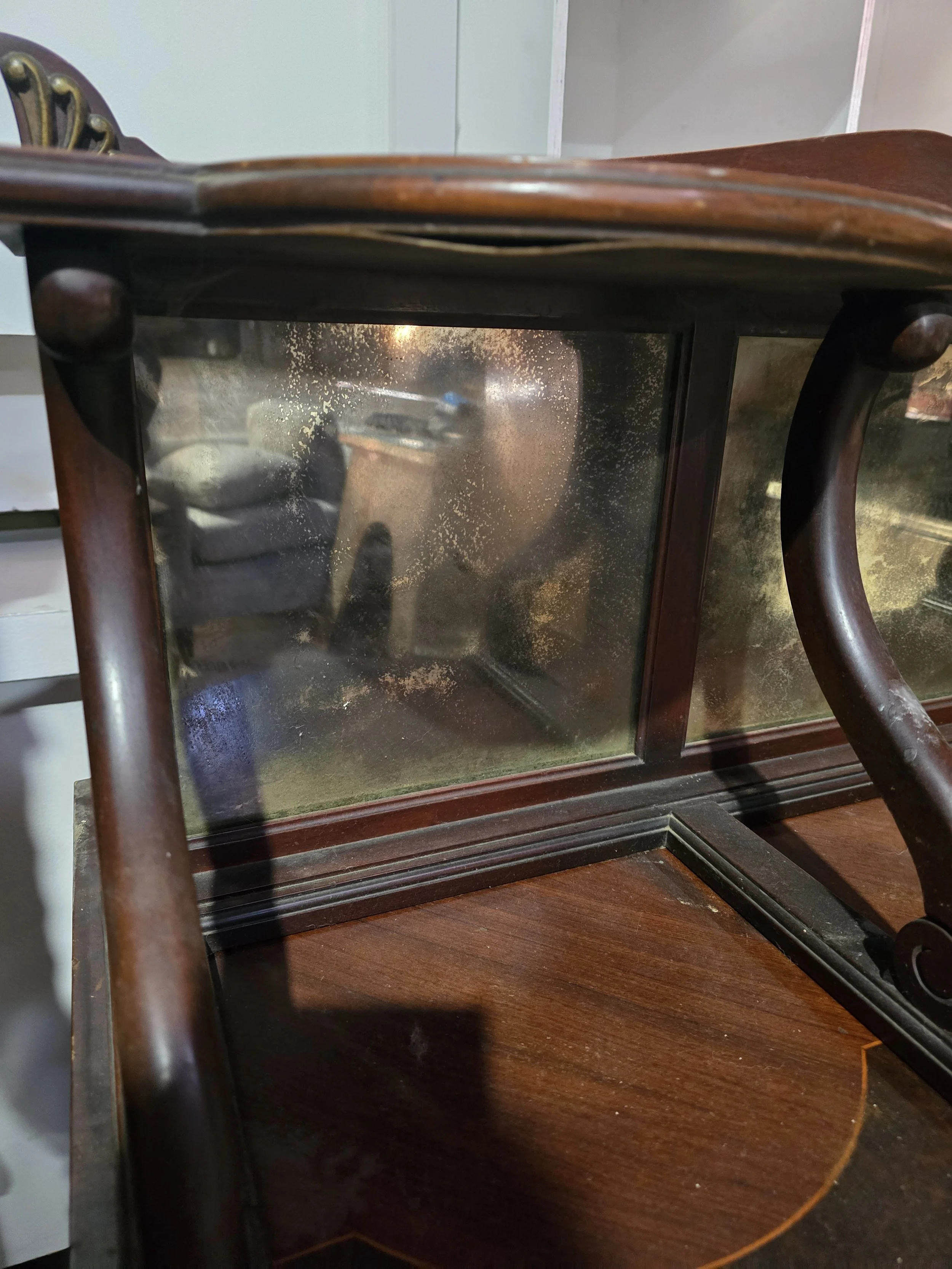 Antique Sideboard with tons of detail. The way the mirror has antiqued is incredible. There is definitely a broken piece at the top where the curve goes down. The “face” accents are metal. All in all, it is a stunning piece.