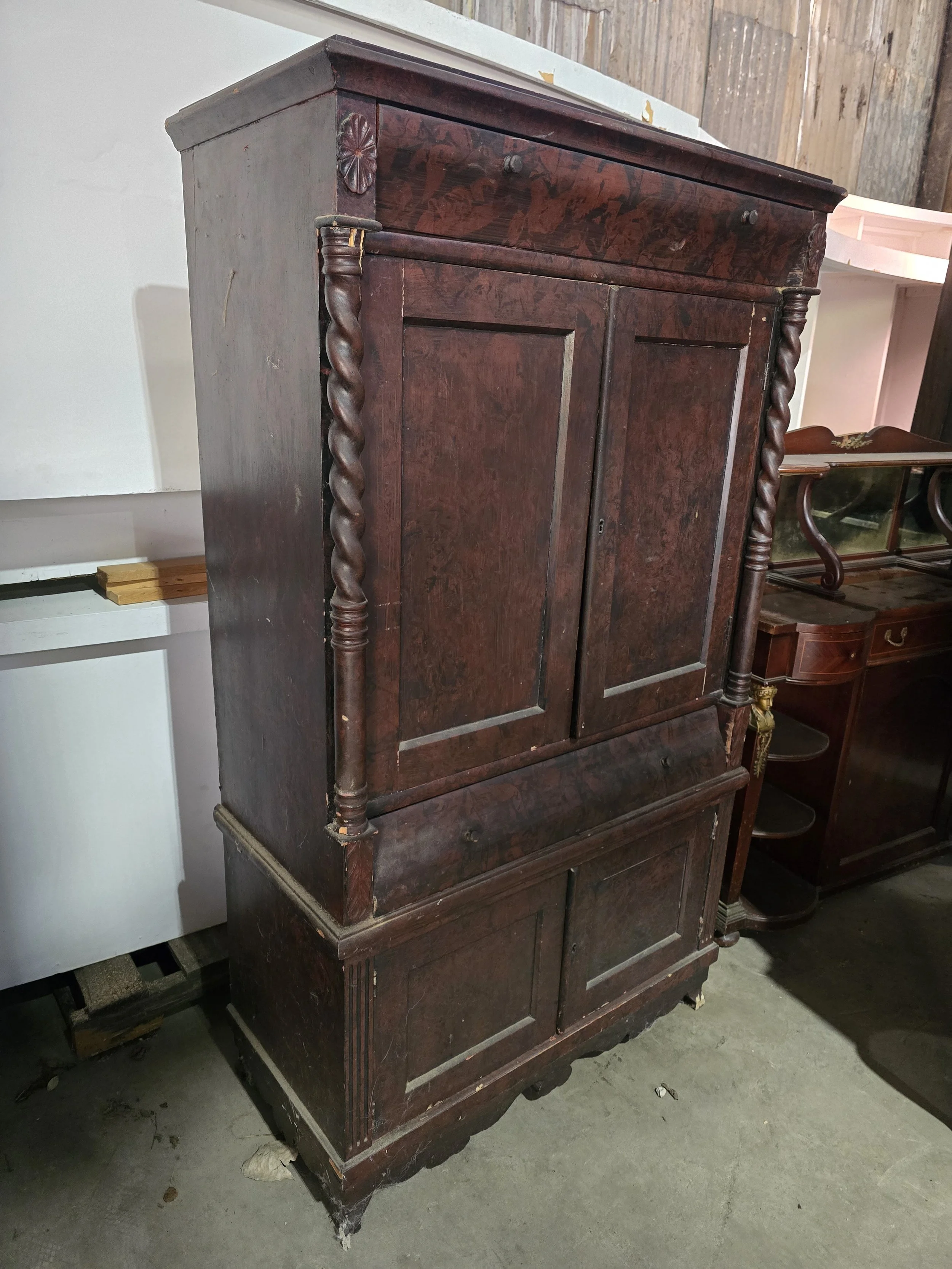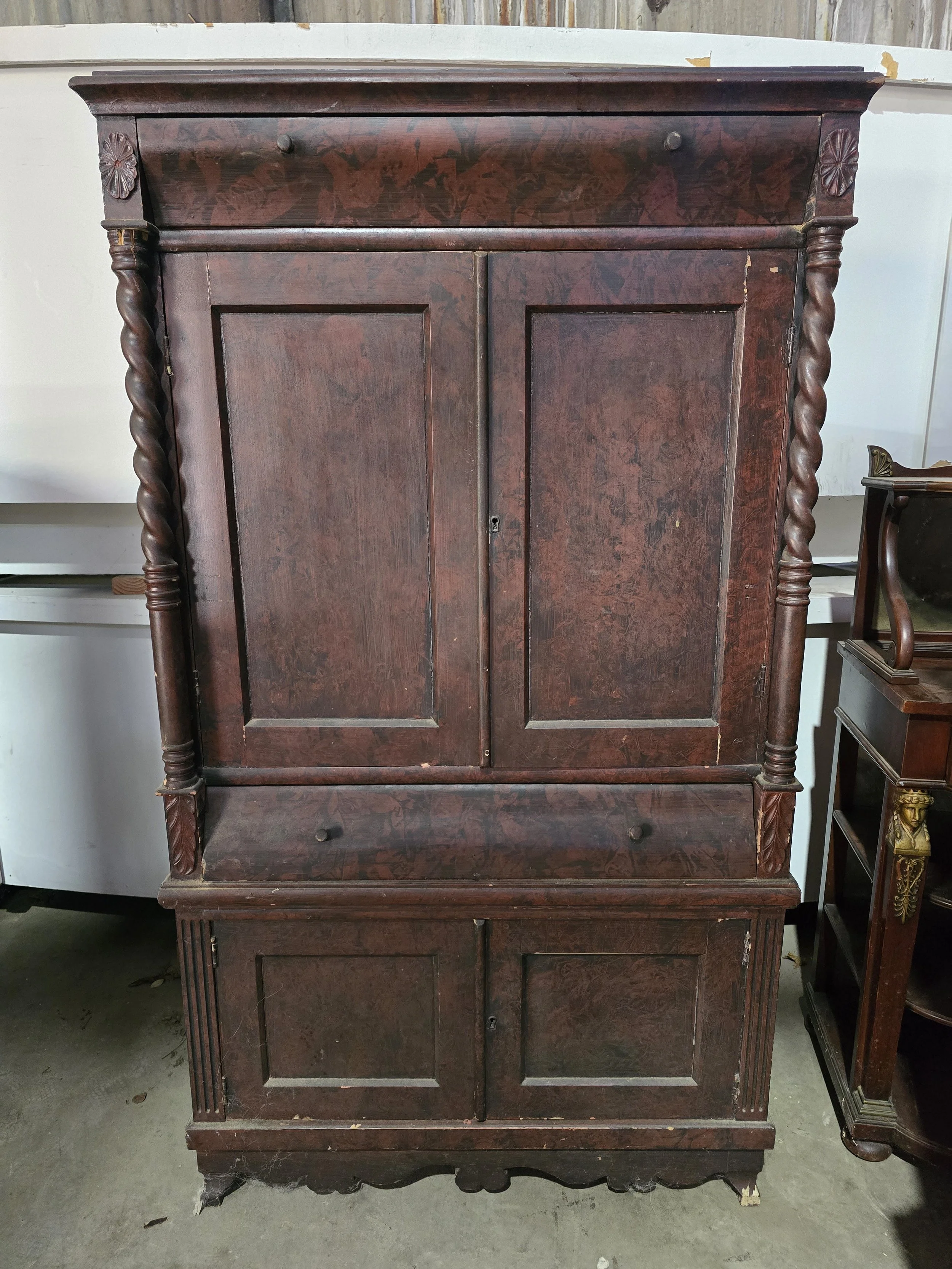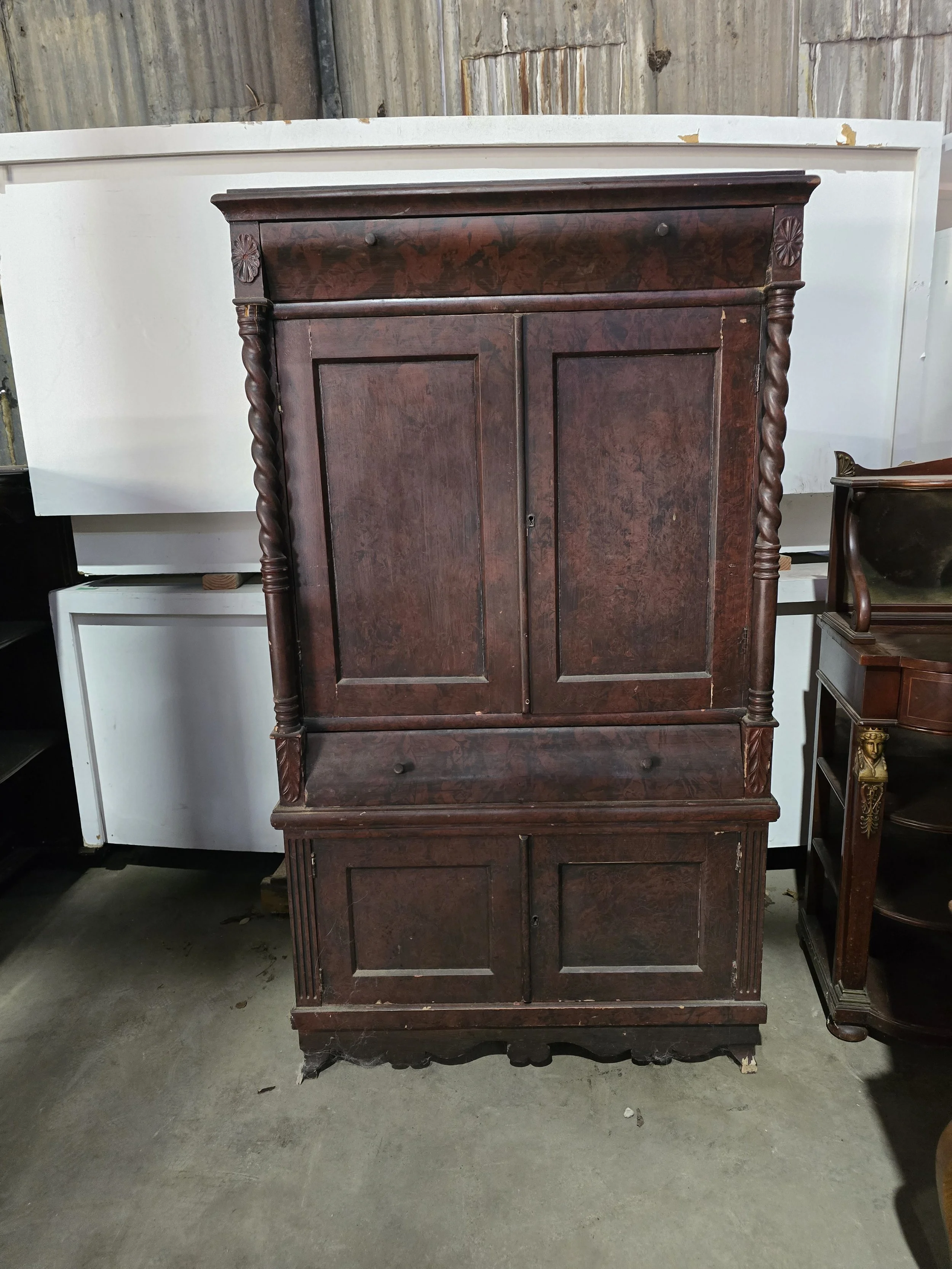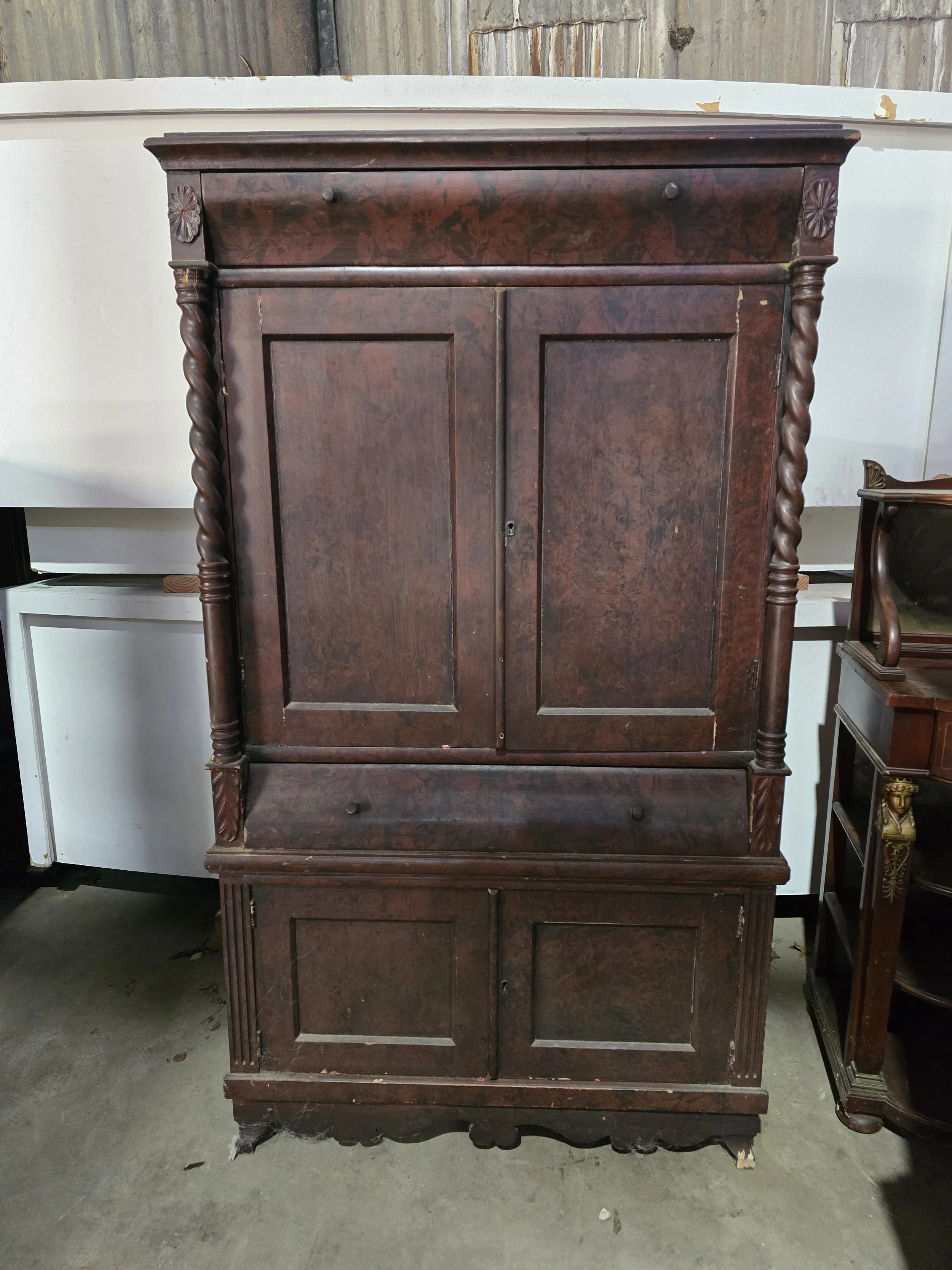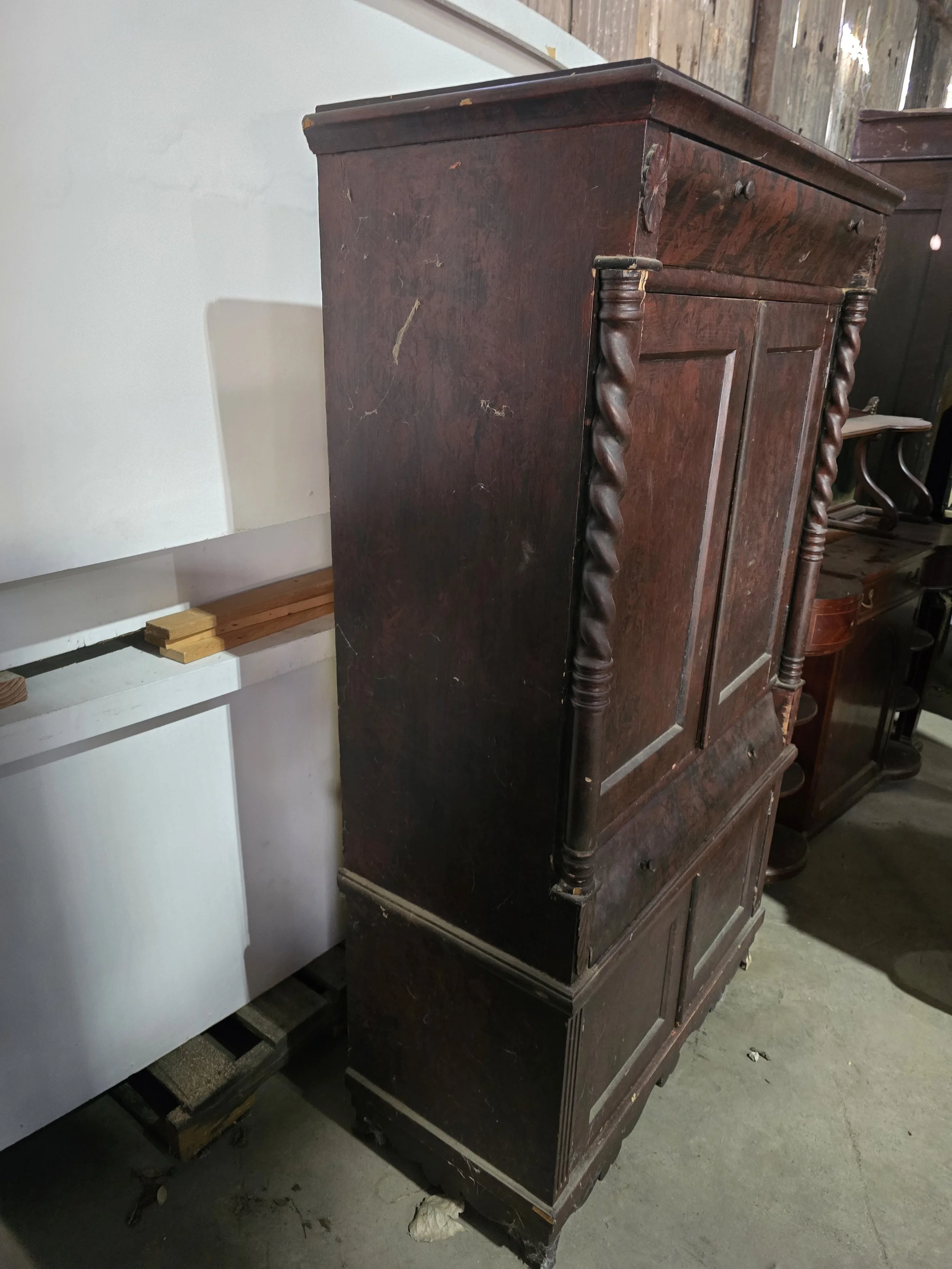 Antique Sideboard with tons of detail. The way the mirror has antiqued is incredible. There is definitely a broken piece at the top where the curve goes down. The “face” accents are metal. All in all, it is a stunning piece.