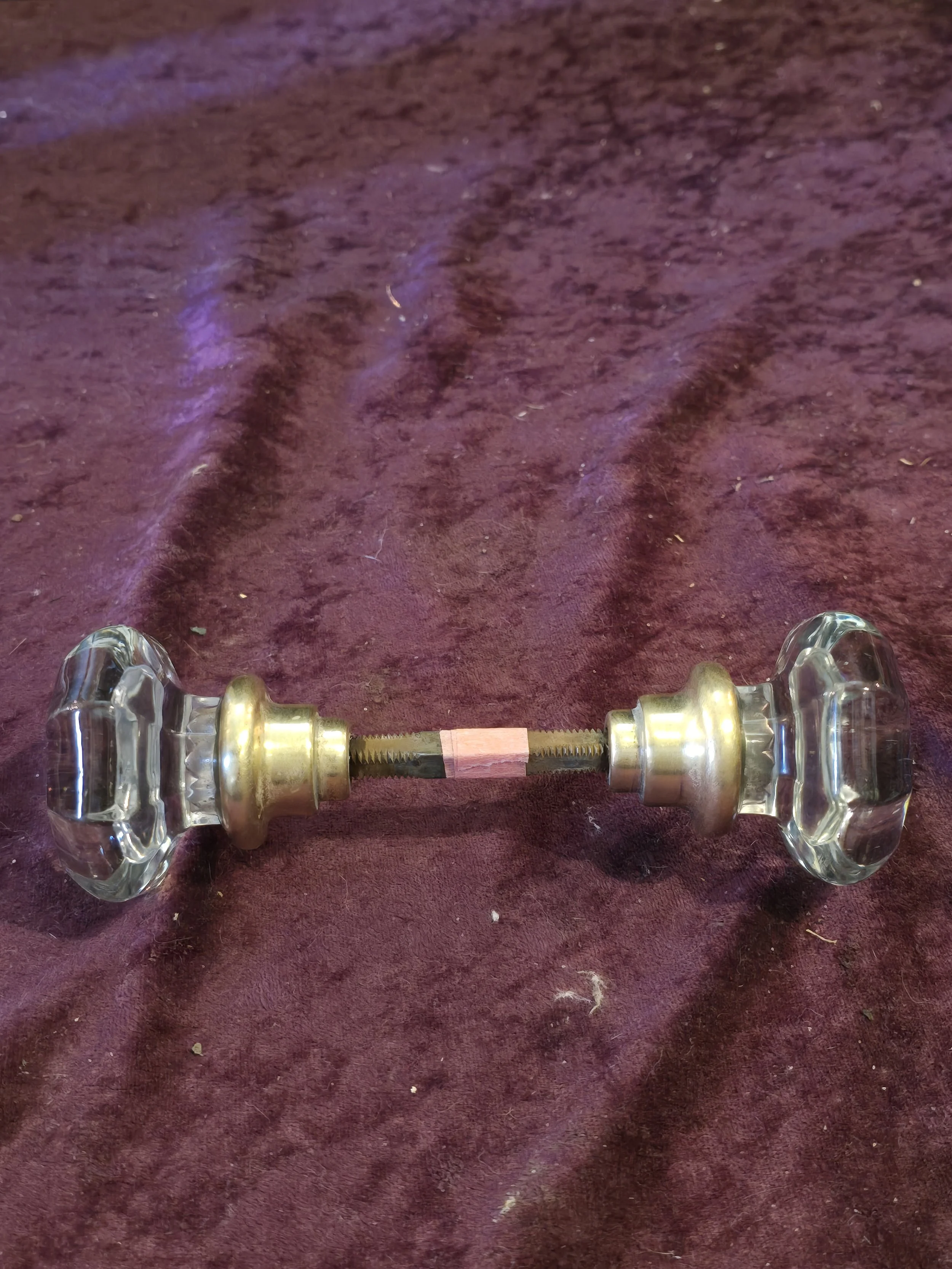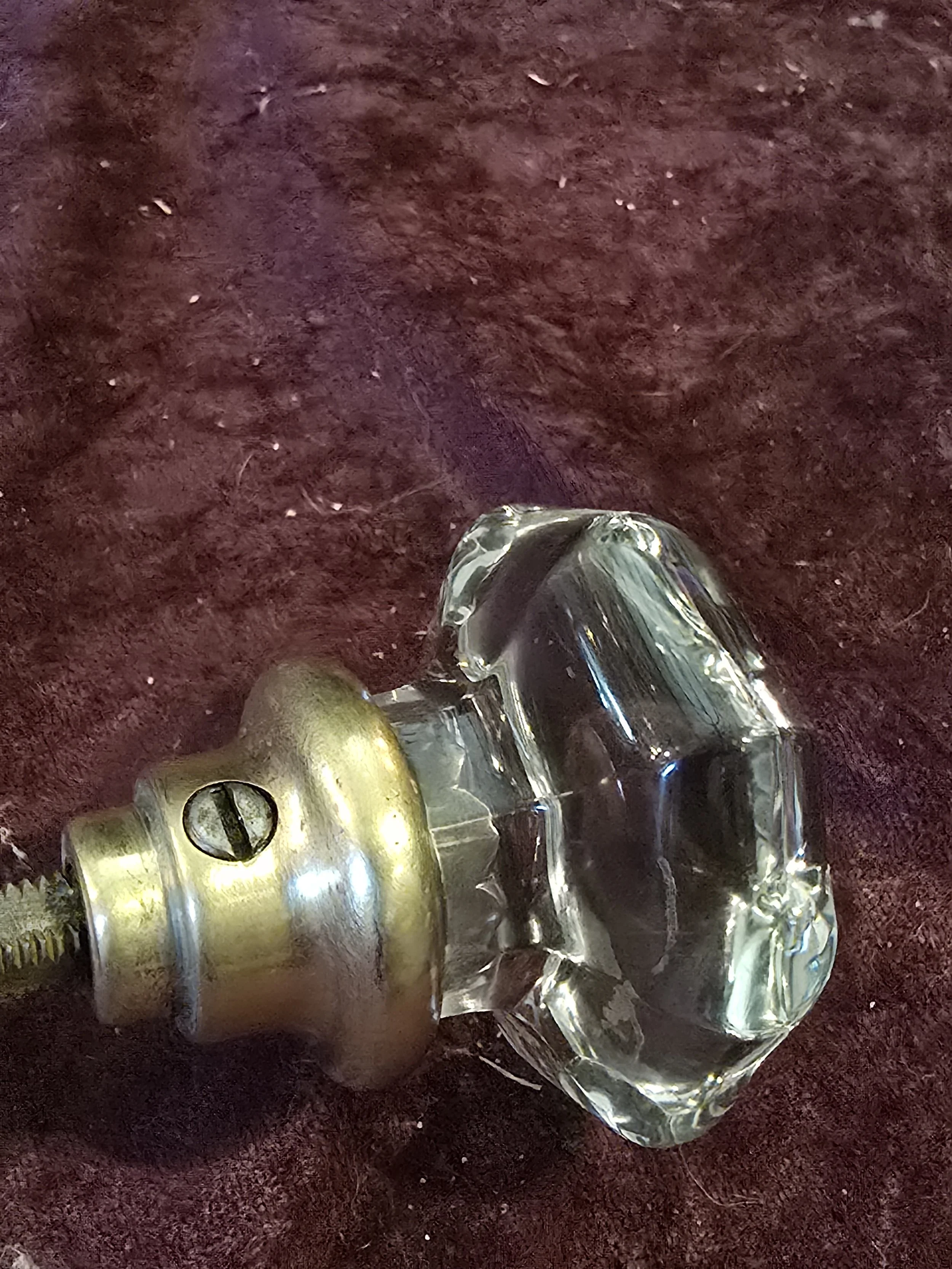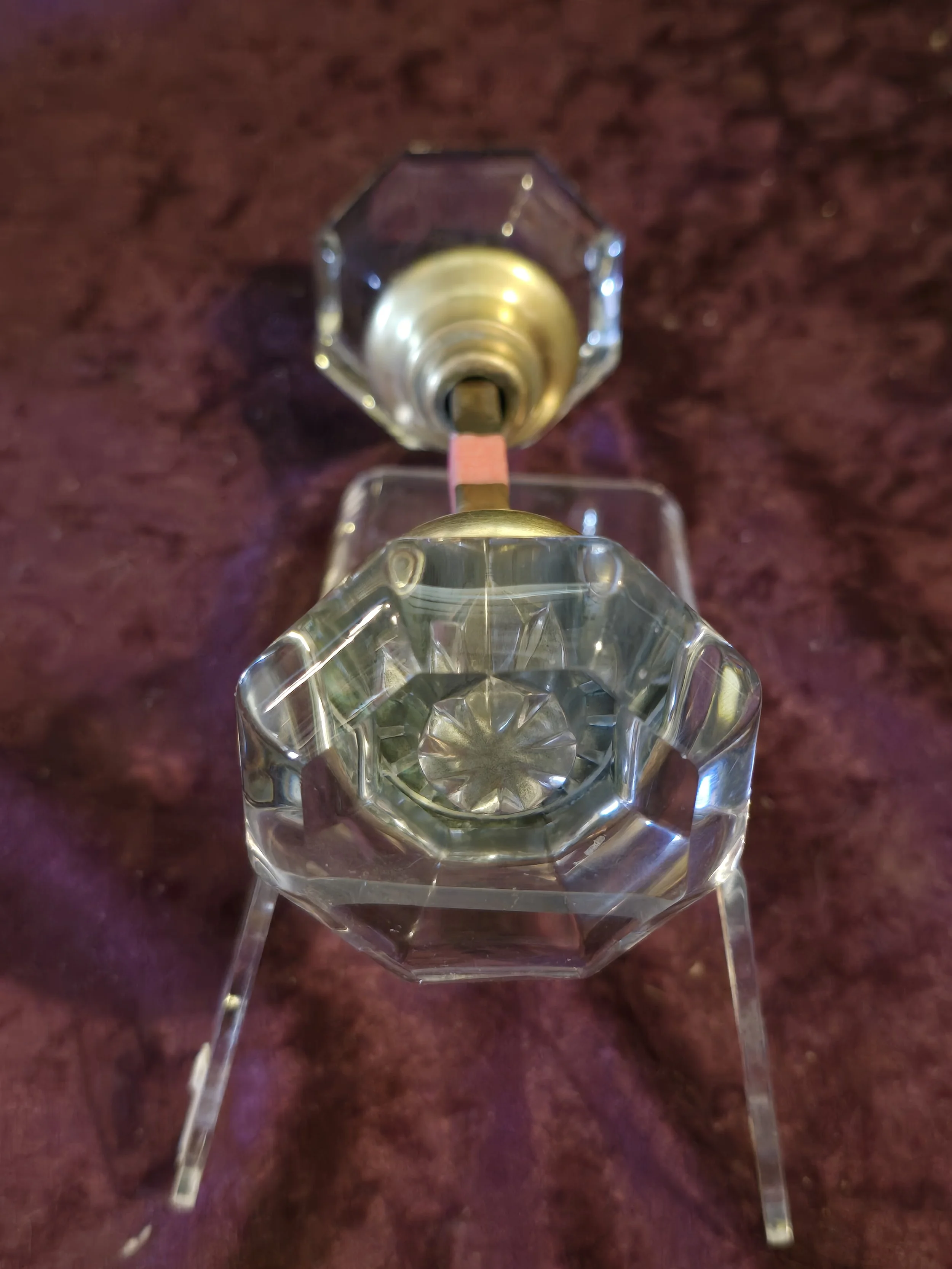 Antique octagonal glass knob with brass fittings. The set includes both knobs pictured, the metal post, and the set screws.