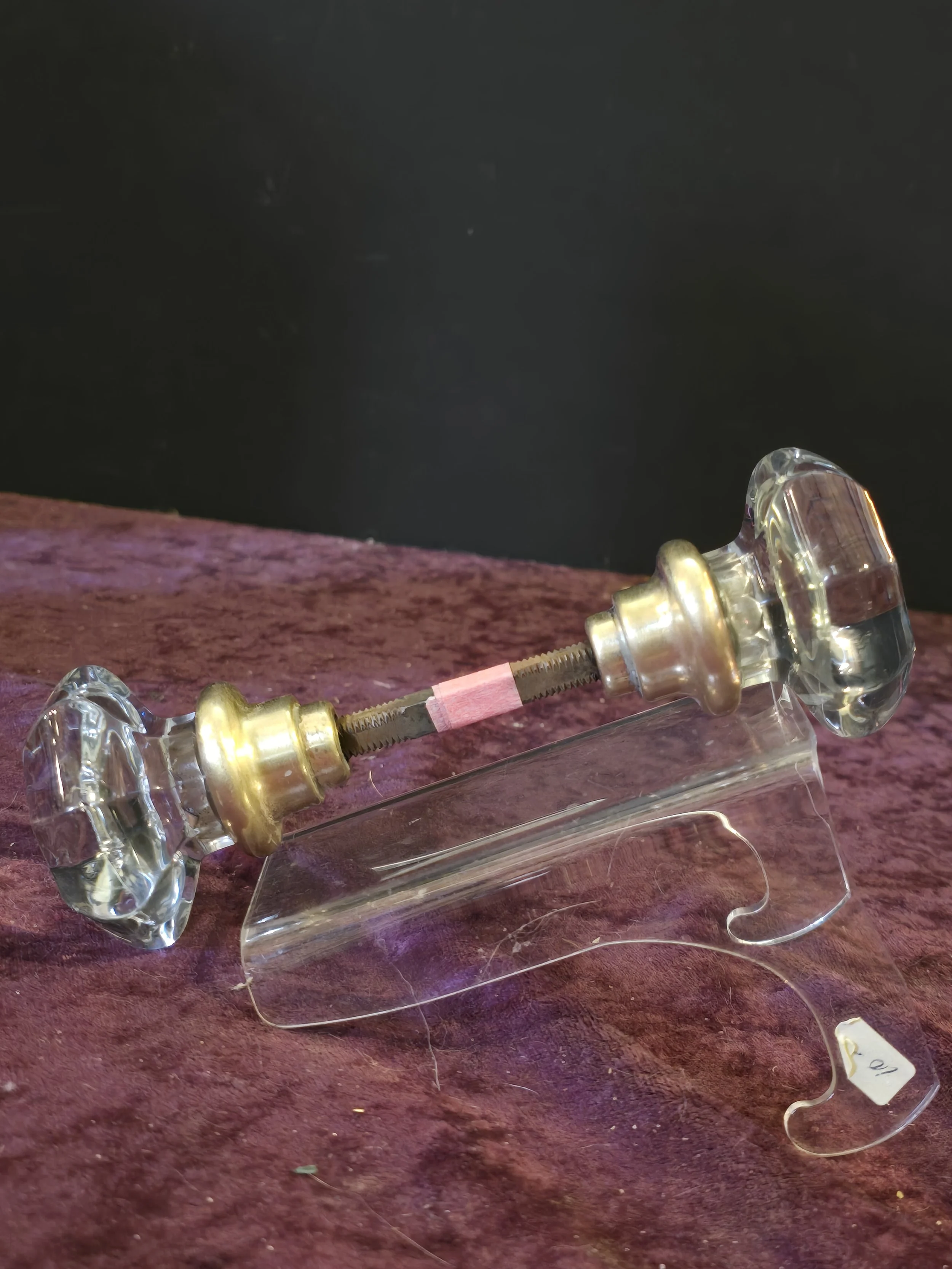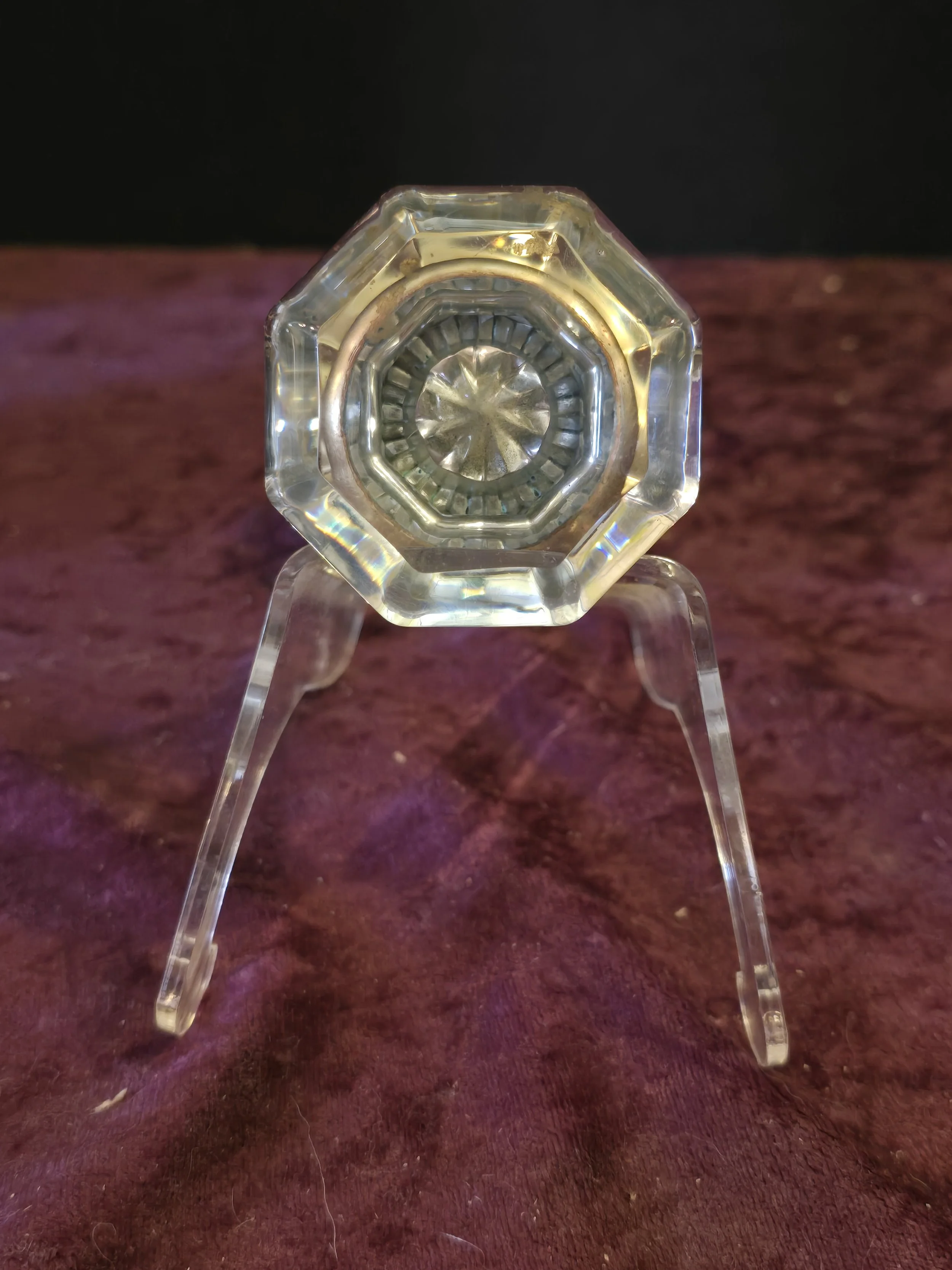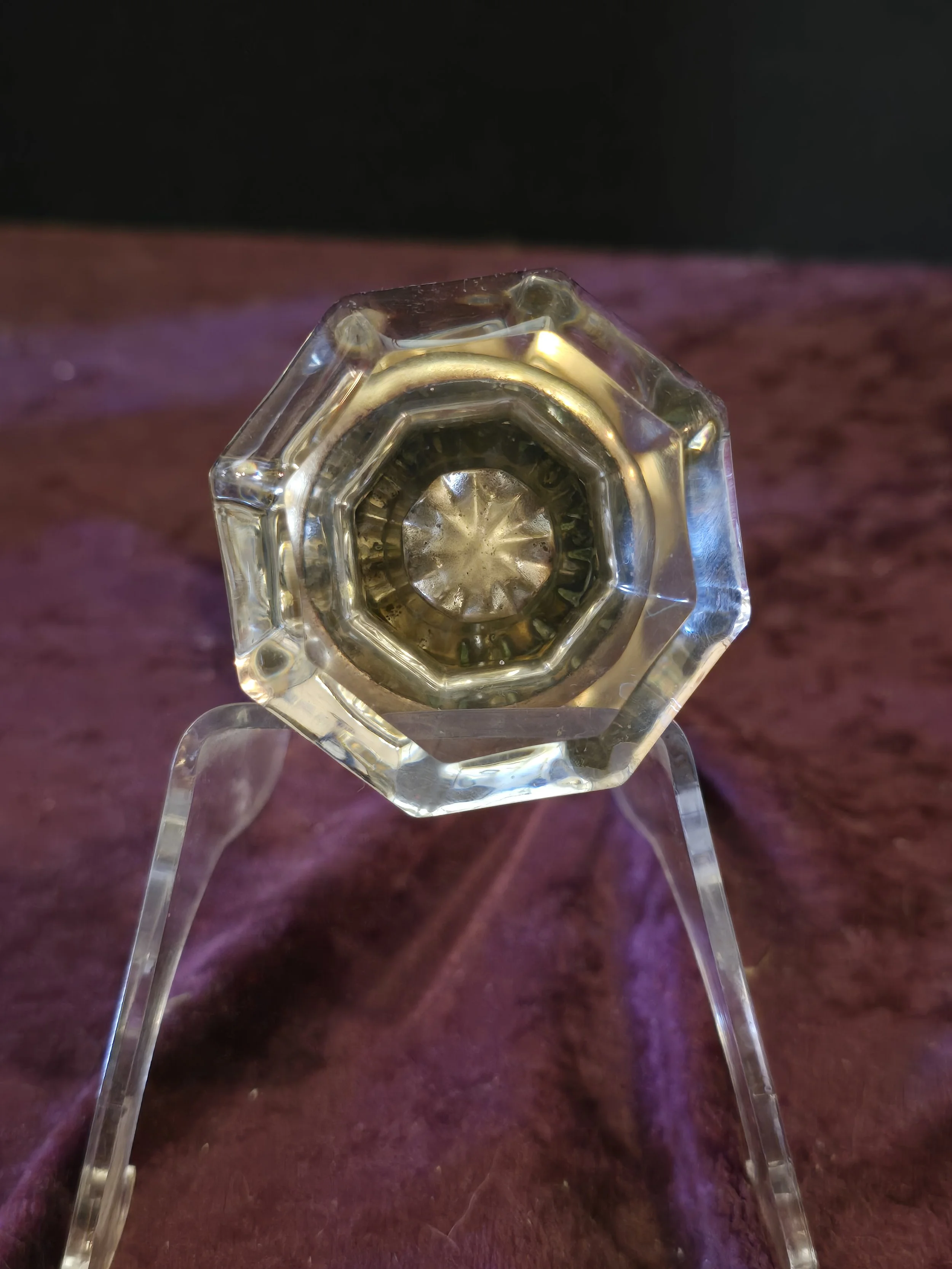 Antique octagonal glass knob with brass fittings. The set includes both knobs pictured, the metal post, and the set screws.