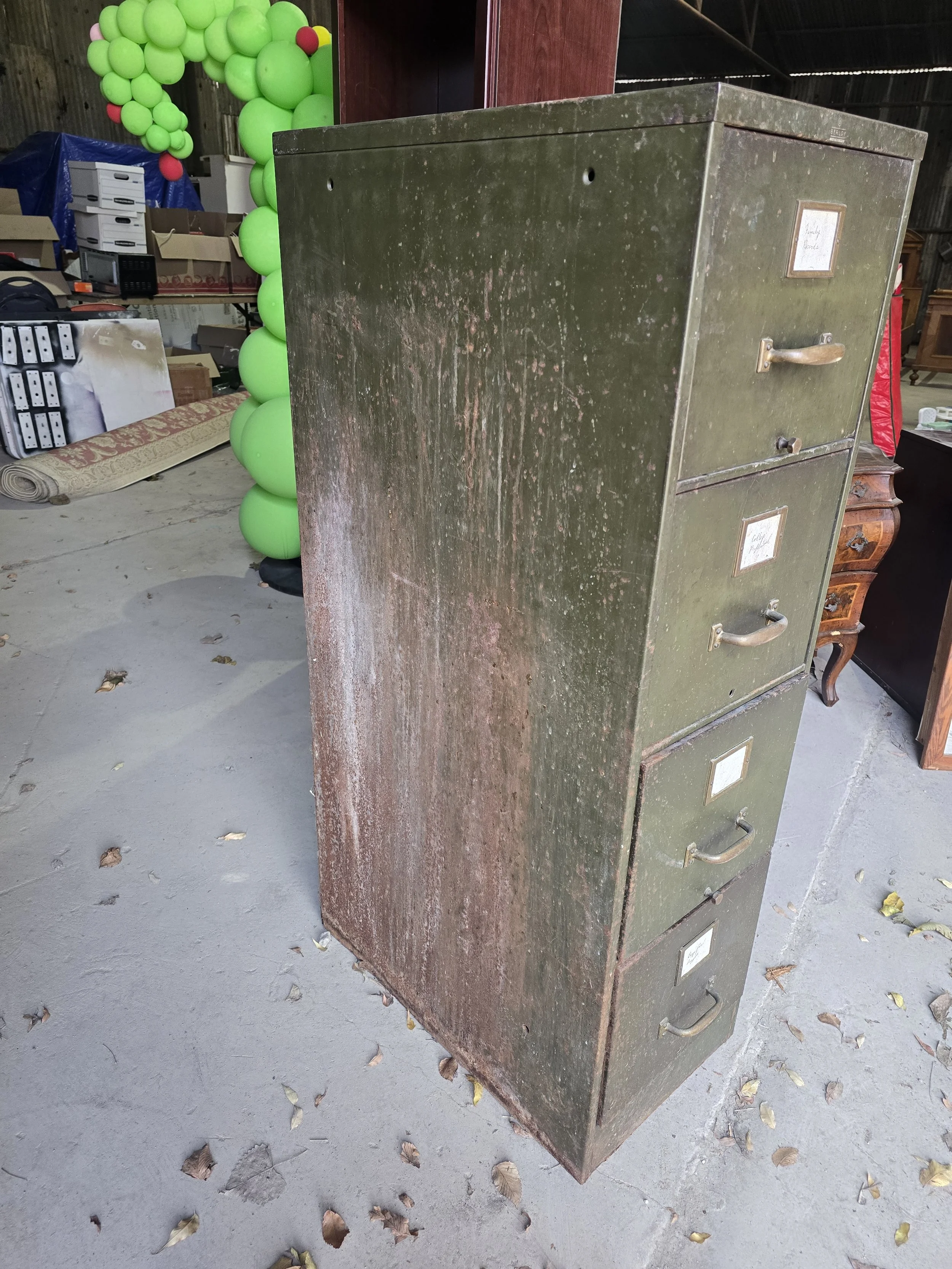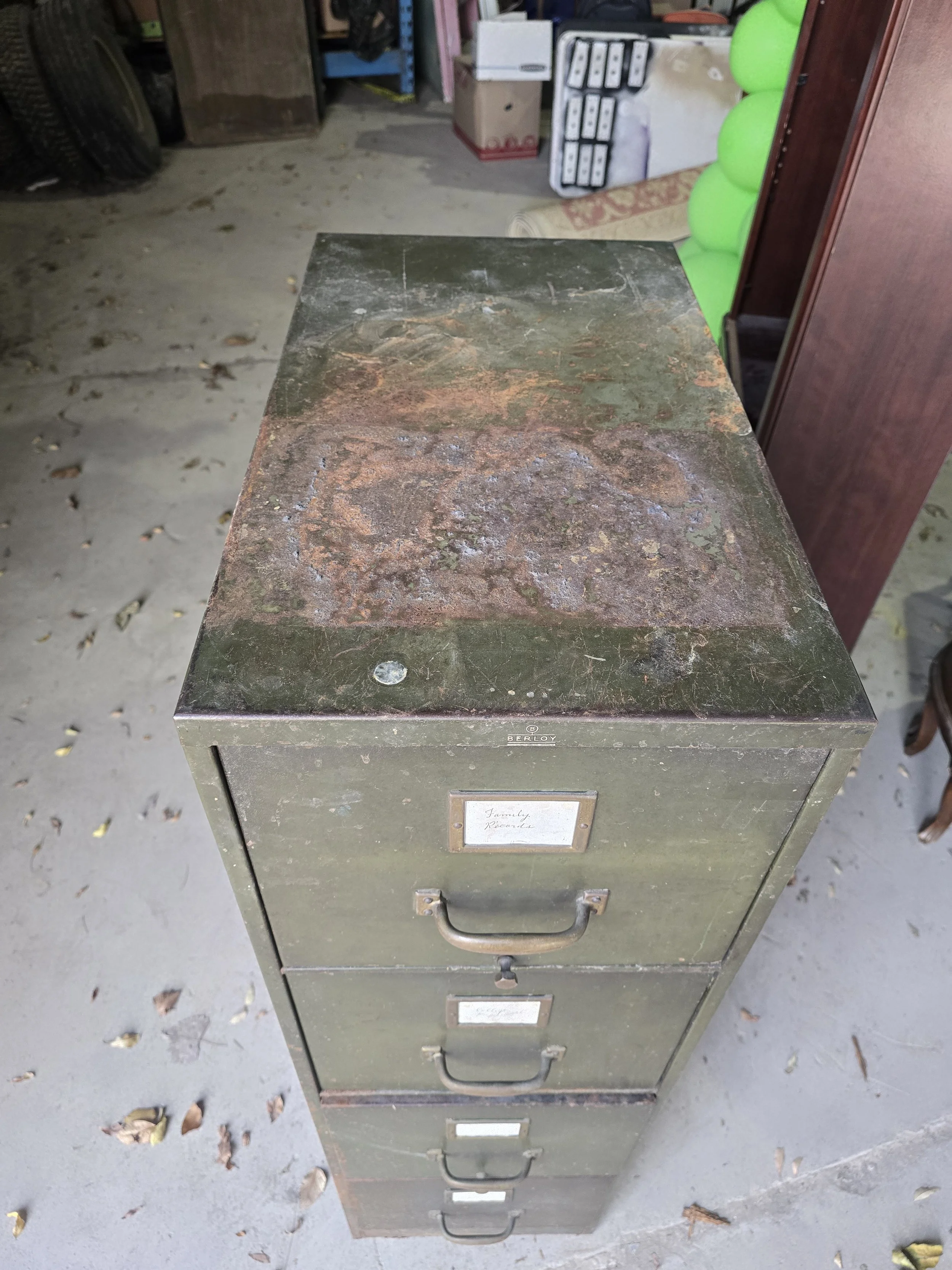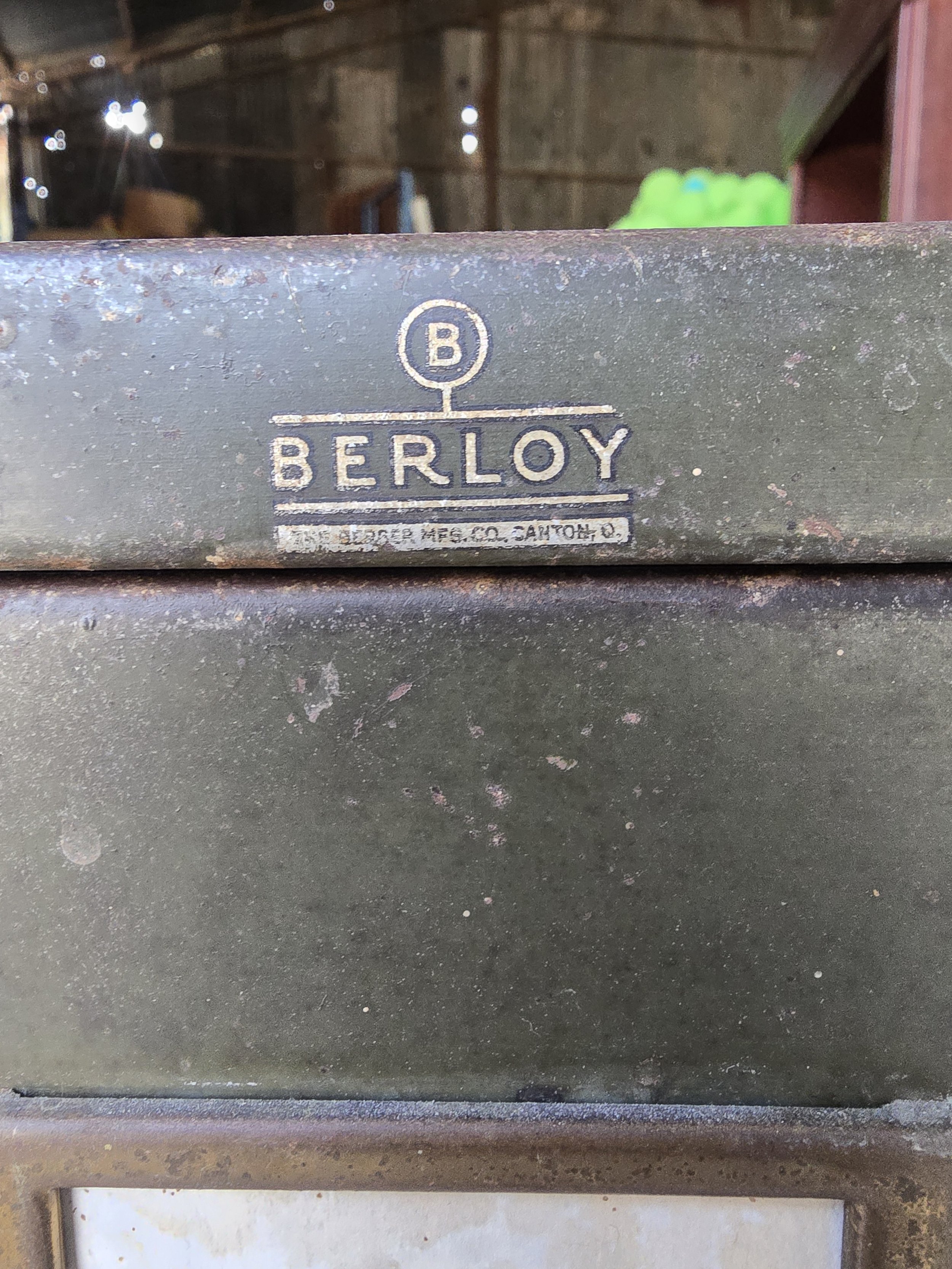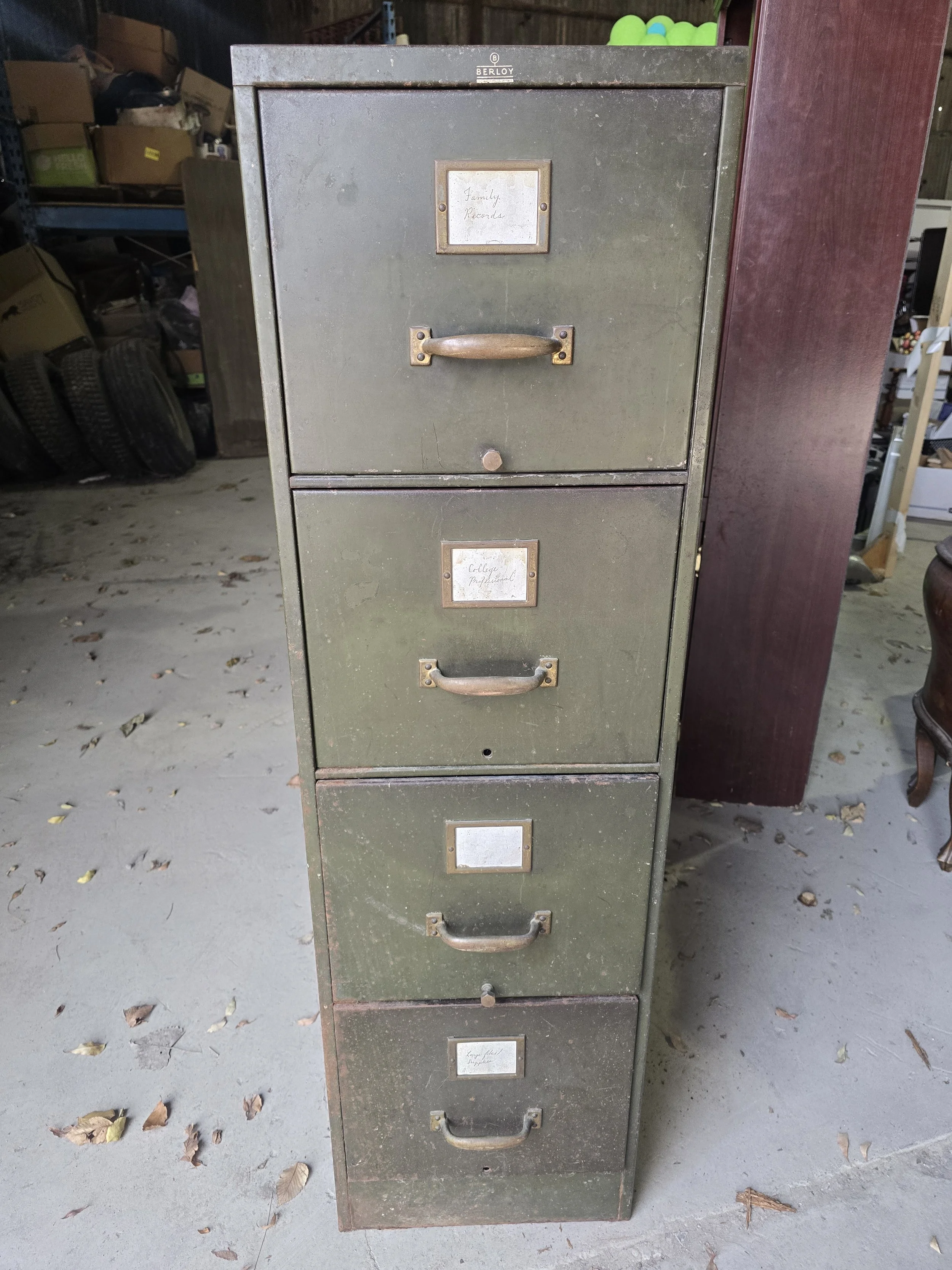 Super cool metal 4 drawer Berloy metal file cabinet. There is rust on the top and on one side. This cabinet would be fantastic newly painted.