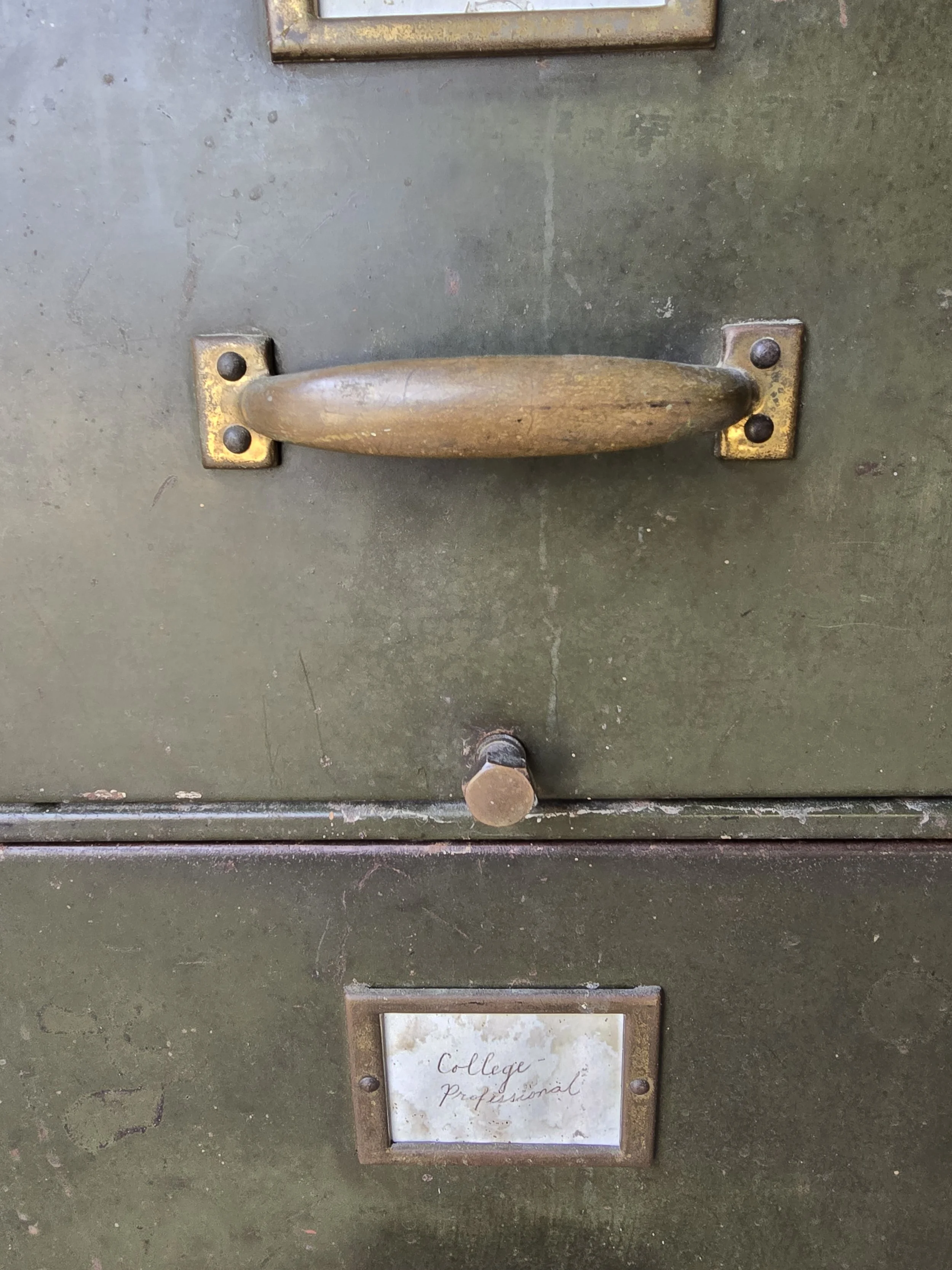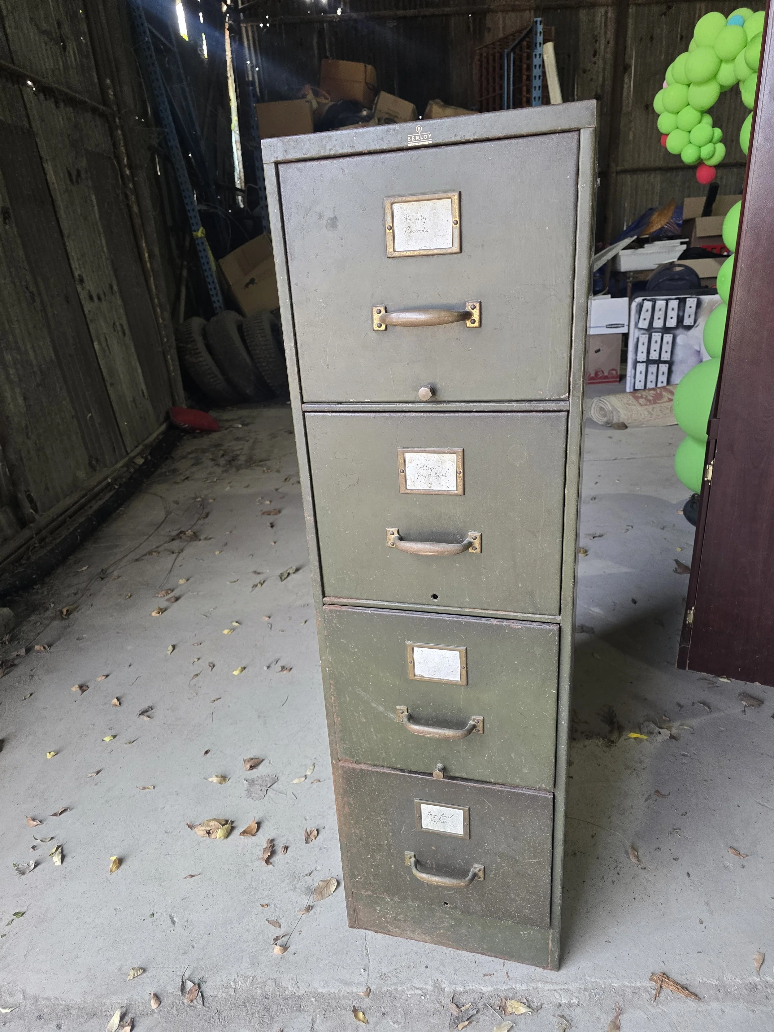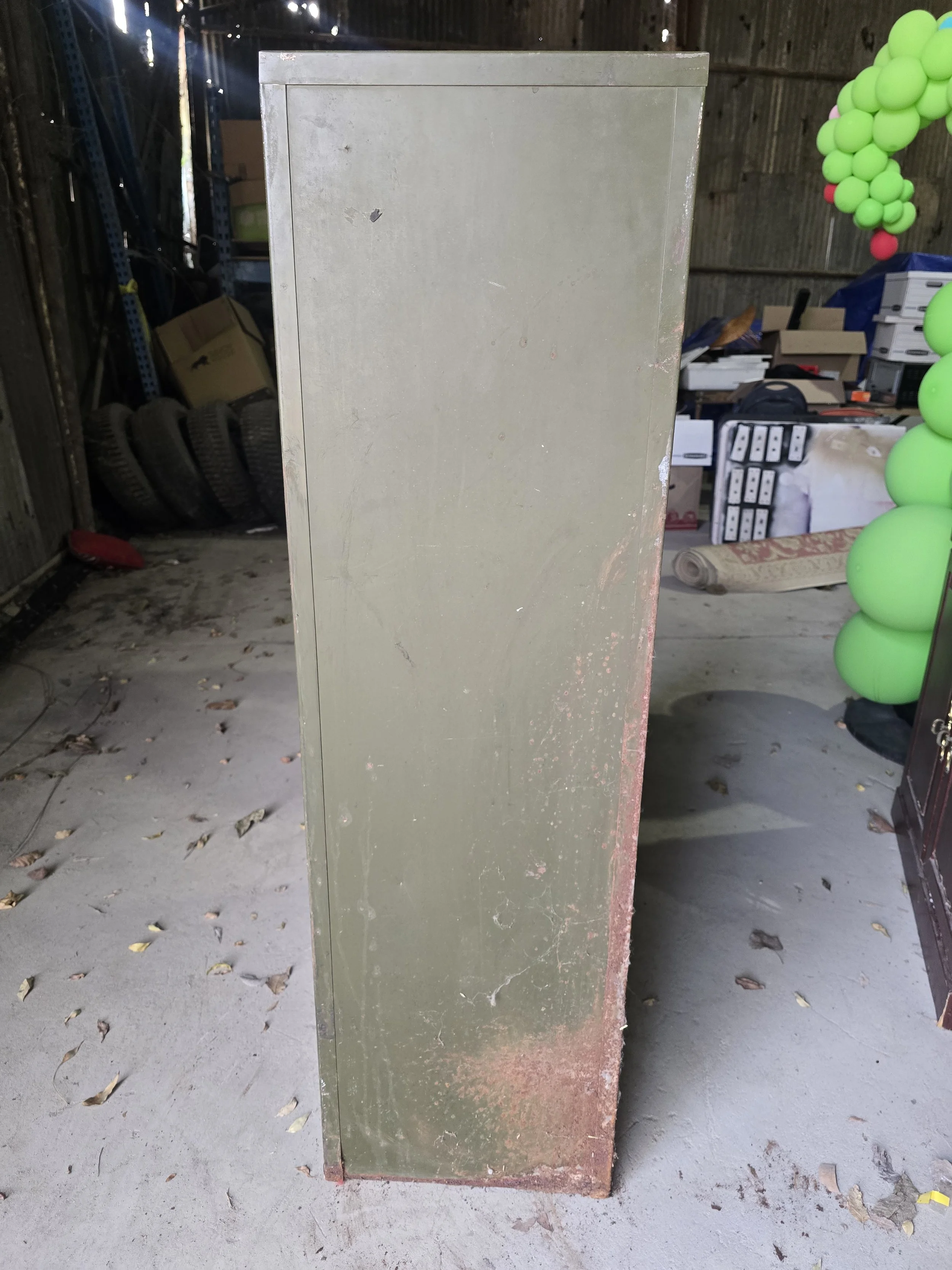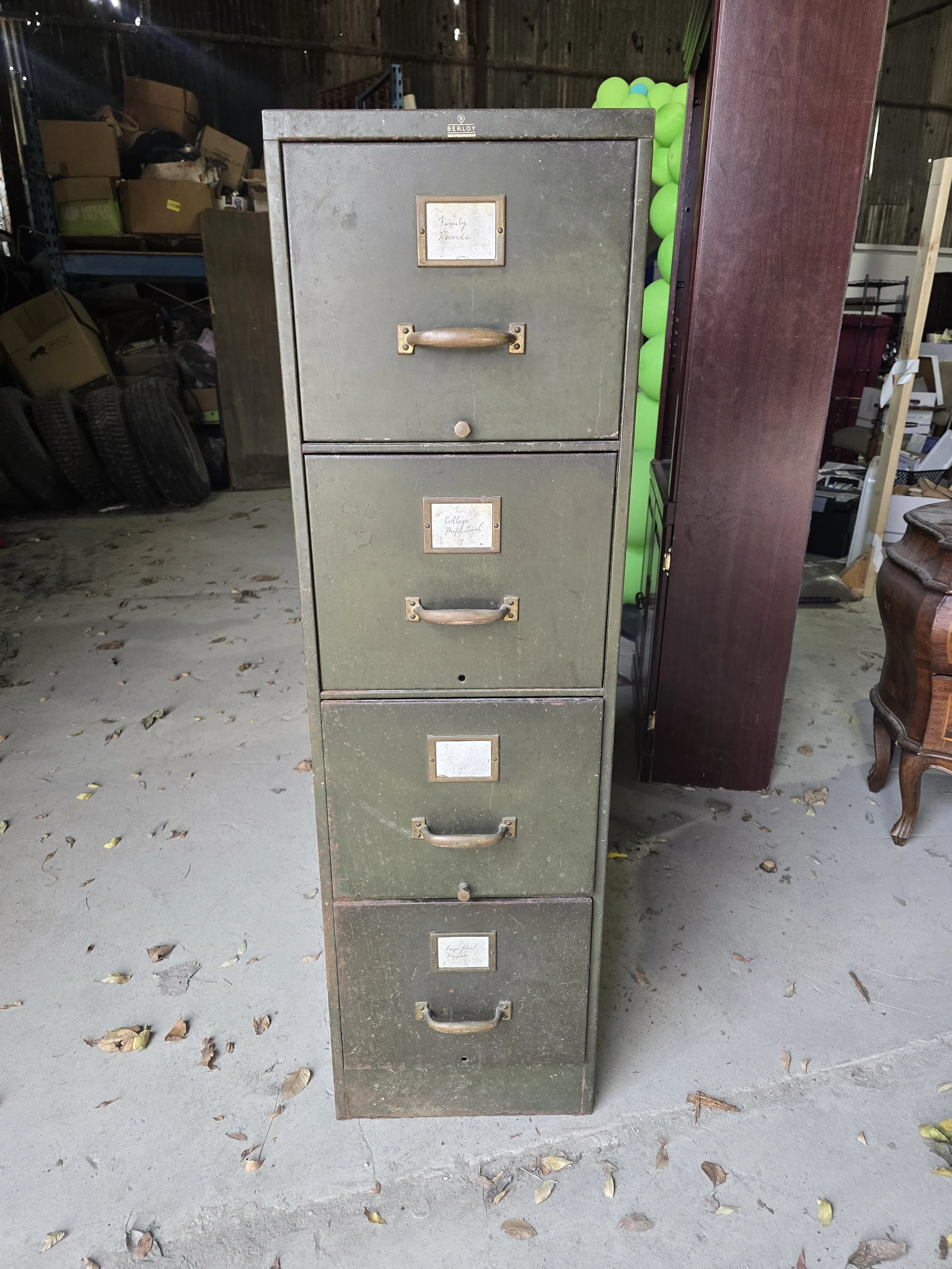 Super cool metal 4 drawer Berloy metal file cabinet. There is rust on the top and on one side. This cabinet would be fantastic newly painted.