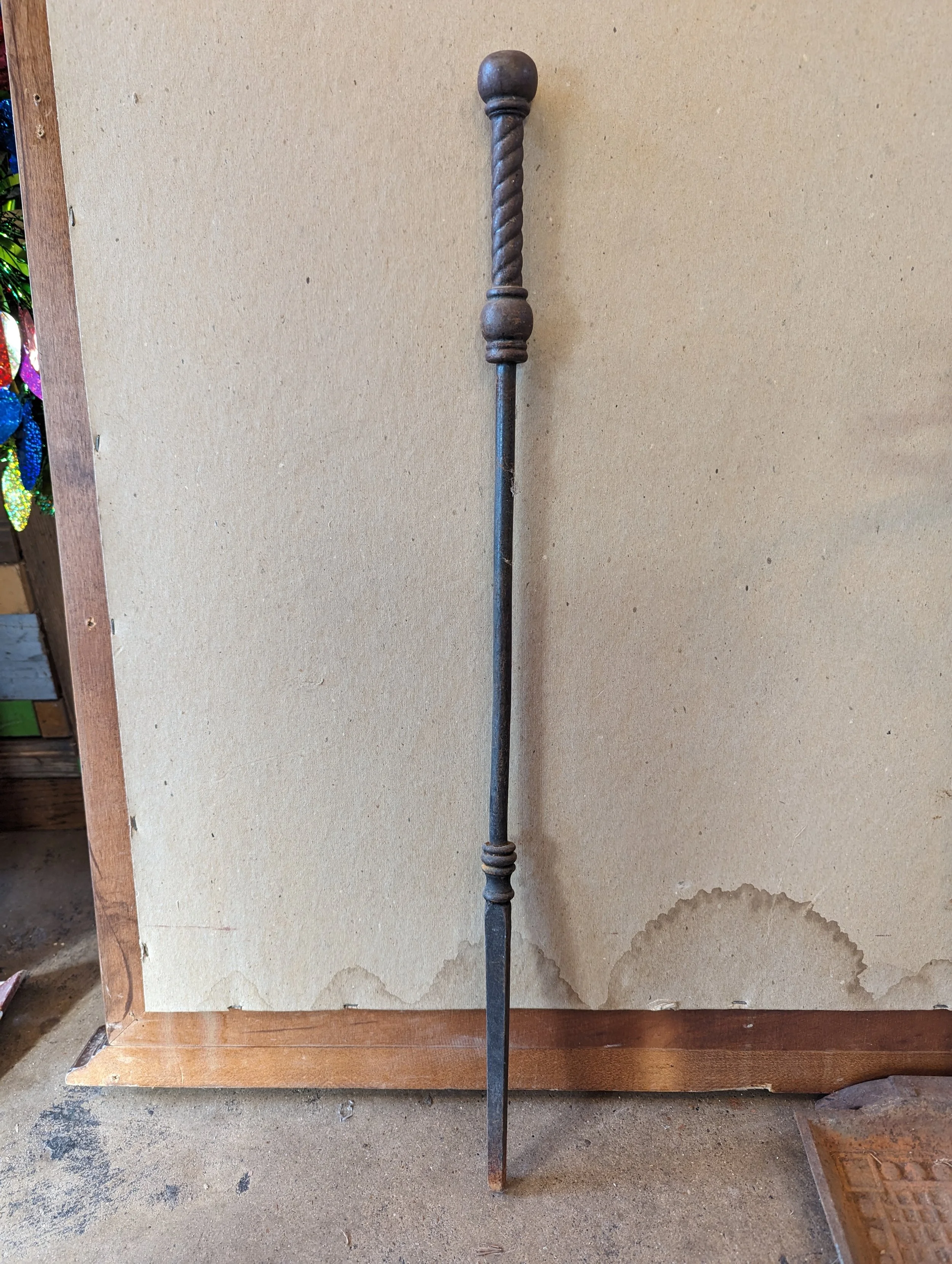 Iron Firetool Set. There's a poker, and a shovel, and a the tongs for the logs. The tool for the tong is broken at the top, but is working fine