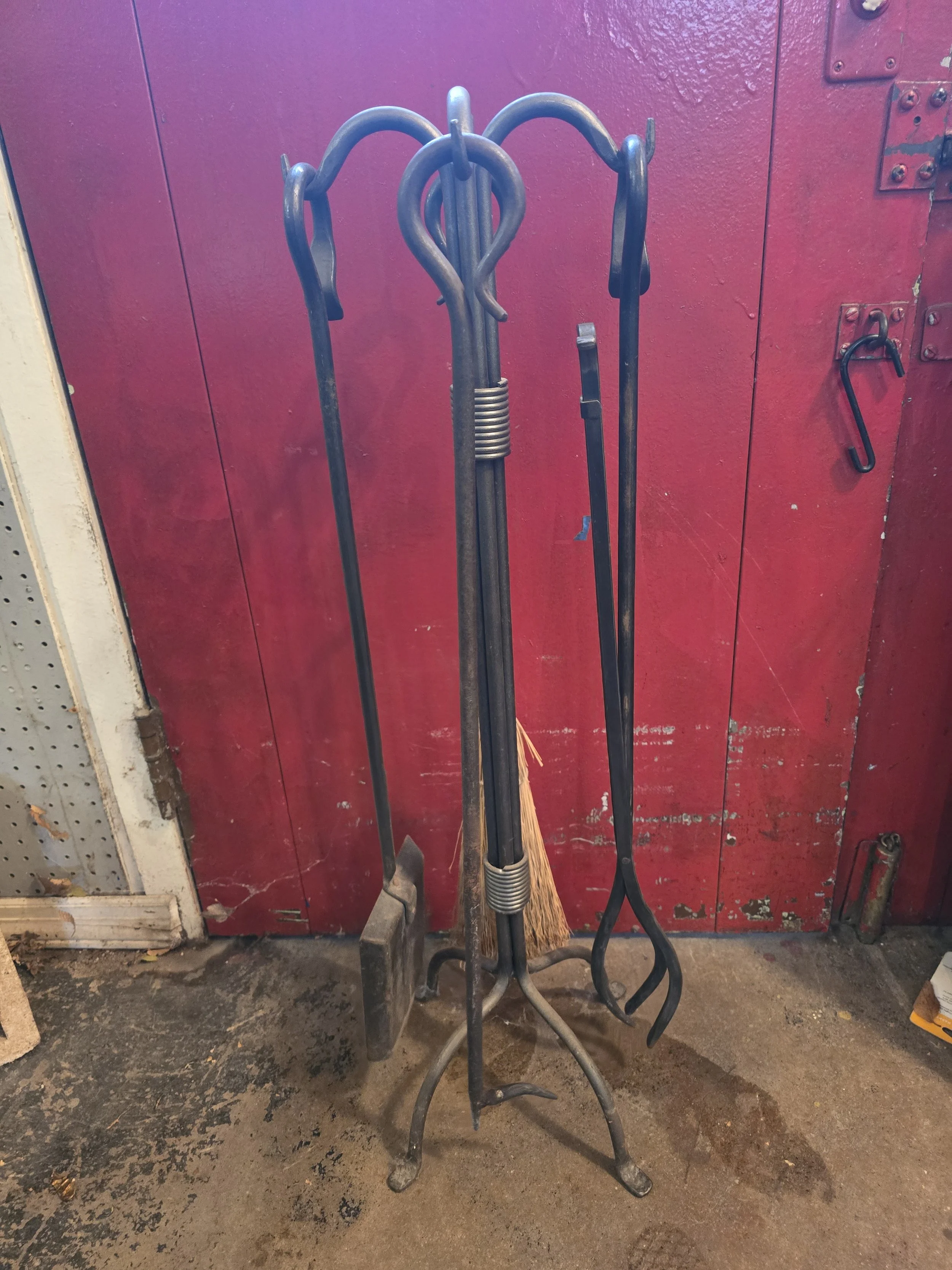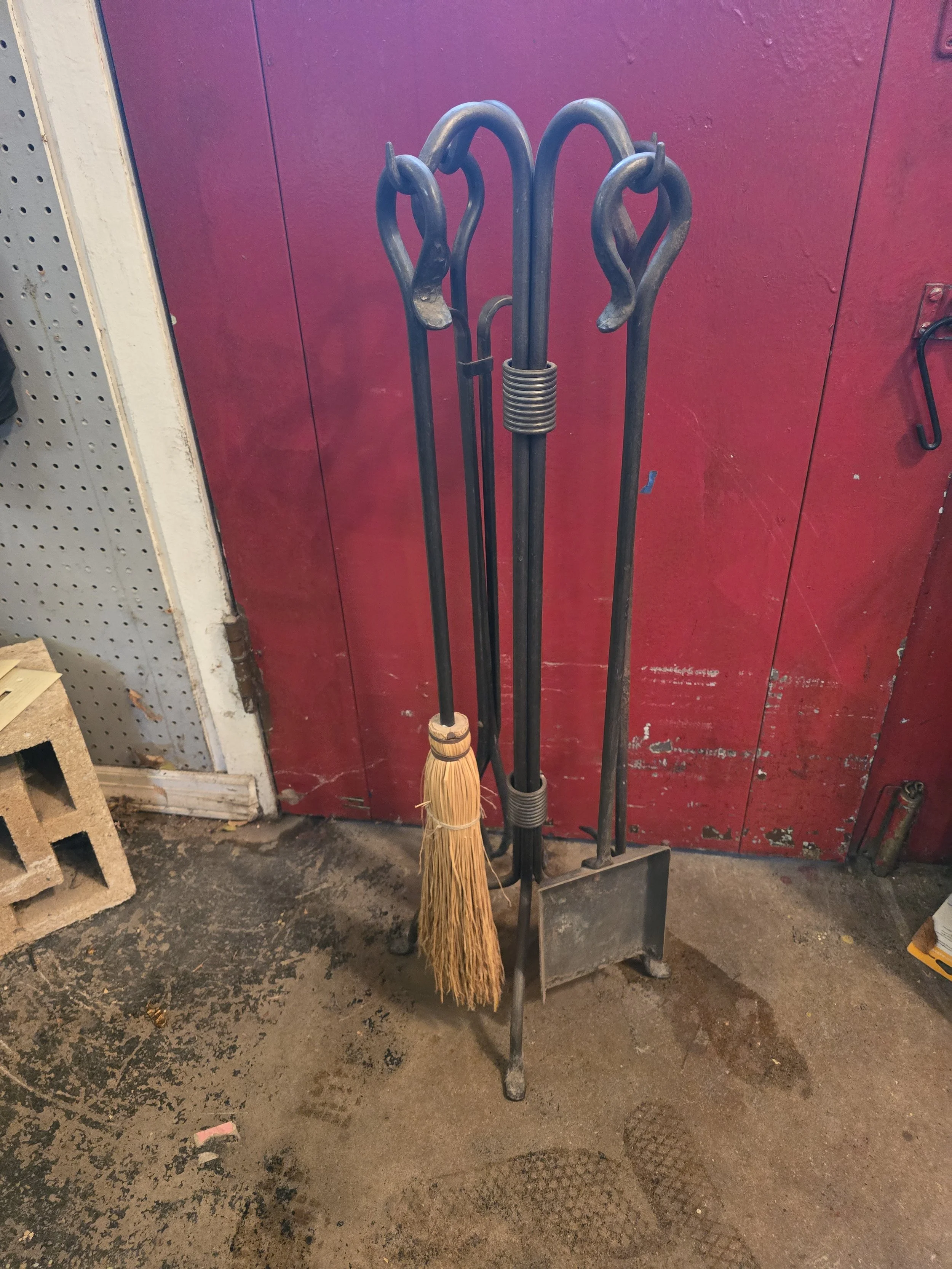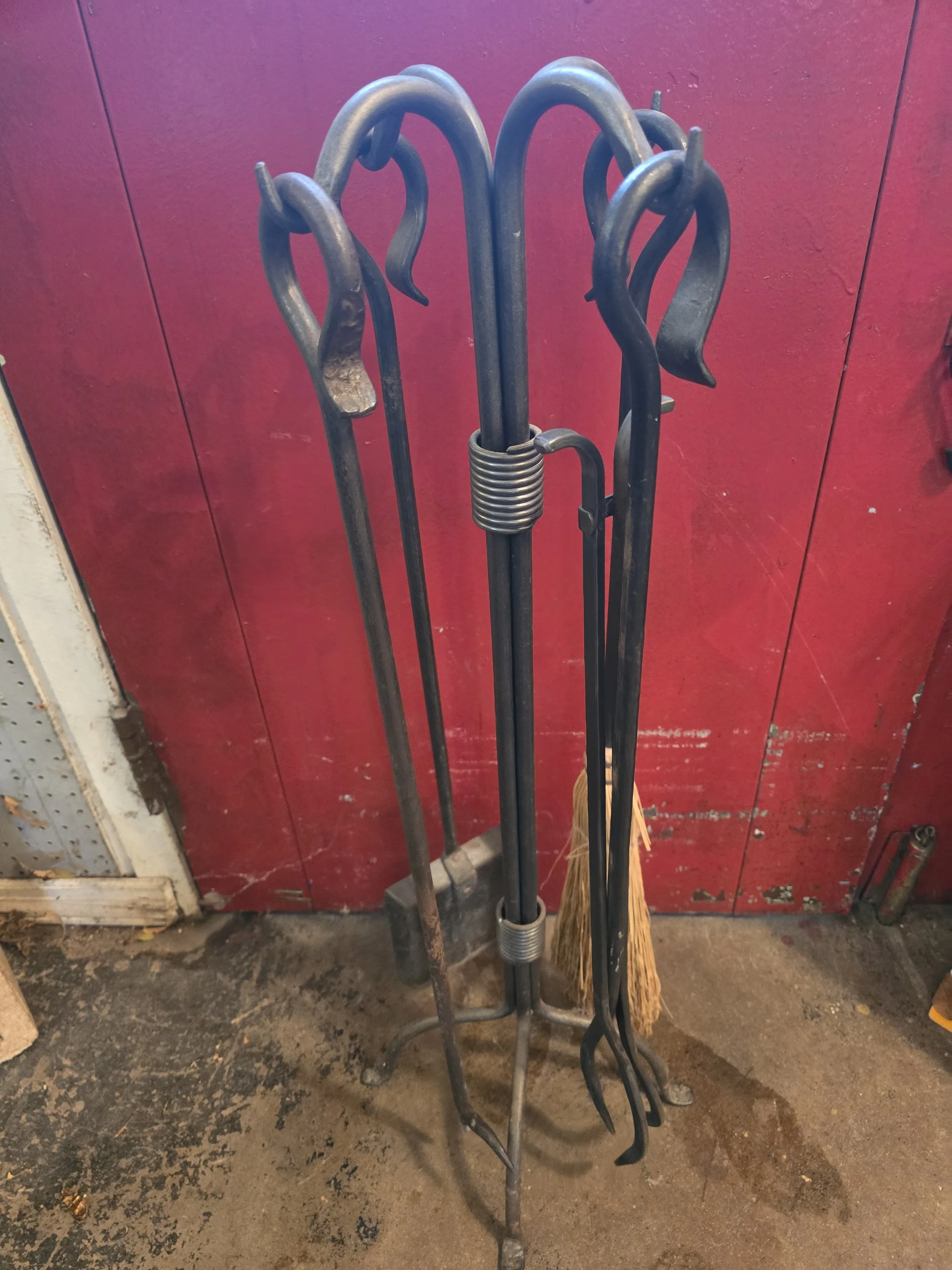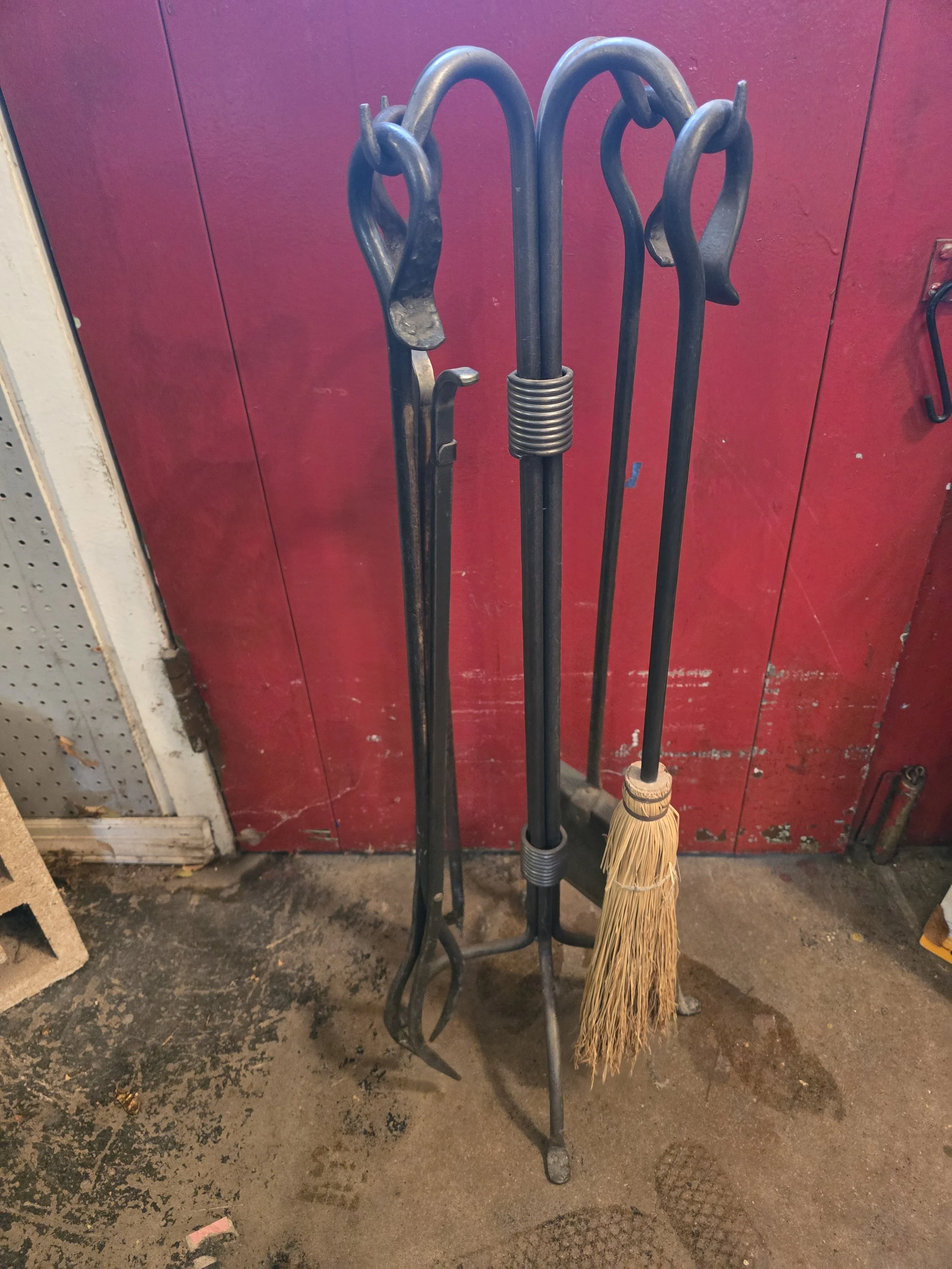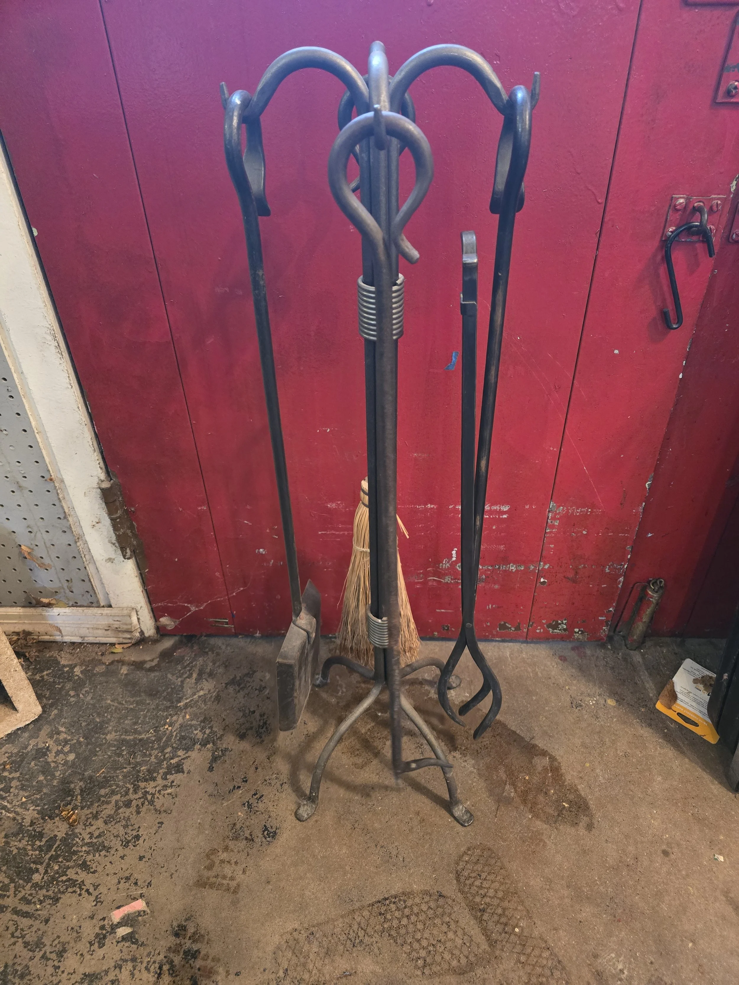 Fireplace tool set. This set includes a broom, shovel, poker, and tongs.