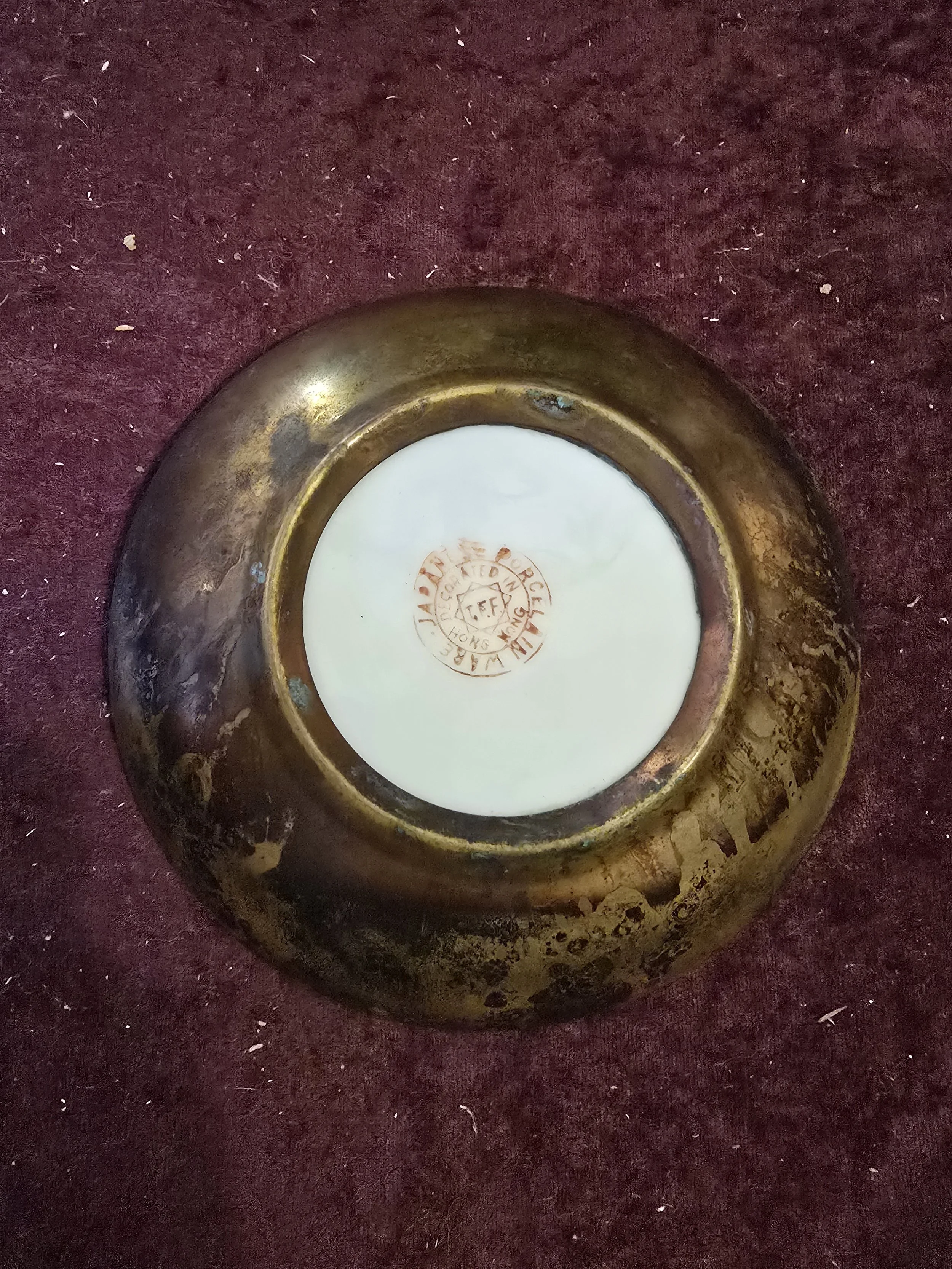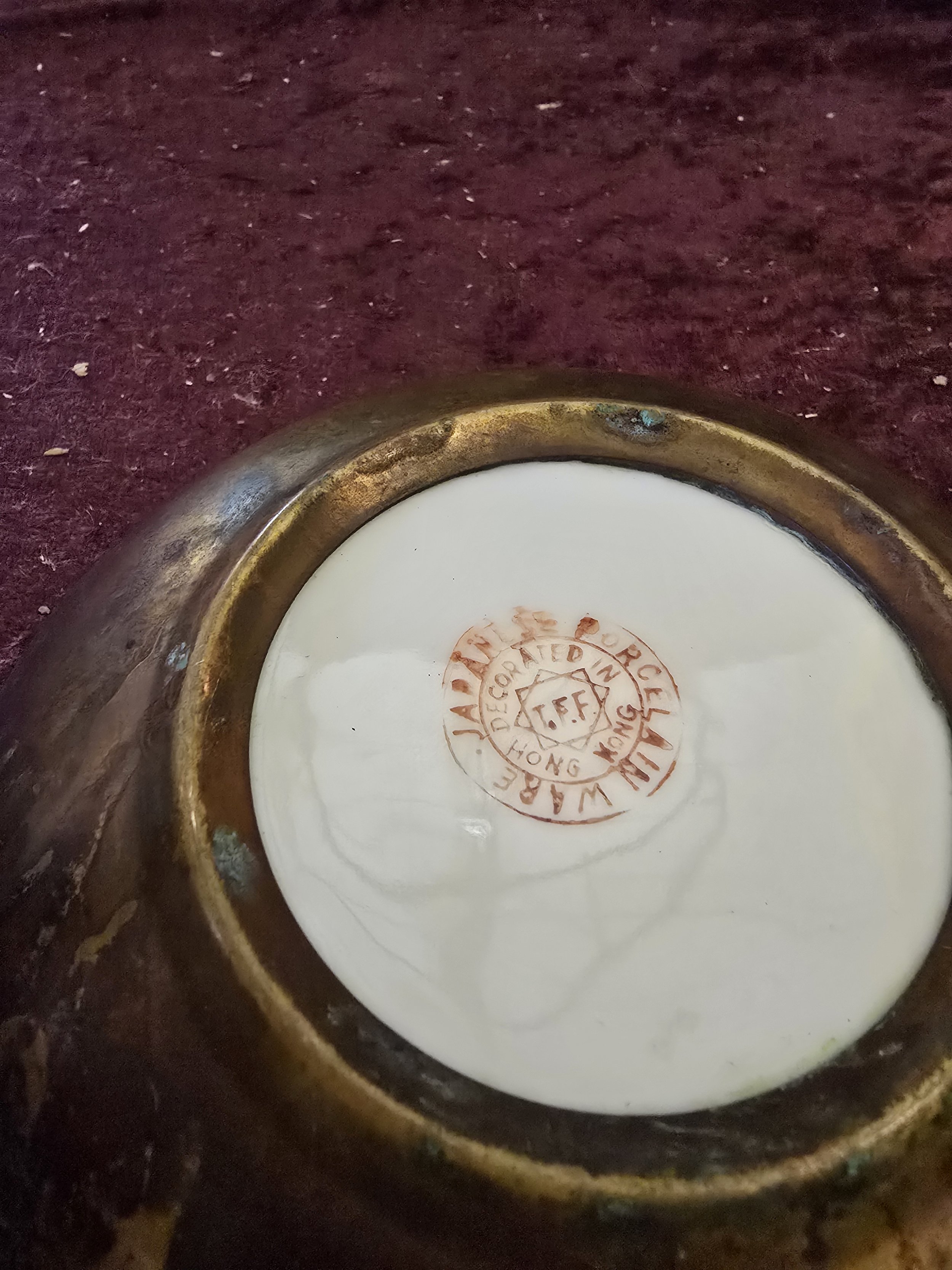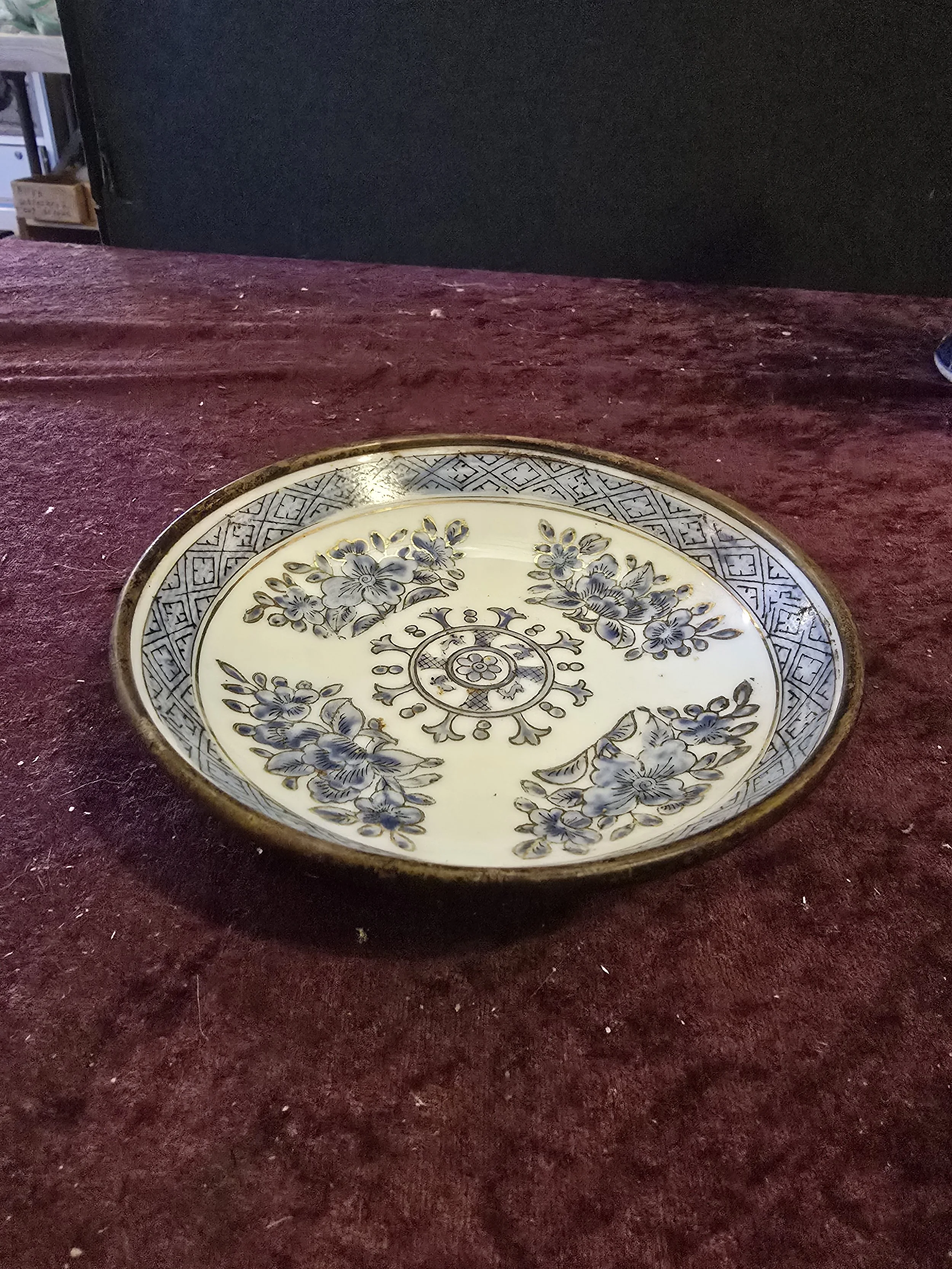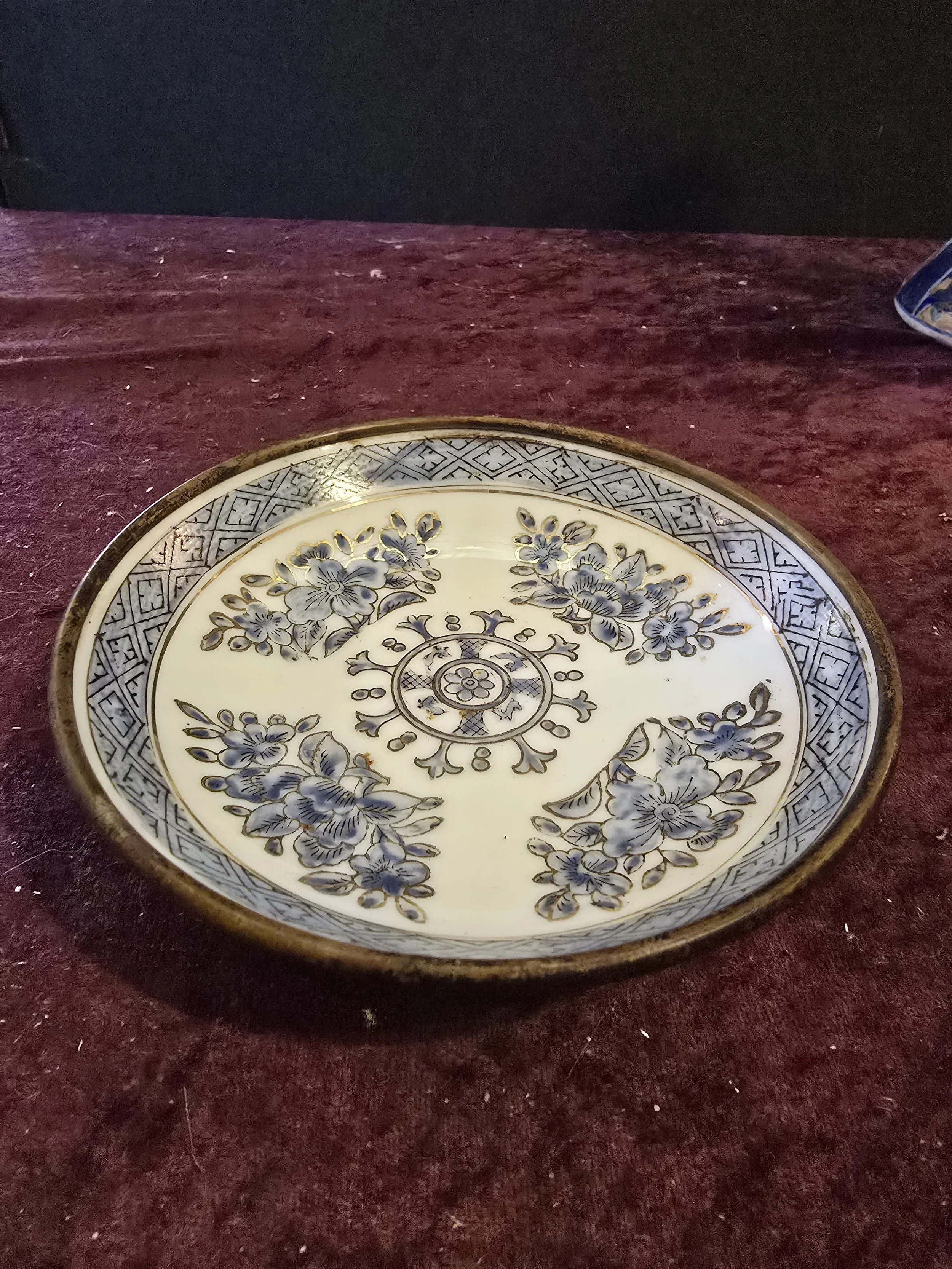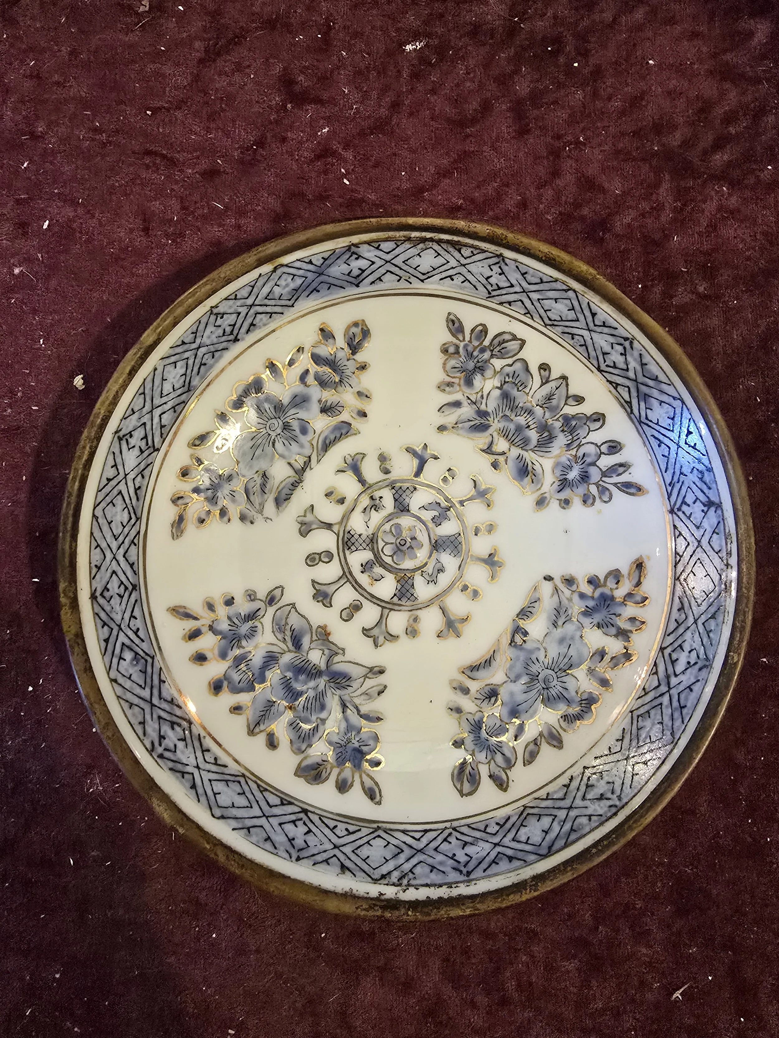 Vintage Japanese blue and white porcelain bowl with gold leaf. The porcelain bowl is wrapped in metal.
