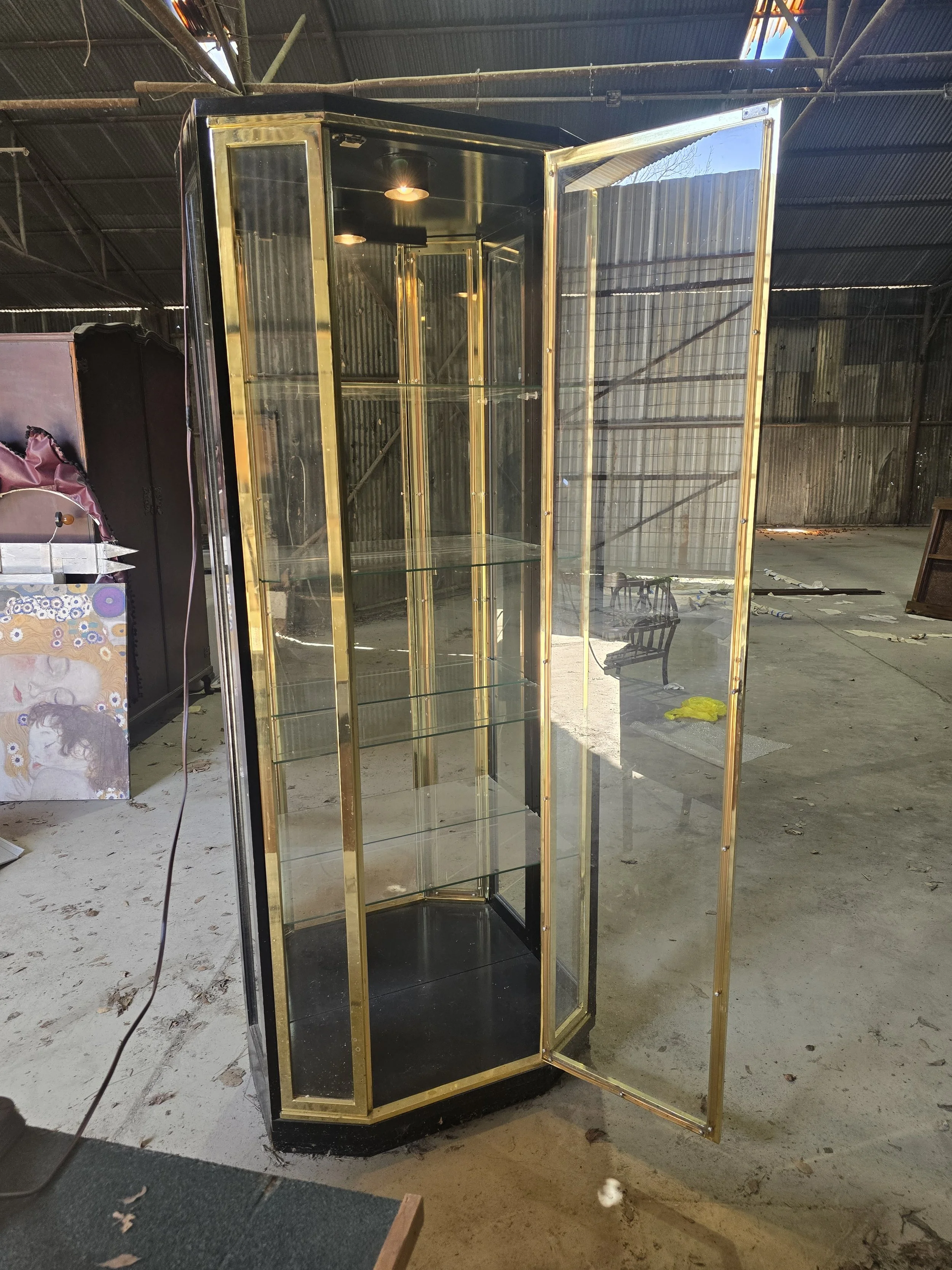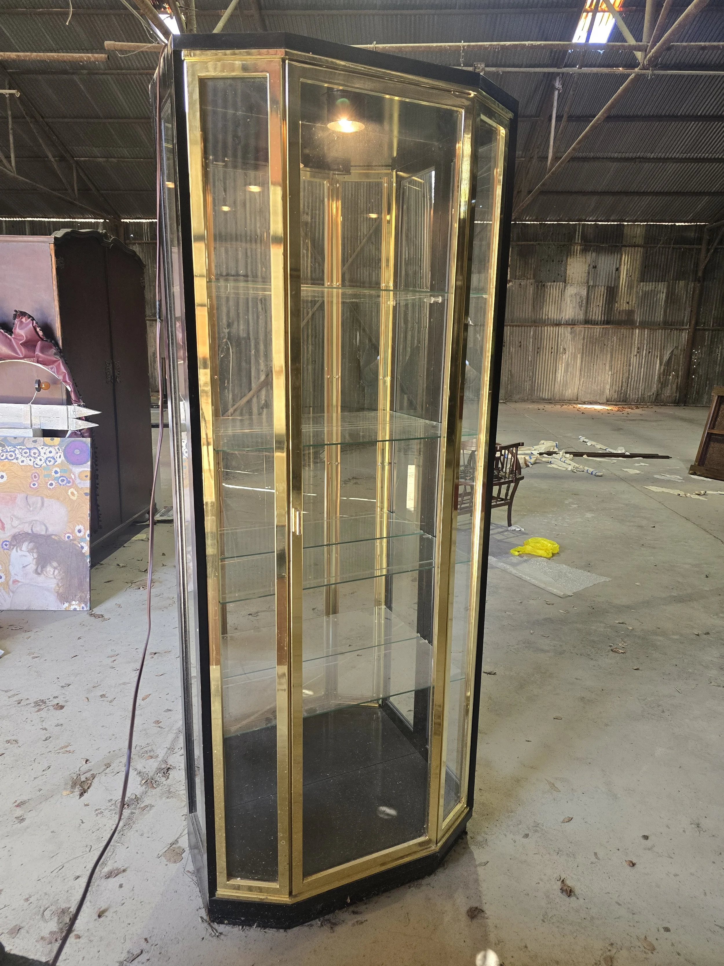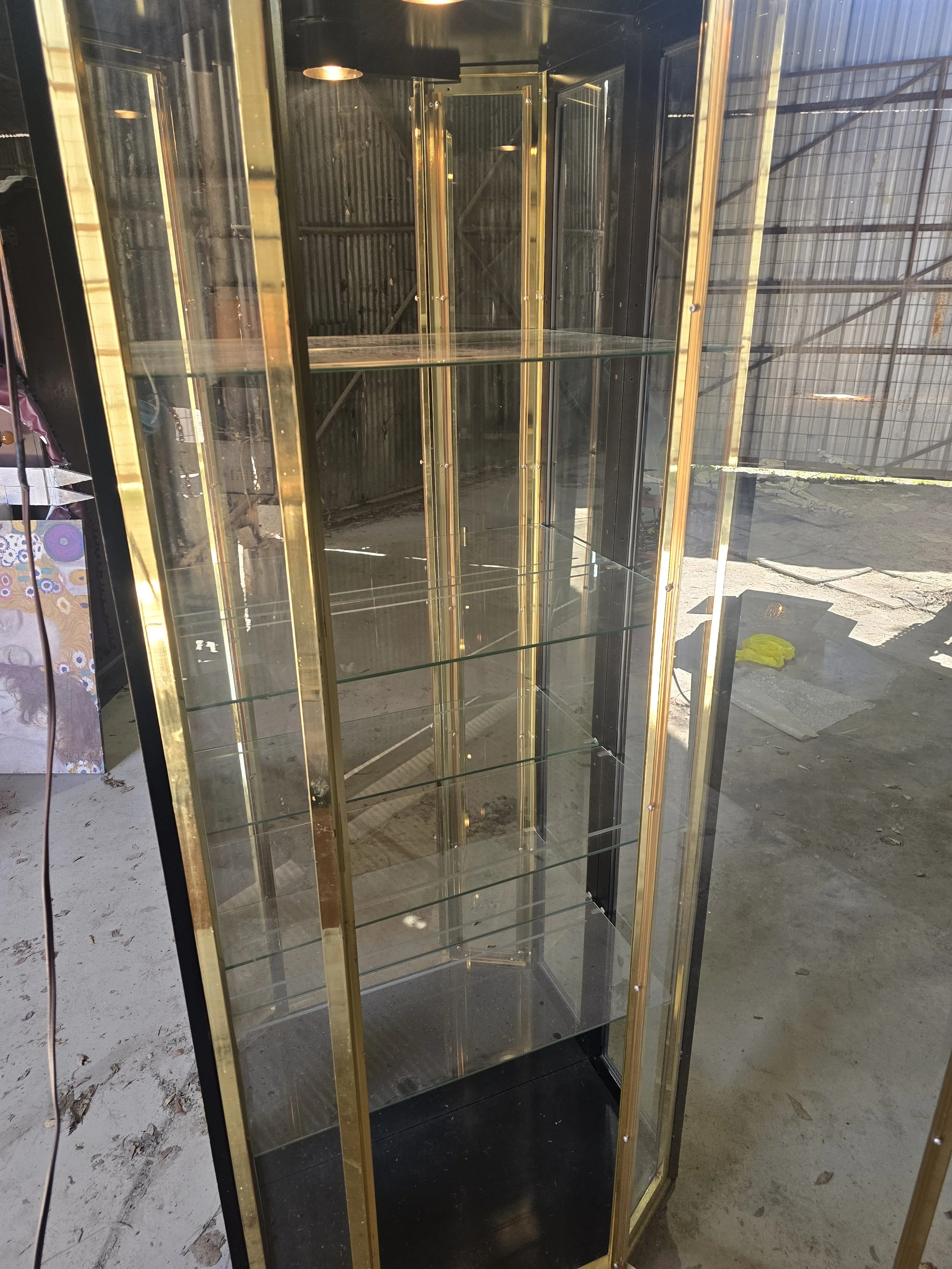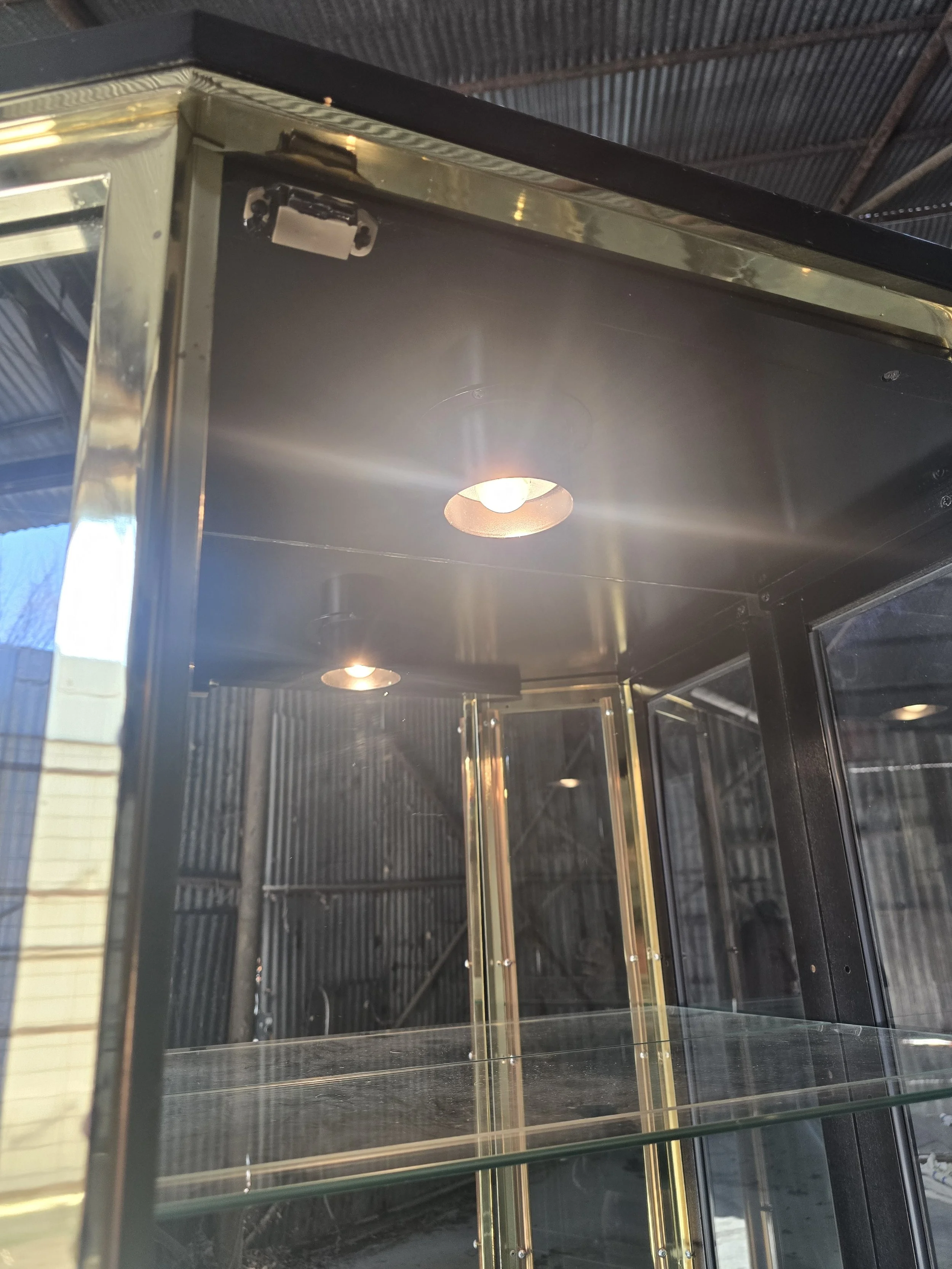 Black lacquer and brass light display cabinet. The light still works and it has all 4 glass shelves. 2 of the shelves have very small chips on the corner. The chips are not visible when the shelves are in.