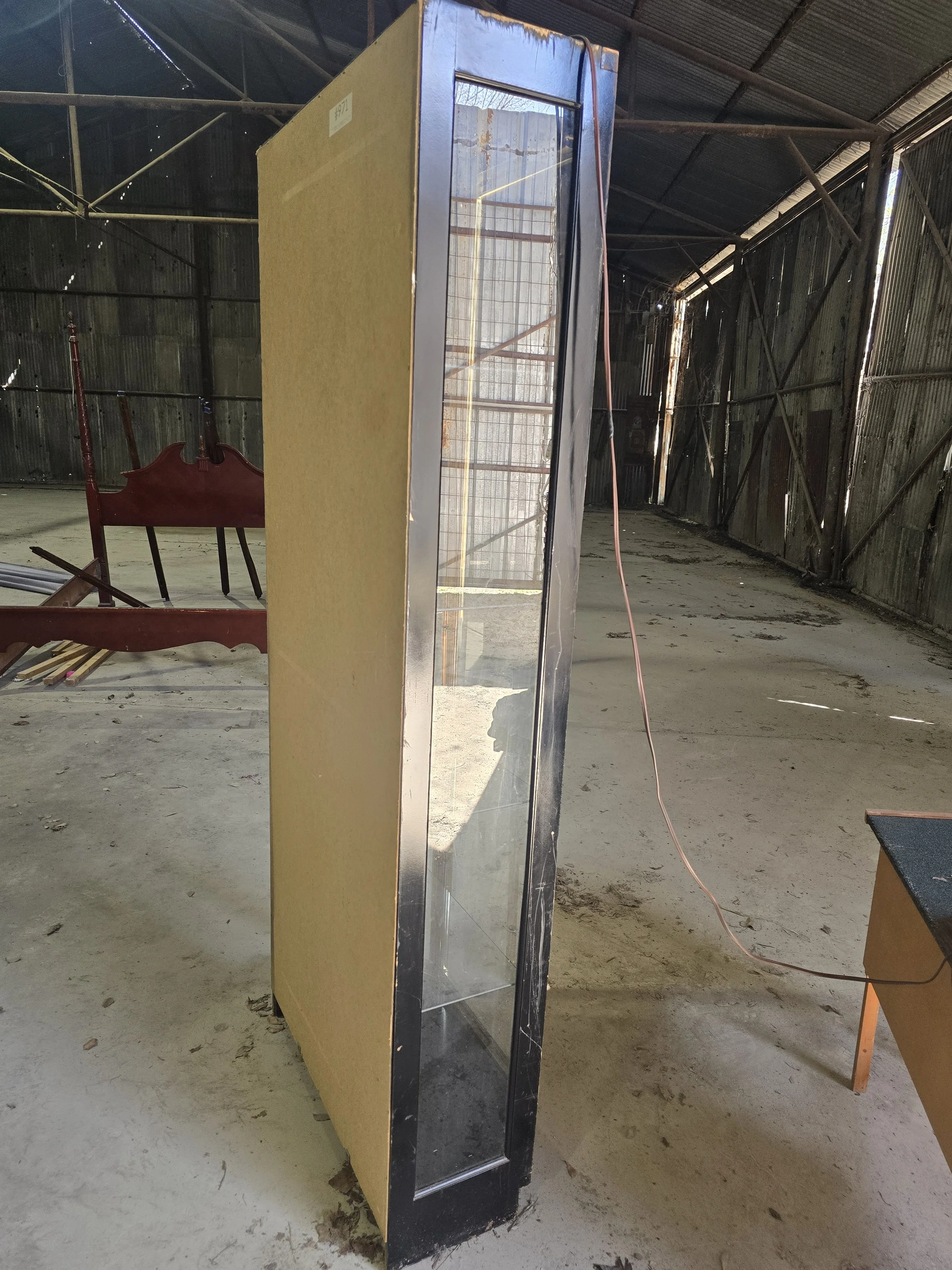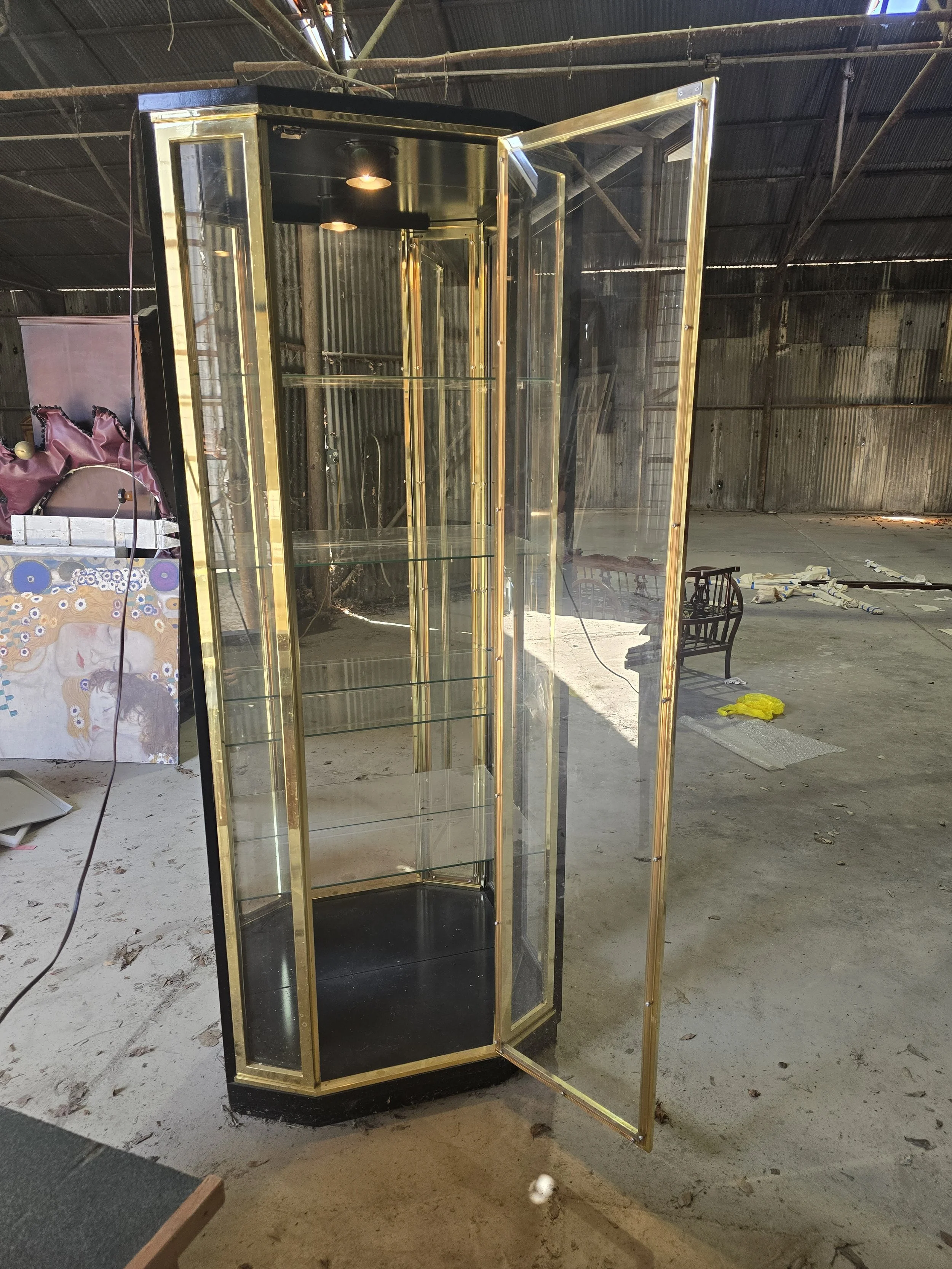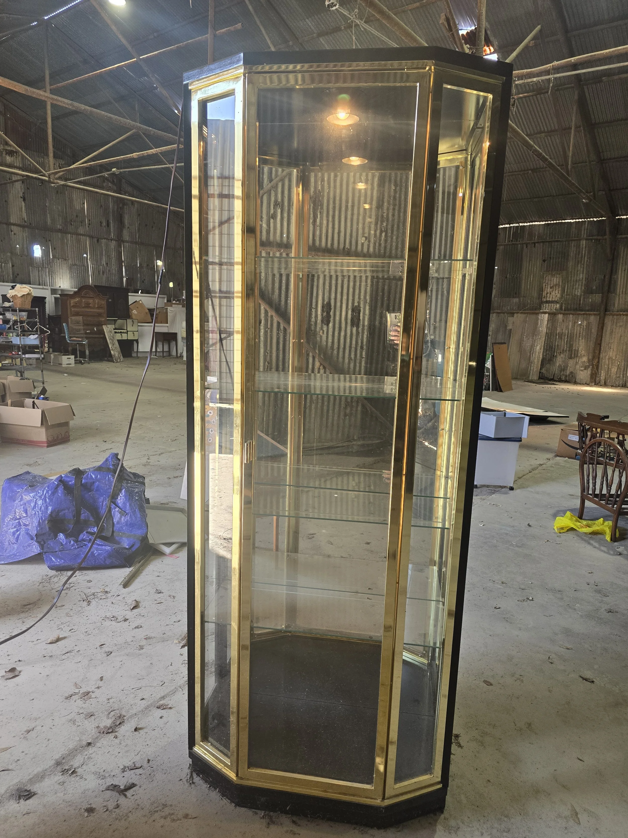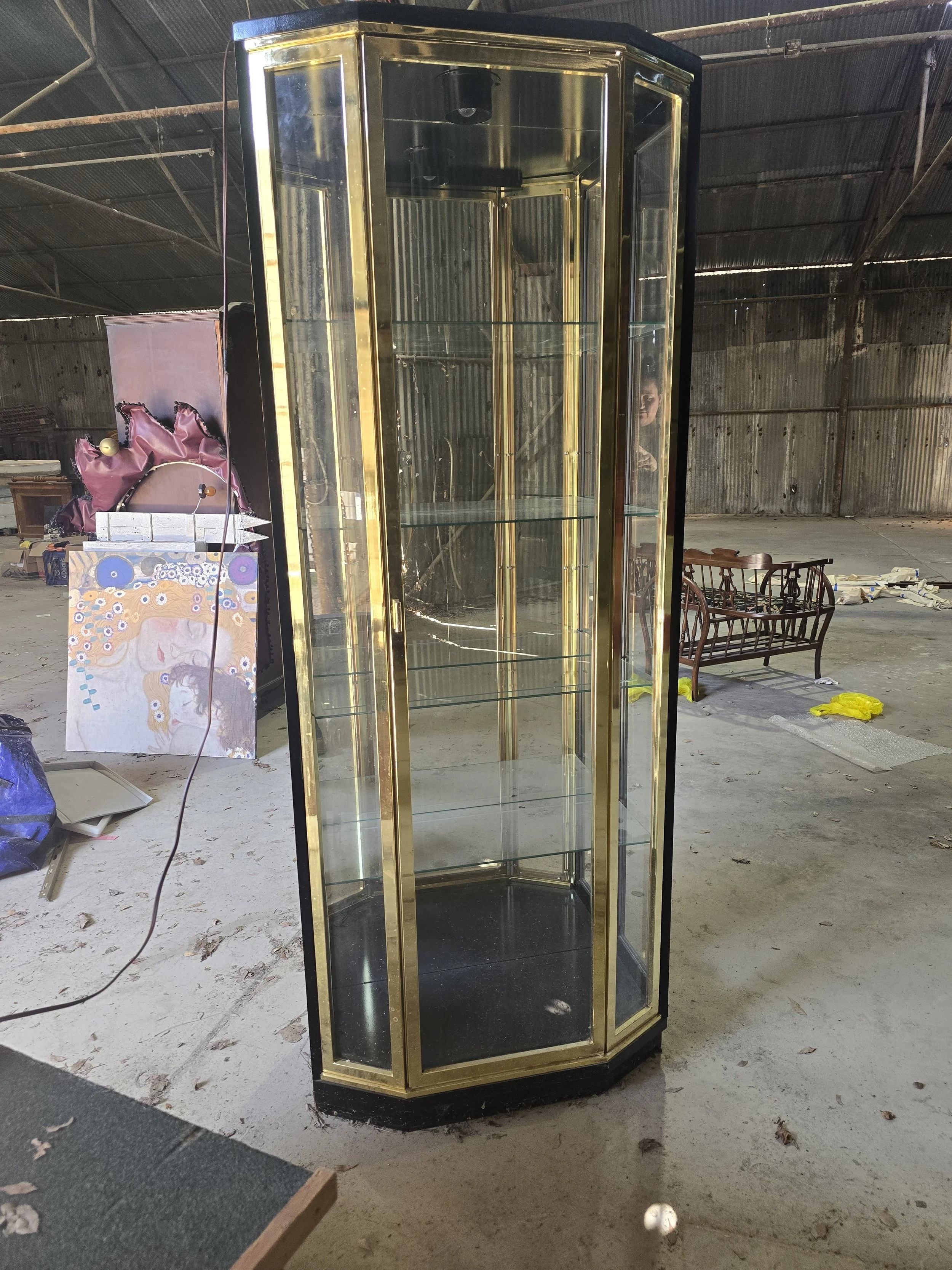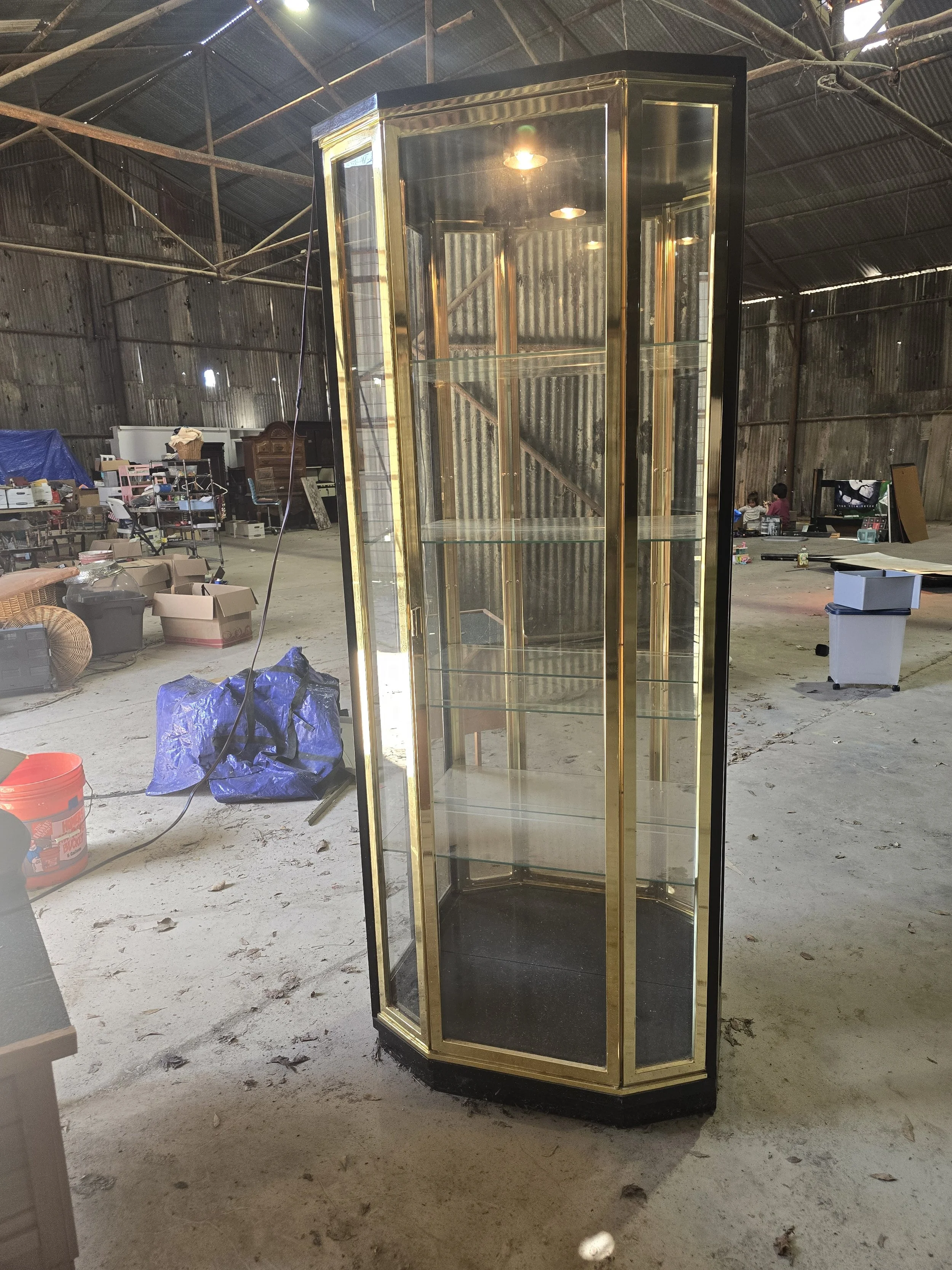 Black lacquer and brass light display cabinet. The light still works and it has all 4 glass shelves. 2 of the shelves have very small chips on the corner. The chips are not visible when the shelves are in.