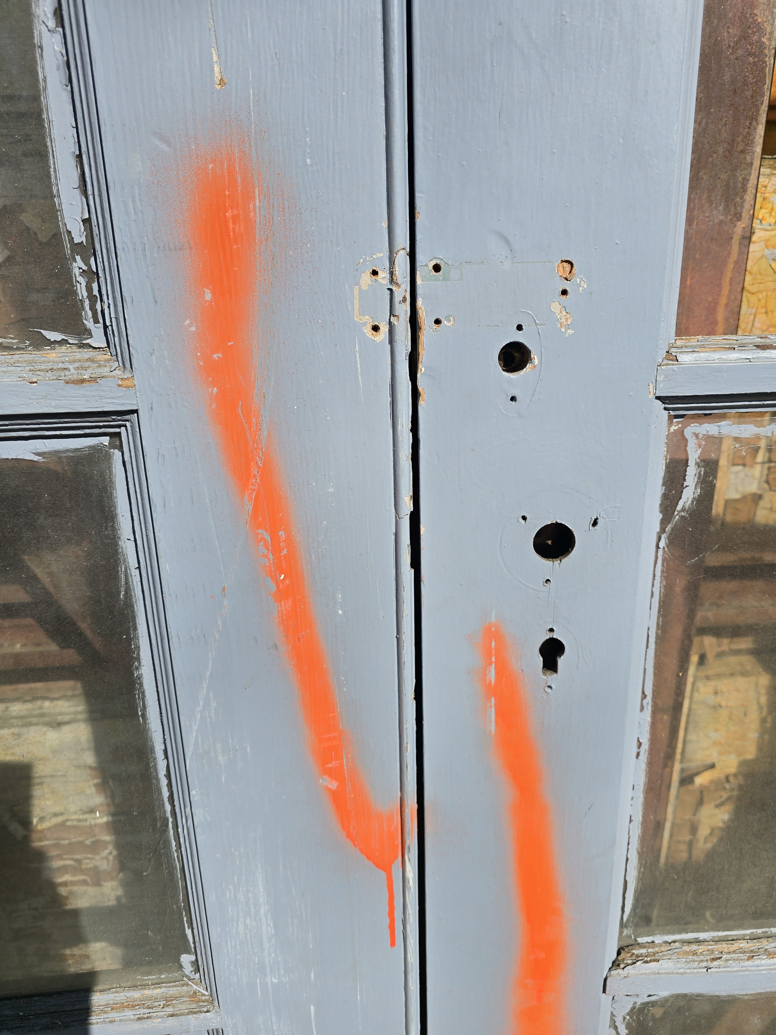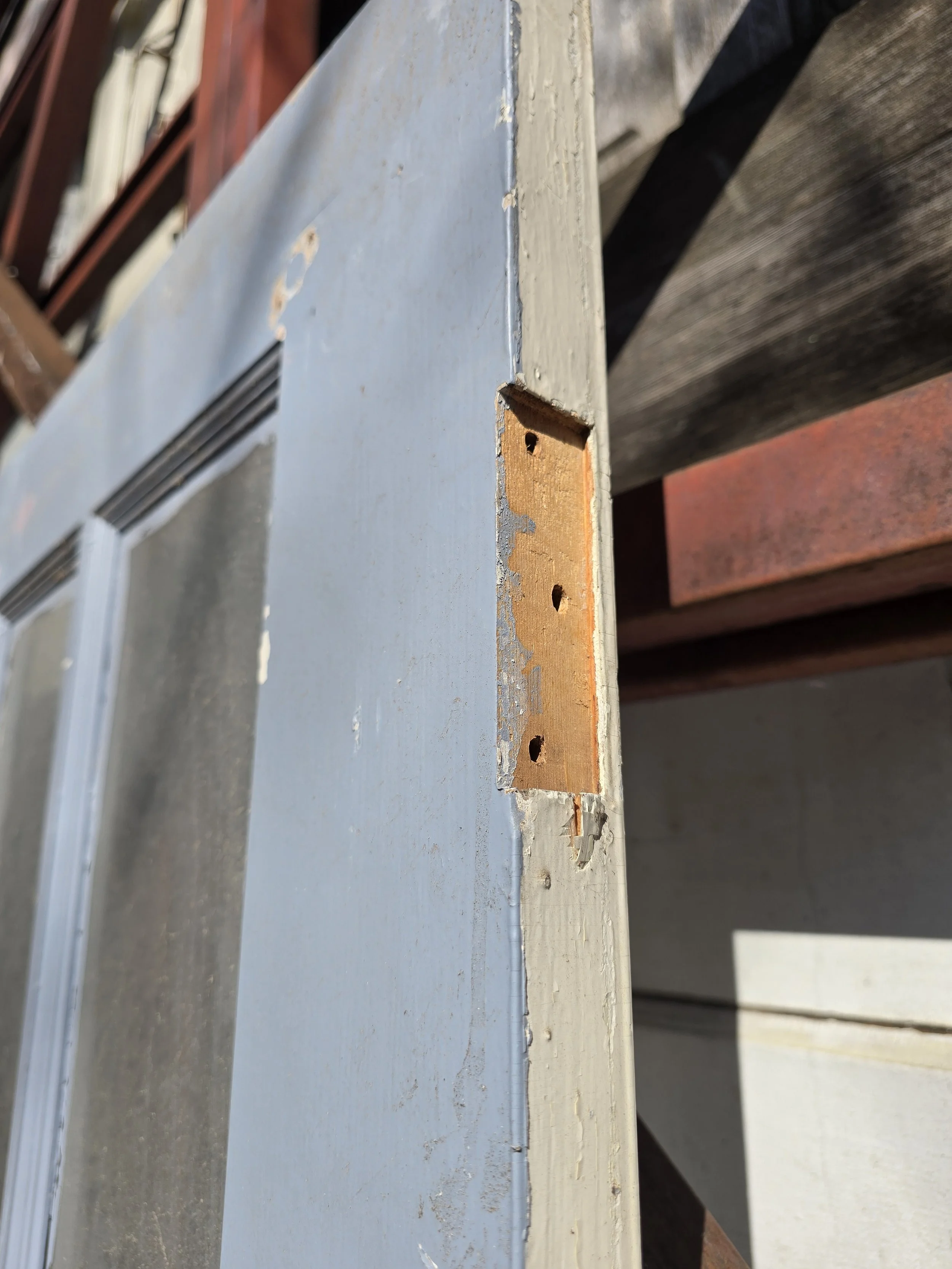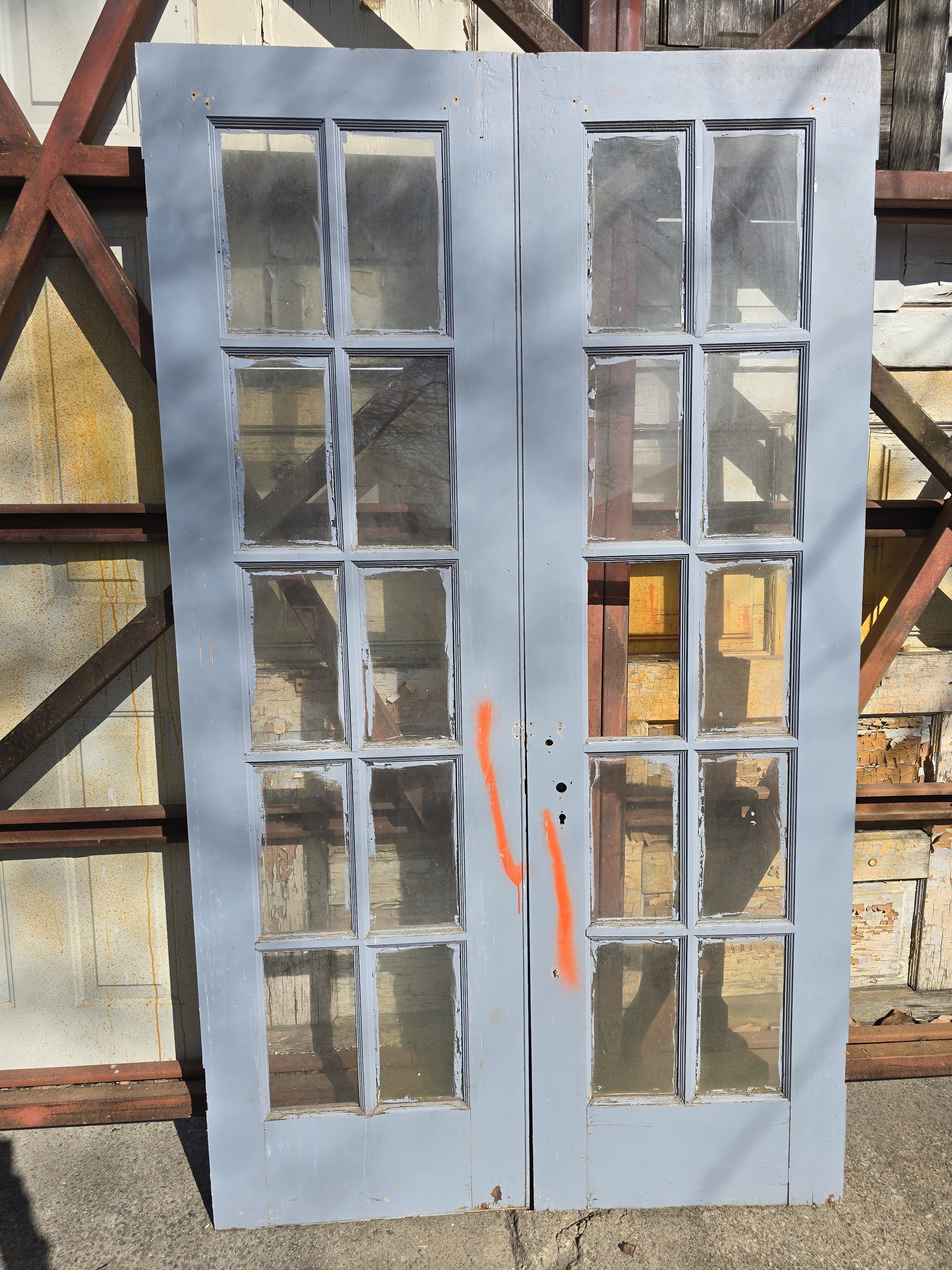 Pair of antique french doors. They are technically exterior, but would work for interior due to their thickness. Overall the doors are in pretty good shape. One door is missing one pane, which we could replace for an additional $75. Just contact us if you would like us to replace the pane once you purchase the doors.