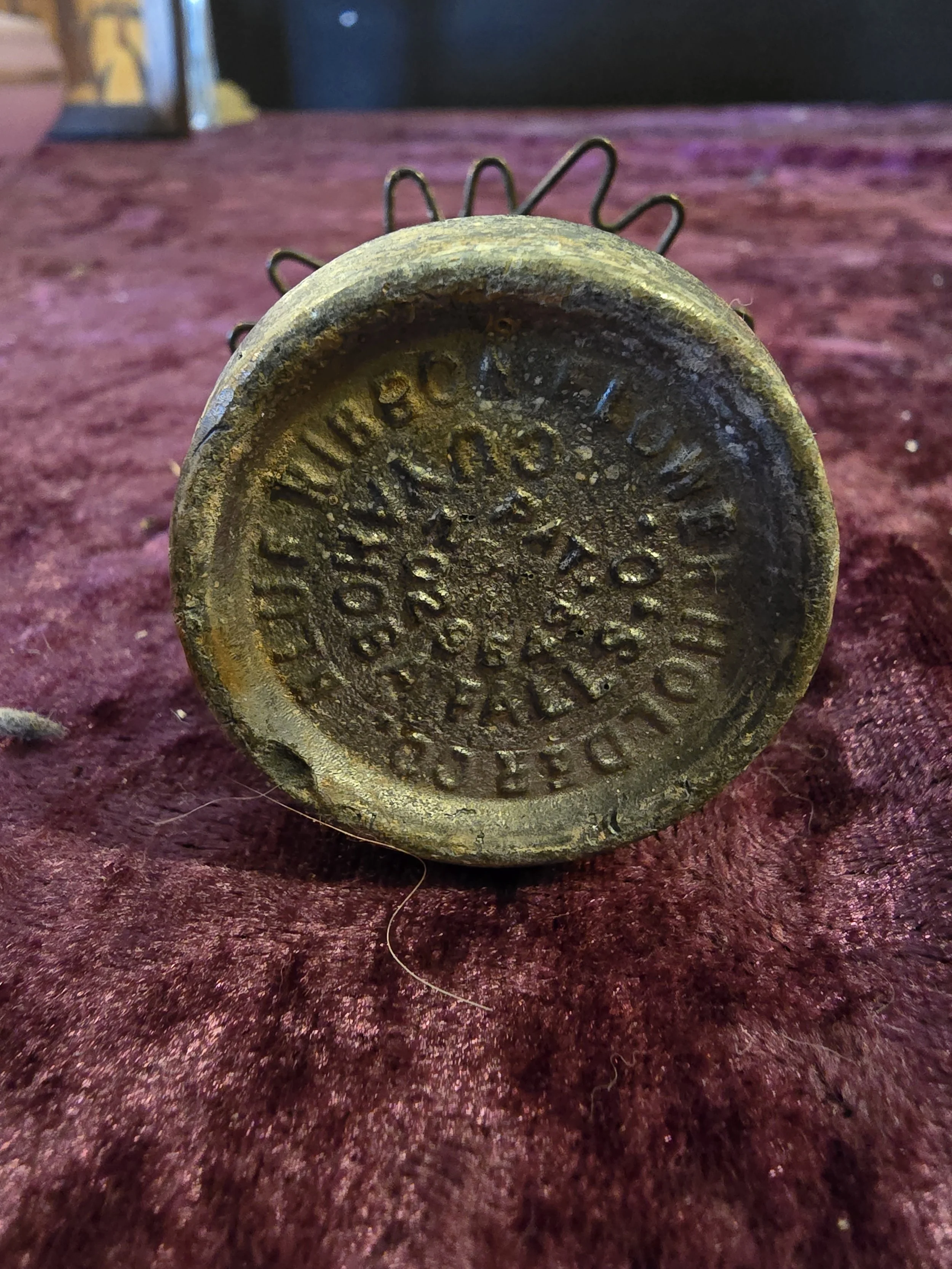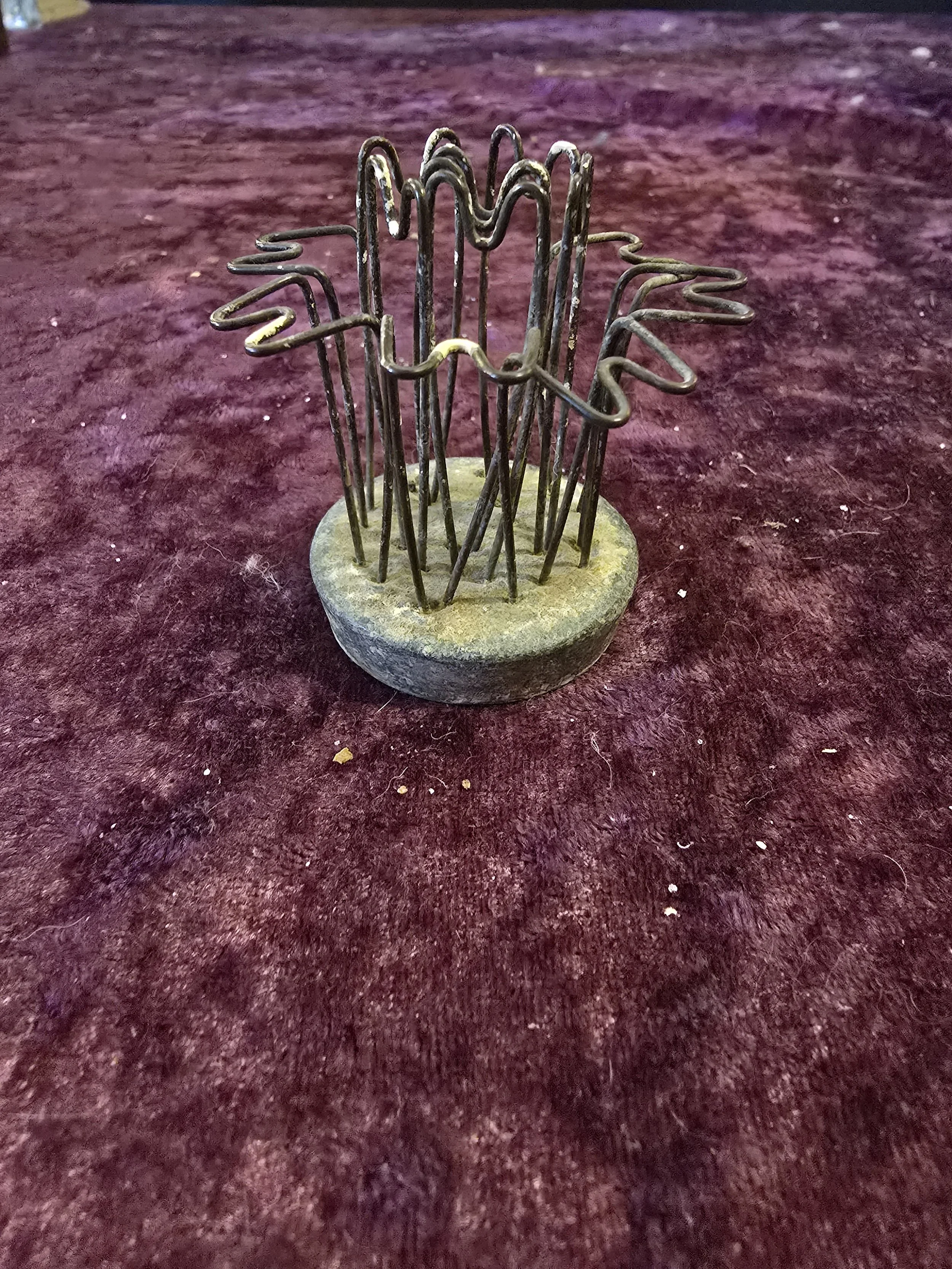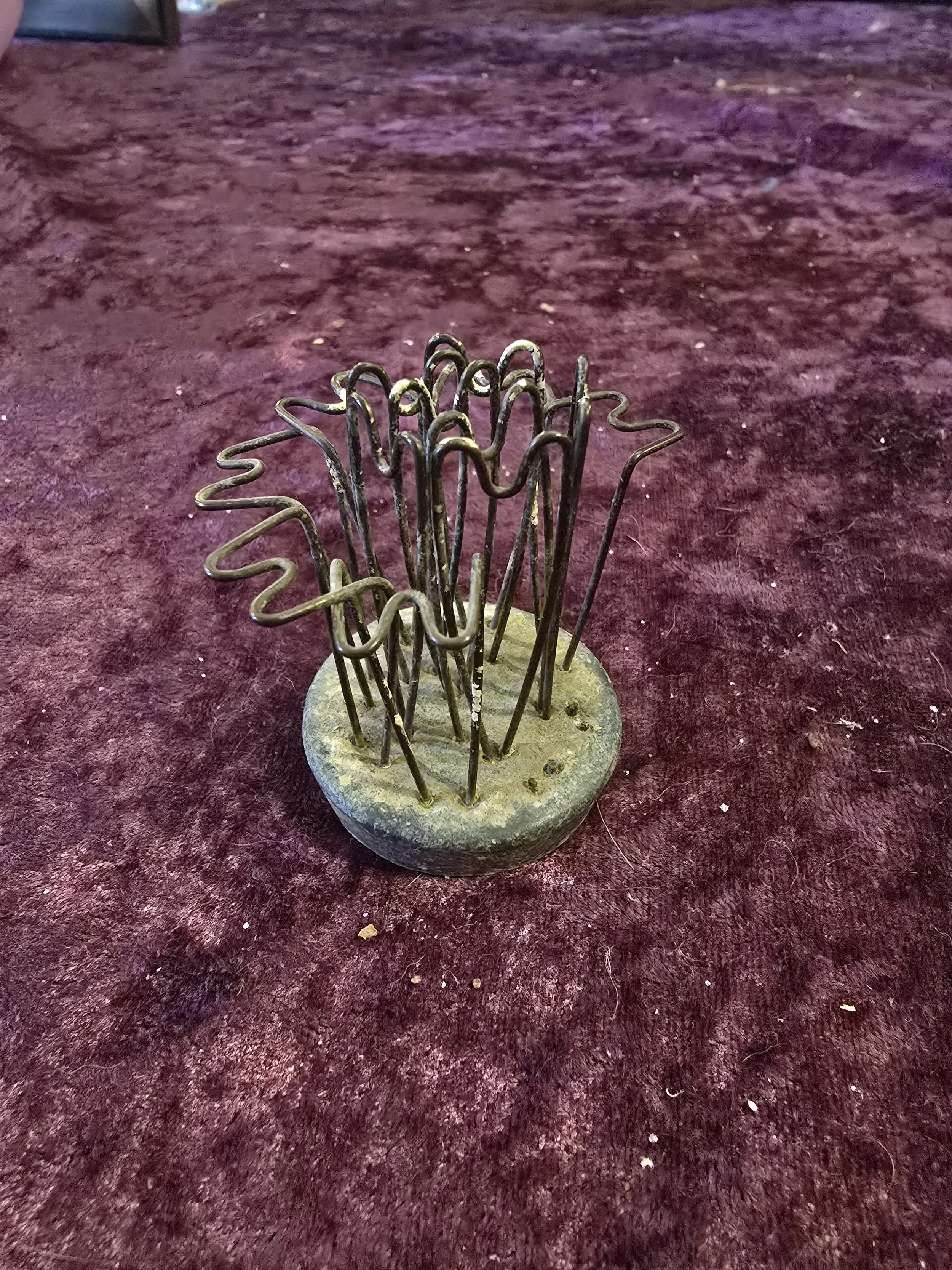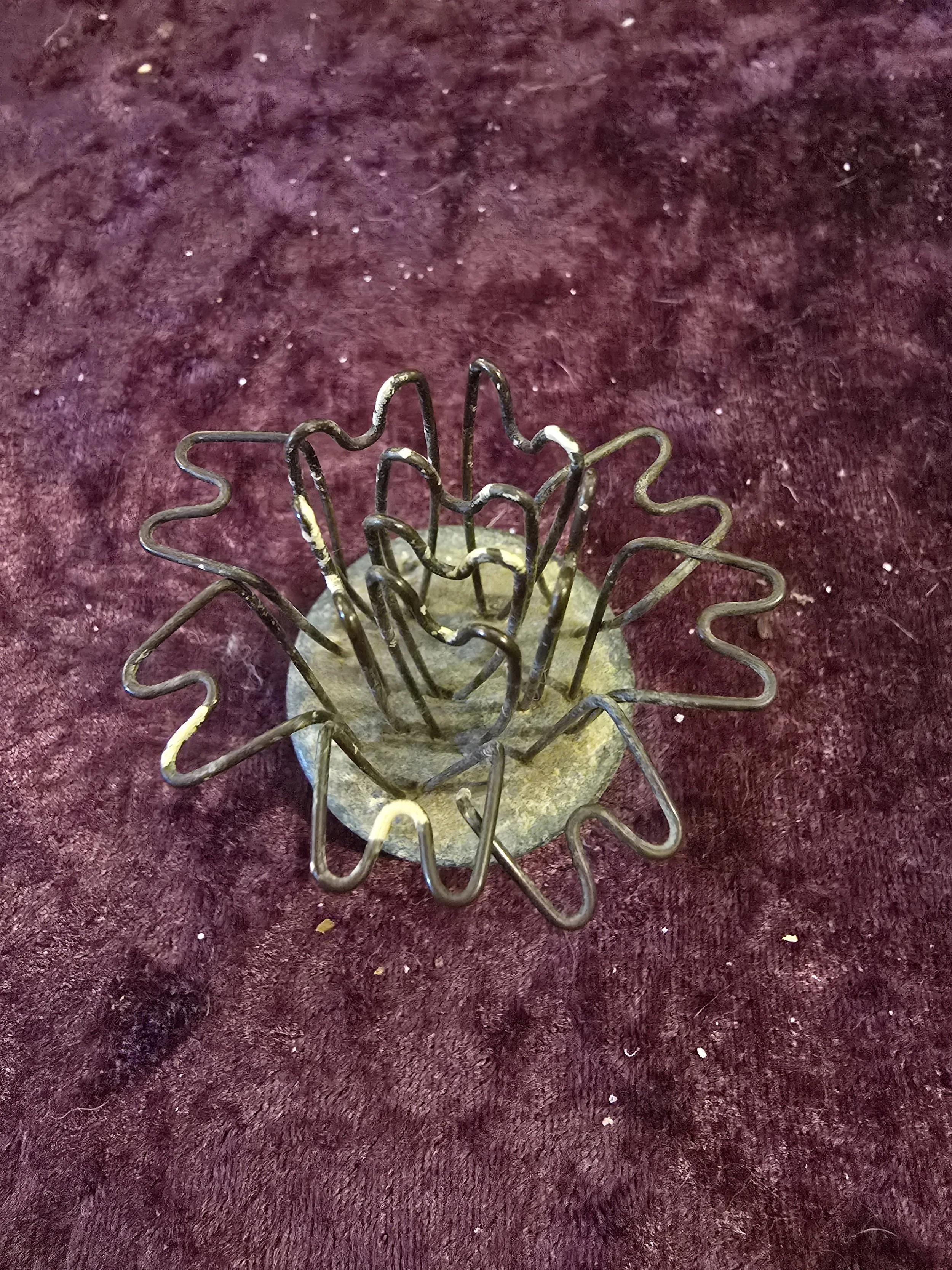 Small metal blue ribbon floral frog. Designed to improve your floral arrangements. There are a couple prongs missing.