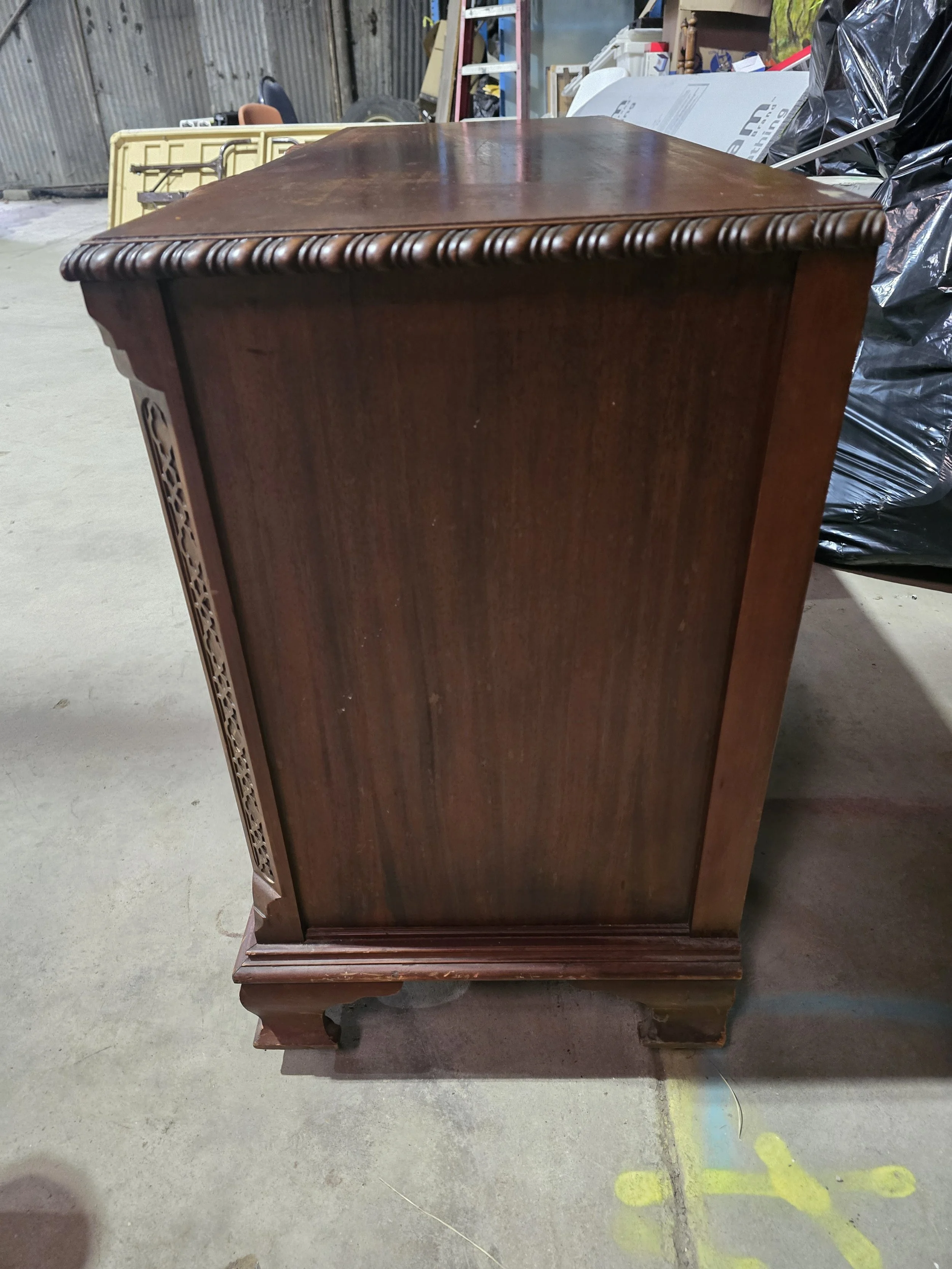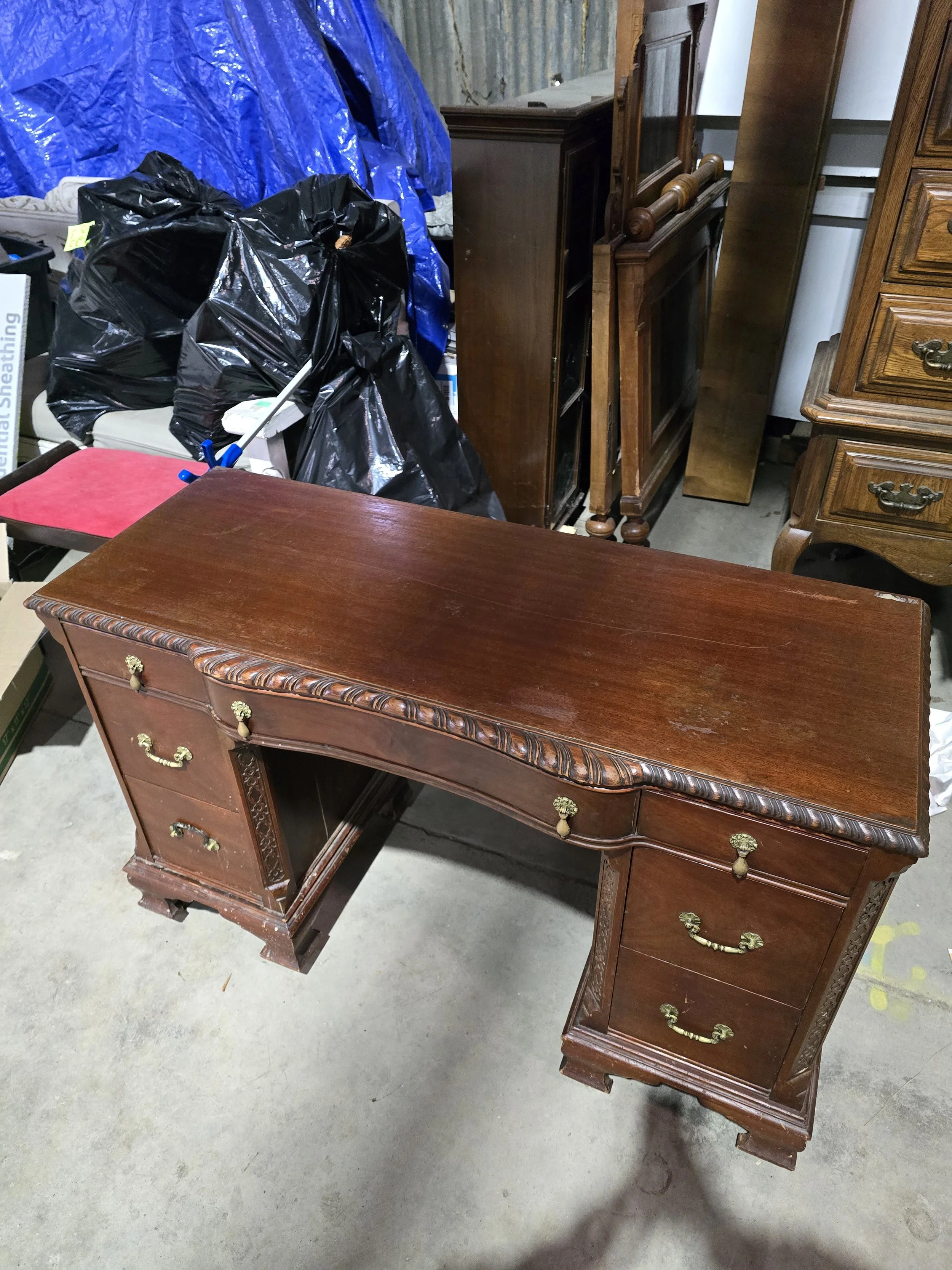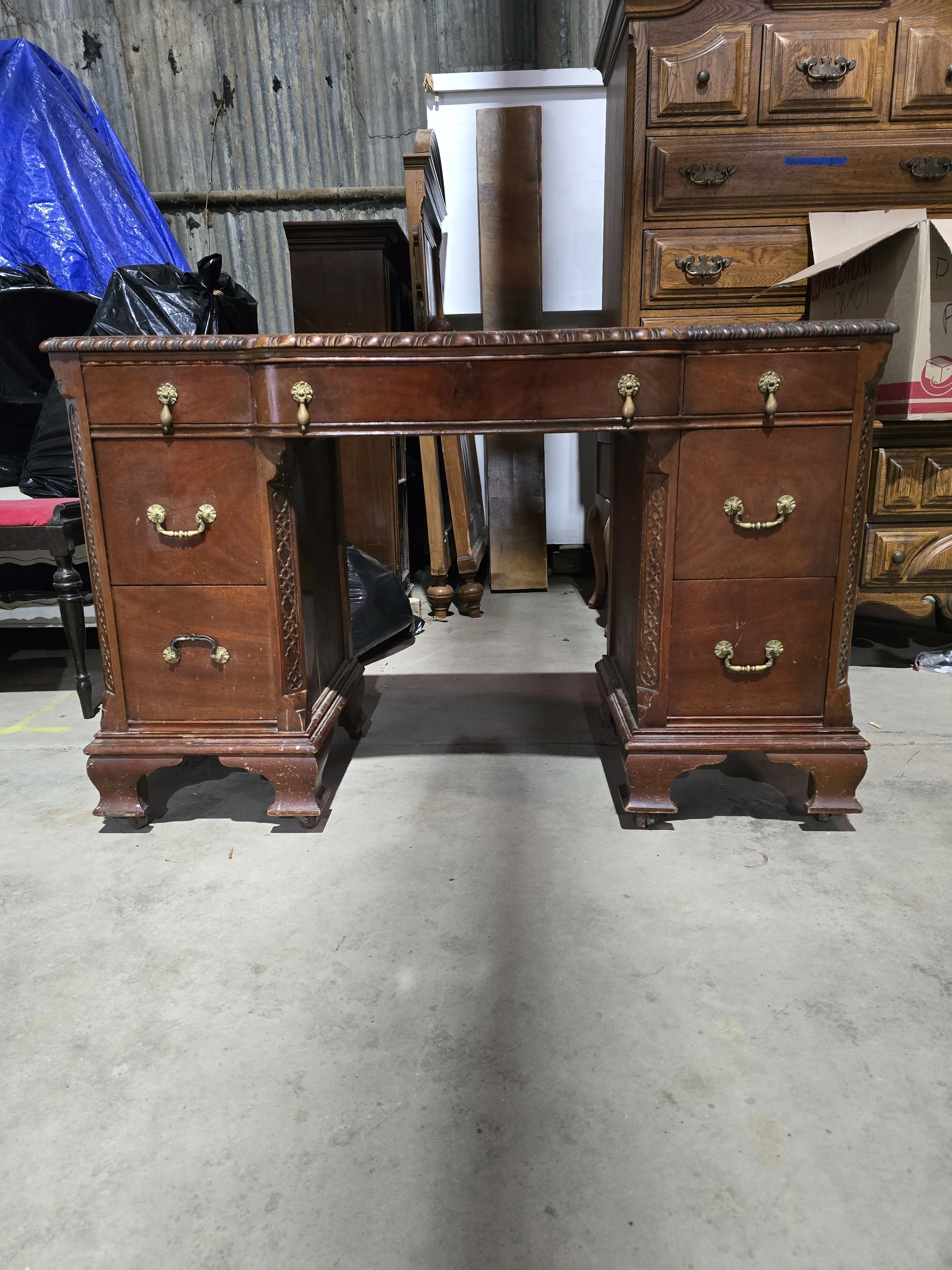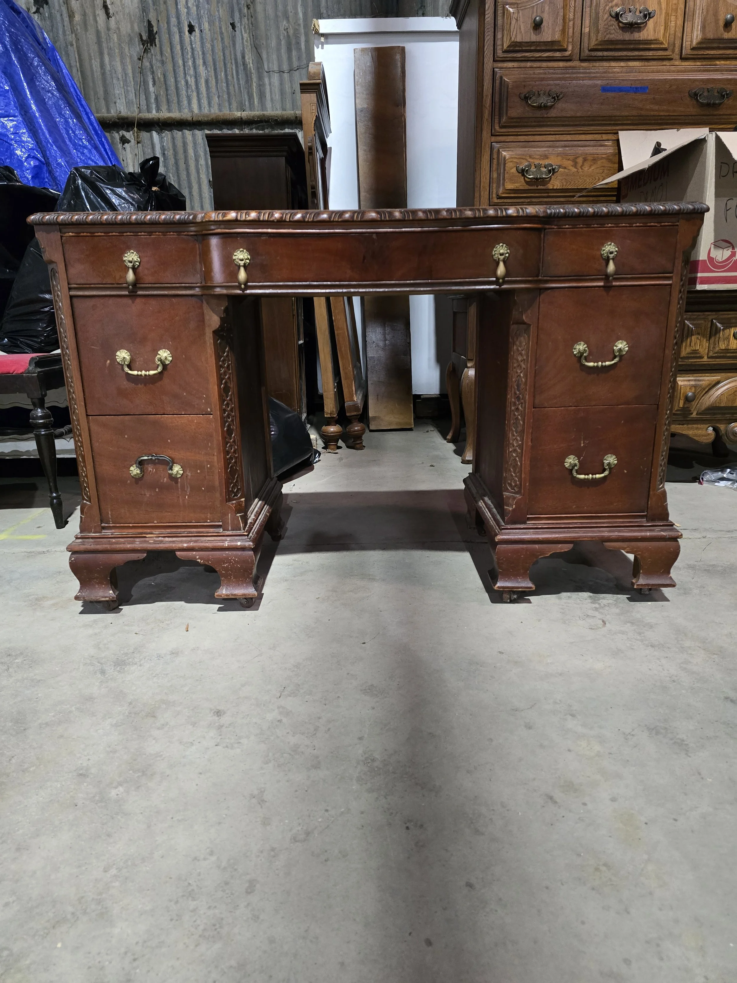 Gorgeous Chippendale style desk with brass hardware. I love the brass drop pulls. The desk is in very good condition, the top could use a little clean up, but even if it is not bad.