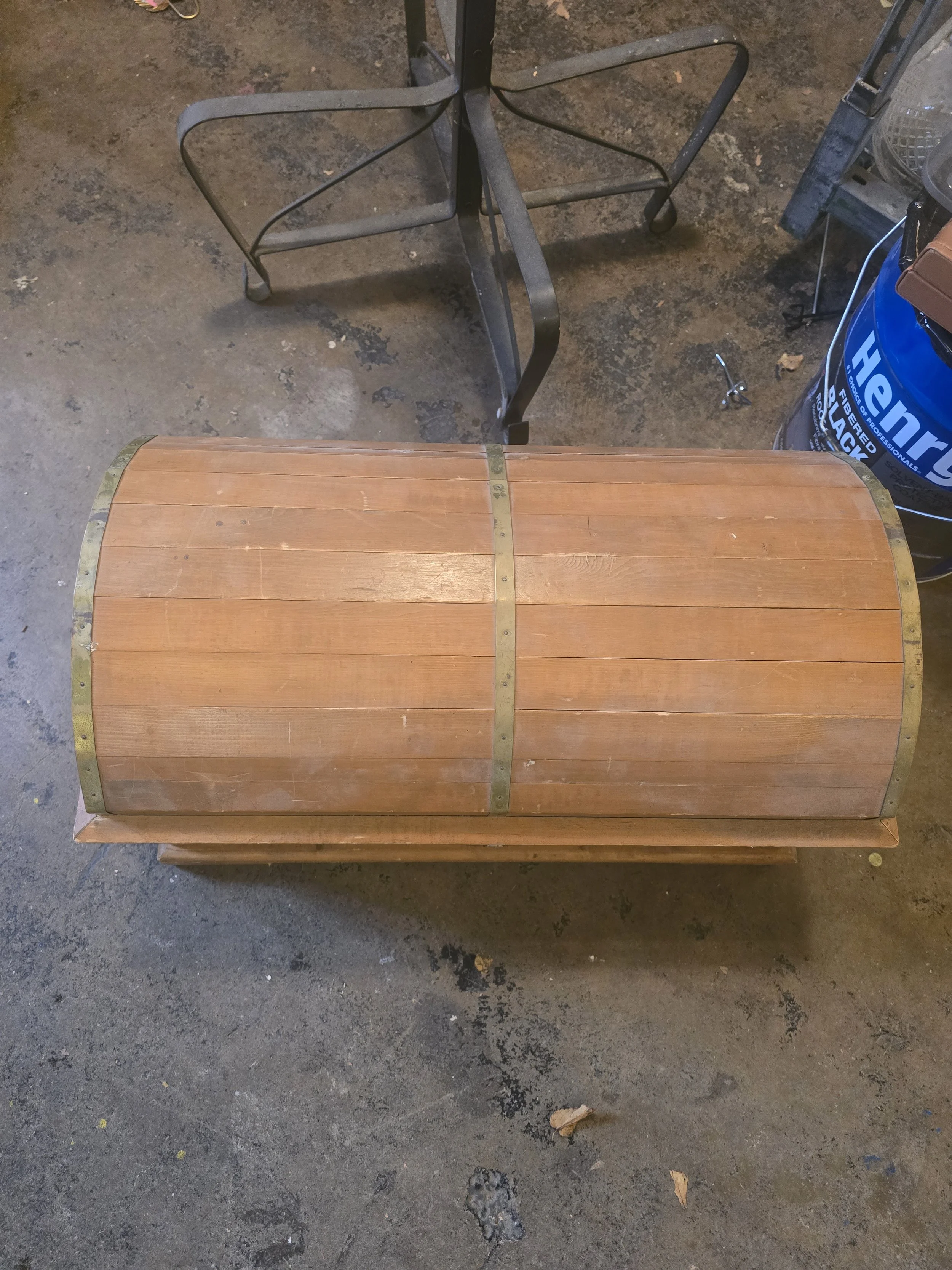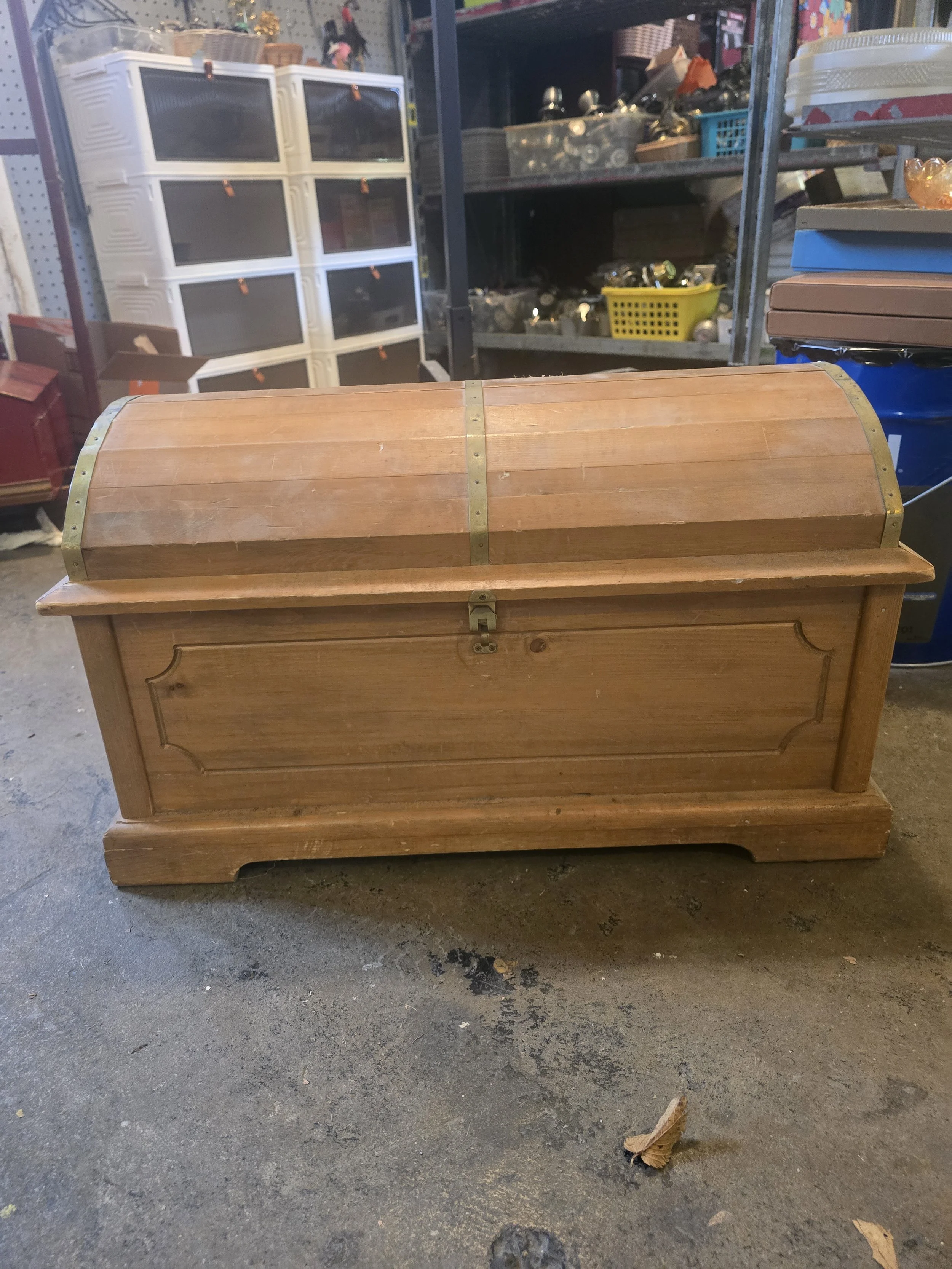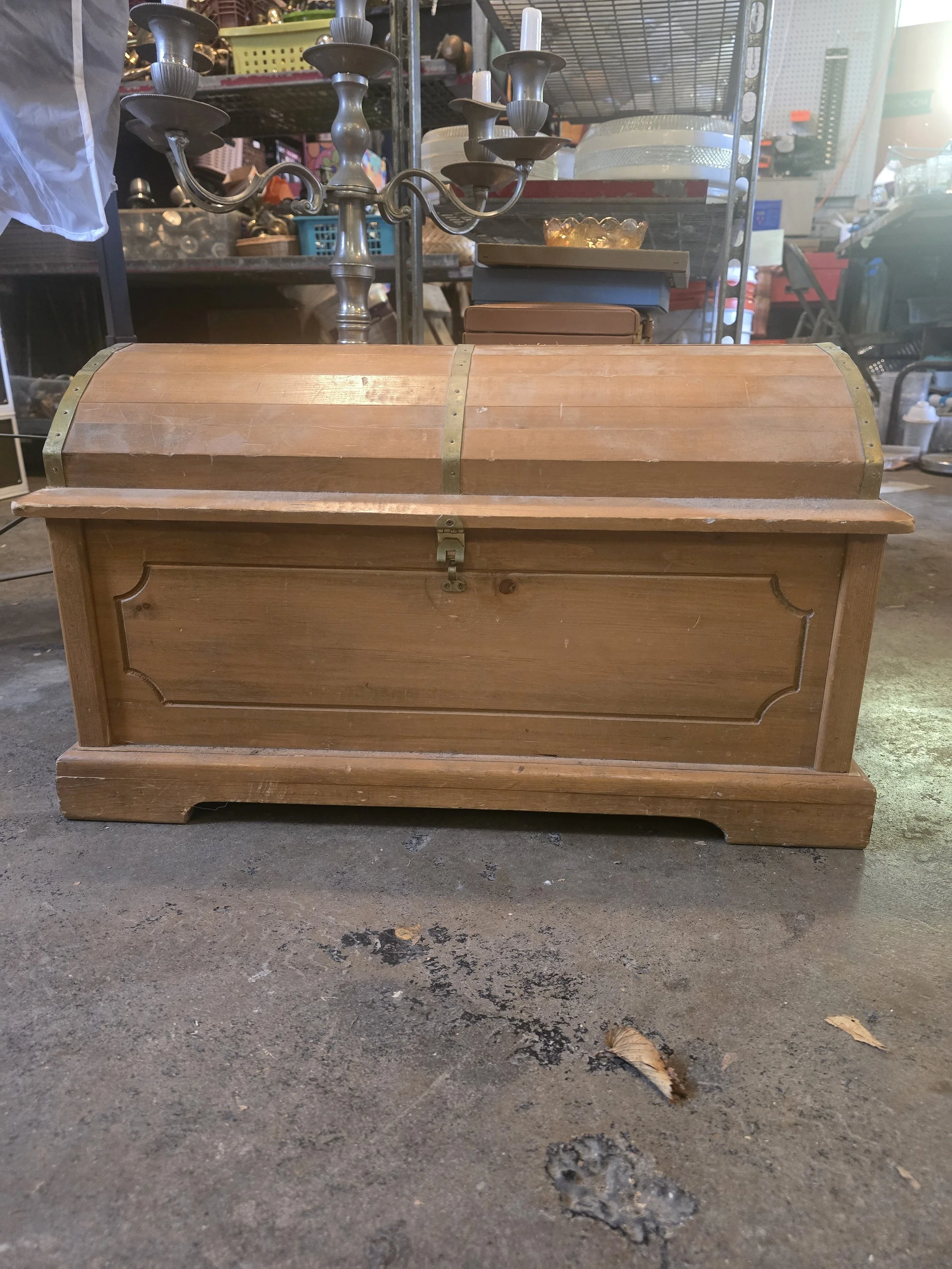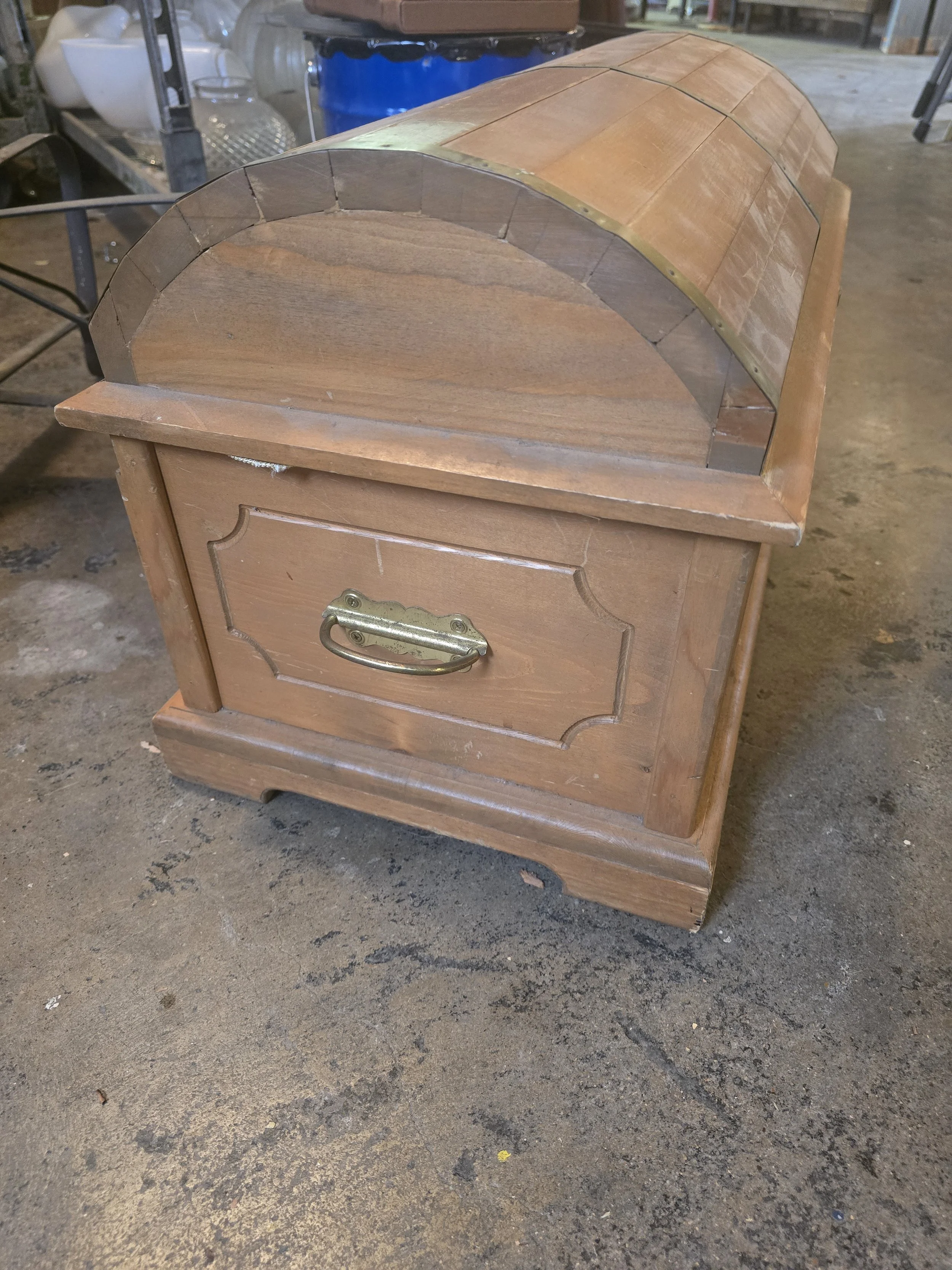 Solid wood and handmade barrel chest. This chest has brass bands around the top and 2 brass handles on the side. It is in great condition.