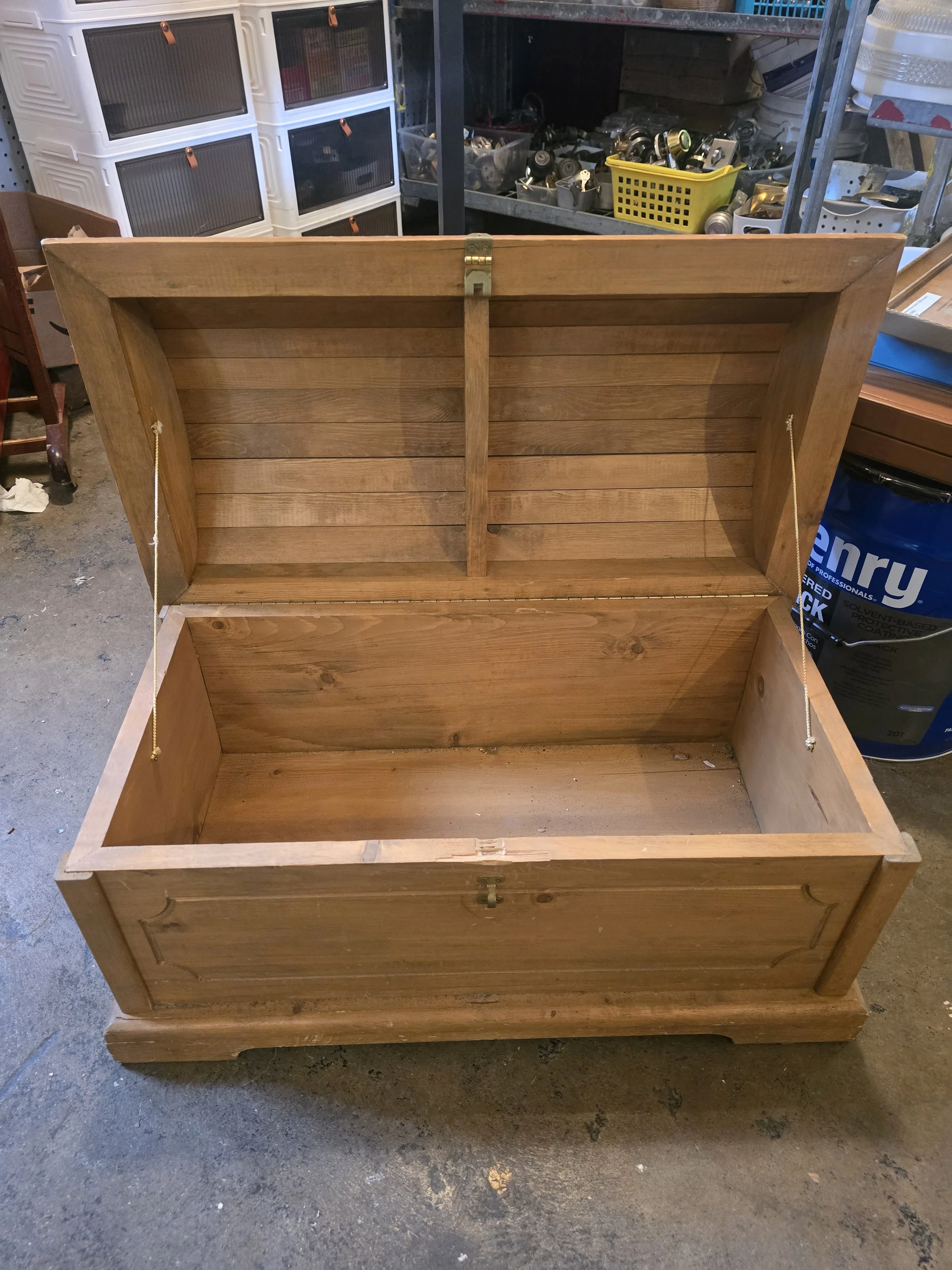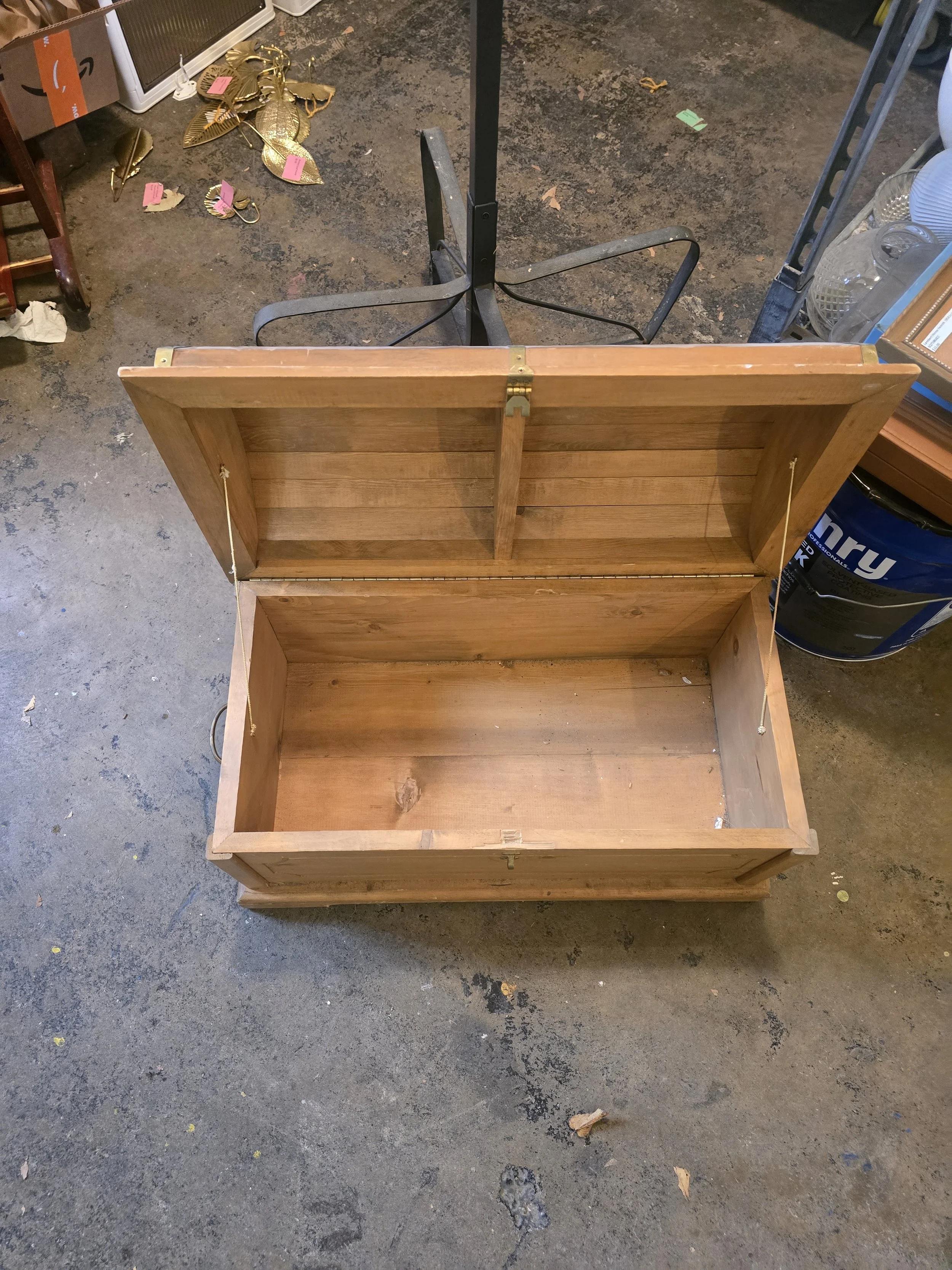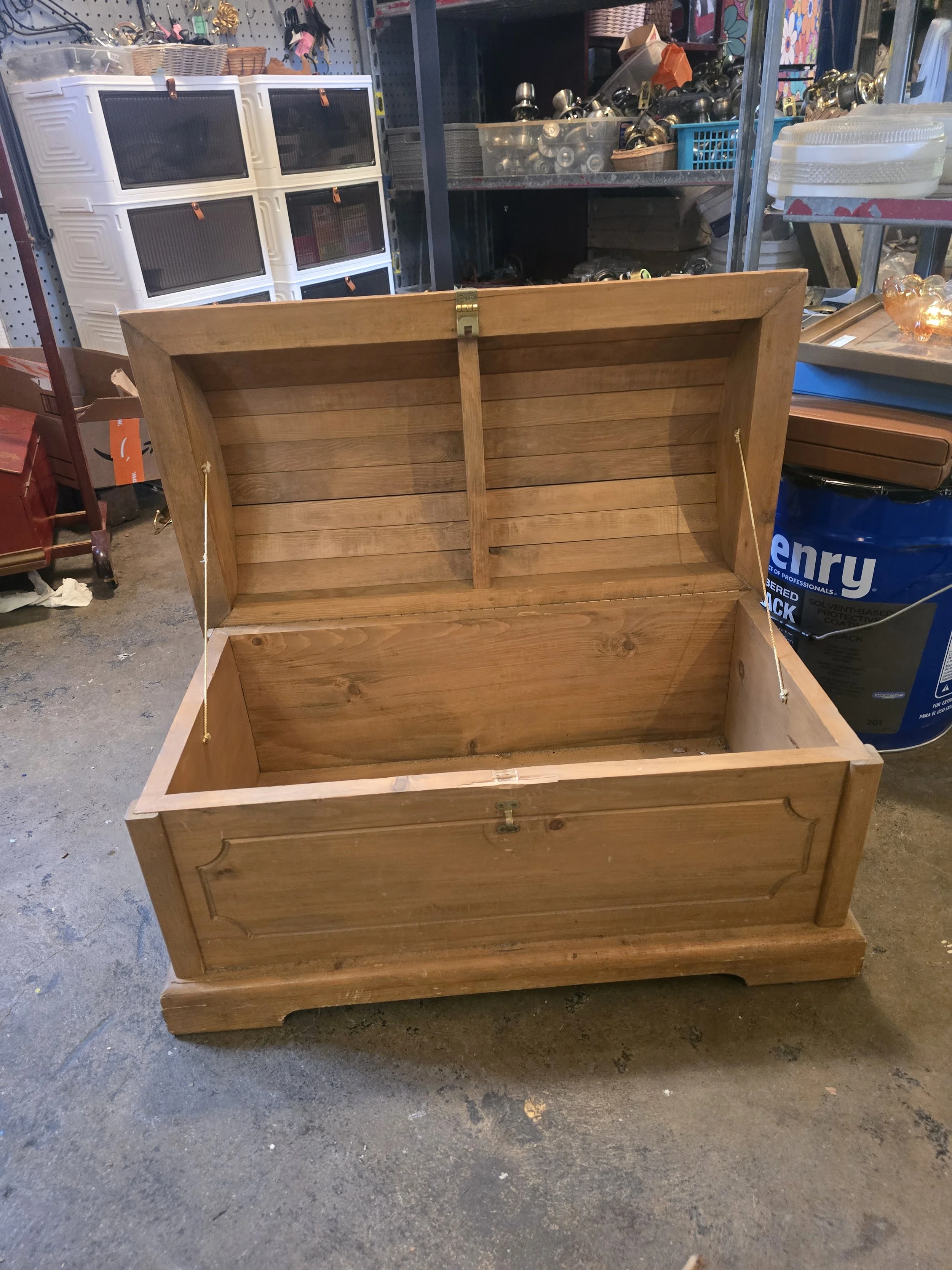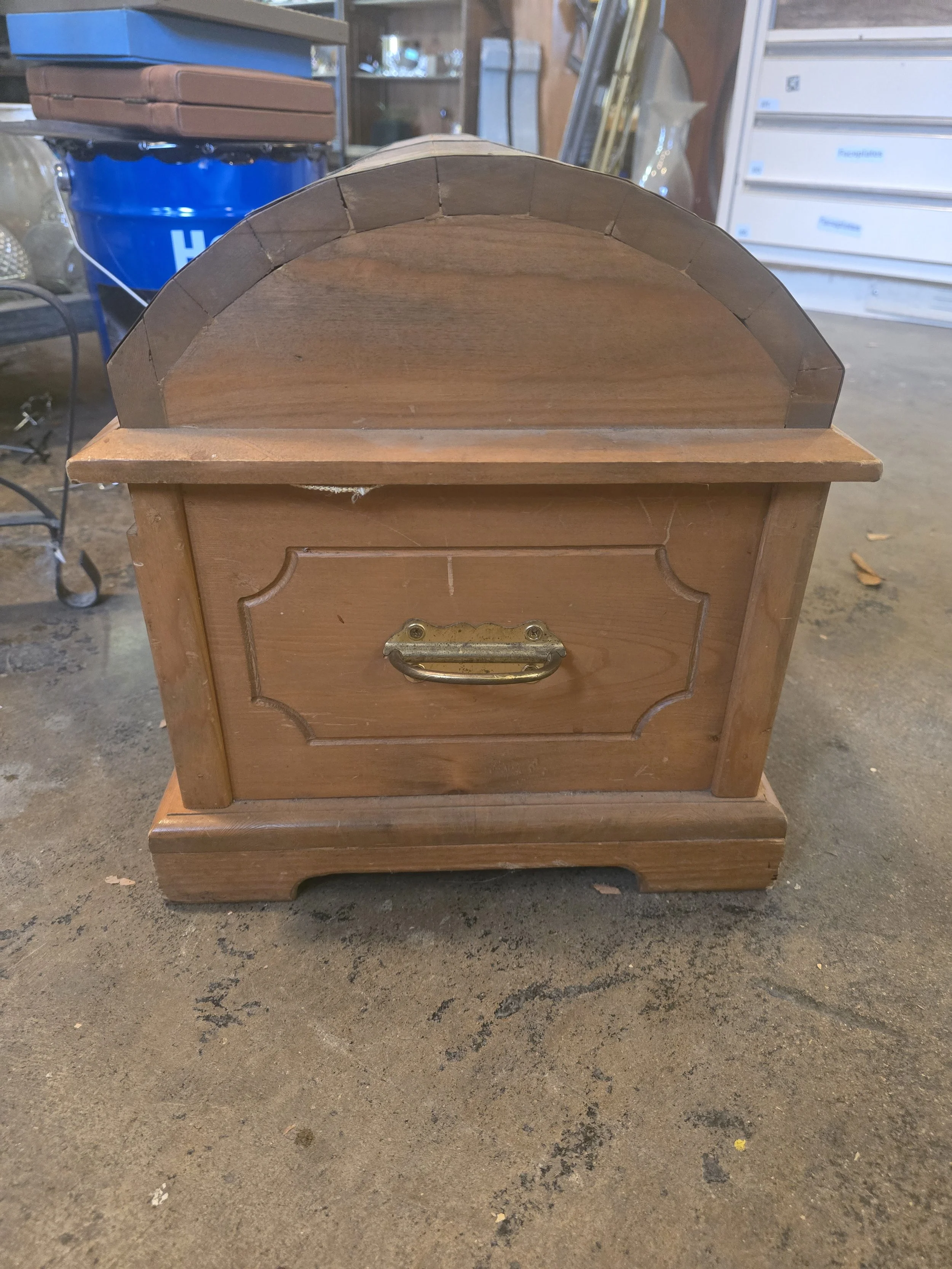 Solid wood and handmade barrel chest. This chest has brass bands around the top and 2 brass handles on the side. It is in great condition.